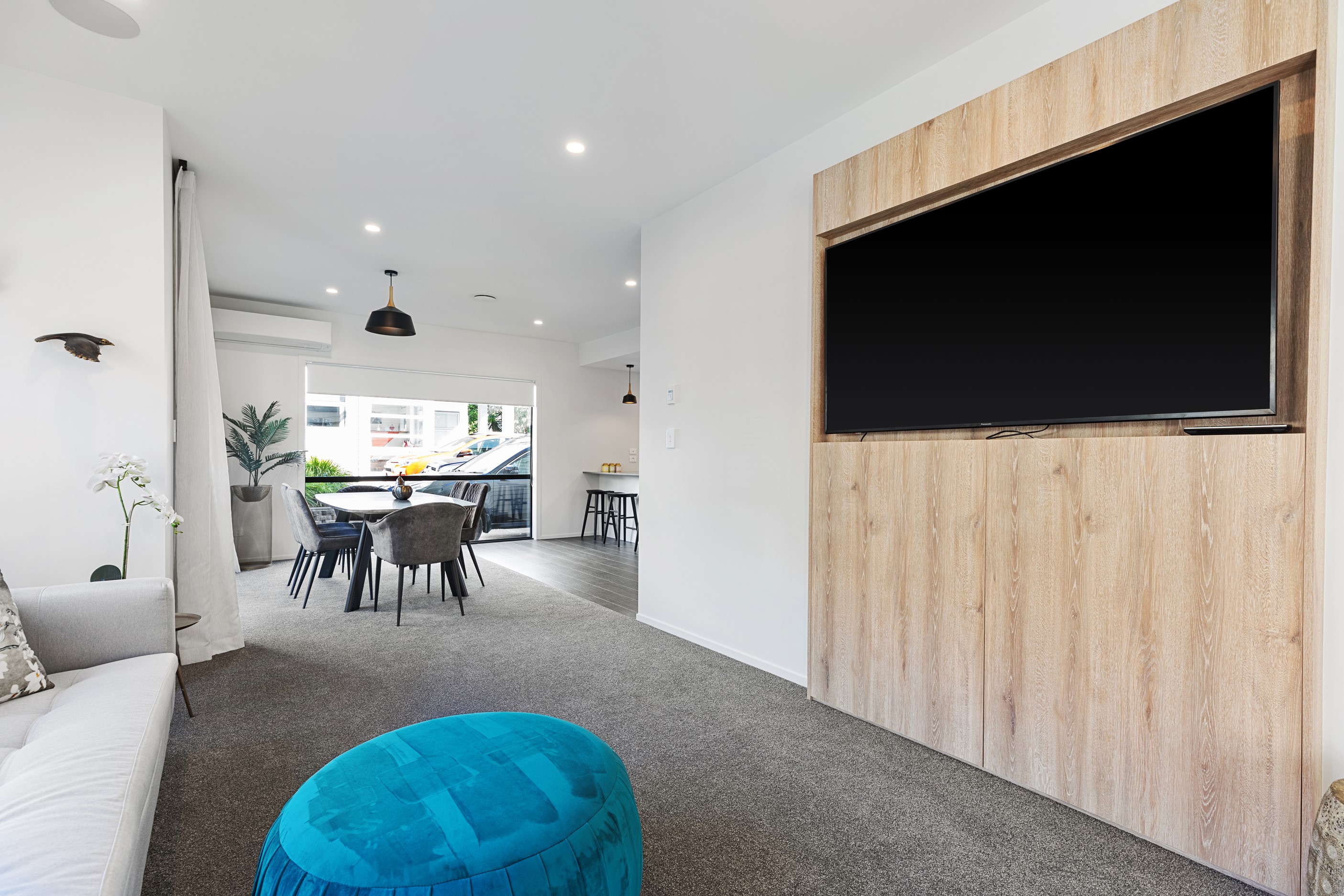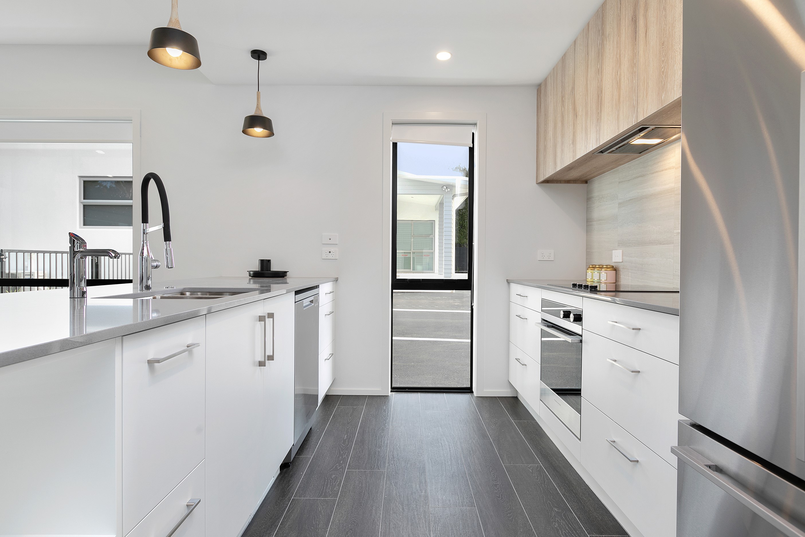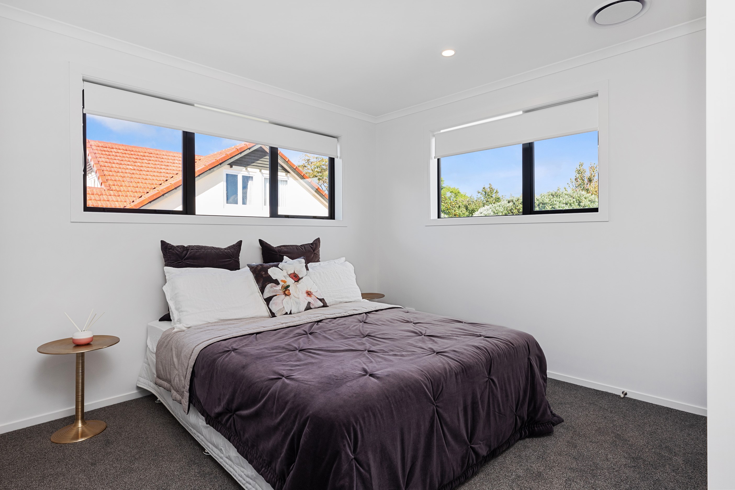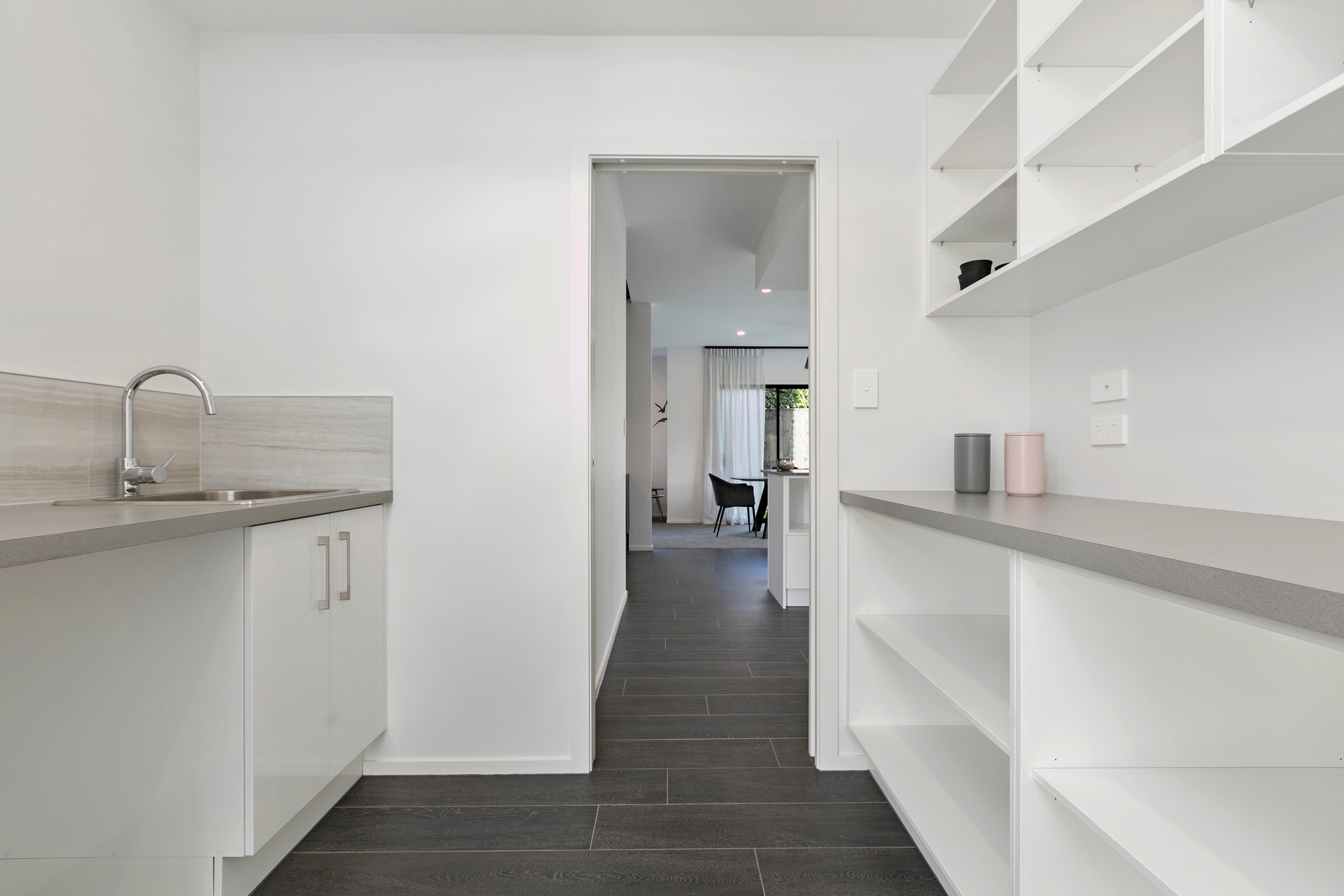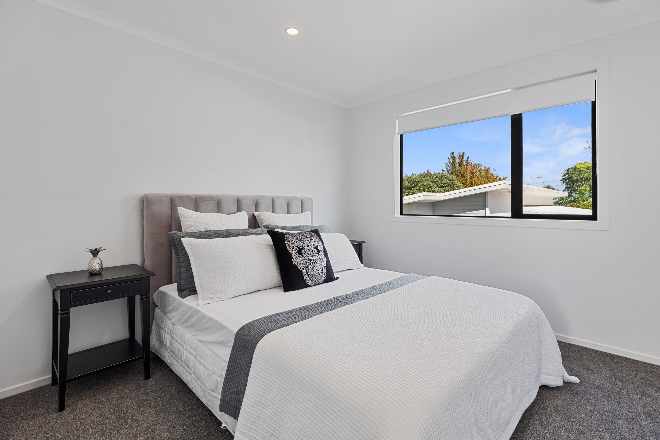 A house with presence was required as Jennian’s shopfront and show home. Located on busy Fifteenth Ave, it needed to appeal to past, current and prospective clients, as well as provide office space and parking for the franchise. Rising up from the land is this bold 218sqm home clad in Linea weatherboard and topped with tiles. Immediately striking from the street are the varied rooflines and postbox-red front door. Inside, home buyers can inspect Jennian’s standard fittings, as well as upgrade options. To illustrate the point: the main bathroom is straight from the plans, while the ensuite has been given special treatment. Whether standard or upgraded, design features abound– the timber staircase has a floor-to-ceiling timber screen, a covered patio is accessed through stacking doors and a feature pendant light illuminates the stairwell. Downstairs is all about relaxed living in the L-shaped open-plan dining, lounge and kitchen zone. The latter has a scullery, which connects directly to the double garage – ideal for unpacking groceries. You’ll find four roomy bedrooms upstairs, plus a family bathroom, main bedroom ensuite and toilets. There’s presence aplenty here, and also serious panache.