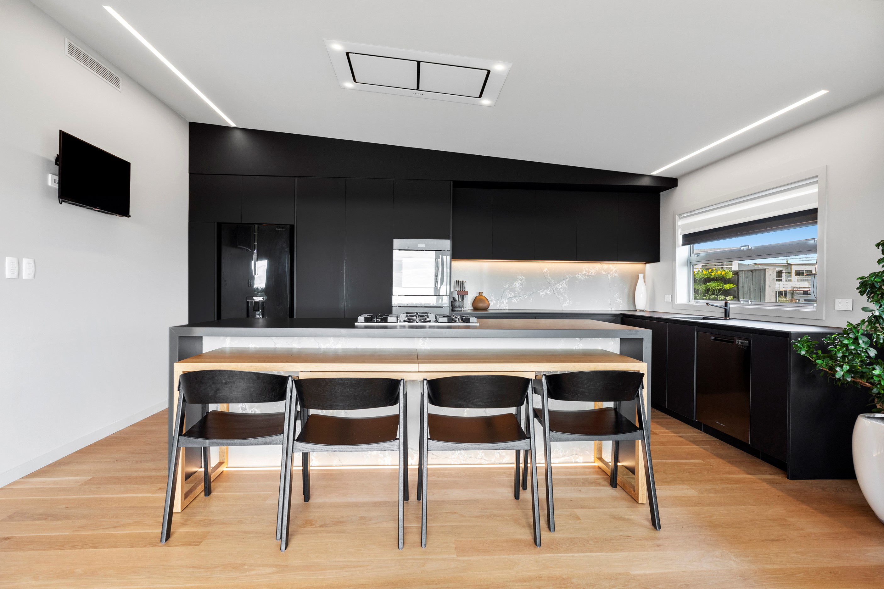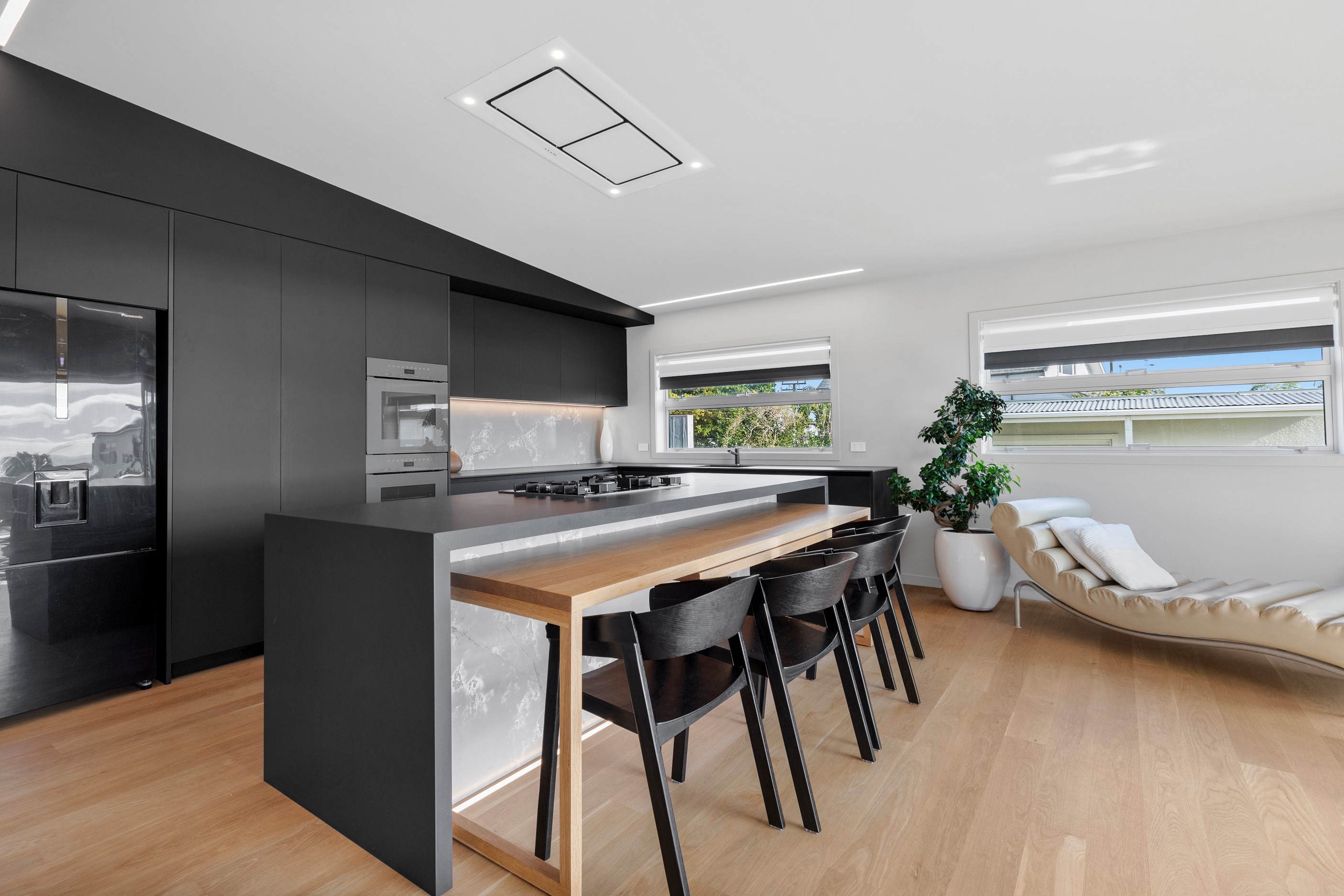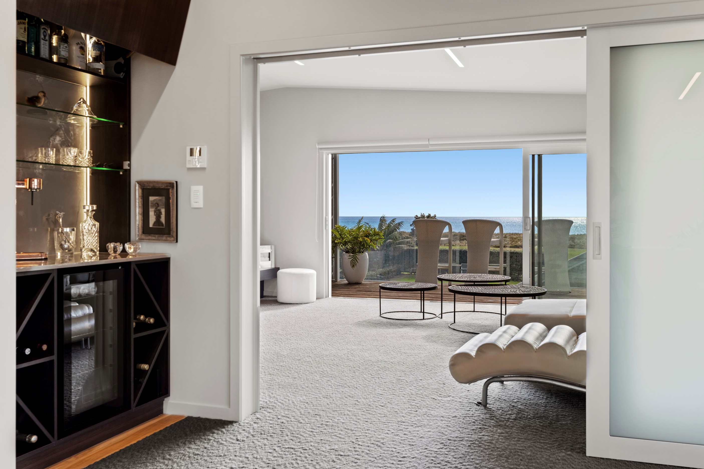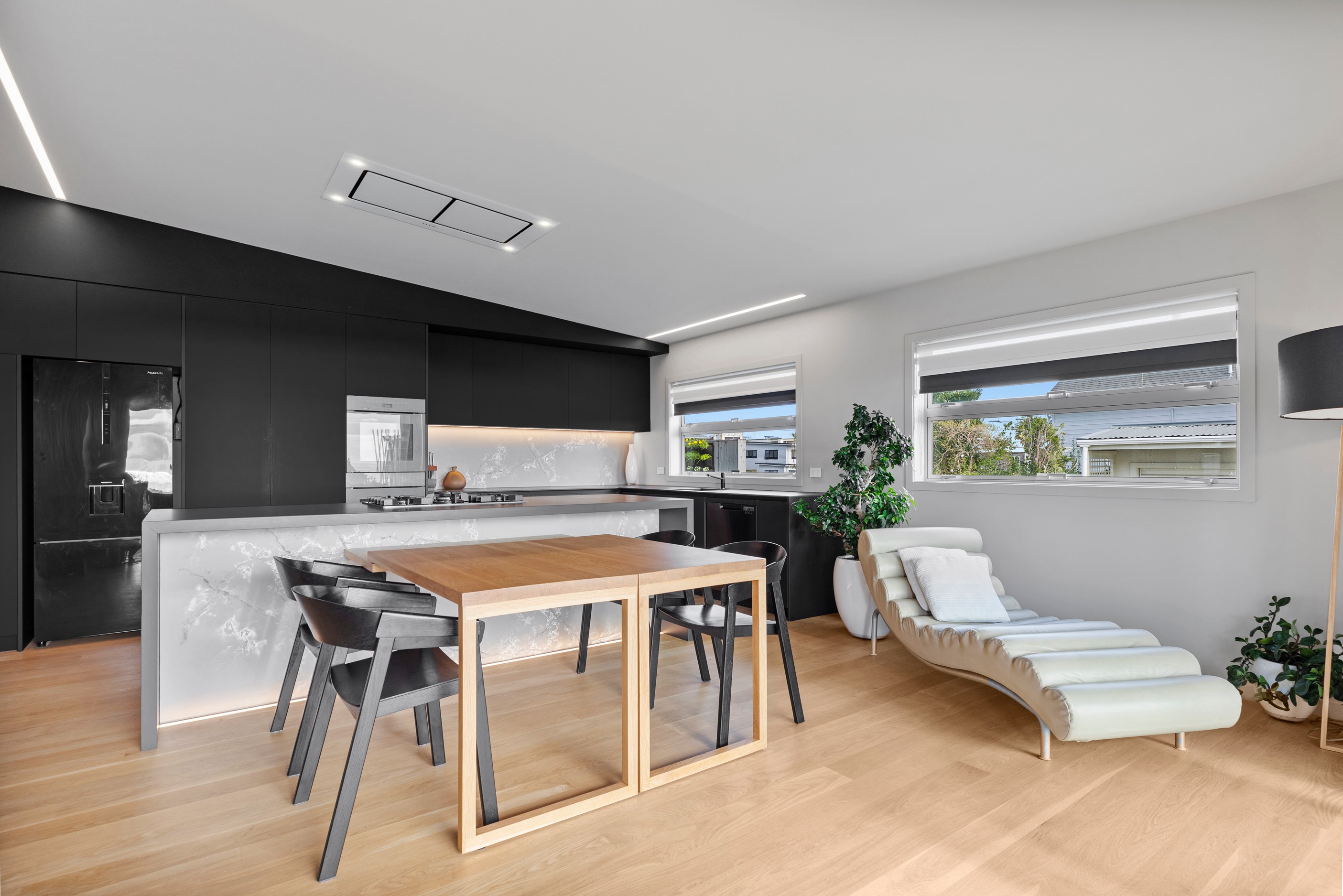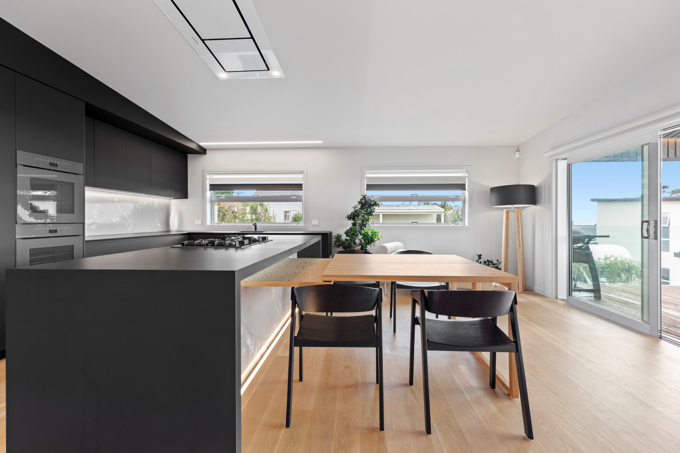 Beachfront entertaining has never been so easy – or so easily infused with relaxed coastal cool. This elegant 240sqm home places the living areas on the first floor to make the most of the Pacific Ocean views. The interiors open onto a north-facing deck and portico for sheltered dining and sea-gazing. With glass balustrades, this well-considered design provides uninterrupted access to those dreamy views. Separated from the living area by stacker doors is the main bedroom suite, which has a studio-style set-up with a sitting room, bar, walk-in wardrobe and an ensuite that wouldn’t look out of place in a resort. The rest of the first floor consists of a guest bedroom, bathroom and laundry, while downstairs you’ll find a double garage and basement. The entry and stairwell on the two-storey side of the property are crafted in American oak. This home puts timber craftsmanship in the spotlight, and is also a stellar example of smart technology at work. LED lighting, security, heating and even the oven can be controlled by a smartphone or tablet using theControl4 automation system. Clever furniture choices add to the appeal. An adjustable dining table can be configured several ways, including as a breakfast bar.