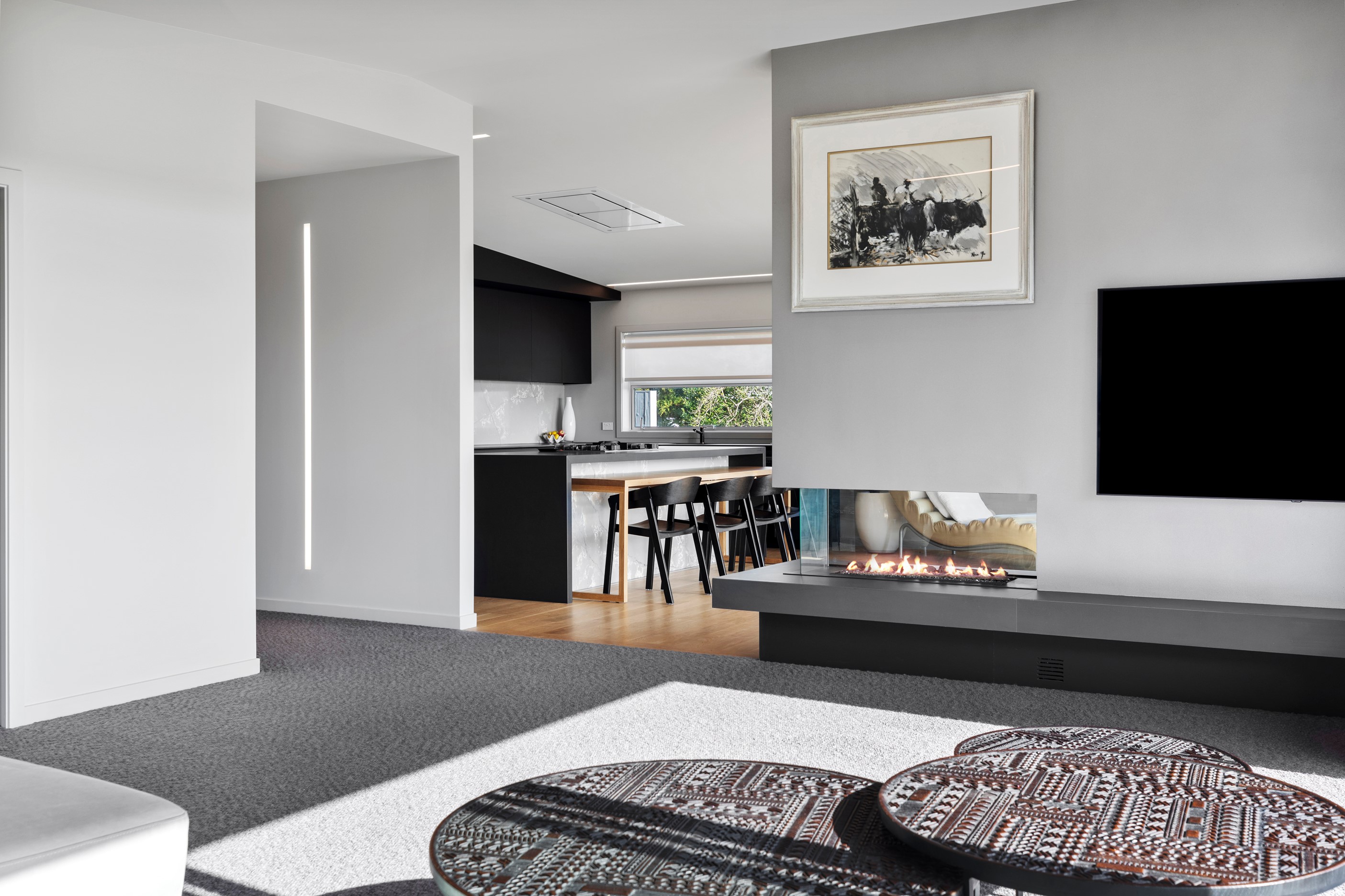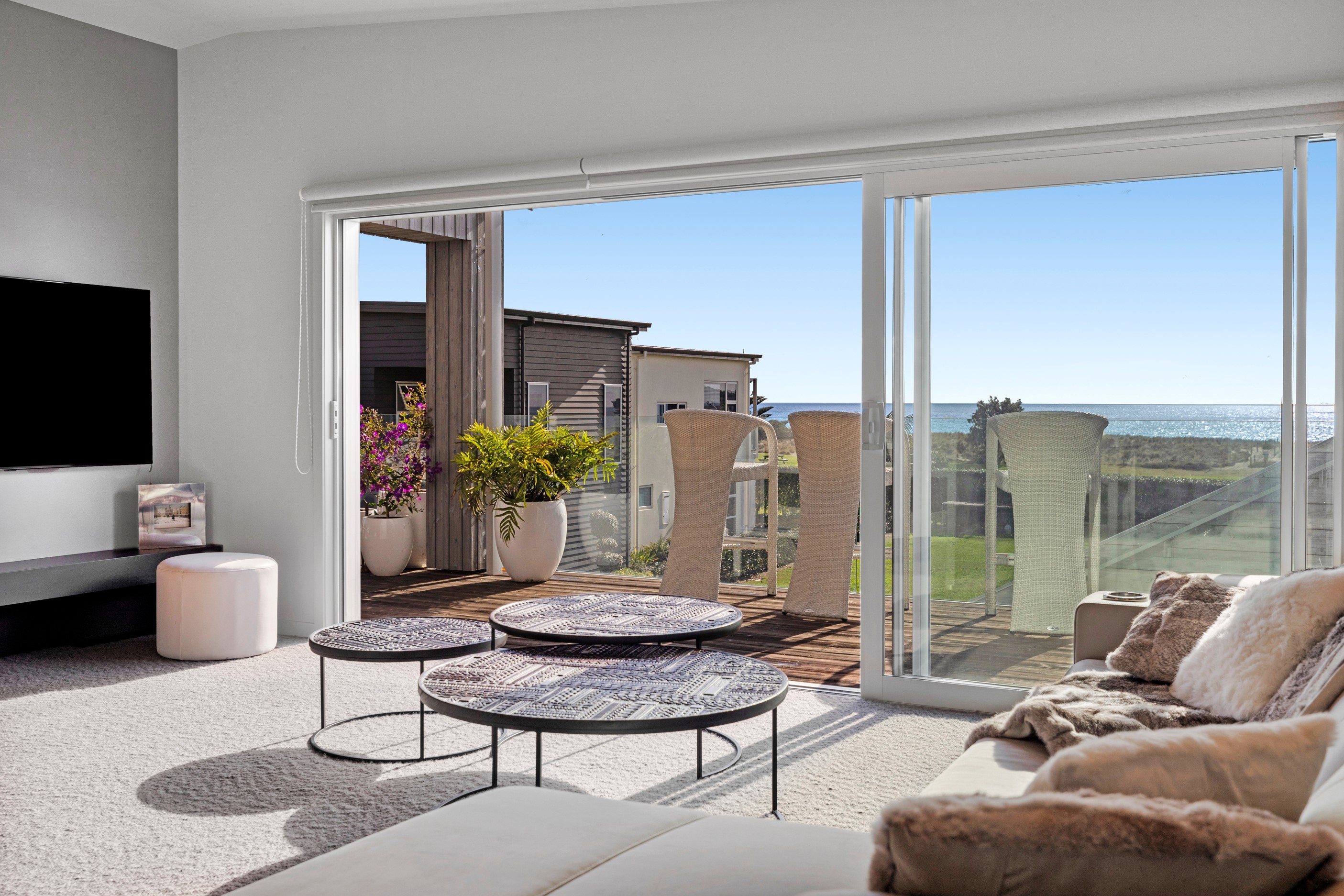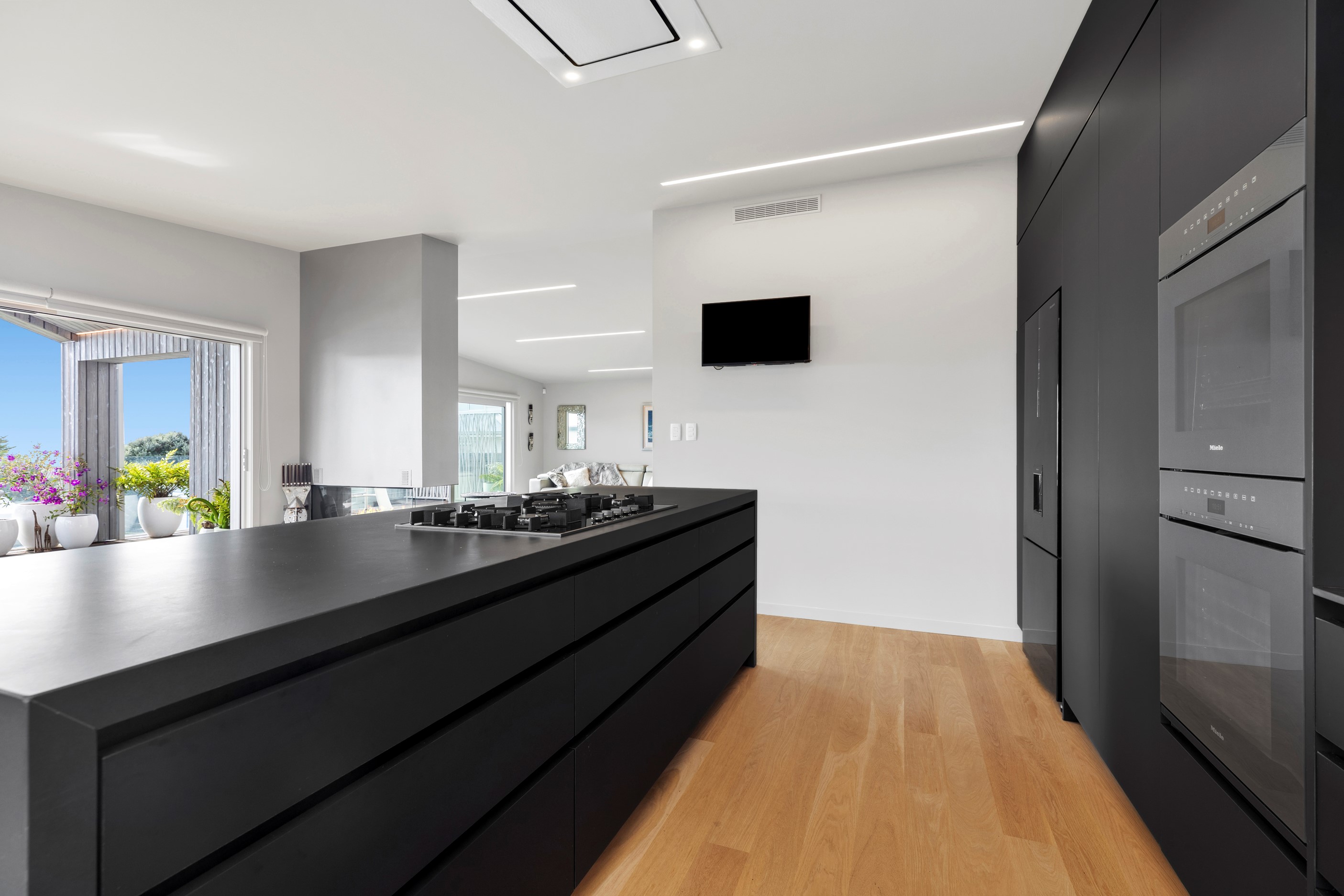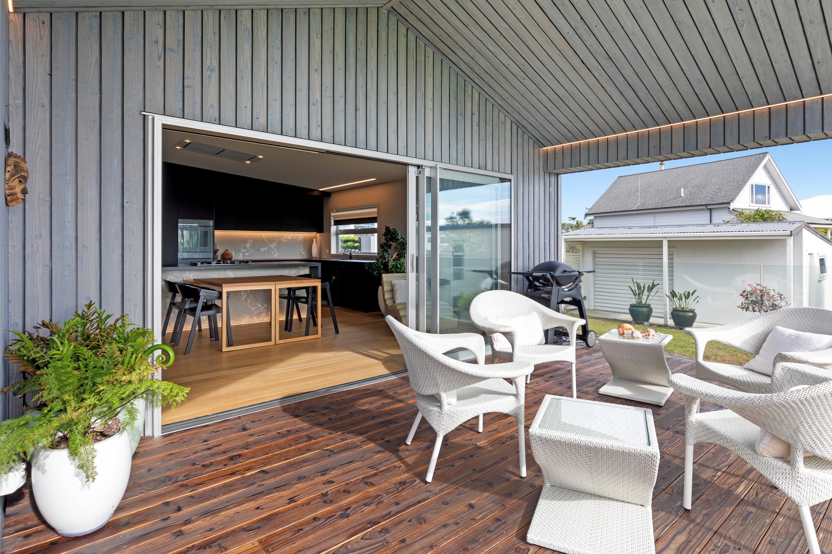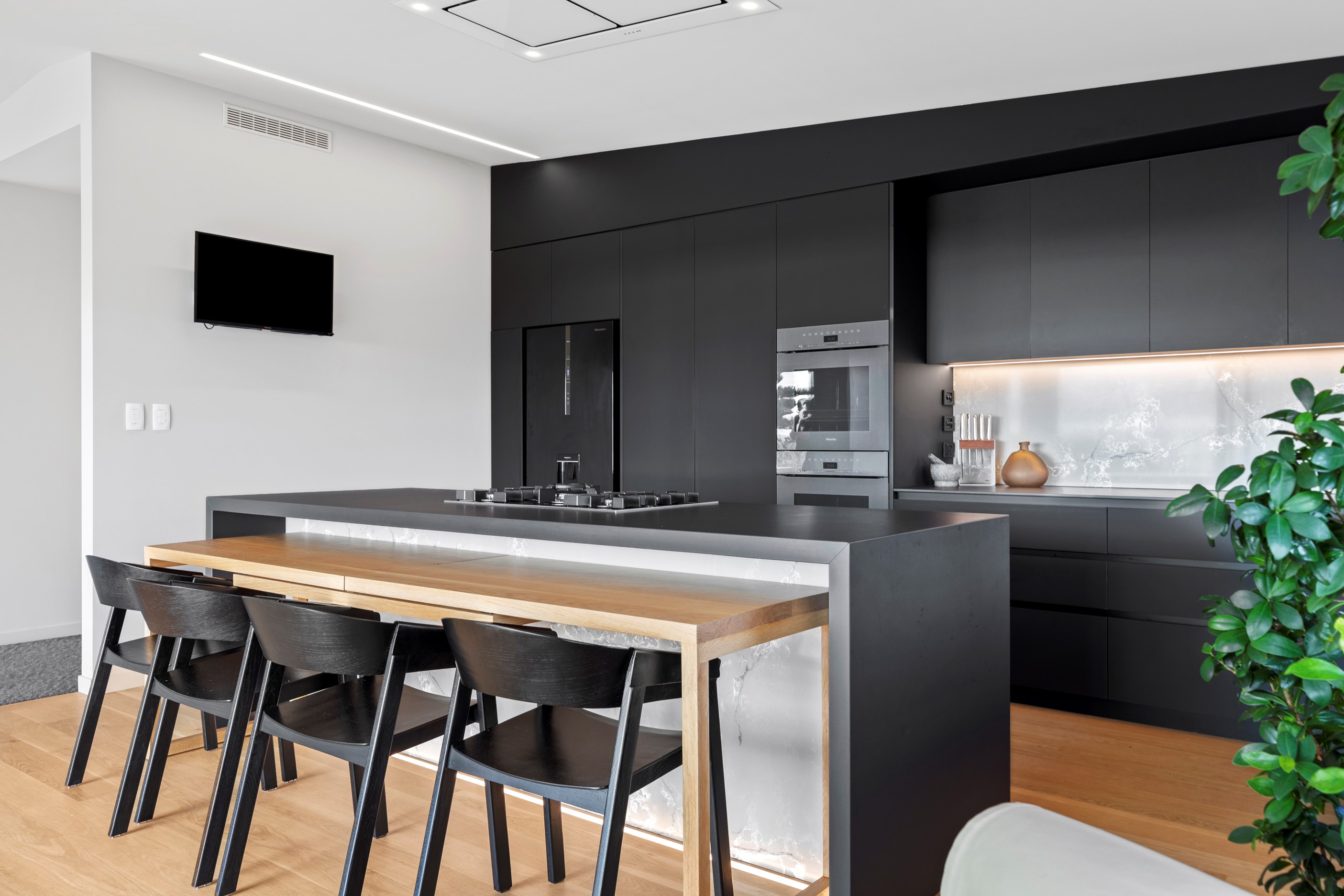 Beachfront entertaining has never been so easy – or so easily infused with relaxed coastal cool. This elegant 240sqm home places the living areas on the first floor to make the most of the Pacific Ocean views. The interiors open onto a north-facing deck and portico for sheltered dining and sea-gazing. With glass balustrades, this well-considered design provides uninterrupted access to those dreamy views. Separated from the living area by stacker doors is the main bedroom suite, which has a studio-style set-up with a sitting room, bar, walk-in wardrobe and an ensuite that wouldn’t look out of place in a resort. The rest of the first floor consists of a guest bedroom, bathroom and laundry, while downstairs you’ll find a double garage and basement. The entry and stairwell on the two-storey side of the property are crafted in American oak. This home puts timber craftsmanship in the spotlight, and is also a stellar example of smart technology at work. LED lighting, security, heating and even the oven can be controlled by a smartphone or tablet using theControl4 automation system. Clever furniture choices add to the appeal. An adjustable dining table can be configured several ways, including as a breakfast bar.