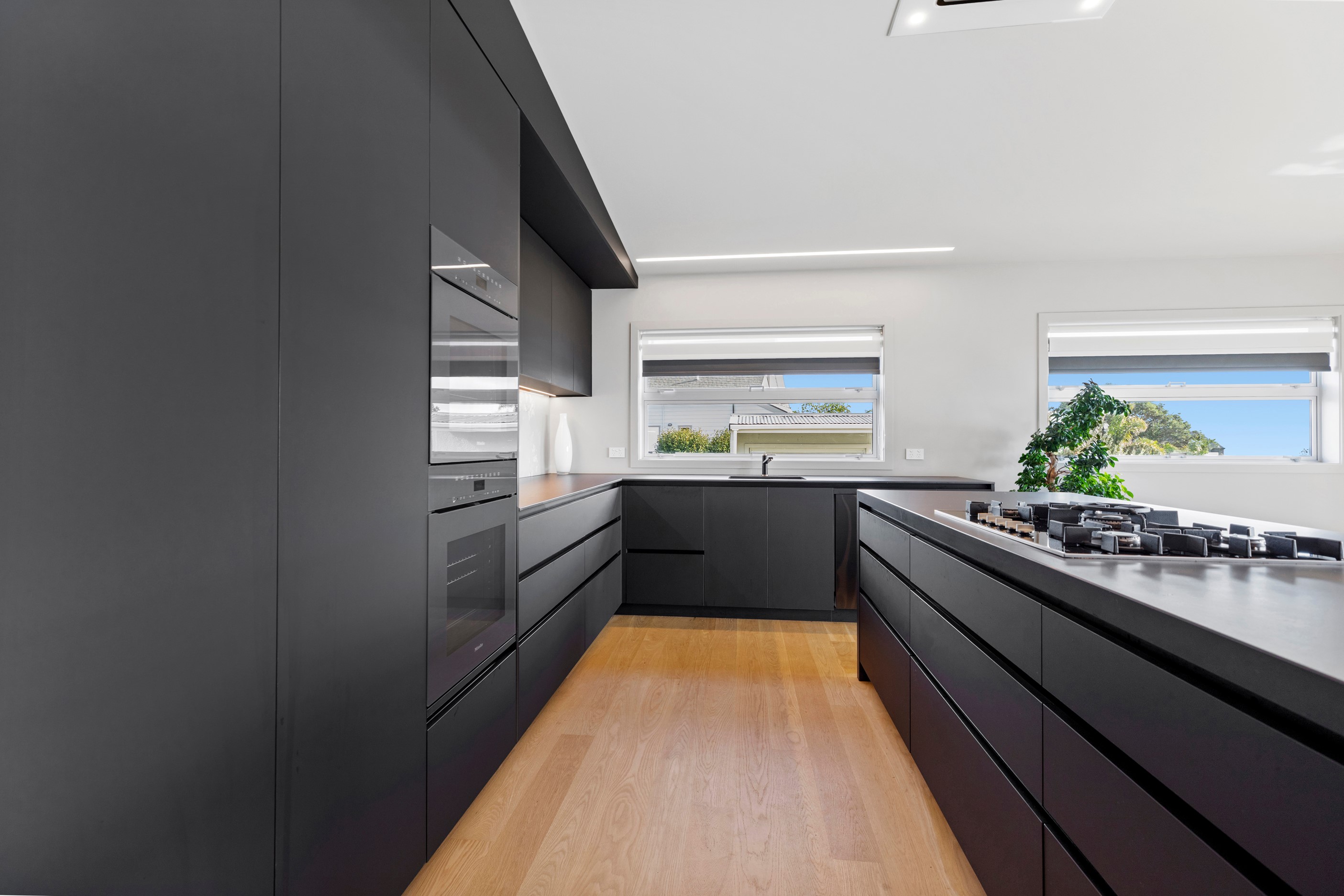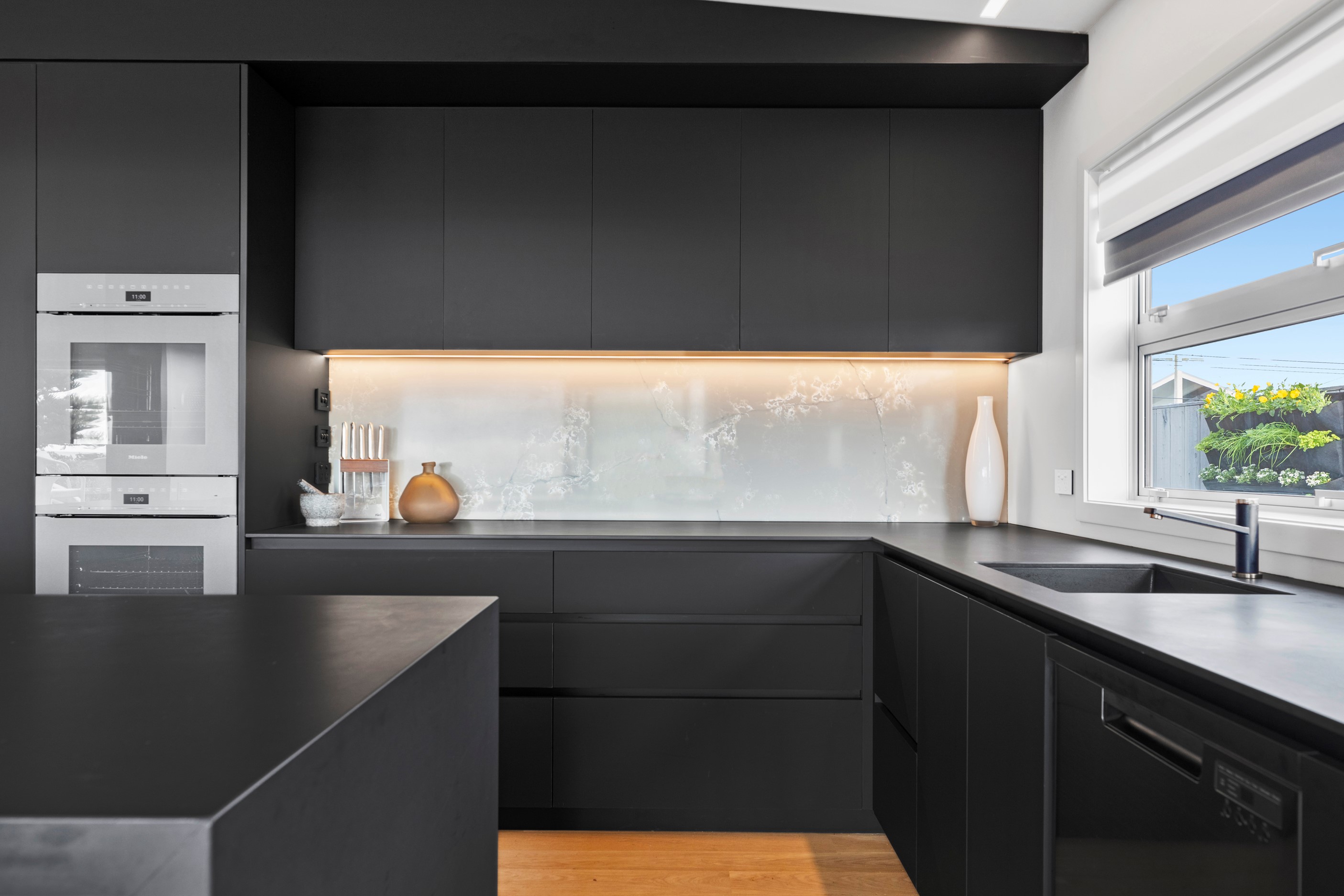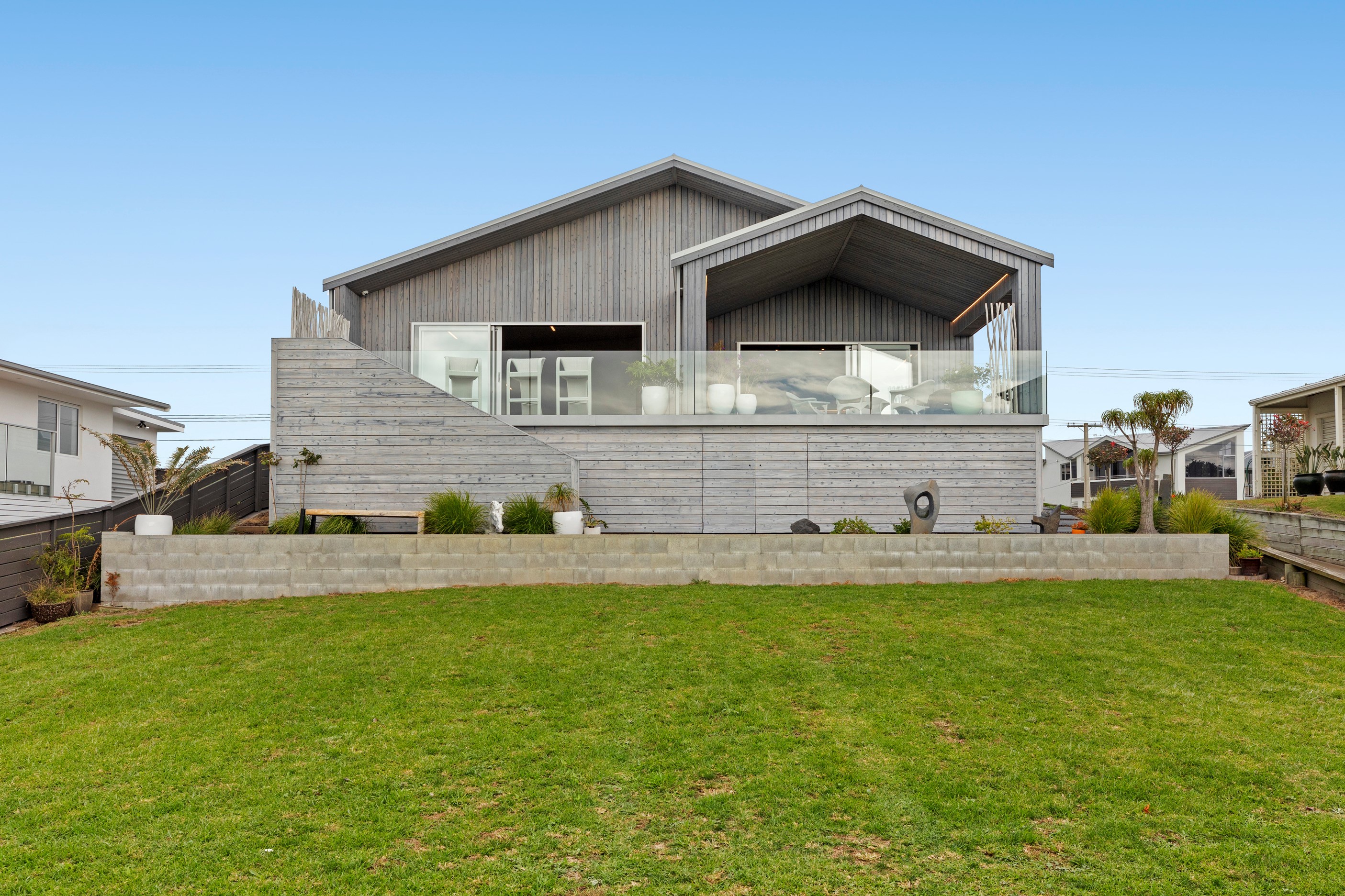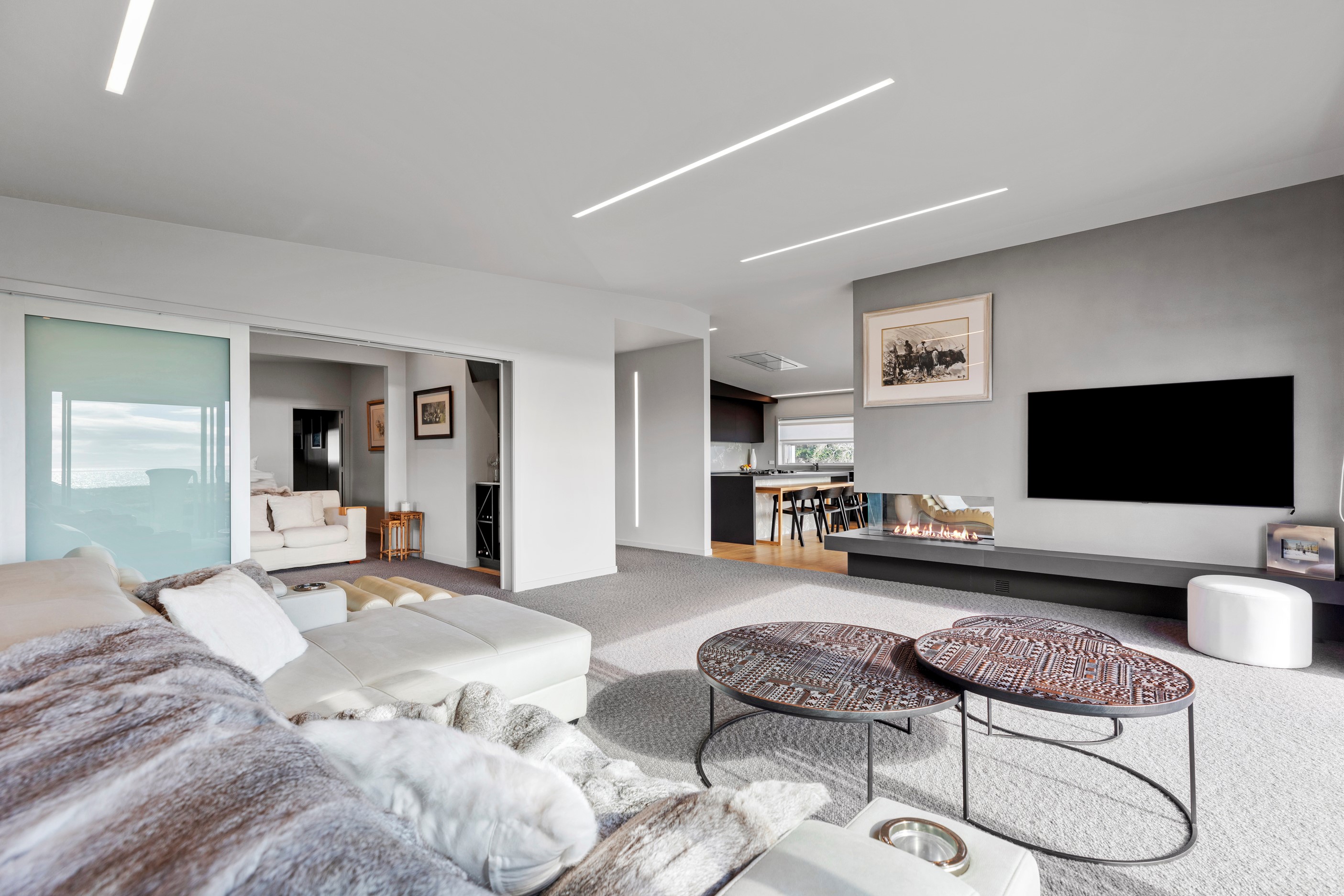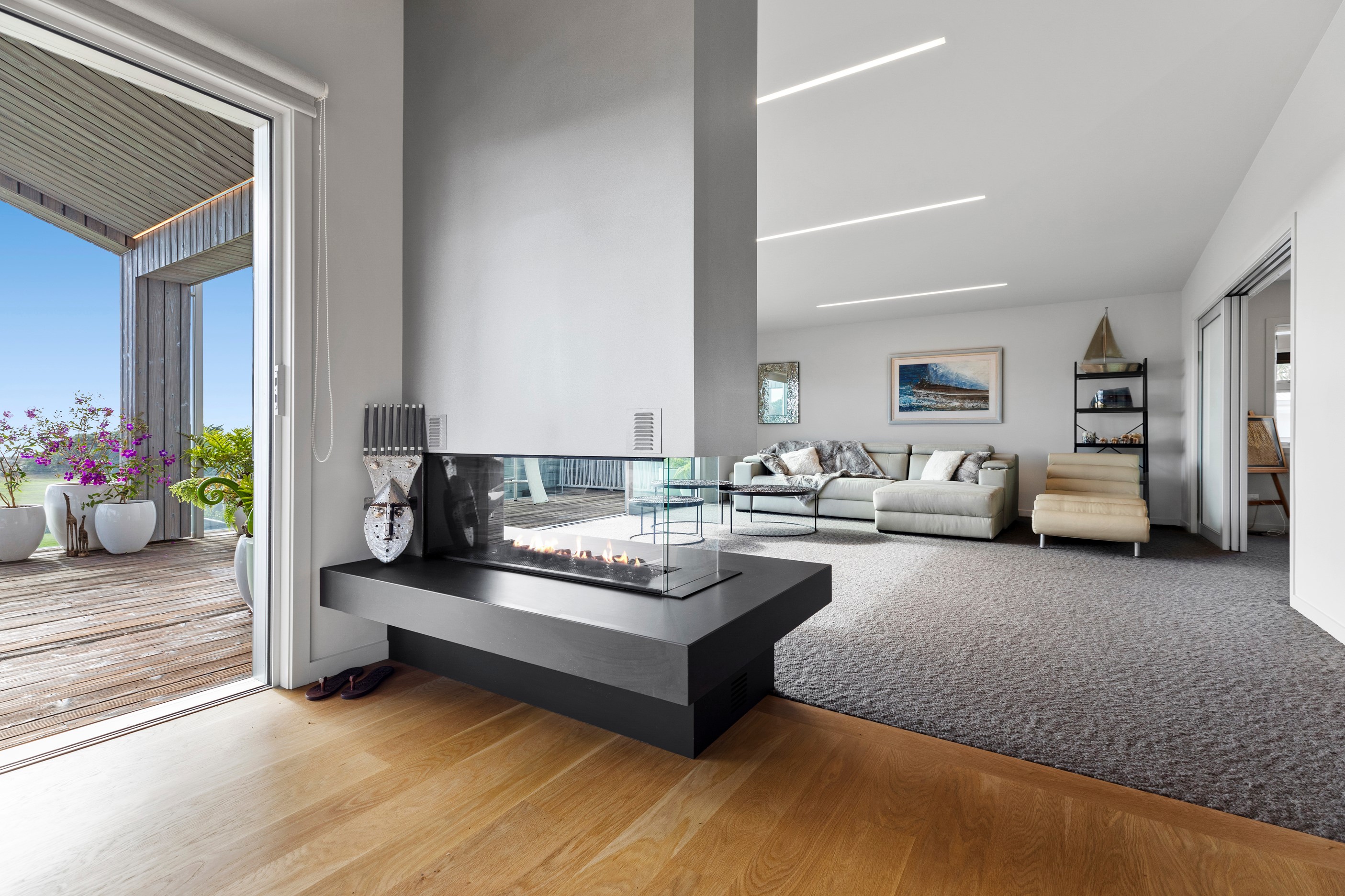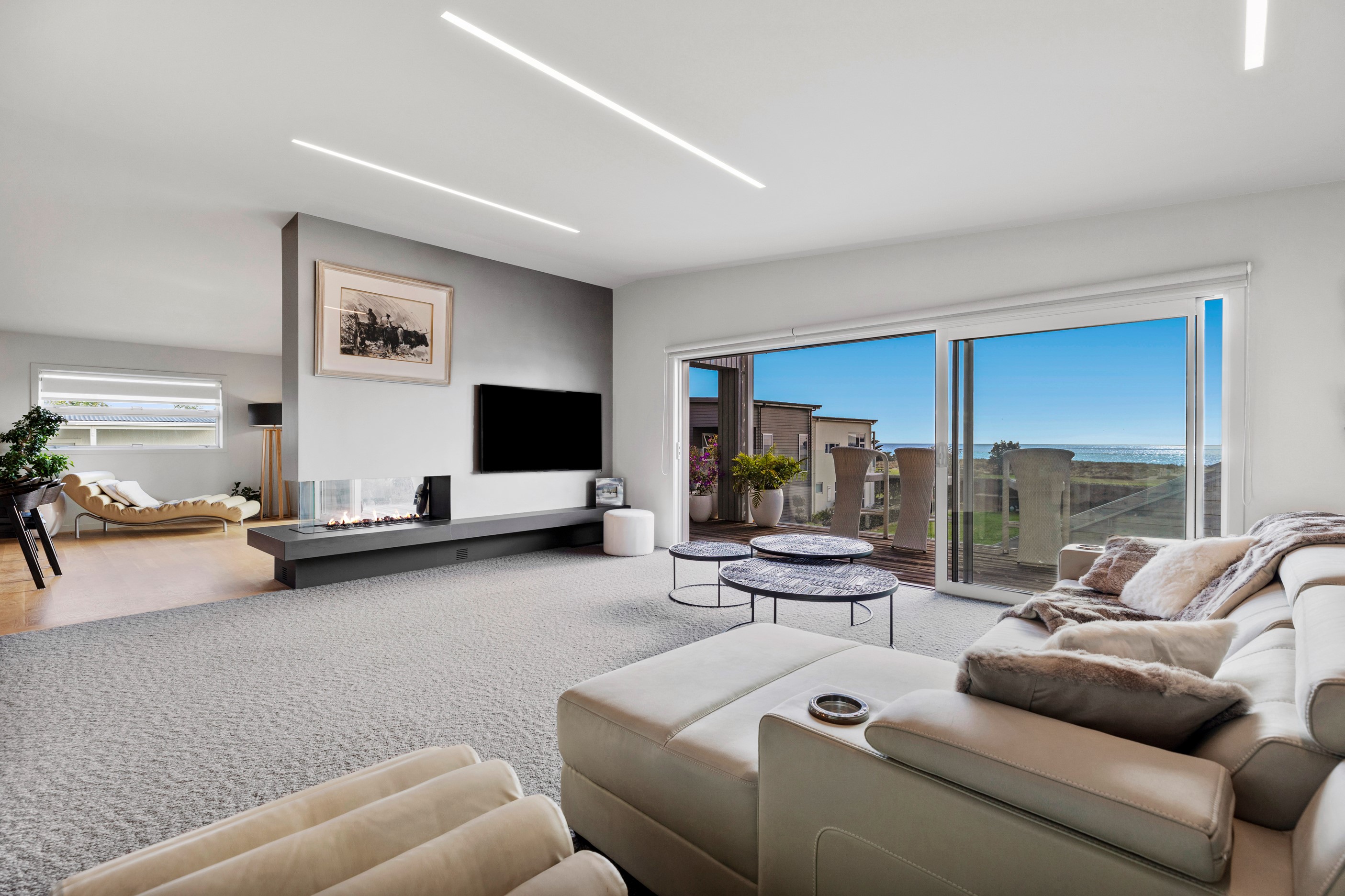 Beachfront entertaining has never been so easy – or so easily infused with relaxed coastal cool. This elegant 240sqm home places the living areas on the first floor to make the most of the Pacific Ocean views. The interiors open onto a north-facing deck and portico for sheltered dining and sea-gazing. With glass balustrades, this well-considered design provides uninterrupted access to those dreamy views. Separated from the living area by stacker doors is the main bedroom suite, which has a studio-style set-up with a sitting room, bar, walk-in wardrobe and an ensuite that wouldn’t look out of place in a resort. The rest of the first floor consists of a guest bedroom, bathroom and laundry, while downstairs you’ll find a double garage and basement. The entry and stairwell on the two-storey side of the property are crafted in American oak. This home puts timber craftsmanship in the spotlight, and is also a stellar example of smart technology at work. LED lighting, security, heating and even the oven can be controlled by a smartphone or tablet using theControl4 automation system. Clever furniture choices add to the appeal. An adjustable dining table can be configured several ways, including as a breakfast bar.