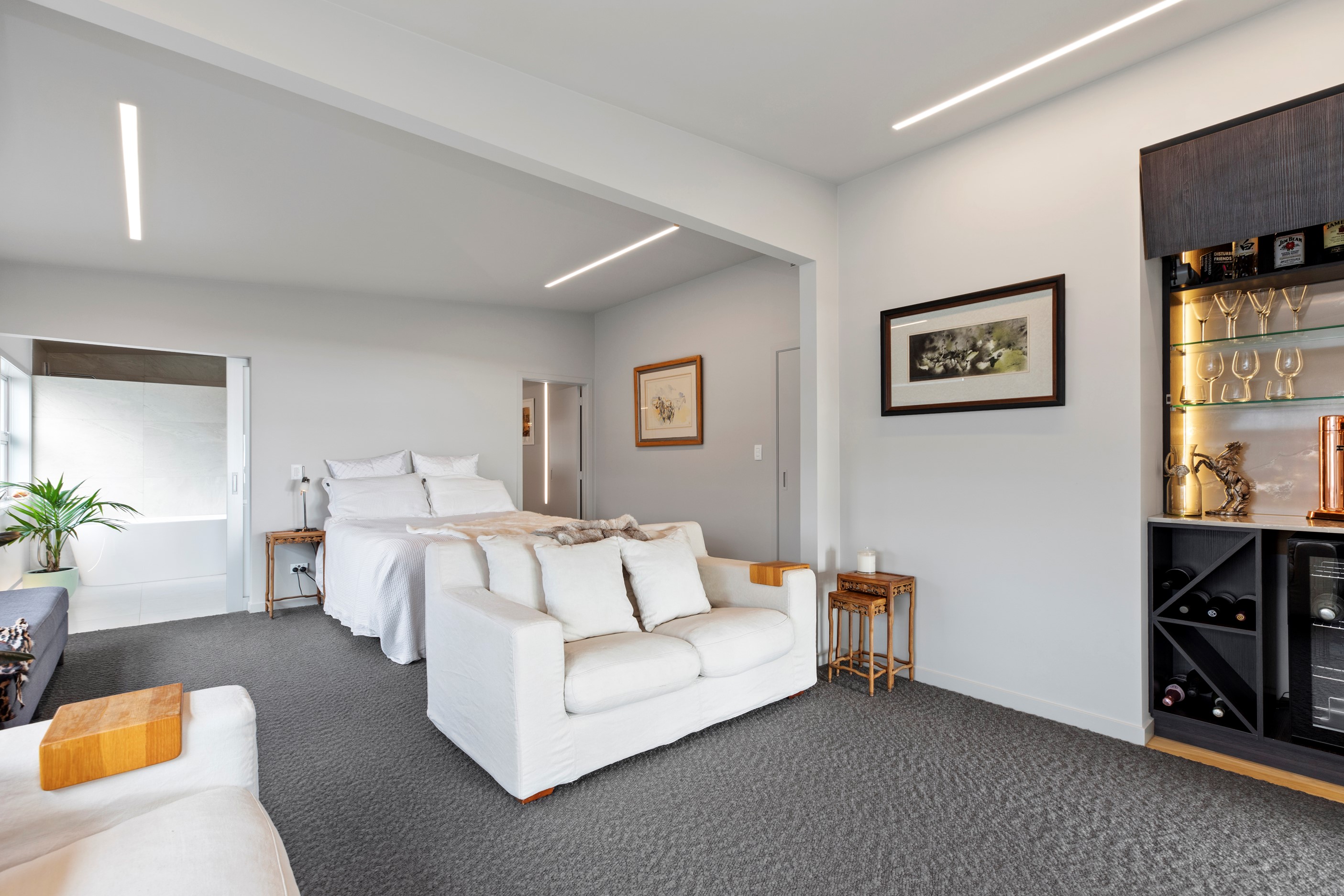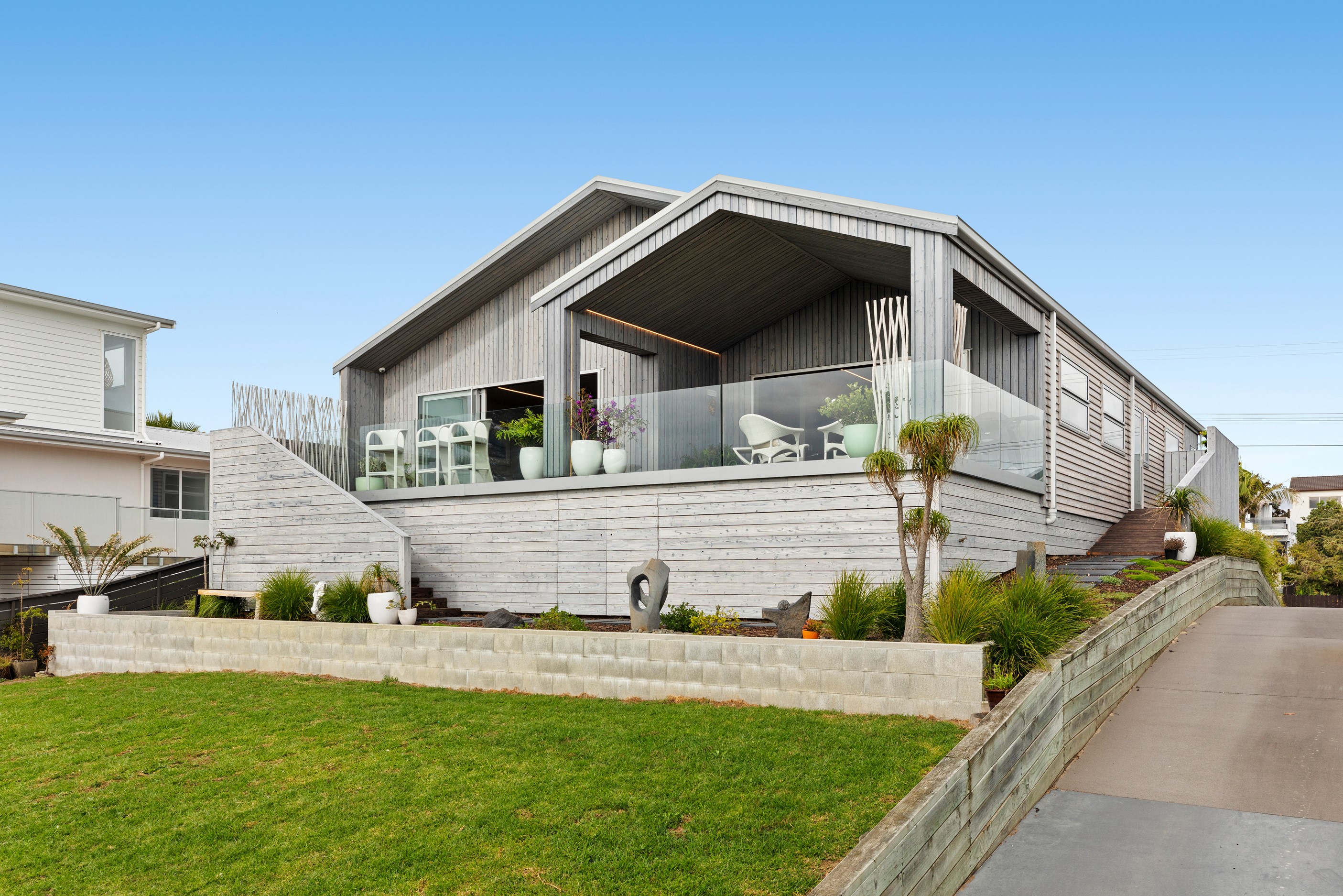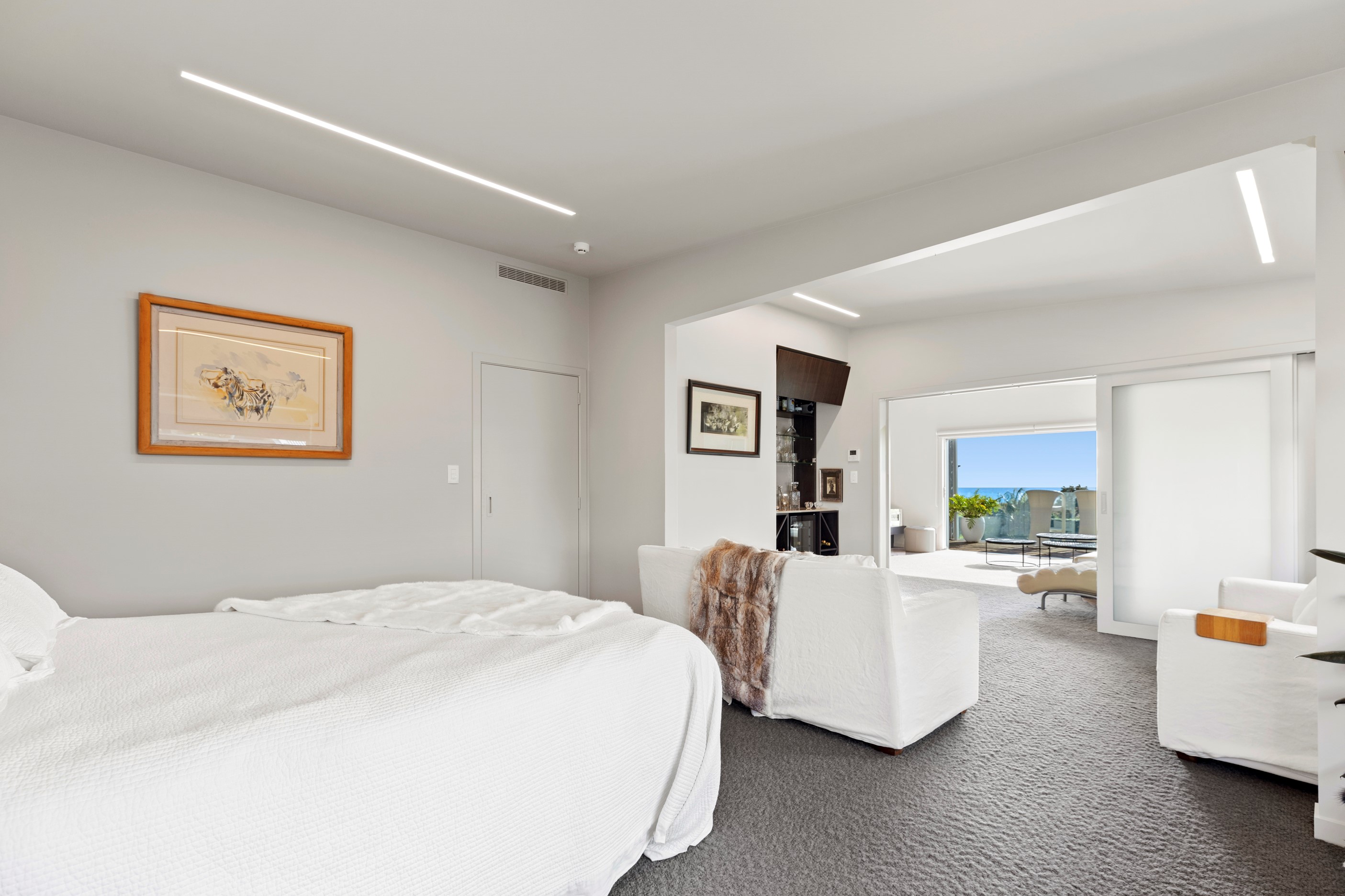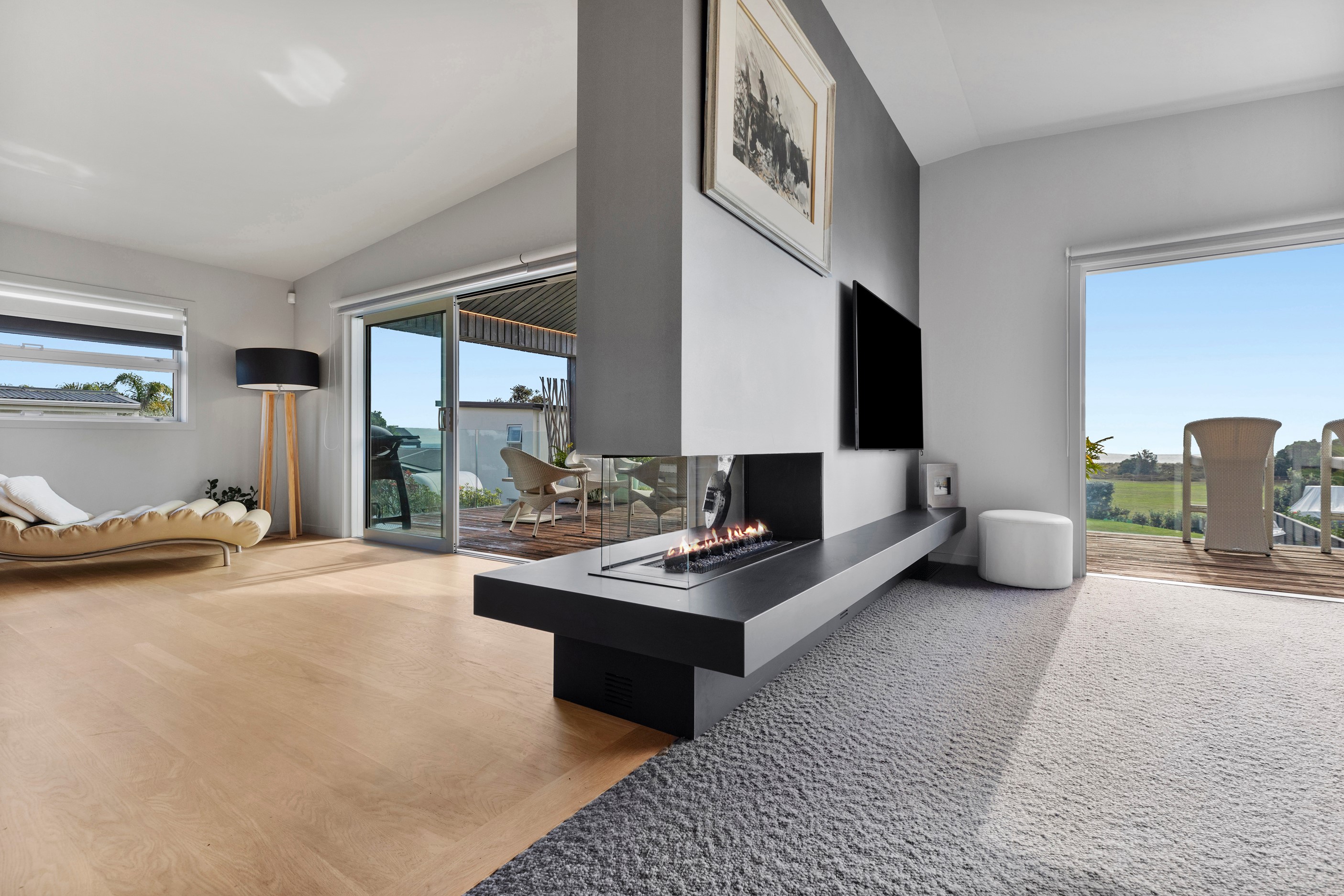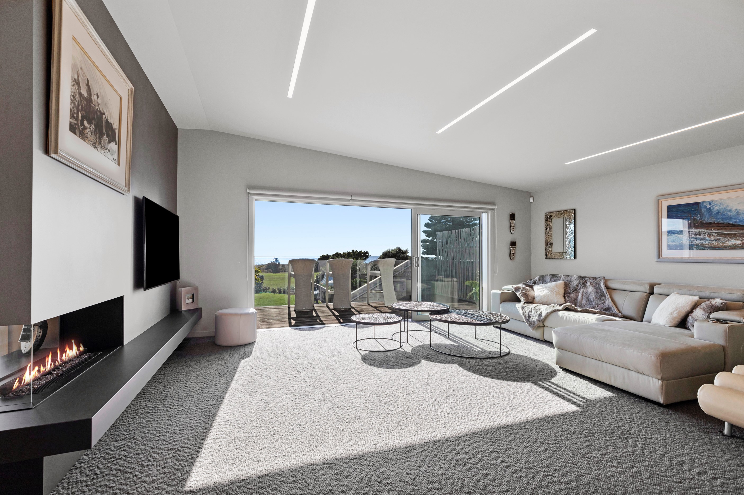 Beachfront entertaining has never been so easy – or so easily infused with relaxed coastal cool. This elegant 240sqm home places the living areas on the first floor to make the most of the Pacific Ocean views. The interiors open onto a north-facing deck and portico for sheltered dining and sea-gazing. With glass balustrades, this well-considered design provides uninterrupted access to those dreamy views. Separated from the living area by stacker doors is the main bedroom suite, which has a studio-style set-up with a sitting room, bar, walk-in wardrobe and an ensuite that wouldn’t look out of place in a resort. The rest of the first floor consists of a guest bedroom, bathroom and laundry, while downstairs you’ll find a double garage and basement. The entry and stairwell on the two-storey side of the property are crafted in American oak. This home puts timber craftsmanship in the spotlight, and is also a stellar example of smart technology at work. LED lighting, security, heating and even the oven can be controlled by a smartphone or tablet using theControl4 automation system. Clever furniture choices add to the appeal. An adjustable dining table can be configured several ways, including as a breakfast bar.