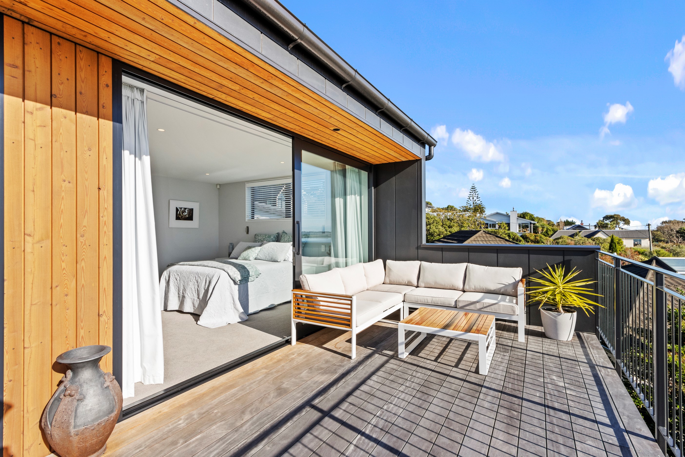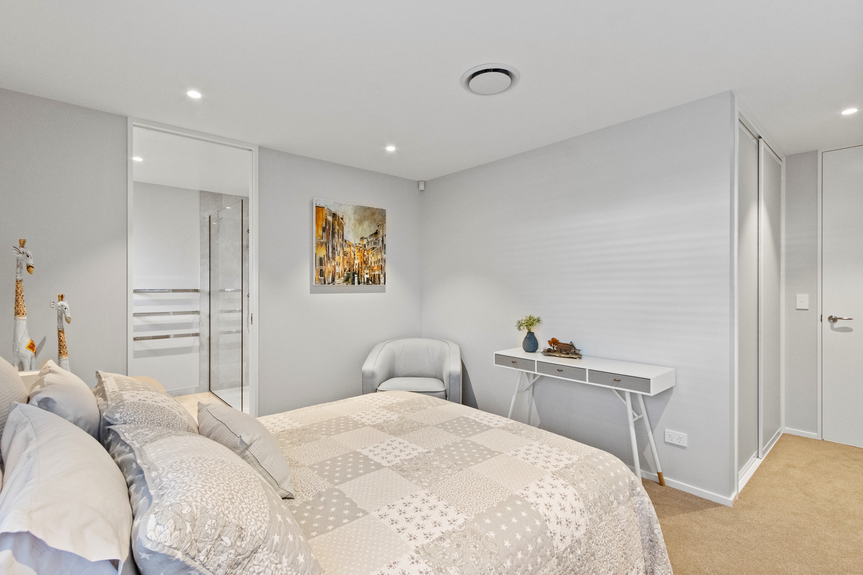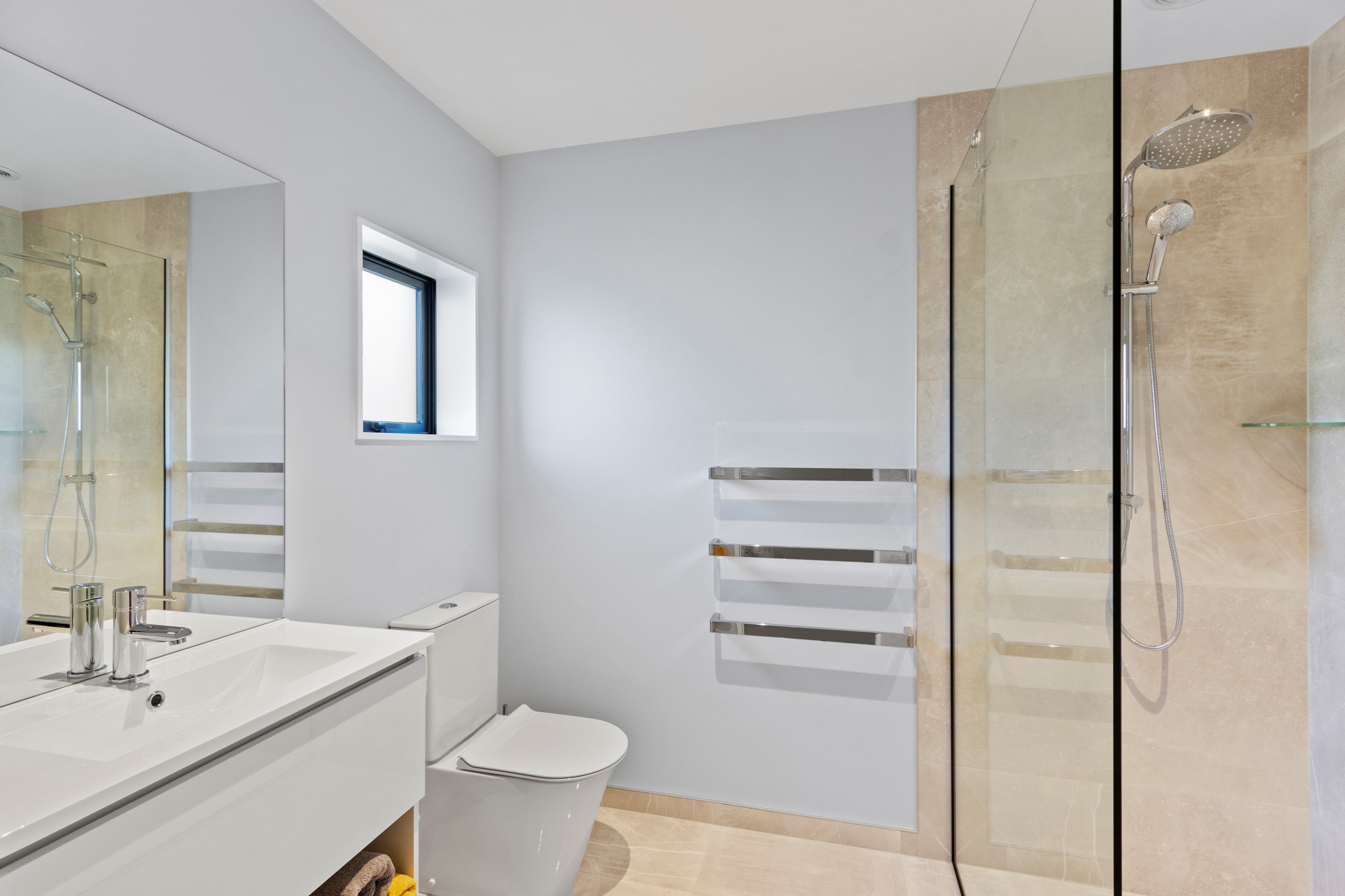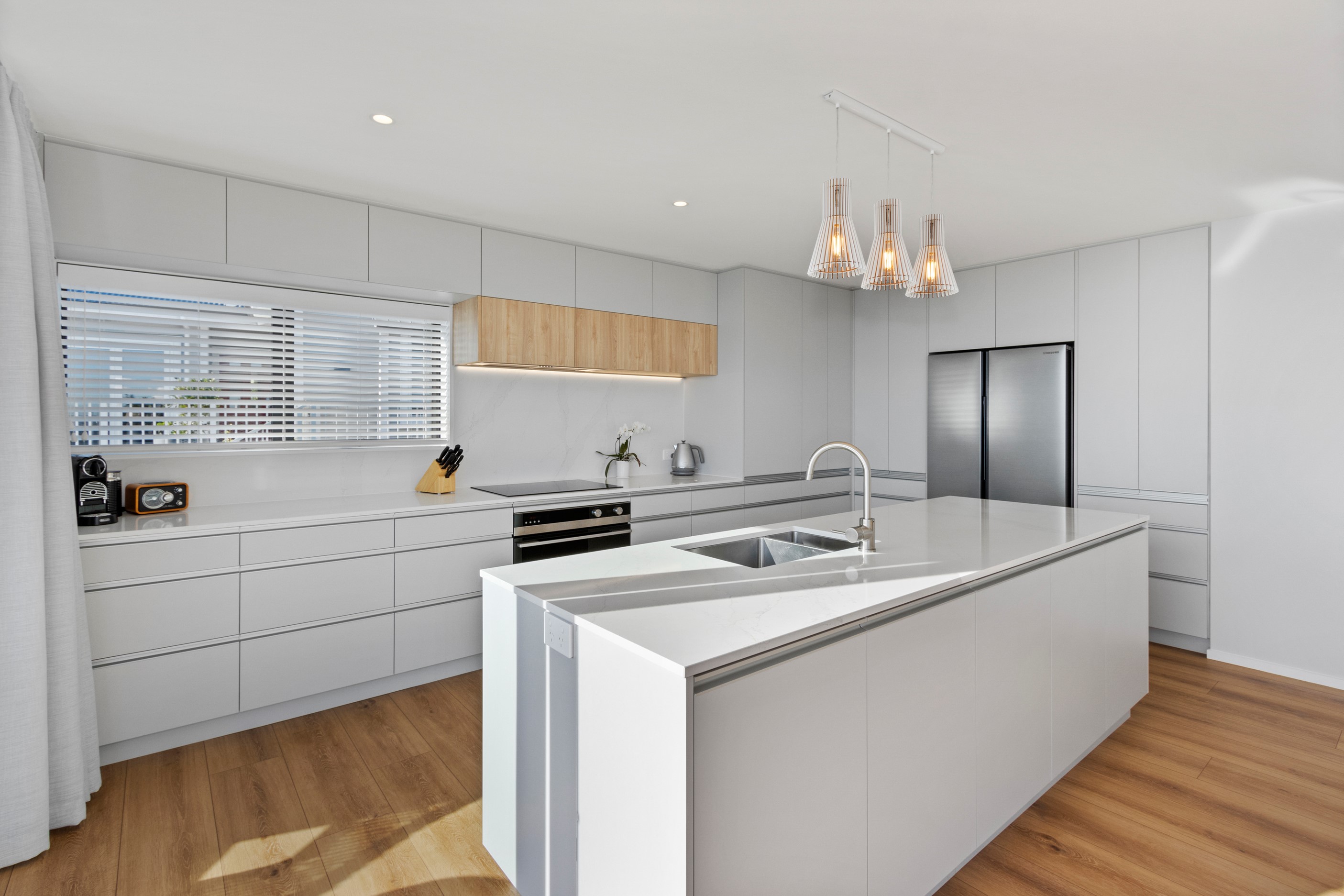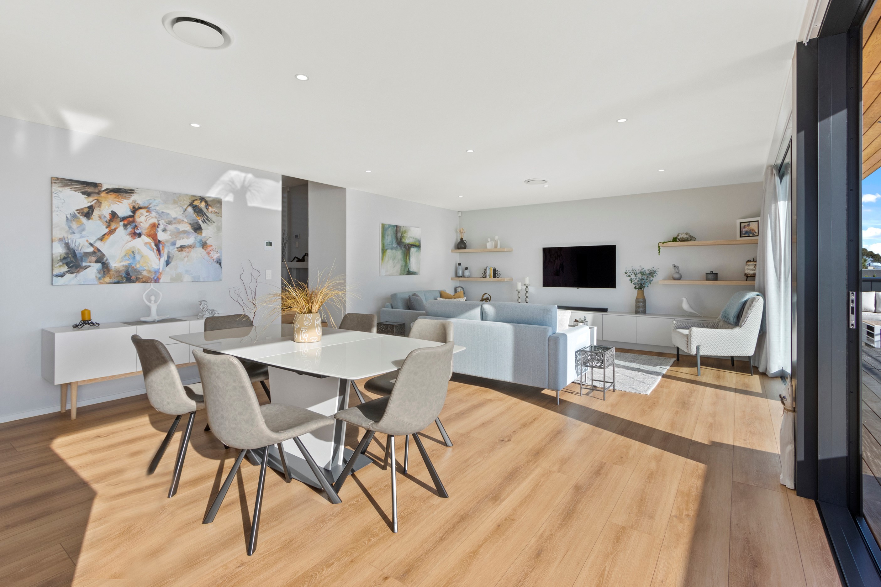 A couple ready to downsize went hunting for a house, but couldn’t find anything they liked enough. Then they were shown a terraced building site on the lower slopes of Mt Pleasant and instantly fell in love with it. As first-time builders, they were extremely excited. Before their plans were even drawn up they were on the section, pruning overgrown trees and taking in their new view across McCormacks Bay. The building team connected them with CoLab Architecture, which designed a two-bedroom house that would suit the owners as they approached their retirement years. The 128sqm floor plan is elegantly simple. There is no wasted space, yet there’s a feeling of volume in the key areas. You’ll find two bedrooms, two bathrooms and a deck that runs across the entire front of the house, with steps down to landscaped terraces. Every decision from the soothing colour palette to the crafted finishes has been thoughtfully carried out – and it shows. The owners also had treasures they’d kept over the years and these were incorporated into their new home. The exterior is stylish and unobtrusive. It is a beautifully crafted home and one that does justice to the special site.