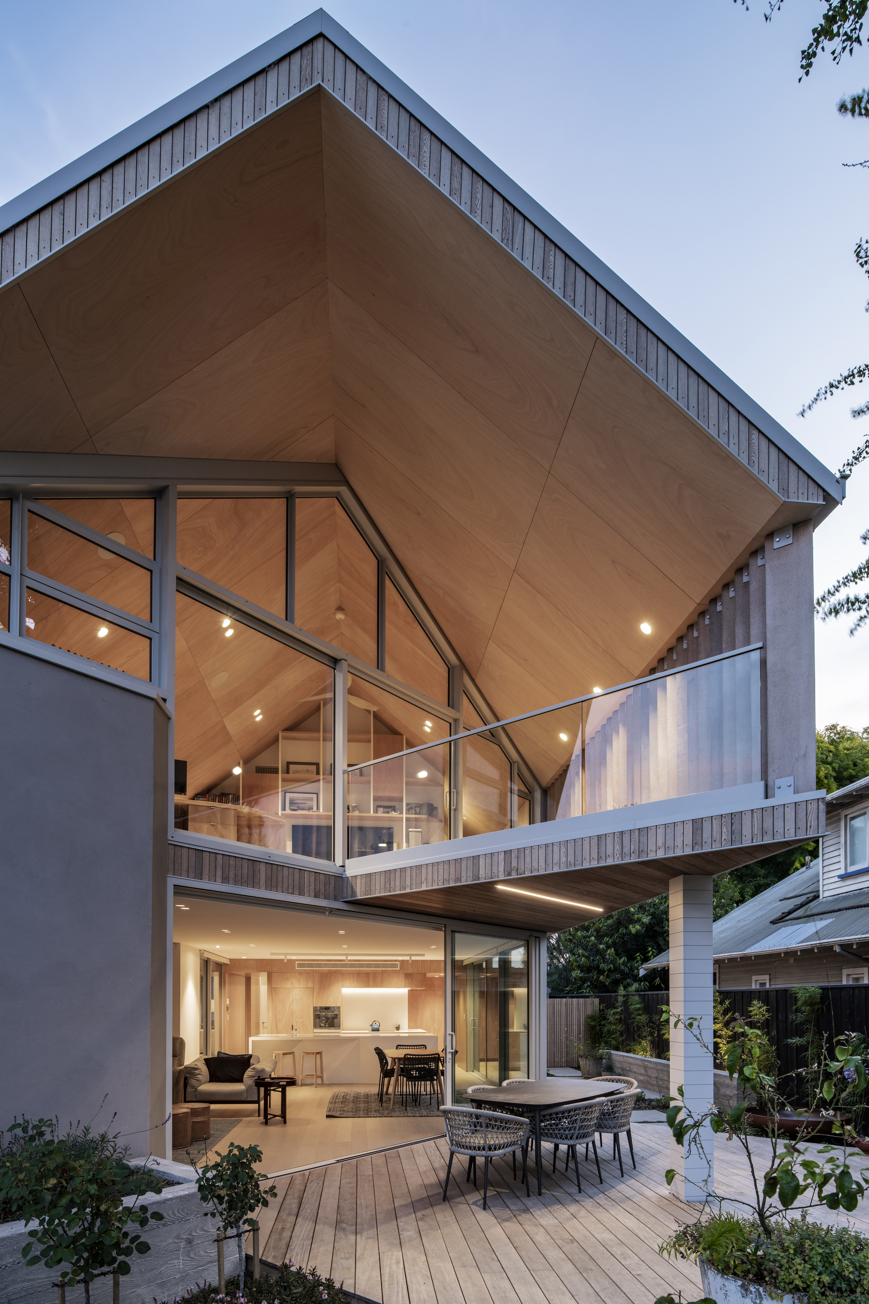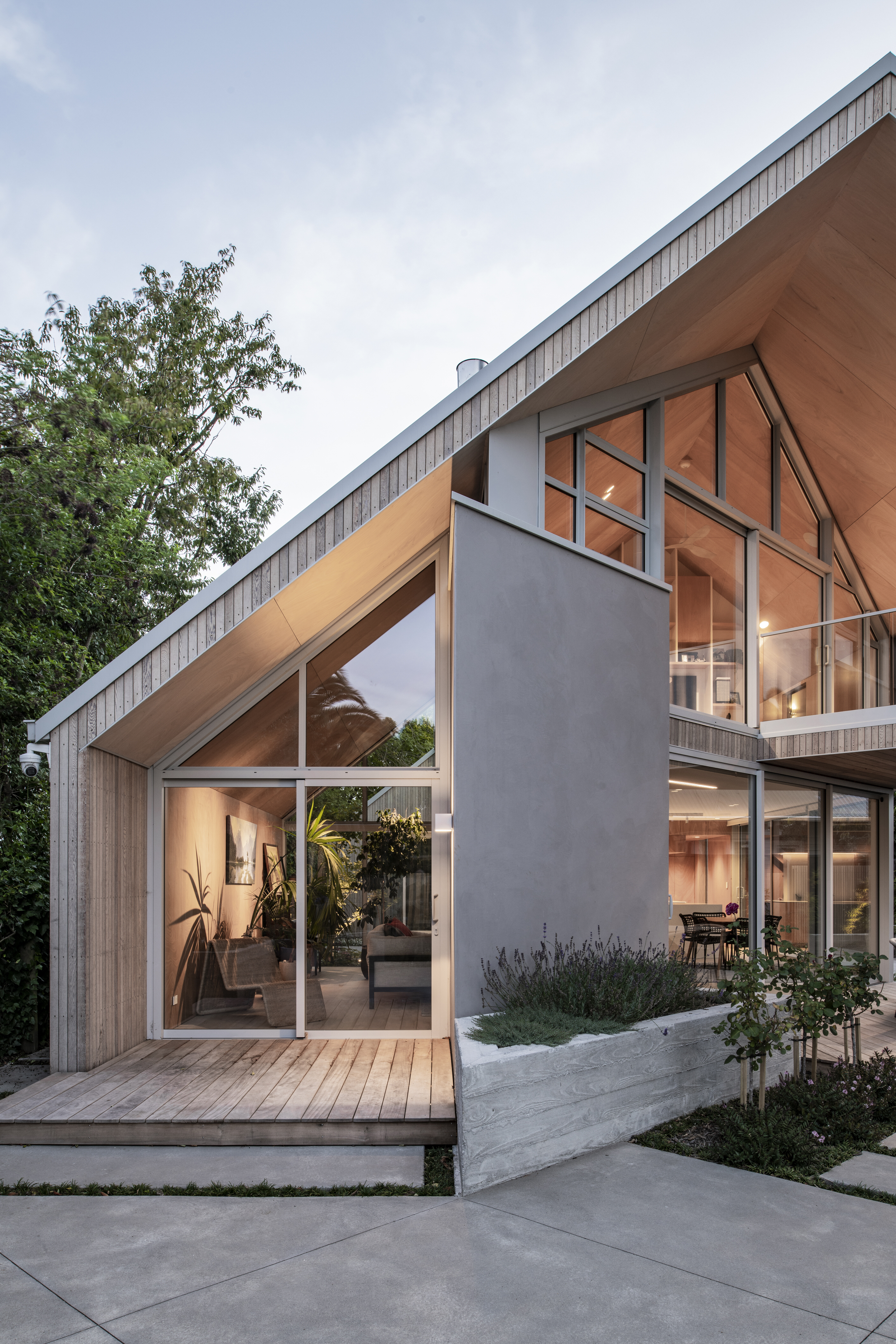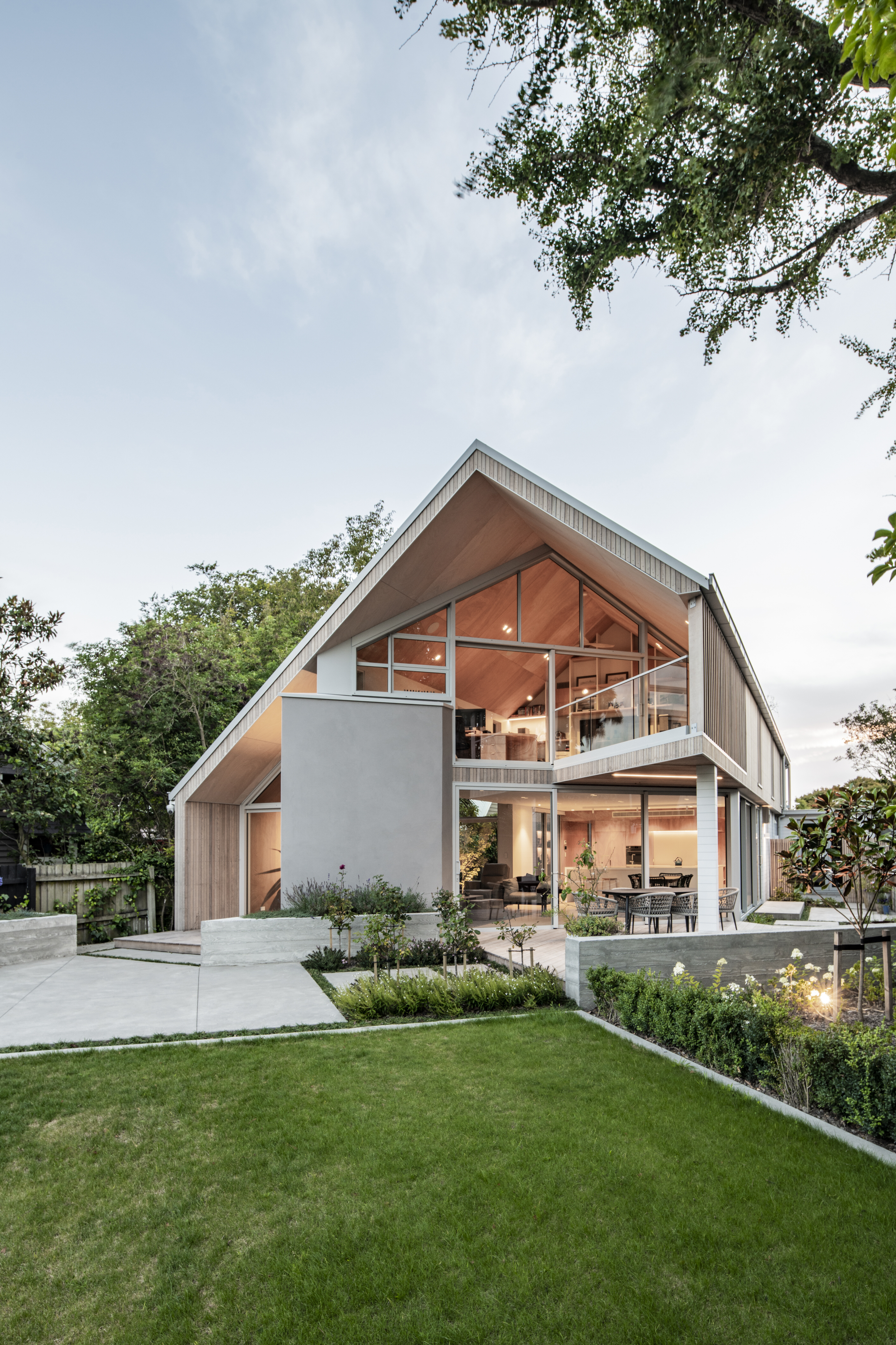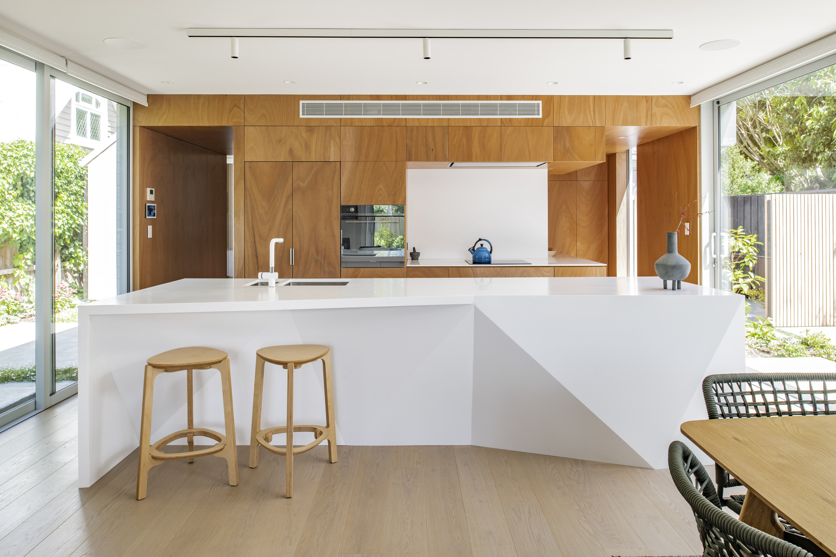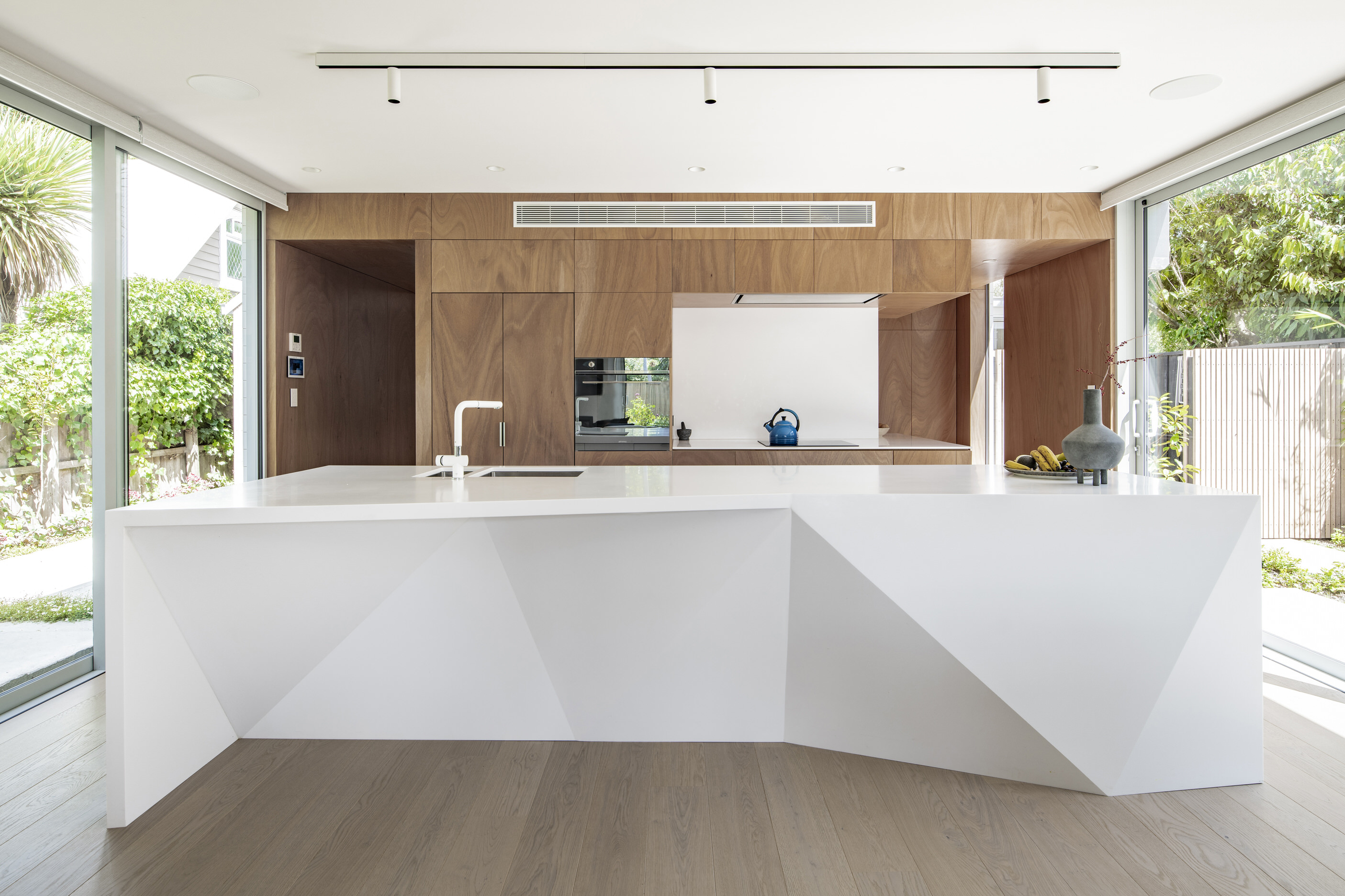 Every so often, builders have the opportunity to work on a home that requires extraordinary expertise, planning and attention to detail. This three-bedroom house that rises from its site like a piece of art, is one such project.The 282sqm house was already a challenge, due to the many technical aspects of the build, but the construction team also had to work with a small, narrow site that entailed craning in many of the high-end materials. Some features had to be made on site, such as the expansive window sections that are now in place under the soaring gable. Each piece of cedar on the gable was attached by hand – this is just one example of the highly crafted response that can be seen throughout the home. There is beauty and bespoke detail wherever you look– the angles of the rooms, the fittings, geometric facets of the kitchen island, gaboon plywood panels and the landscaping. But there is also a lot of unseen detail. The owners were adamant their house, designed by South Architects, be sustainable, efficient and quiet. Above-code insulation, low-e thermally broken windows, mechanical ventilation and solar power have been installed. Double-framed walls reduce street noise. Rightly, the building team is enormously proud.