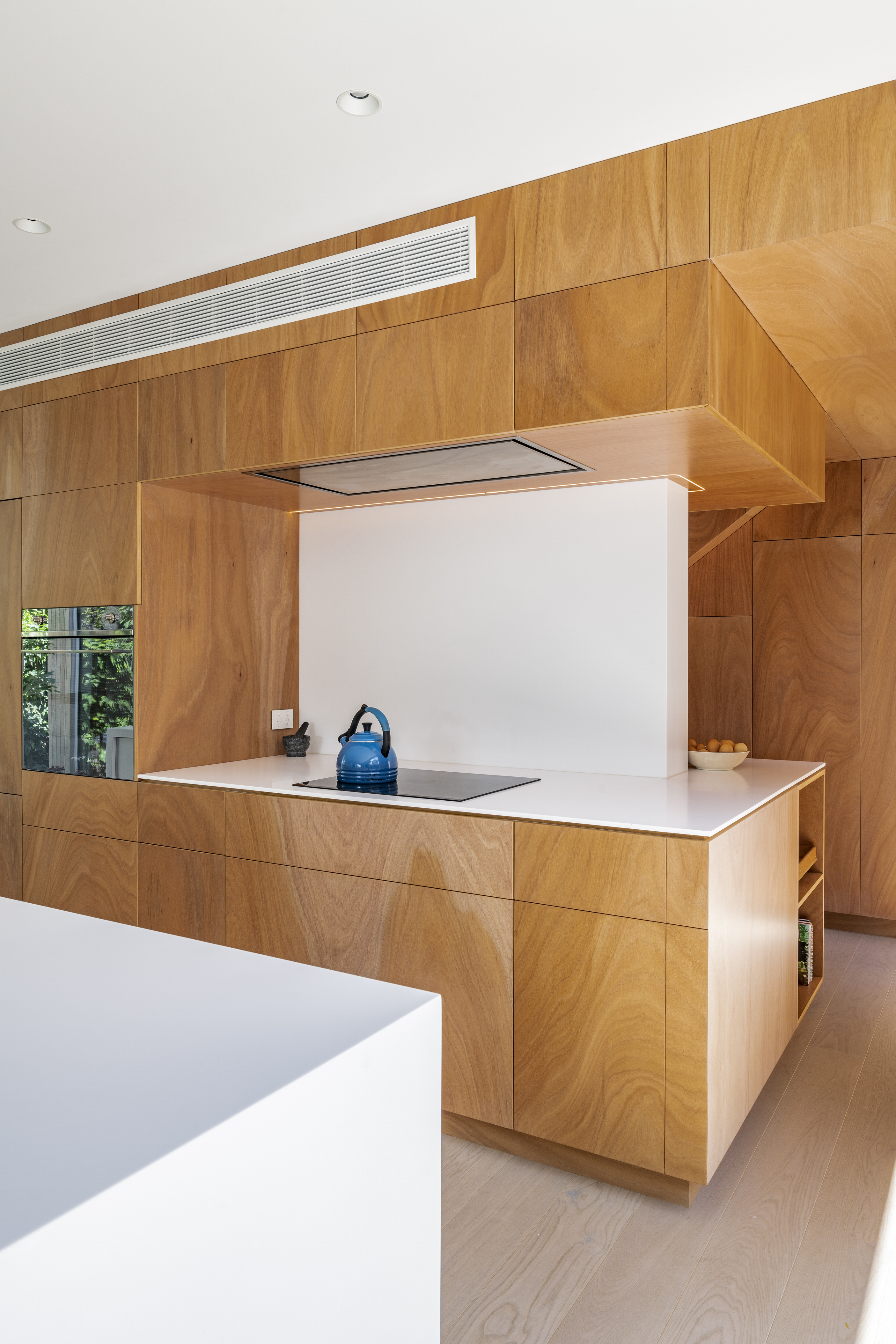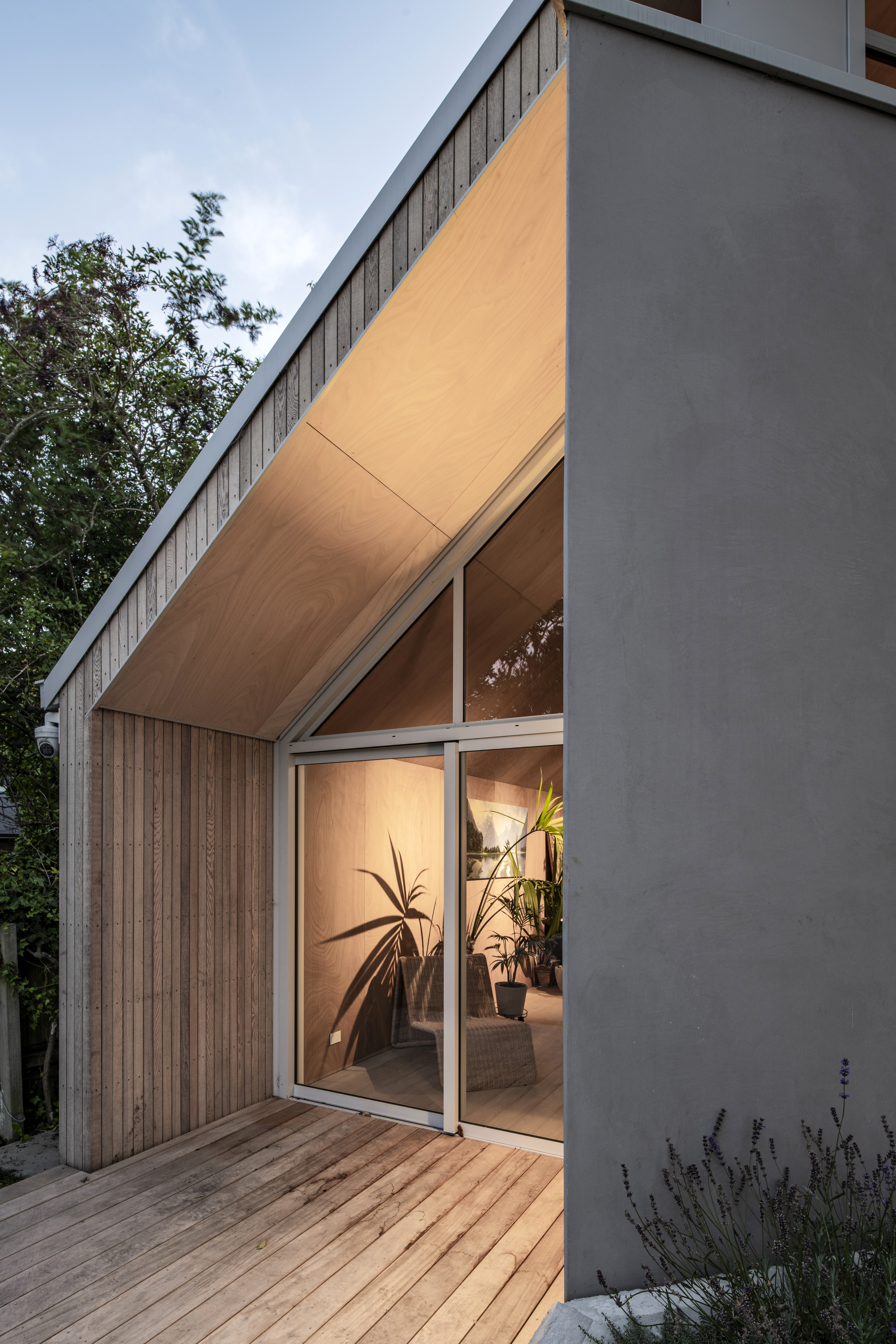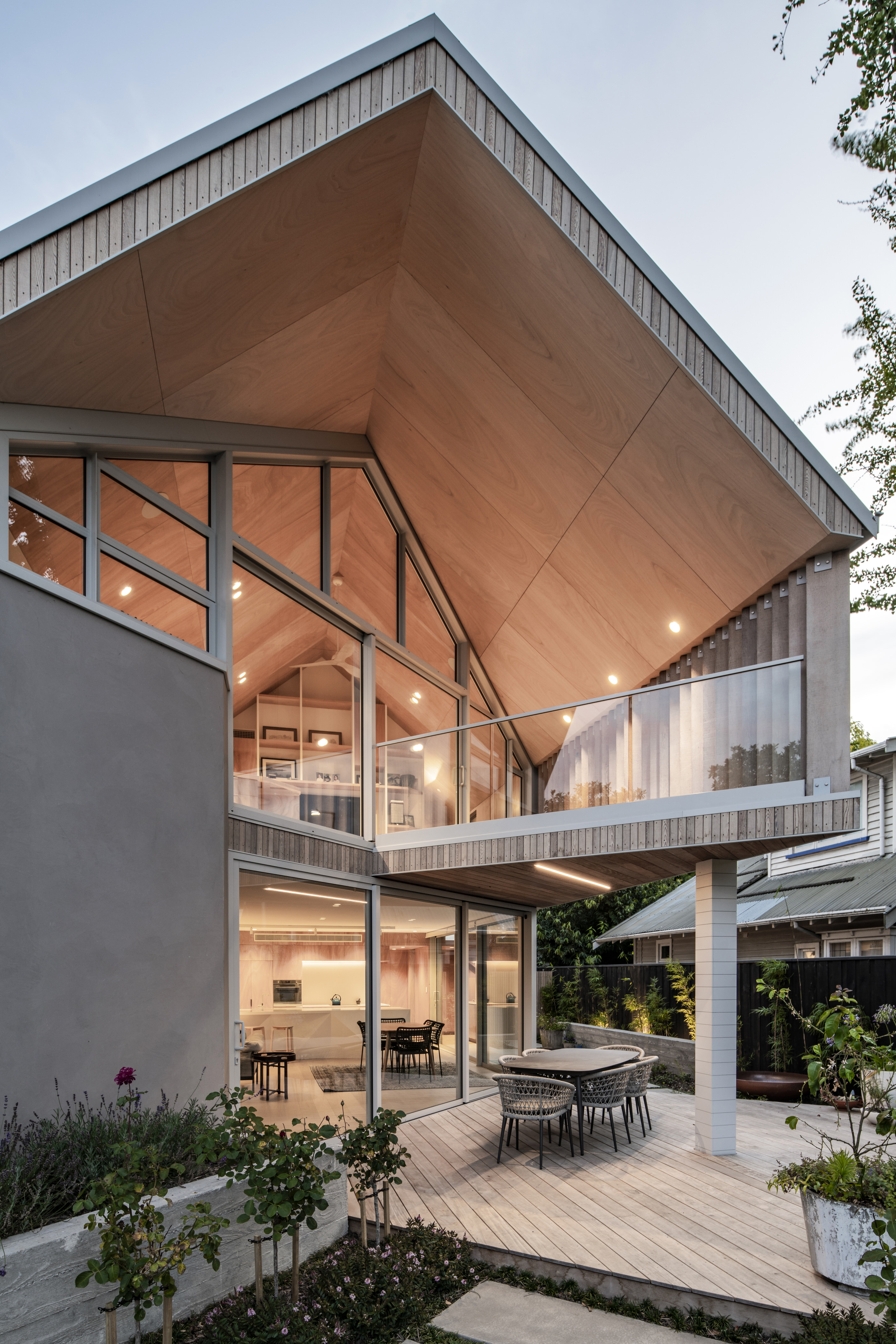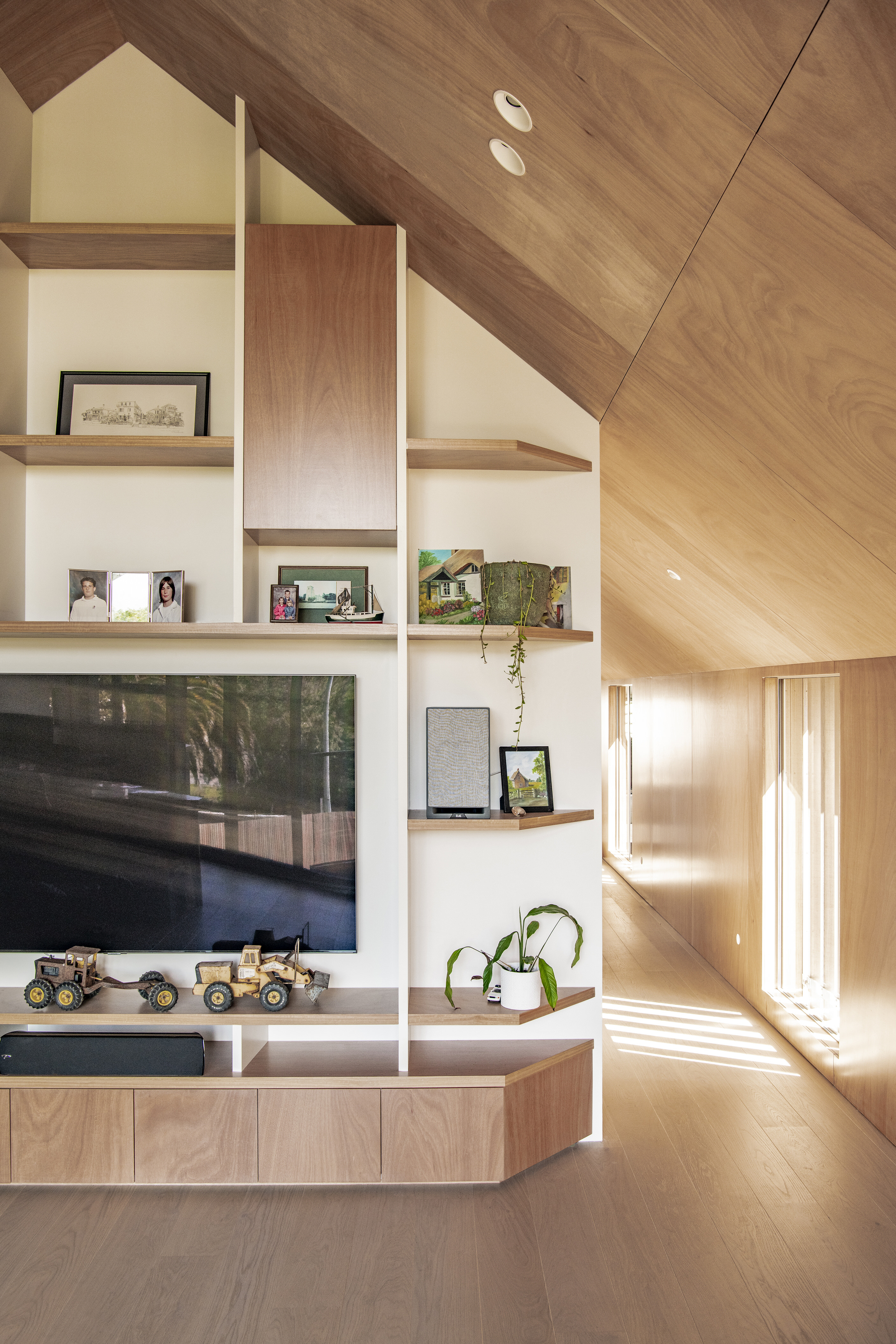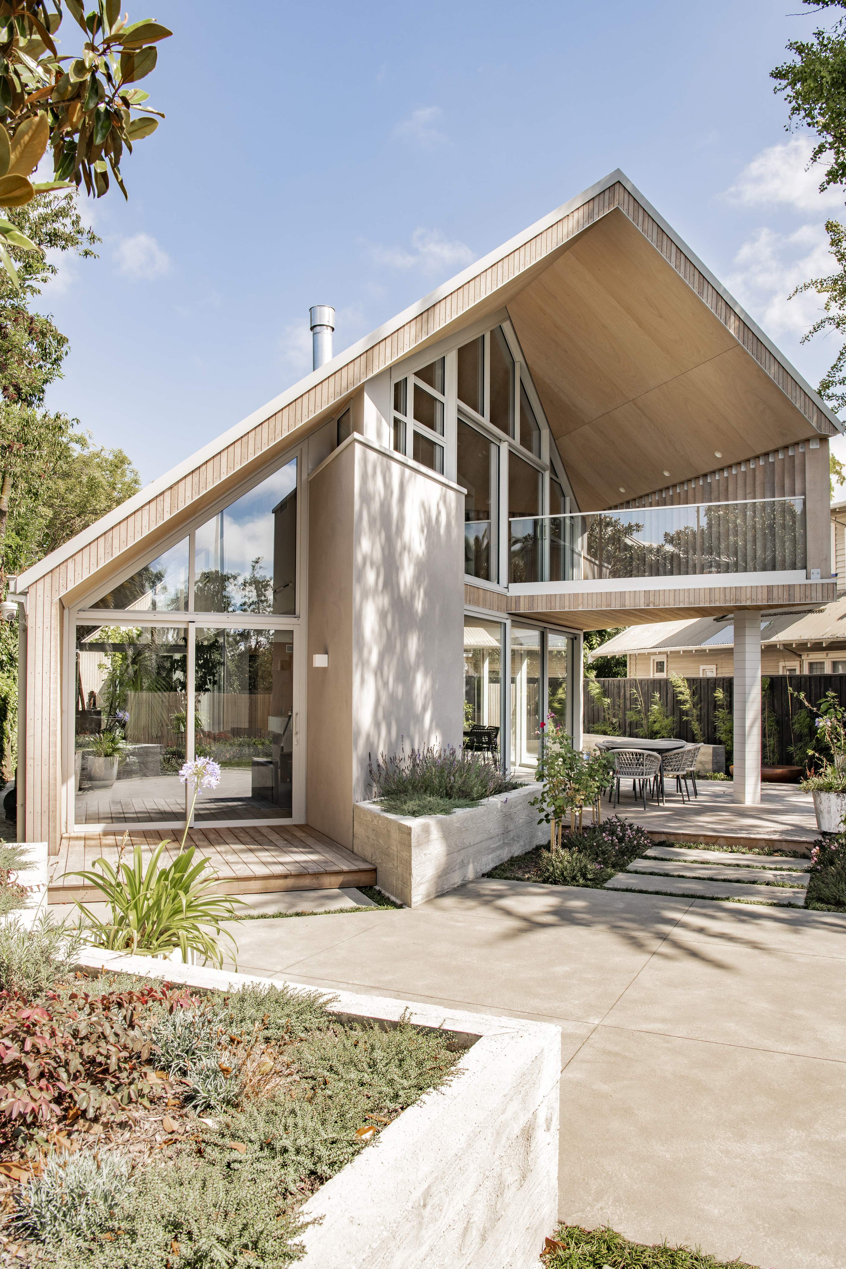 Every so often, builders have the opportunity to work on a home that requires extraordinary expertise, planning and attention to detail. This three-bedroom house that rises from its site like a piece of art, is one such project.The 282sqm house was already a challenge, due to the many technical aspects of the build, but the construction team also had to work with a small, narrow site that entailed craning in many of the high-end materials. Some features had to be made on site, such as the expansive window sections that are now in place under the soaring gable. Each piece of cedar on the gable was attached by hand – this is just one example of the highly crafted response that can be seen throughout the home. There is beauty and bespoke detail wherever you look– the angles of the rooms, the fittings, geometric facets of the kitchen island, gaboon plywood panels and the landscaping. But there is also a lot of unseen detail. The owners were adamant their house, designed by South Architects, be sustainable, efficient and quiet. Above-code insulation, low-e thermally broken windows, mechanical ventilation and solar power have been installed. Double-framed walls reduce street noise. Rightly, the building team is enormously proud.