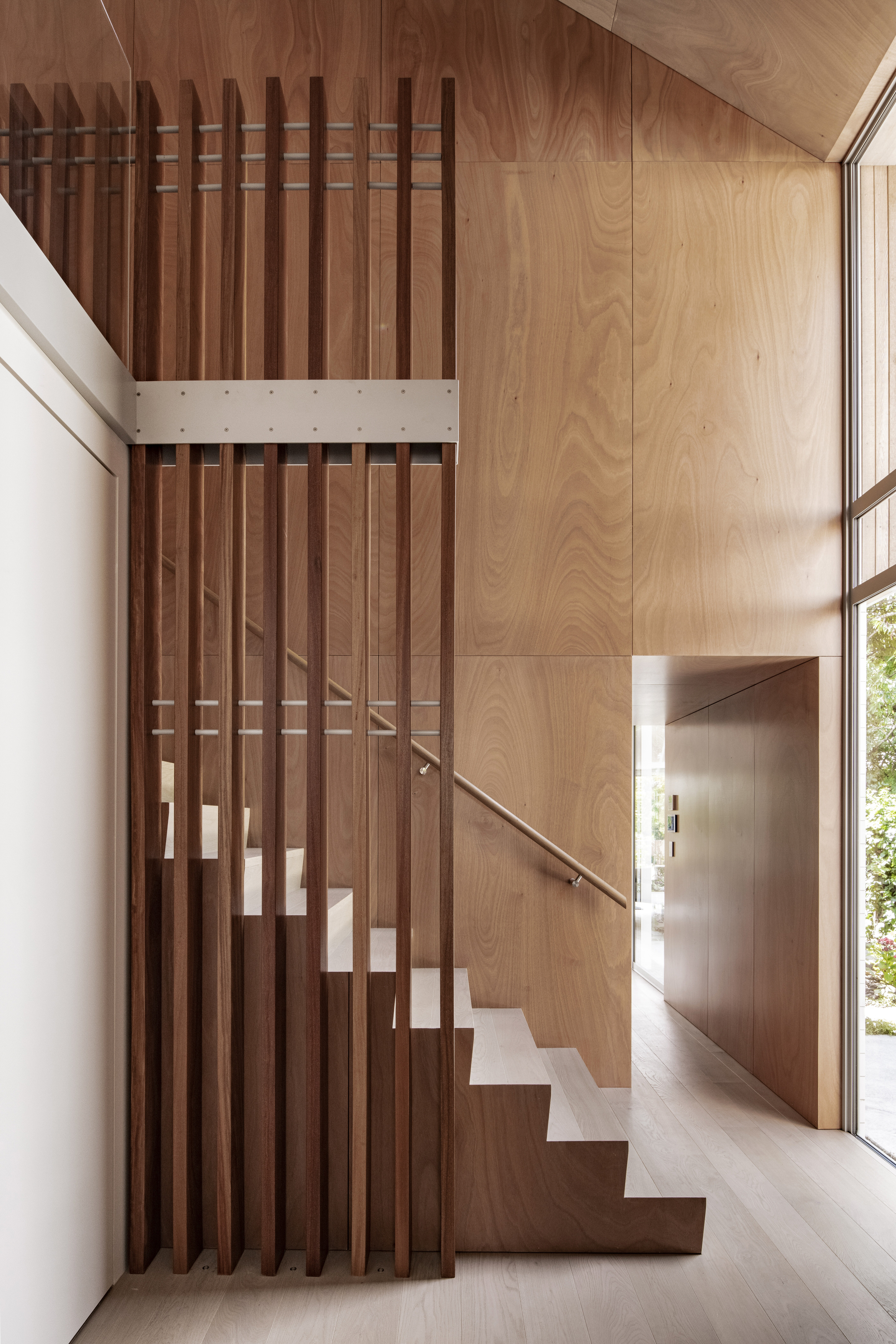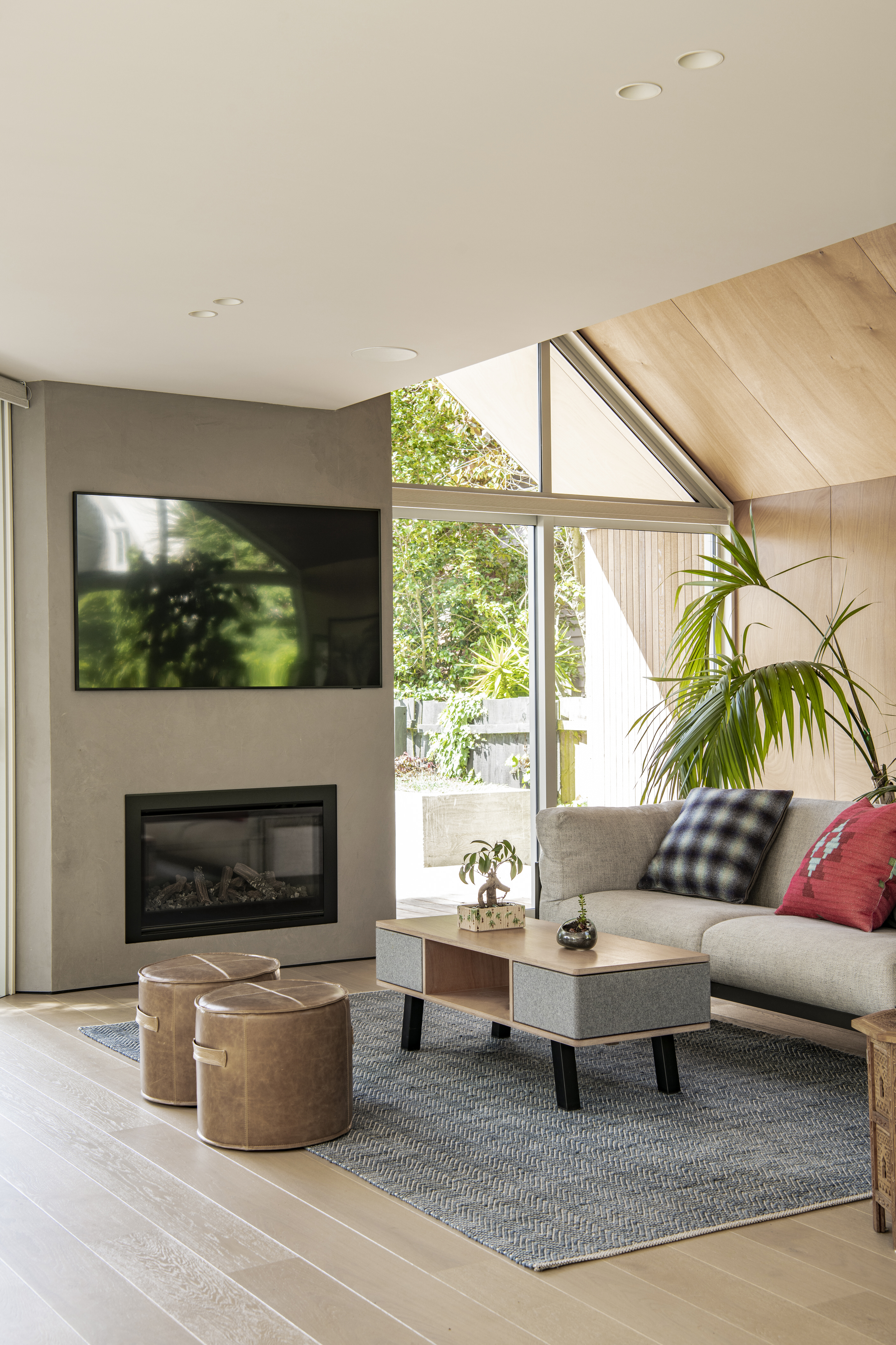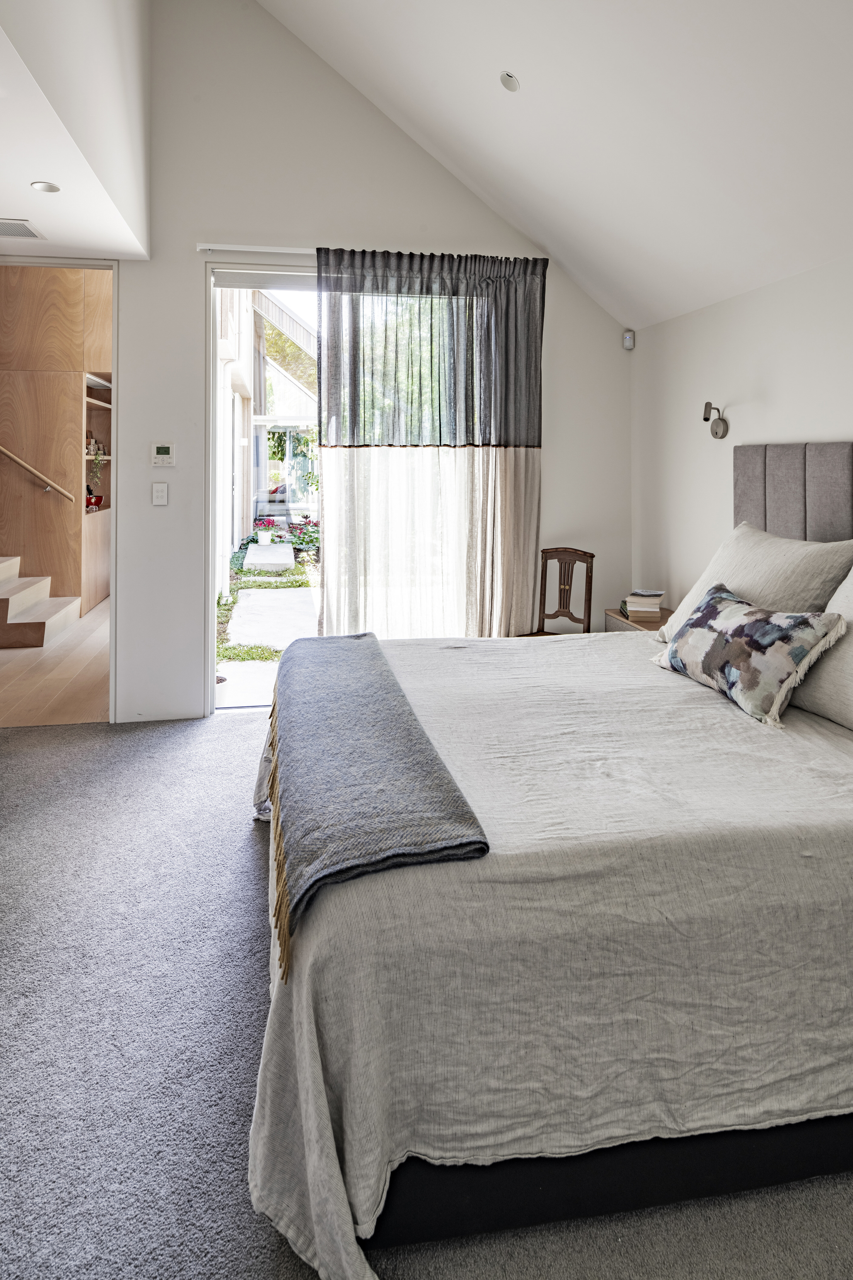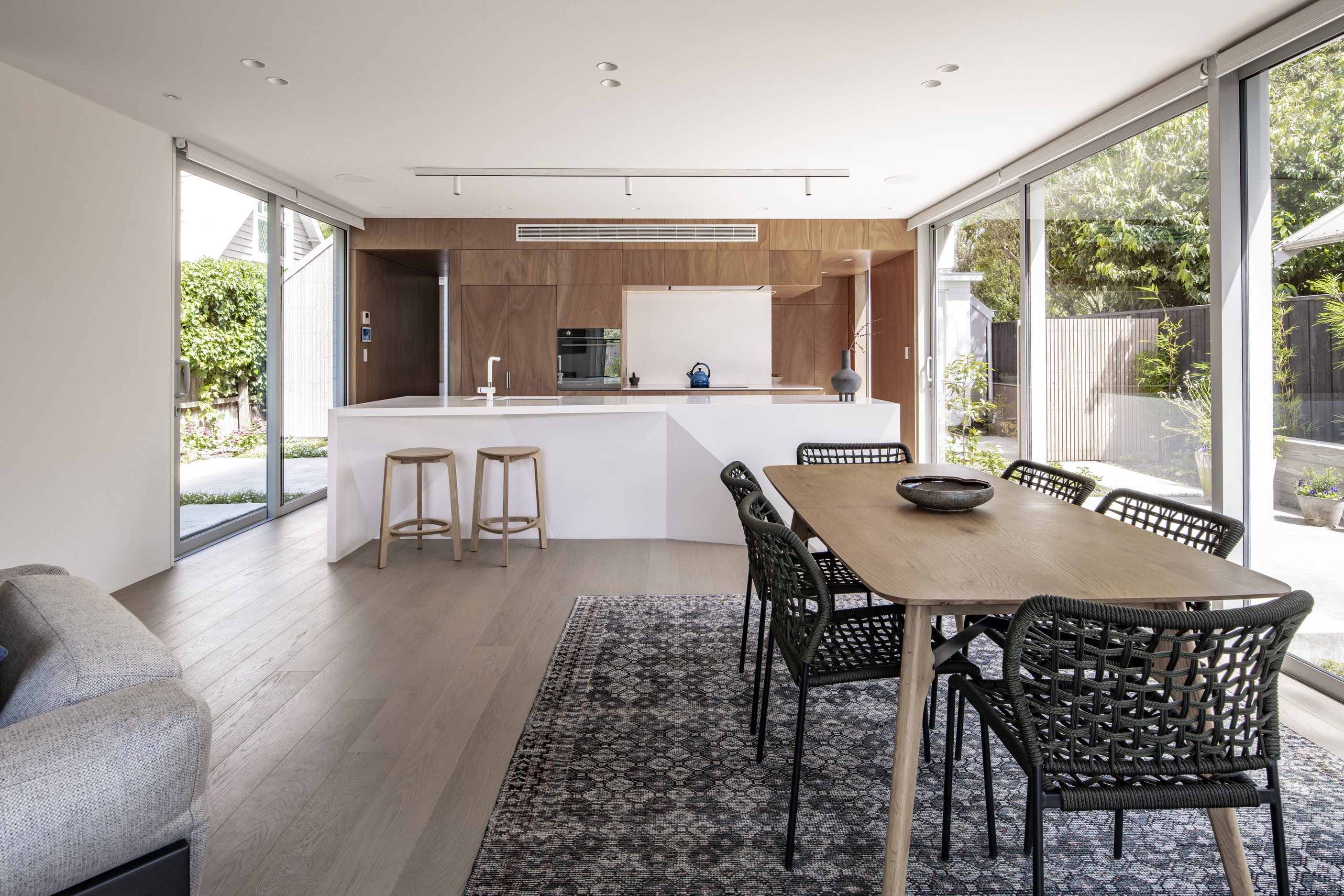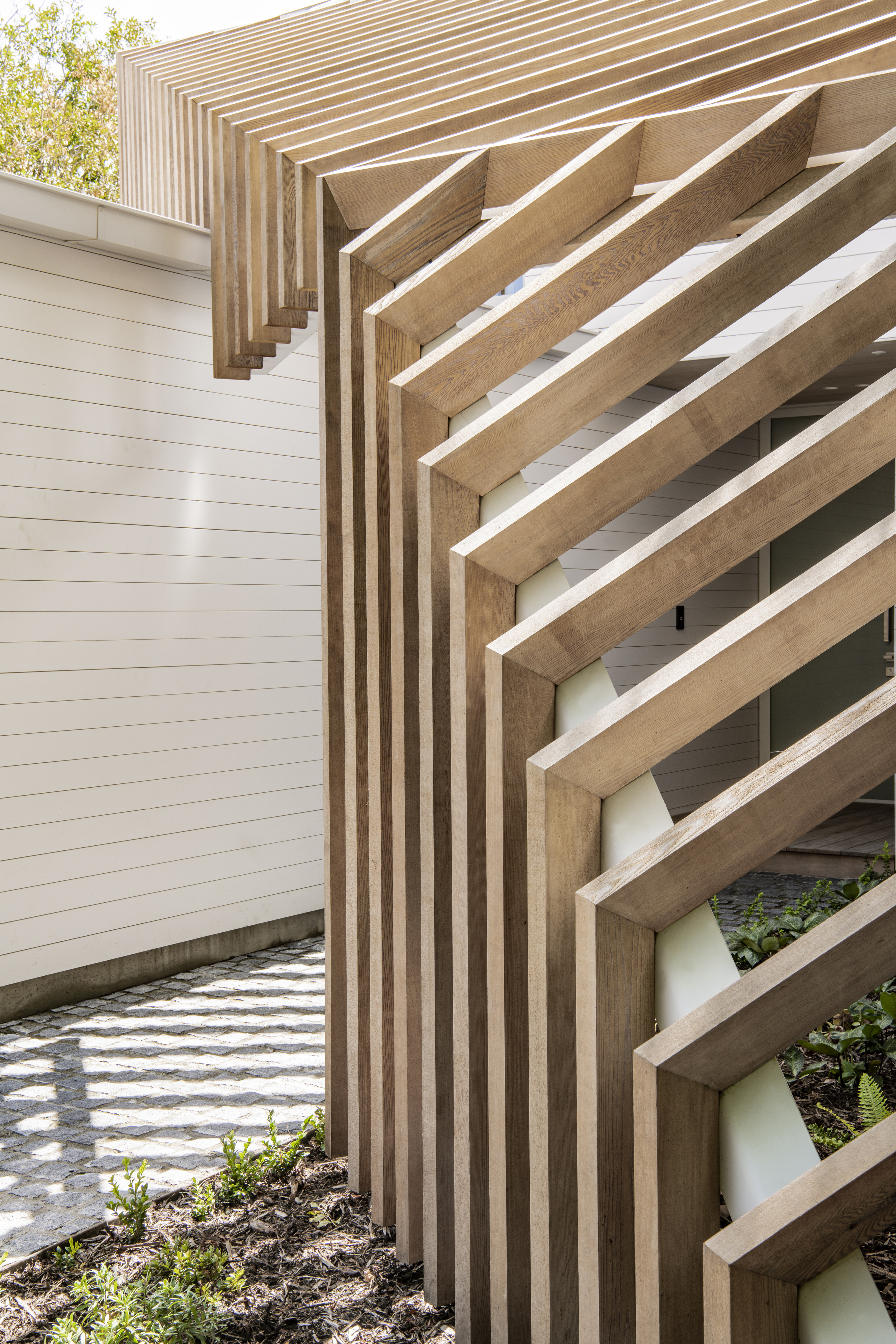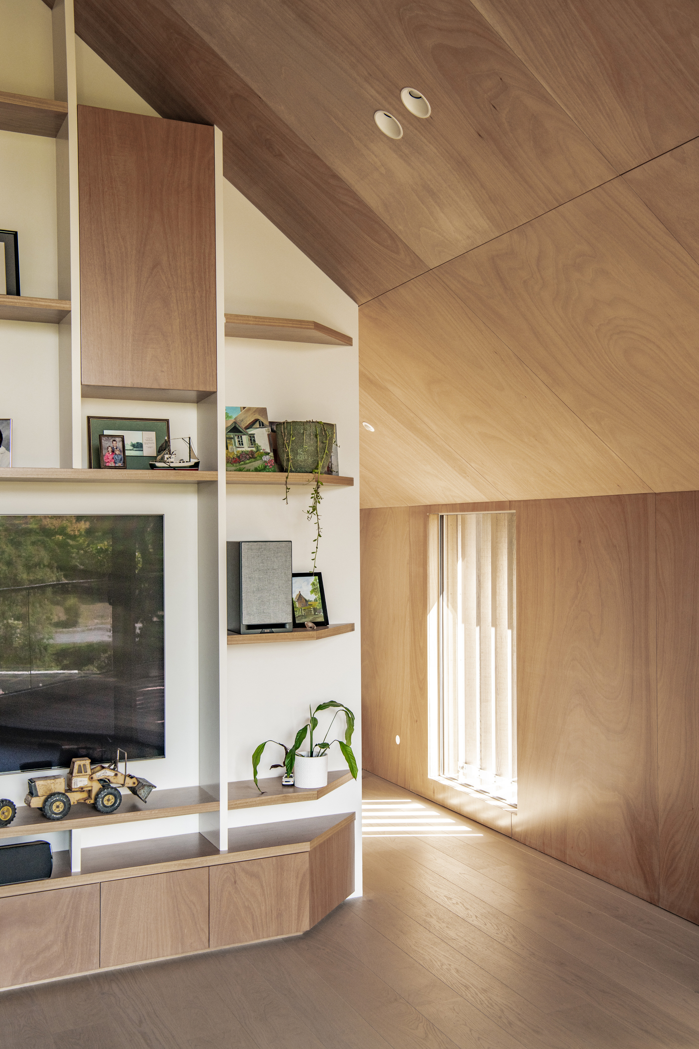 Every so often, builders have the opportunity to work on a home that requires extraordinary expertise, planning and attention to detail. This three-bedroom house that rises from its site like a piece of art, is one such project.The 282sqm house was already a challenge, due to the many technical aspects of the build, but the construction team also had to work with a small, narrow site that entailed craning in many of the high-end materials. Some features had to be made on site, such as the expansive window sections that are now in place under the soaring gable. Each piece of cedar on the gable was attached by hand – this is just one example of the highly crafted response that can be seen throughout the home. There is beauty and bespoke detail wherever you look– the angles of the rooms, the fittings, geometric facets of the kitchen island, gaboon plywood panels and the landscaping. But there is also a lot of unseen detail. The owners were adamant their house, designed by South Architects, be sustainable, efficient and quiet. Above-code insulation, low-e thermally broken windows, mechanical ventilation and solar power have been installed. Double-framed walls reduce street noise. Rightly, the building team is enormously proud.