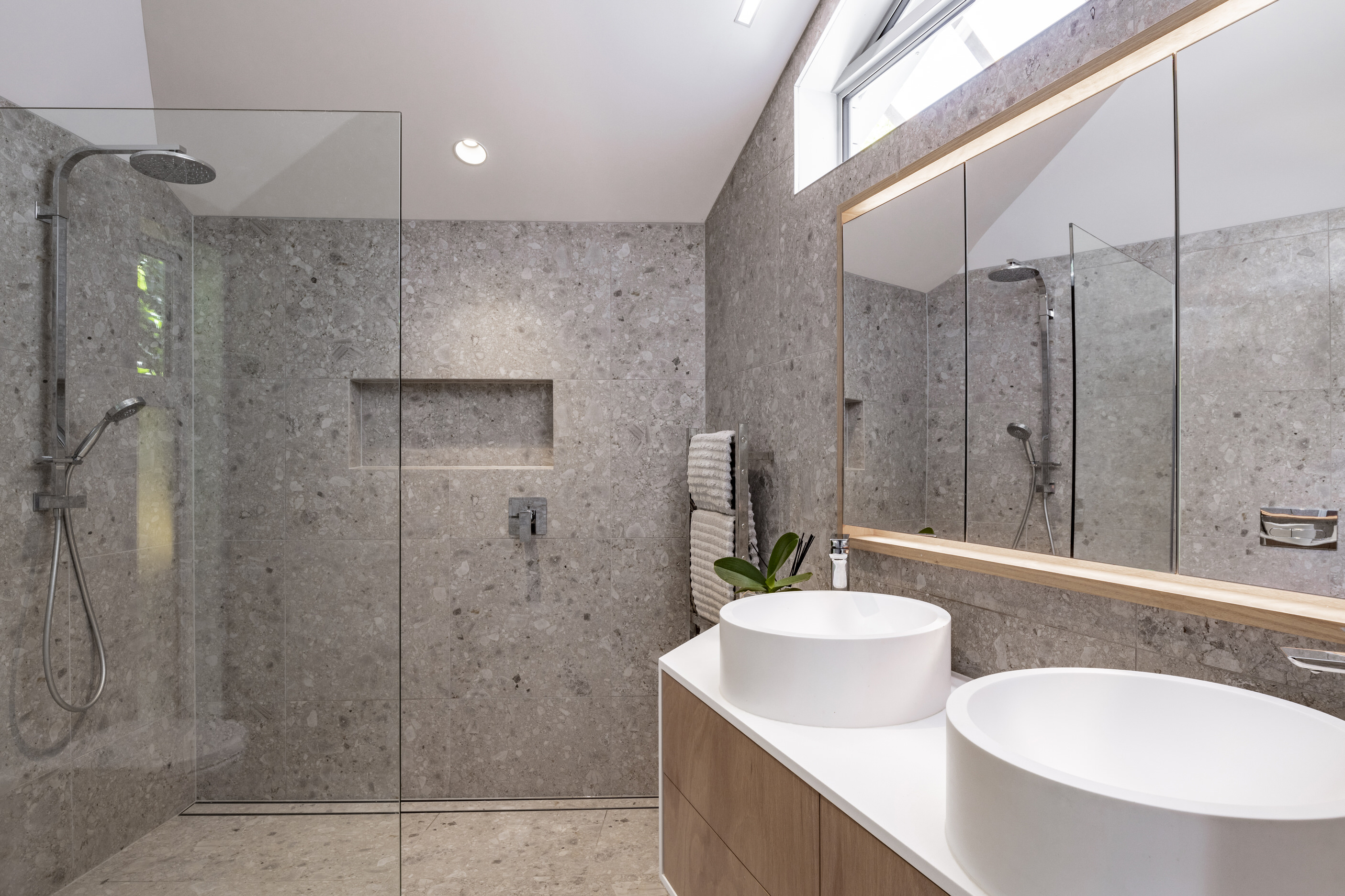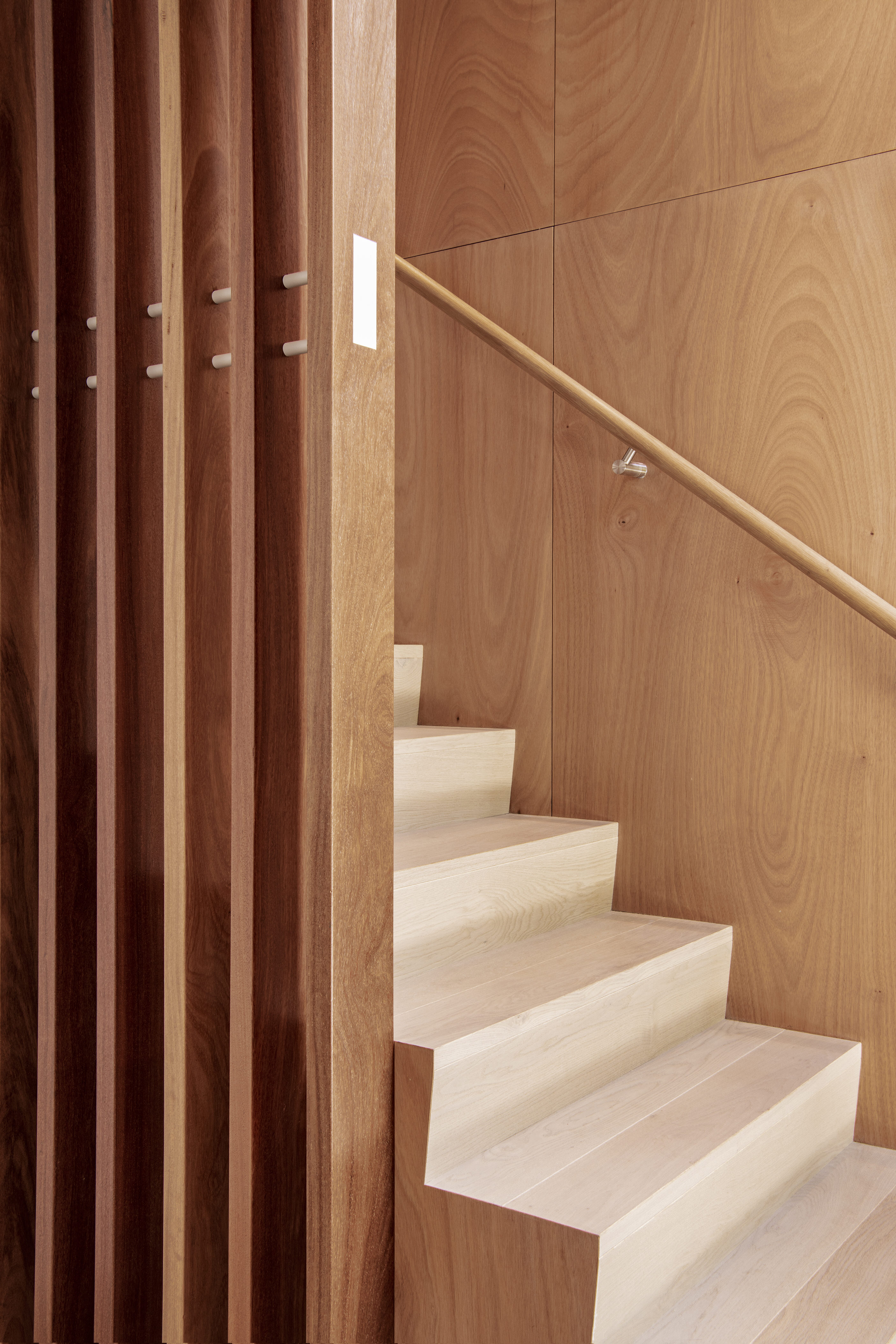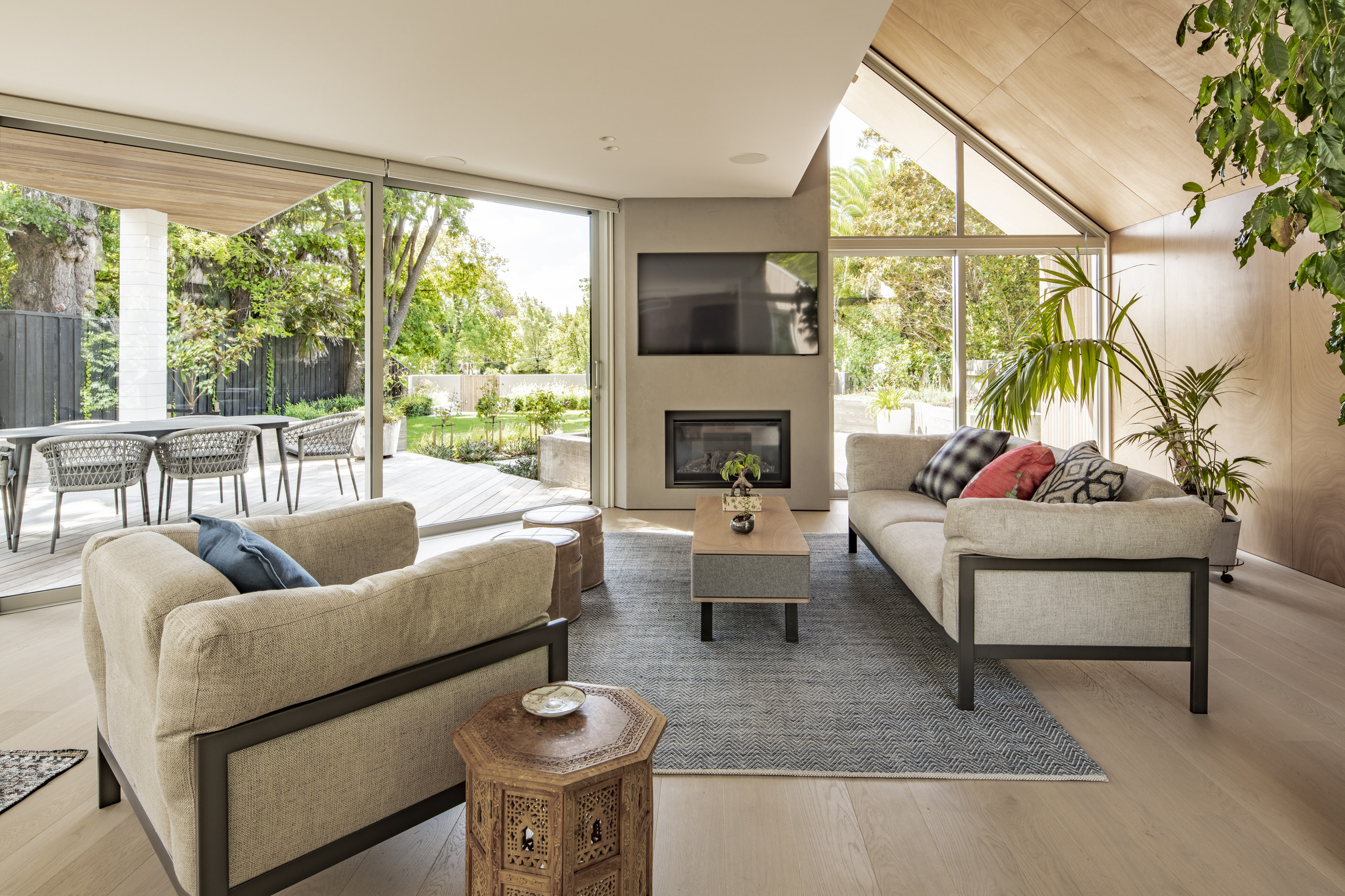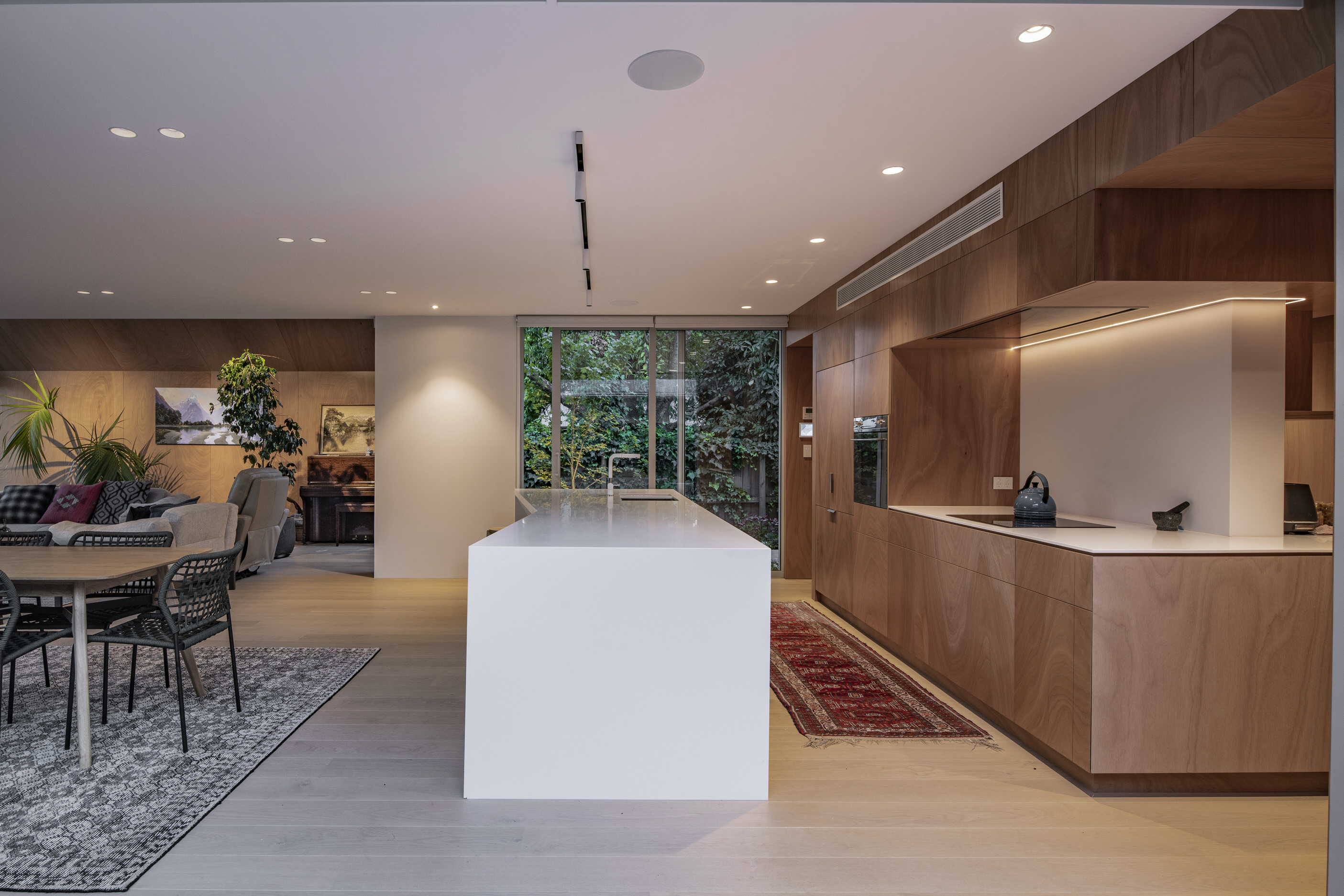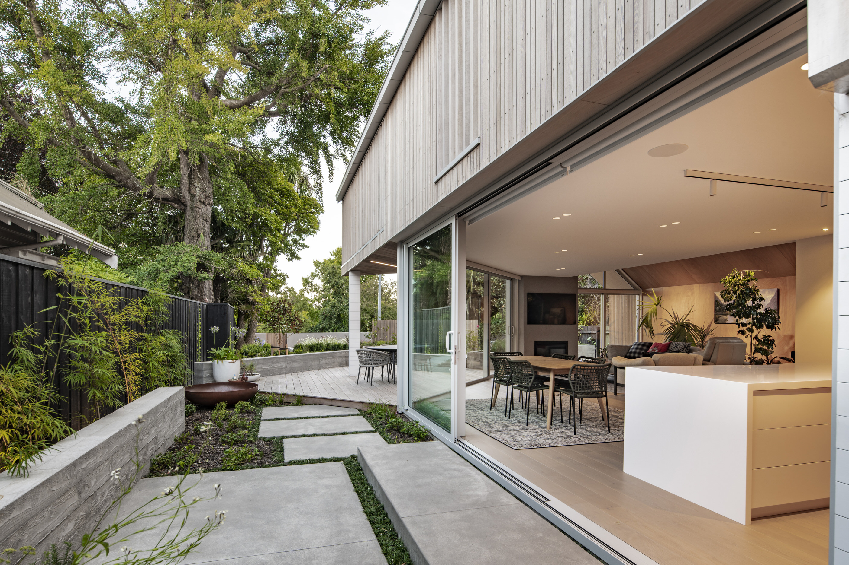 Every so often, builders have the opportunity to work on a home that requires extraordinary expertise, planning and attention to detail. This three-bedroom house that rises from its site like a piece of art, is one such project.The 282sqm house was already a challenge, due to the many technical aspects of the build, but the construction team also had to work with a small, narrow site that entailed craning in many of the high-end materials. Some features had to be made on site, such as the expansive window sections that are now in place under the soaring gable. Each piece of cedar on the gable was attached by hand – this is just one example of the highly crafted response that can be seen throughout the home. There is beauty and bespoke detail wherever you look– the angles of the rooms, the fittings, geometric facets of the kitchen island, gaboon plywood panels and the landscaping. But there is also a lot of unseen detail. The owners were adamant their house, designed by South Architects, be sustainable, efficient and quiet. Above-code insulation, low-e thermally broken windows, mechanical ventilation and solar power have been installed. Double-framed walls reduce street noise. Rightly, the building team is enormously proud.