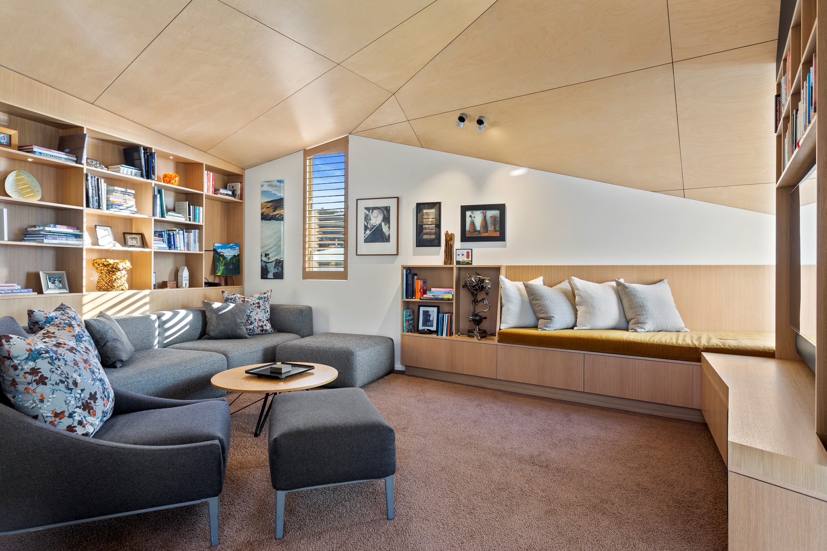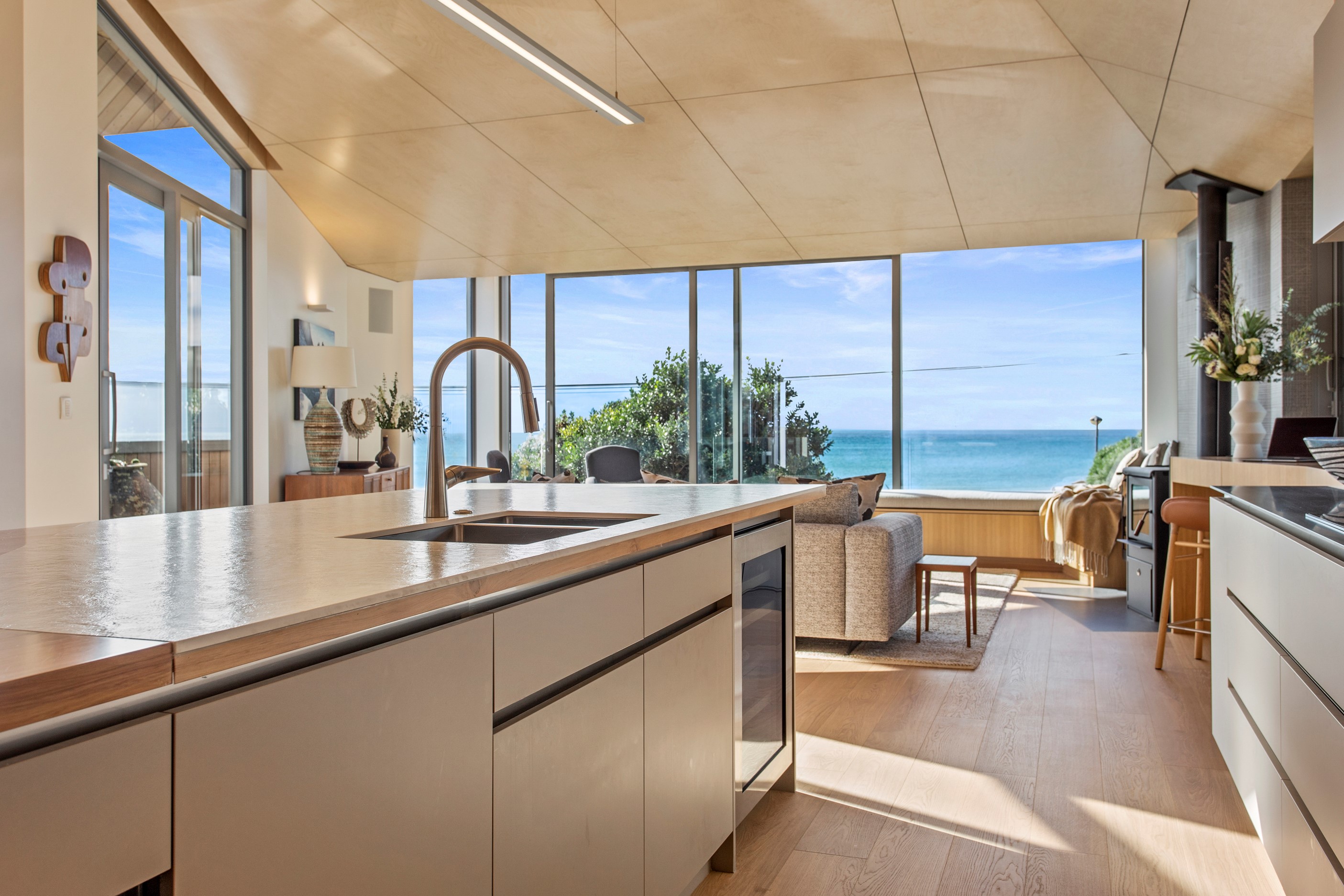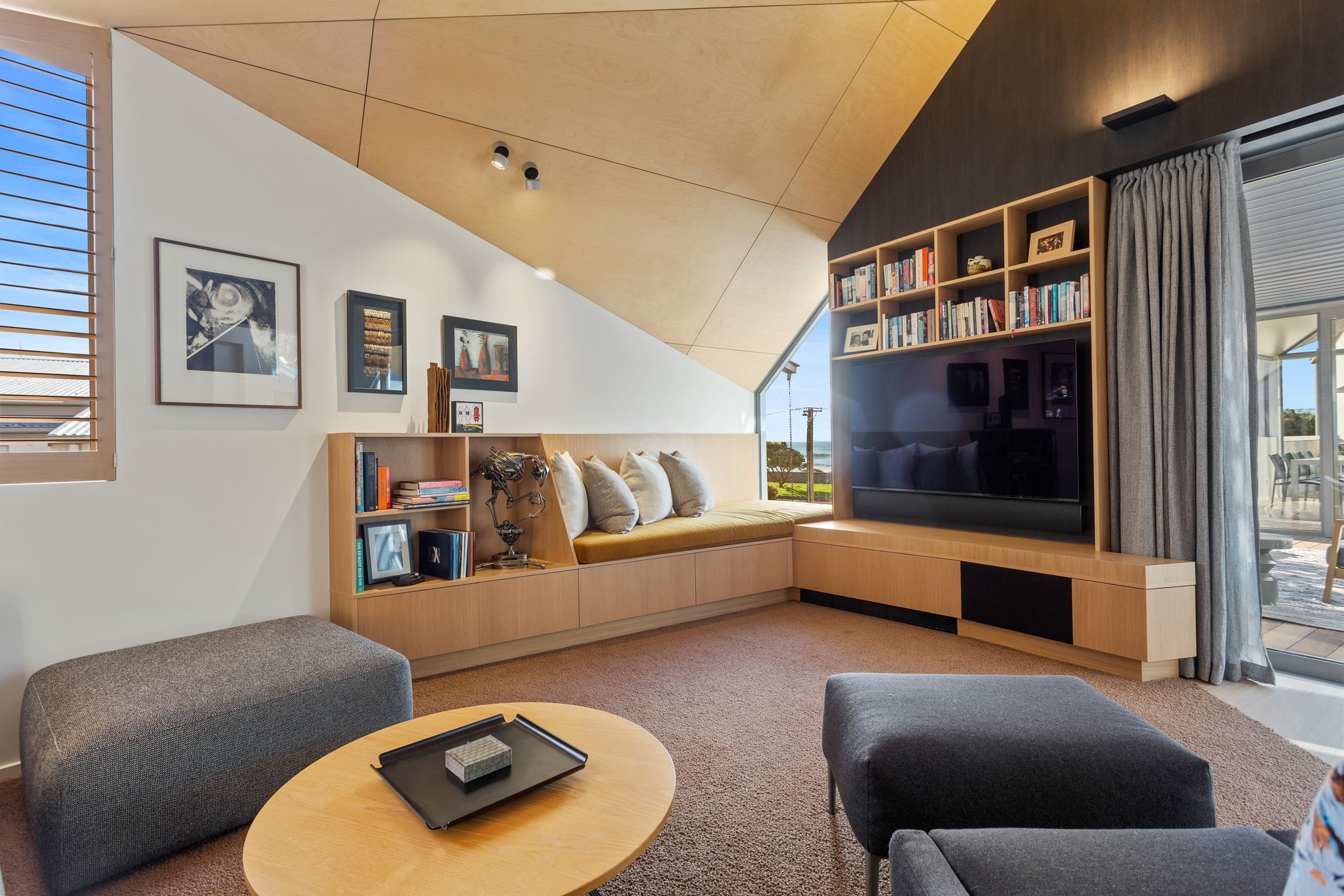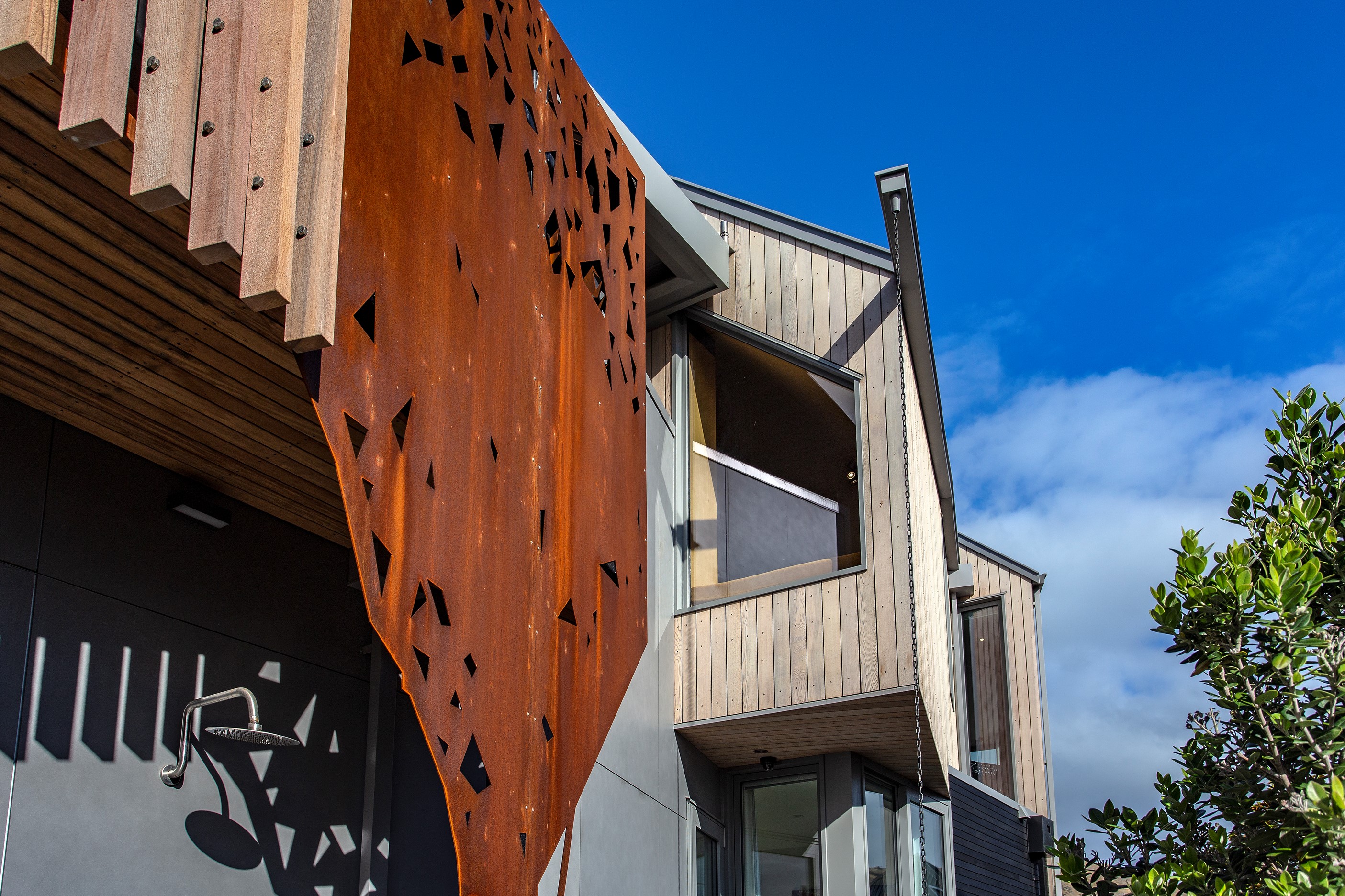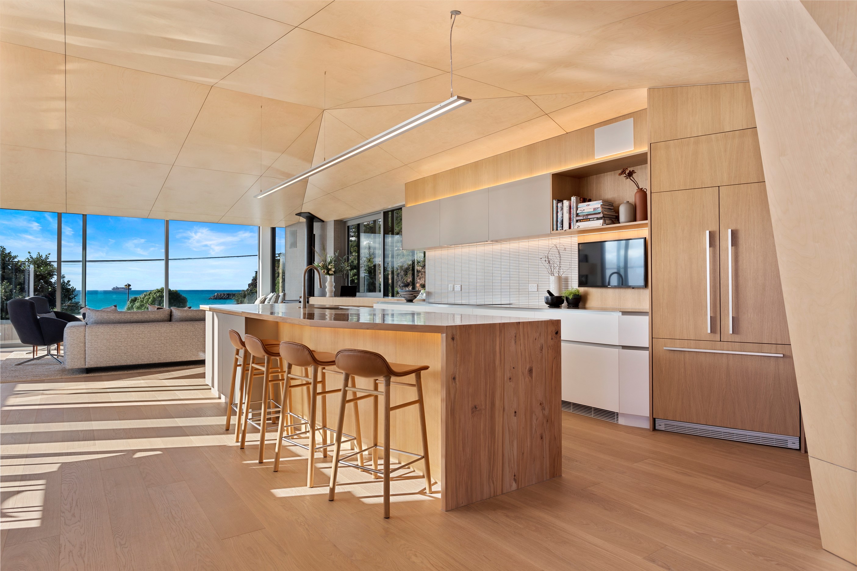 Tricky angles and lines, a cantilevered living space and myriad eye-catching features required something special from the team building this four-bedroom home. The Metzger crew was up to the challenge, demonstrating sublime skills and scrupulous craftsmanship from the footings through to the installation of the final fitting. The leading-edge 350sqm house, designed by South Architects, is built from natural products, including cedar and local stone, which relax the dwelling into its beach setting. And what a setting it is. Step inside and almost every space has views of the Pacific Ocean, from sweeping vistas to cheeky peeps. The upstairs living space is cantilevered to maximise surf views, and even the sheltered outdoor room has a screen through which you can catch glimpses of the sea and sky beyond. What’s inside is pretty impressive, too. A double-height stone feature wall and the complex plywood ceiling are details to admire. However, this house demonstrates more than flair and design nous. Sustainability and longevity measures – solar power hydronic infloor heating, extensive insulation, a lift and more – ensure it works hard for its owners and the environment.