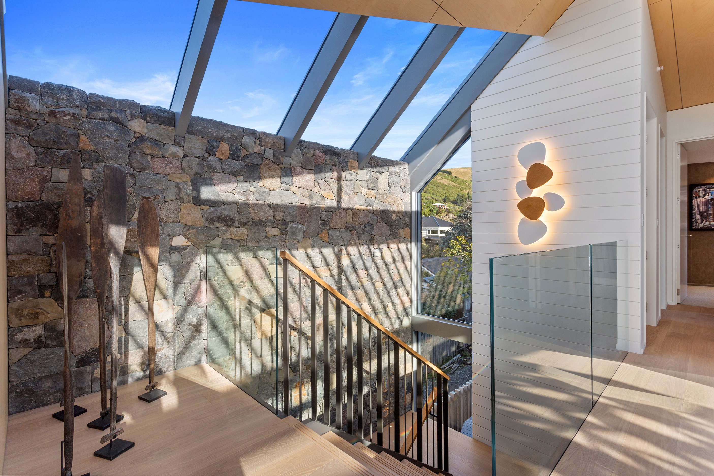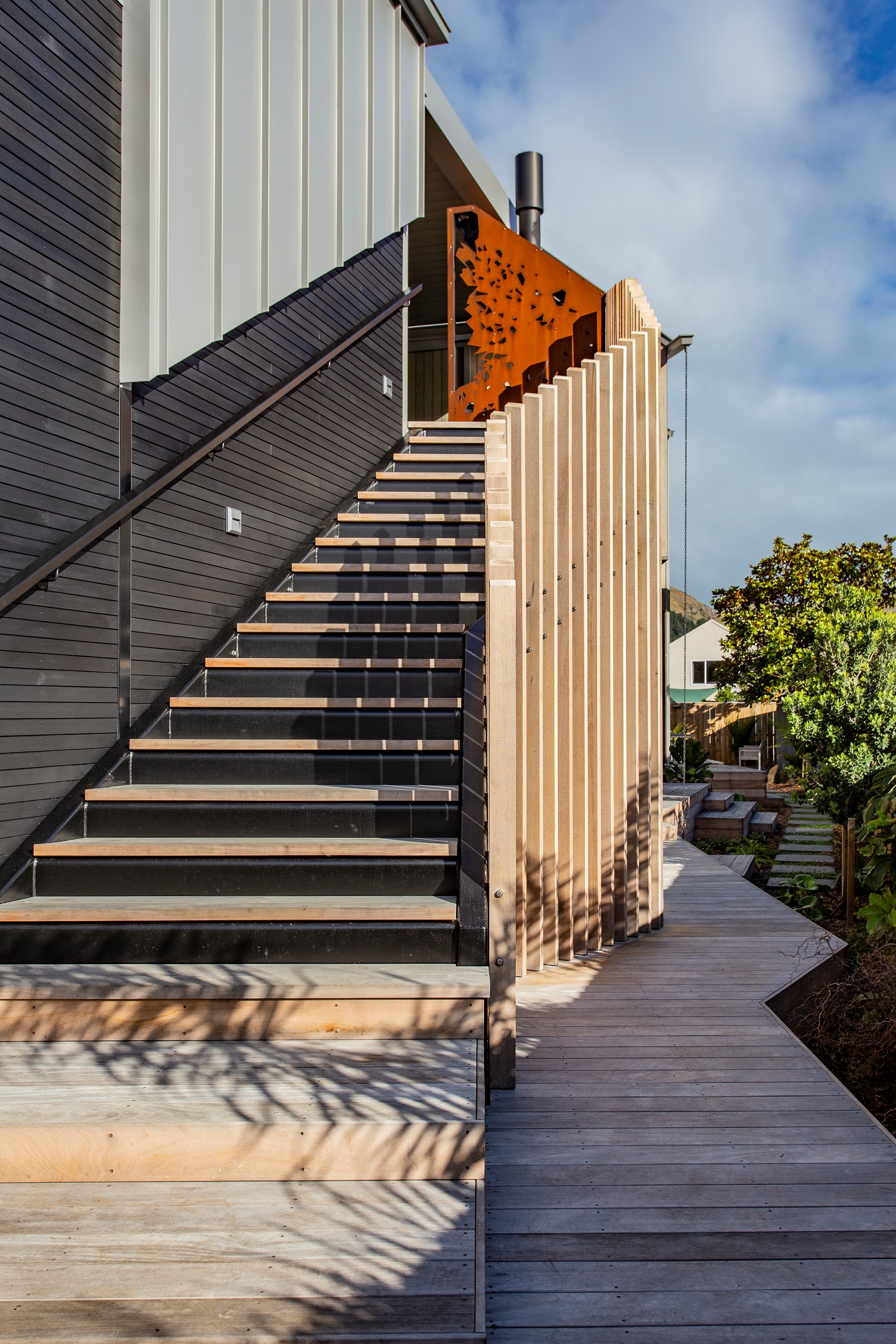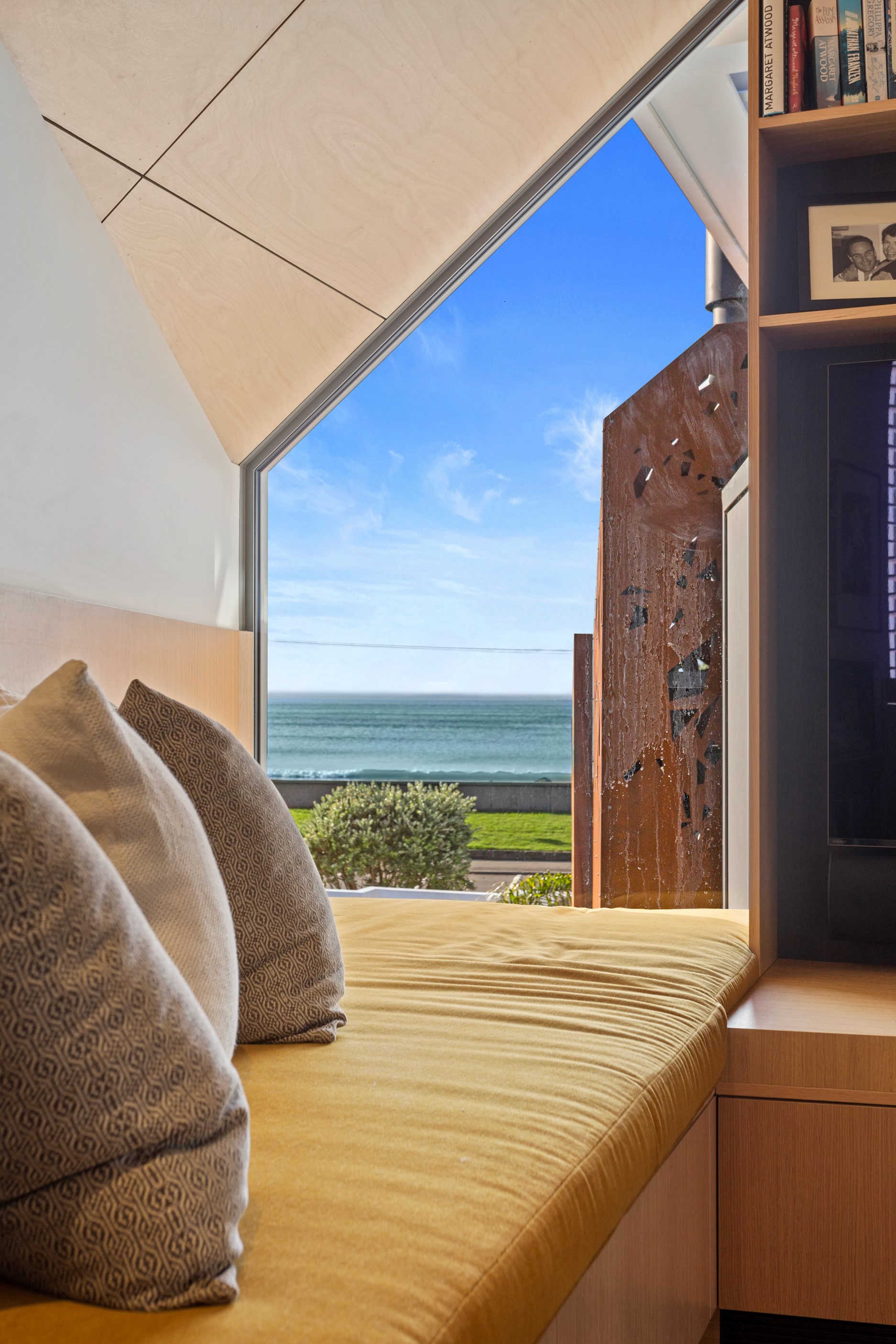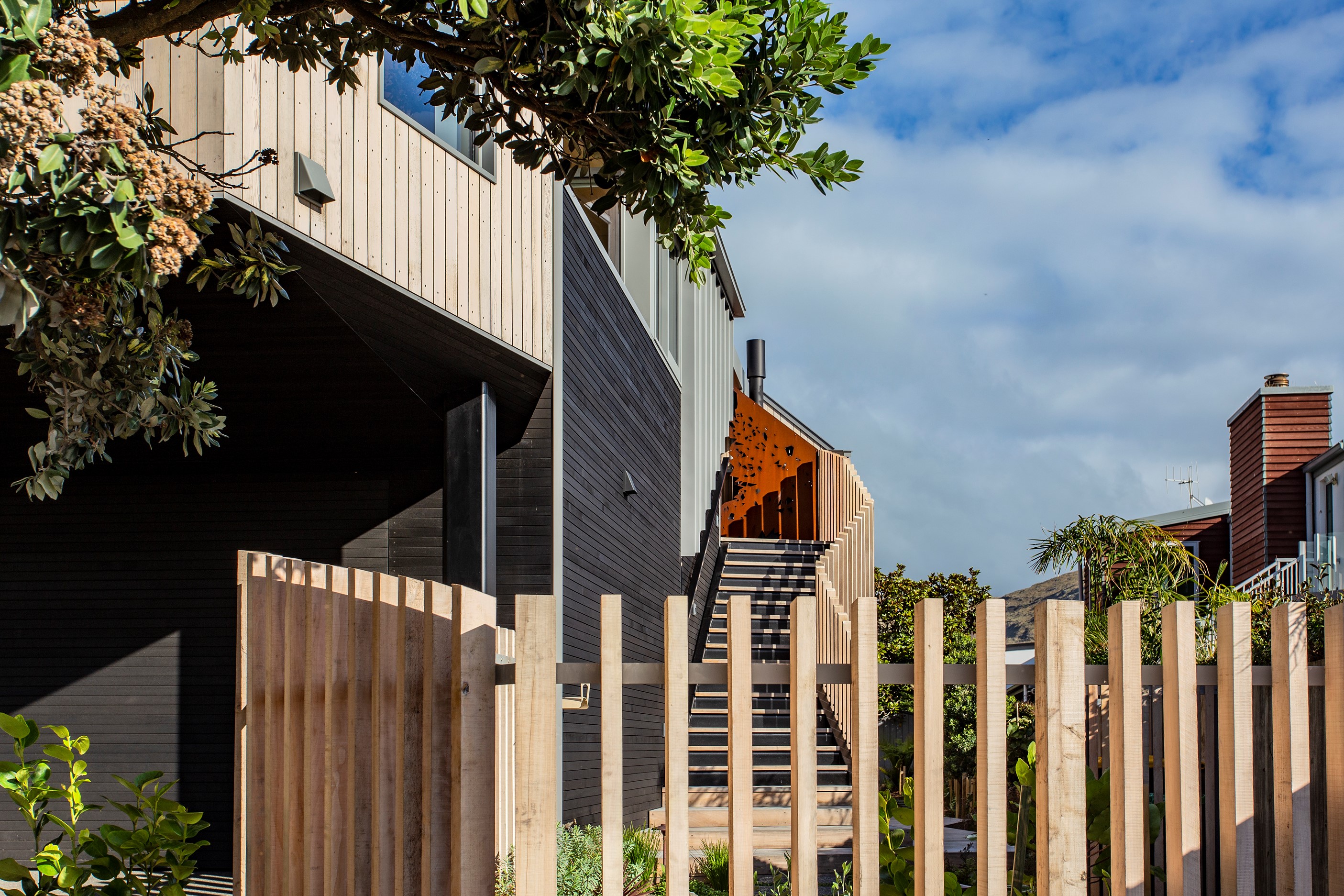 Tricky angles and lines, a cantilevered living space and myriad eye-catching features required something special from the team building this four-bedroom home. The Metzger crew was up to the challenge, demonstrating sublime skills and scrupulous craftsmanship from the footings through to the installation of the final fitting. The leading-edge 350sqm house, designed by South Architects, is built from natural products, including cedar and local stone, which relax the dwelling into its beach setting. And what a setting it is. Step inside and almost every space has views of the Pacific Ocean, from sweeping vistas to cheeky peeps. The upstairs living space is cantilevered to maximise surf views, and even the sheltered outdoor room has a screen through which you can catch glimpses of the sea and sky beyond. What’s inside is pretty impressive, too. A double-height stone feature wall and the complex plywood ceiling are details to admire. However, this house demonstrates more than flair and design nous. Sustainability and longevity measures – solar power hydronic infloor heating, extensive insulation, a lift and more – ensure it works hard for its owners and the environment.