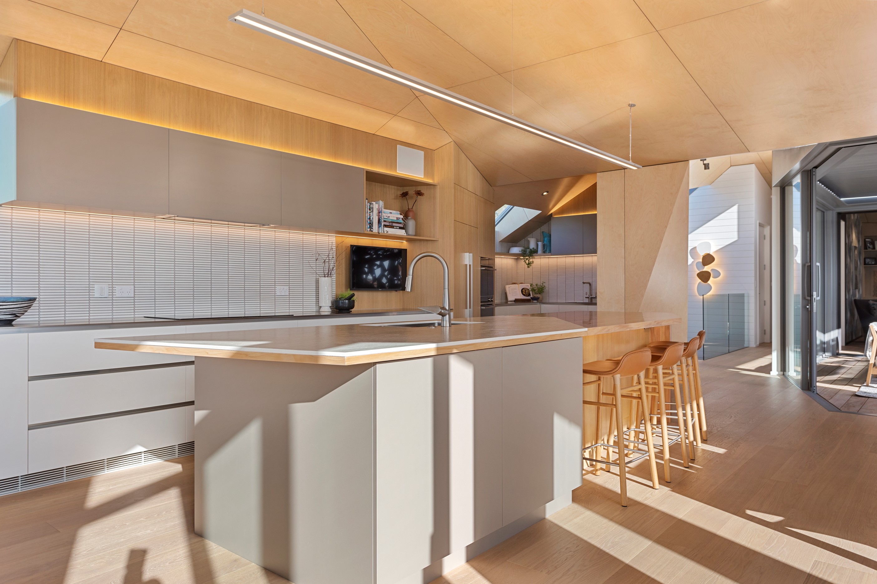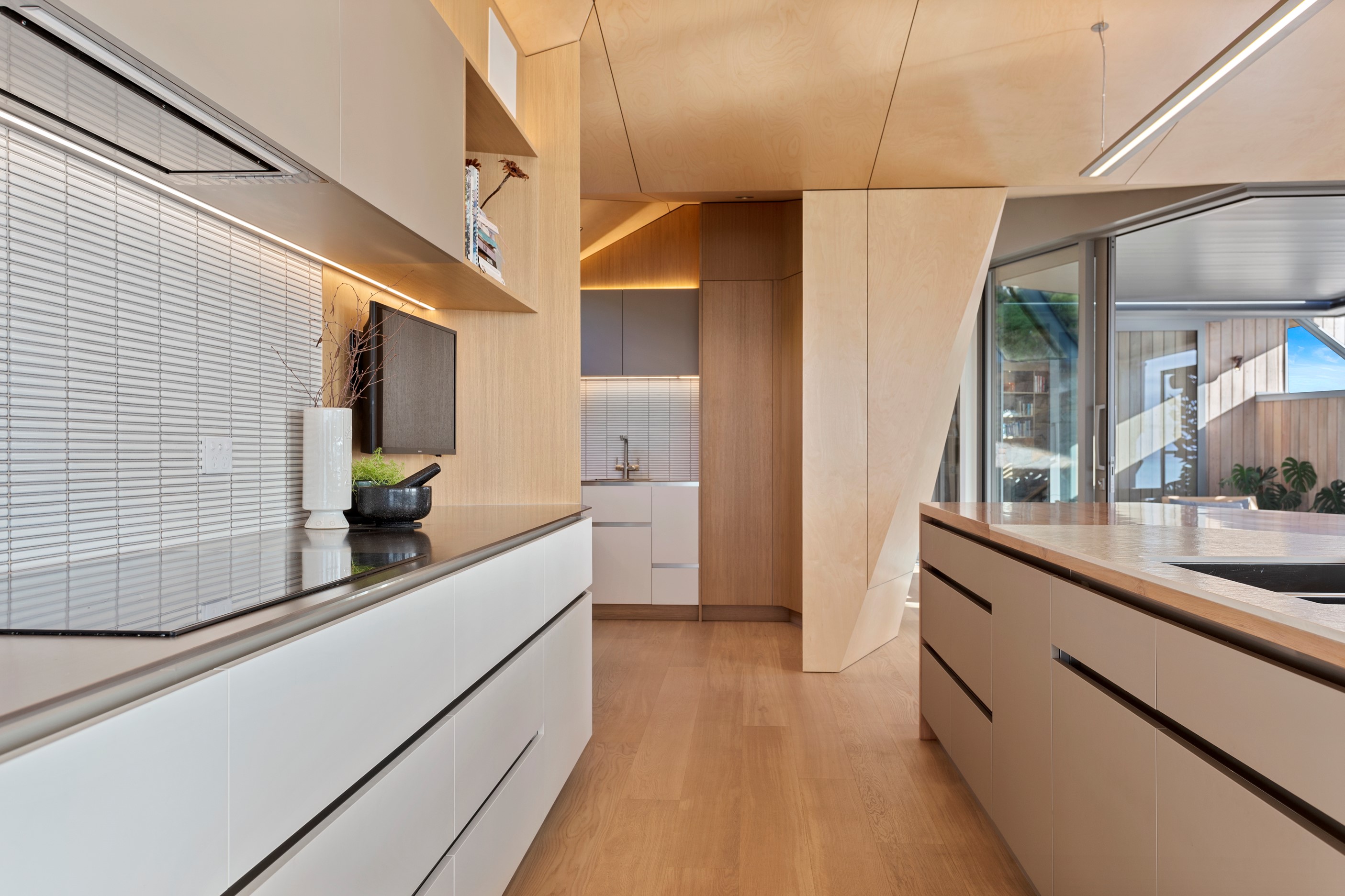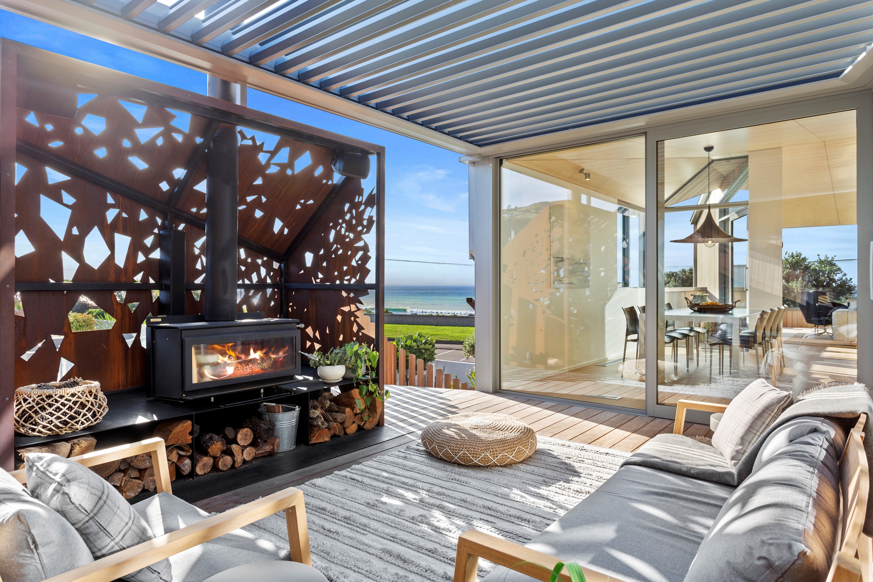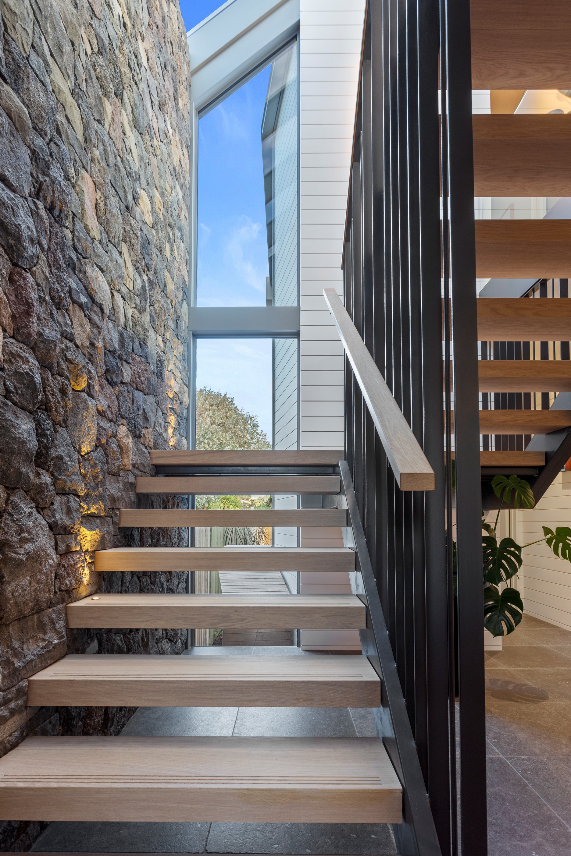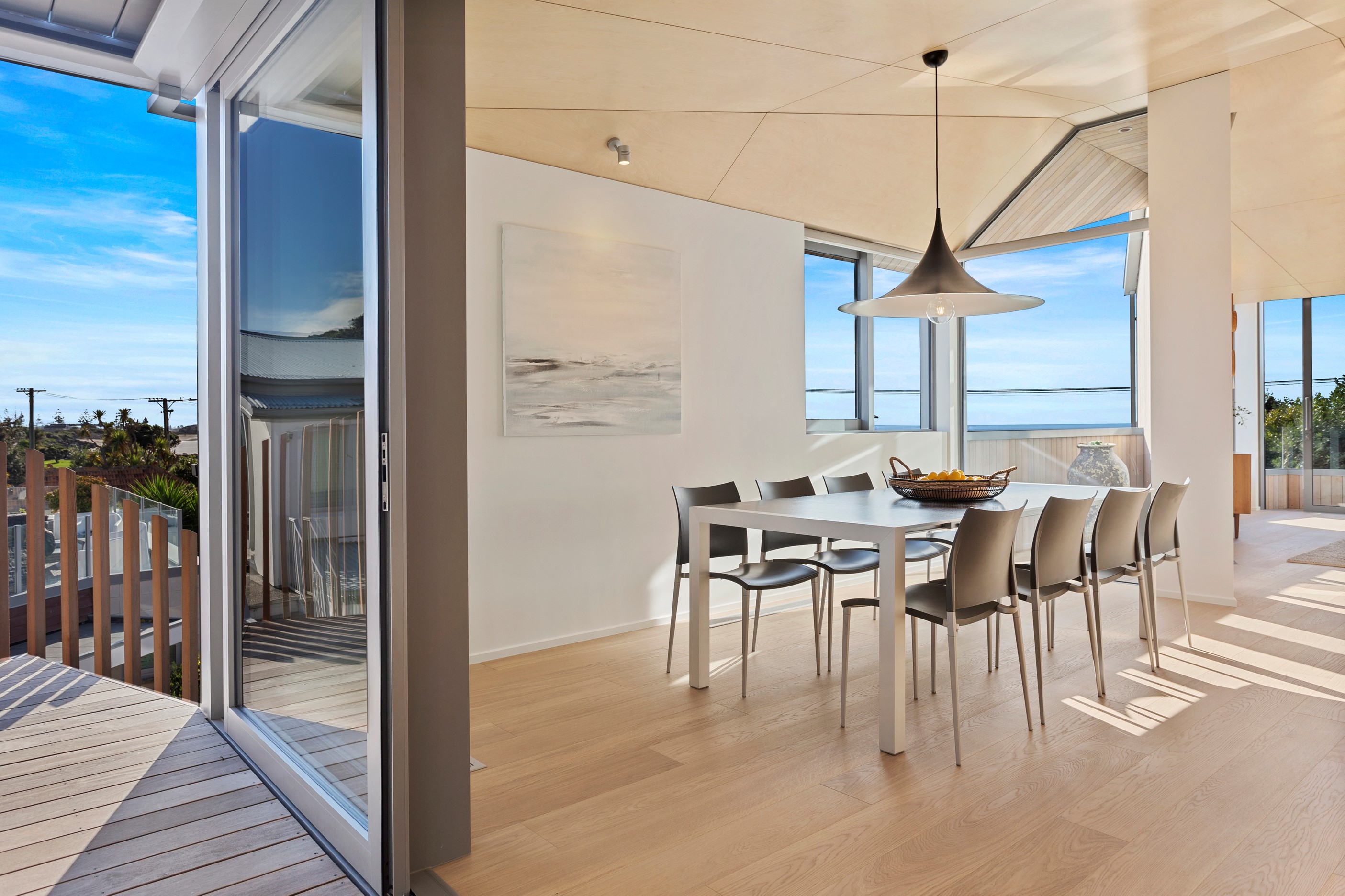 Tricky angles and lines, a cantilevered living space and myriad eye-catching features required something special from the team building this four-bedroom home. The Metzger crew was up to the challenge, demonstrating sublime skills and scrupulous craftsmanship from the footings through to the installation of the final fitting. The leading-edge 350sqm house, designed by South Architects, is built from natural products, including cedar and local stone, which relax the dwelling into its beach setting. And what a setting it is. Step inside and almost every space has views of the Pacific Ocean, from sweeping vistas to cheeky peeps. The upstairs living space is cantilevered to maximise surf views, and even the sheltered outdoor room has a screen through which you can catch glimpses of the sea and sky beyond. What’s inside is pretty impressive, too. A double-height stone feature wall and the complex plywood ceiling are details to admire. However, this house demonstrates more than flair and design nous. Sustainability and longevity measures – solar power hydronic infloor heating, extensive insulation, a lift and more – ensure it works hard for its owners and the environment.