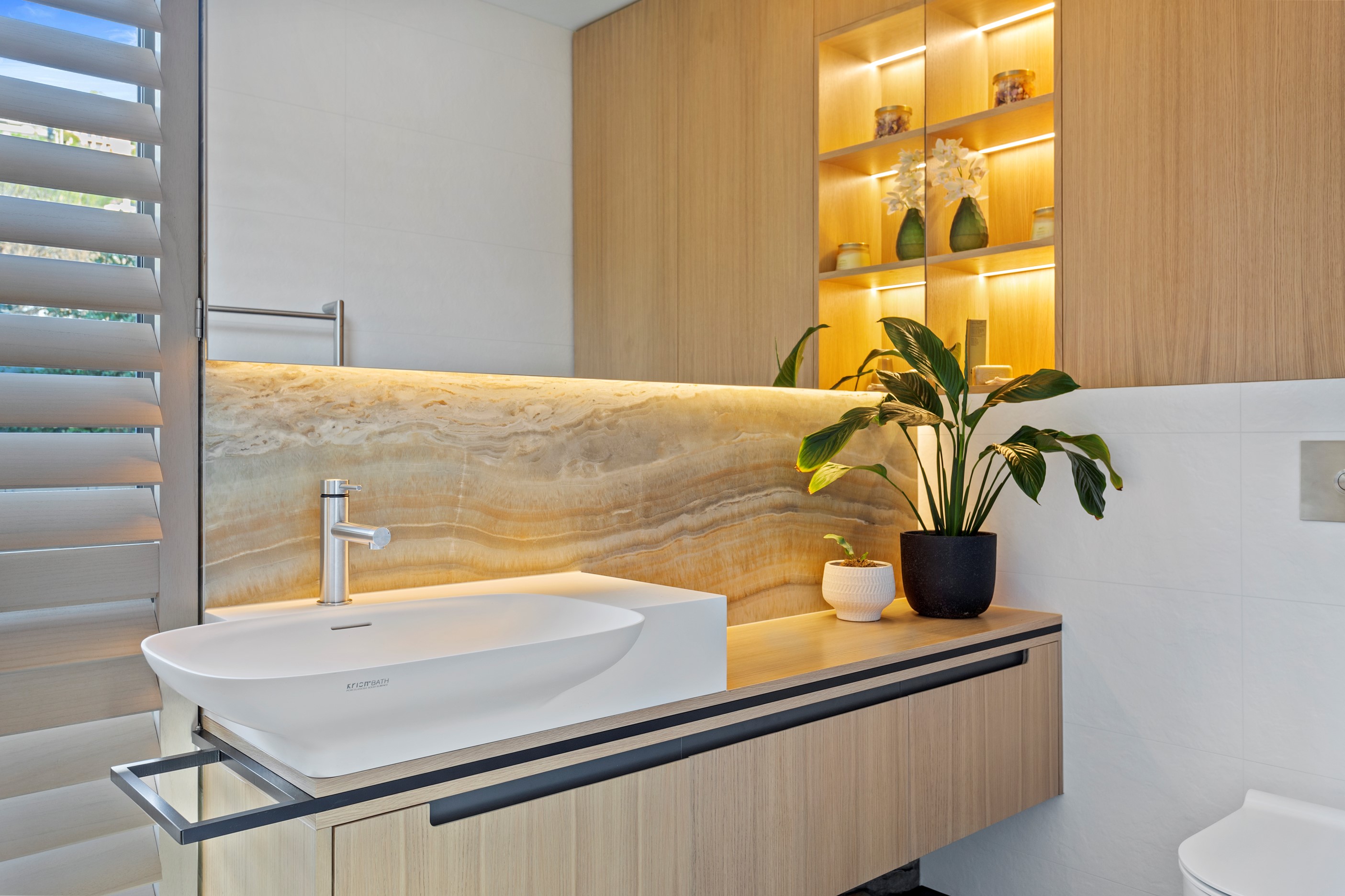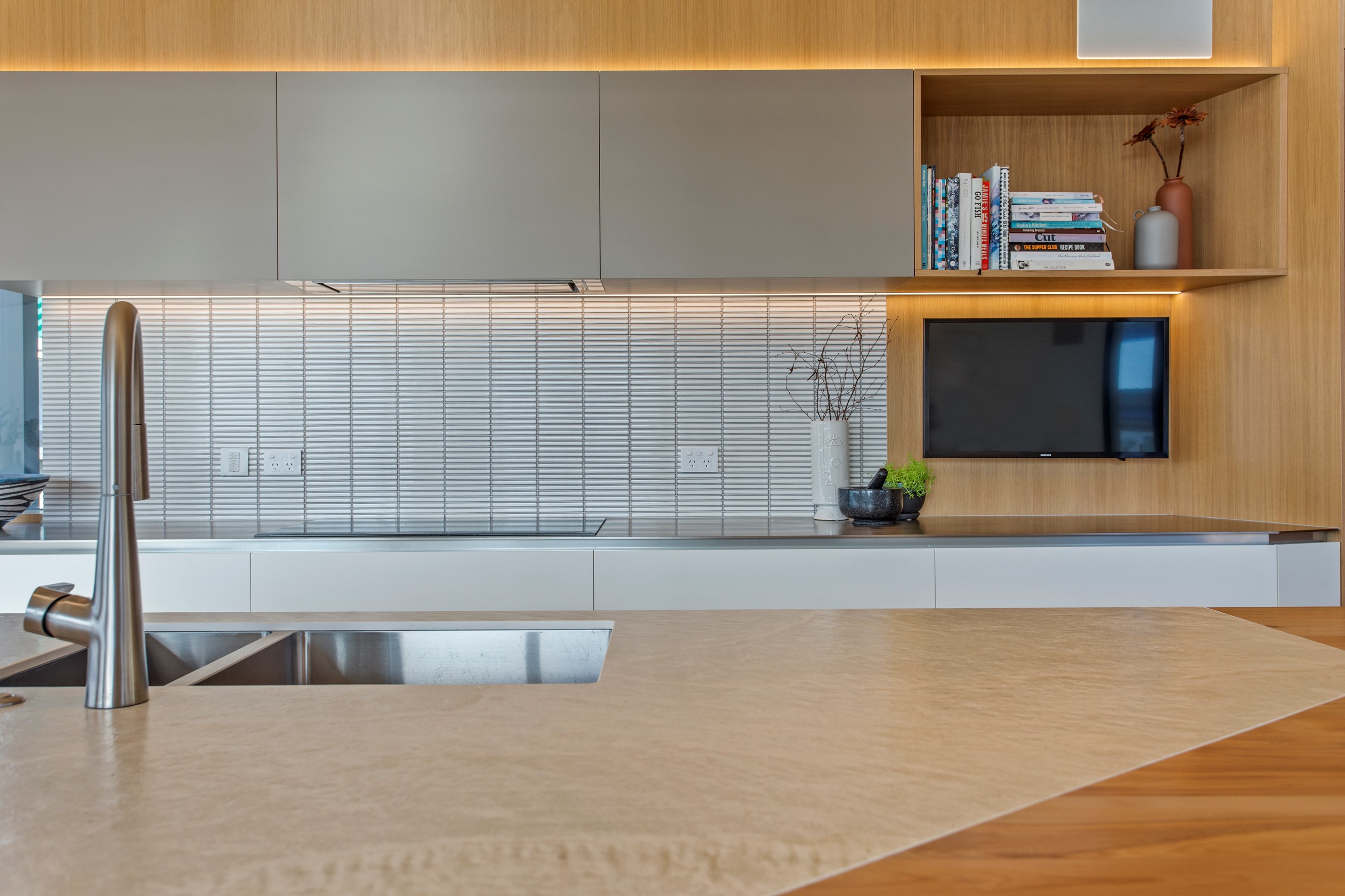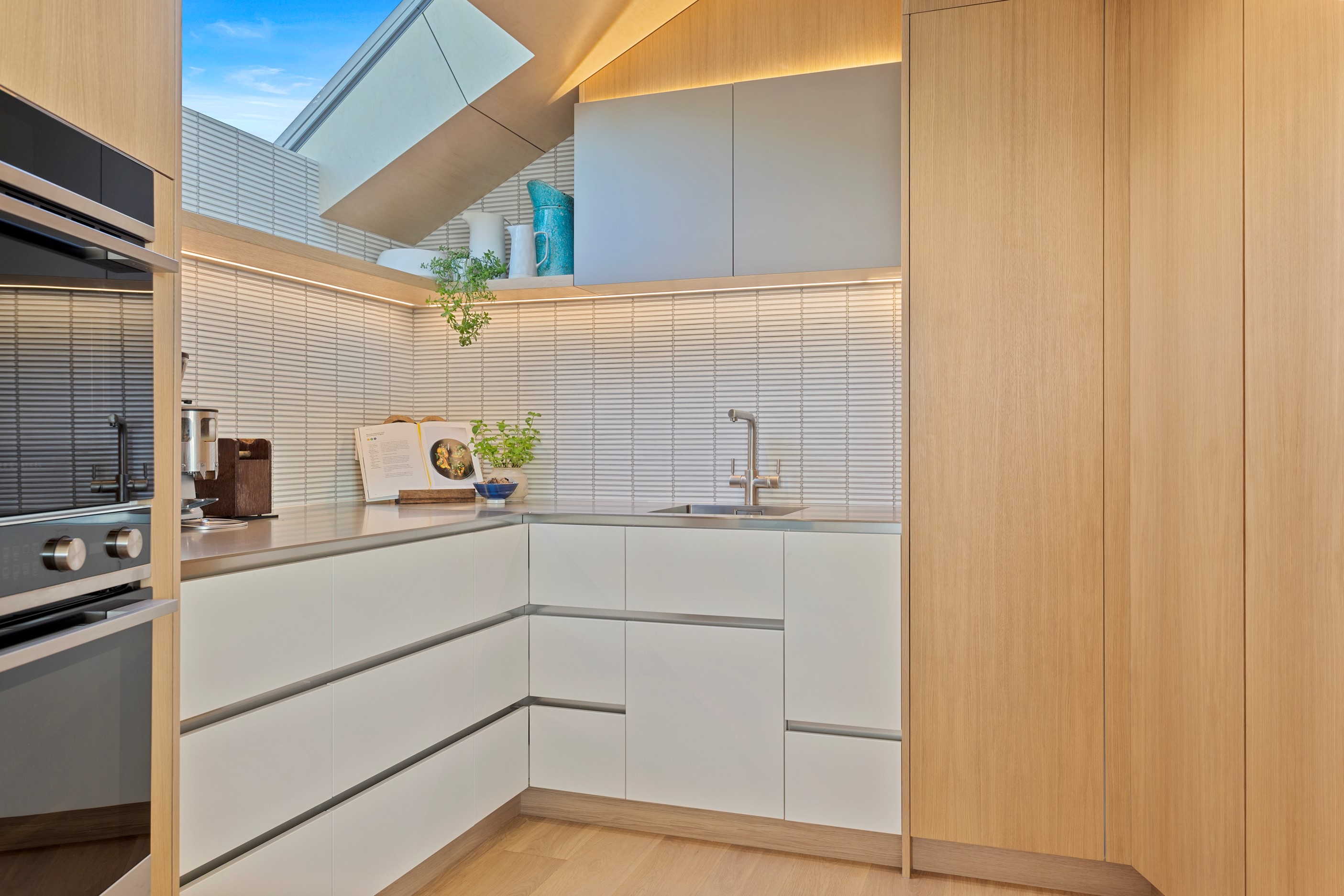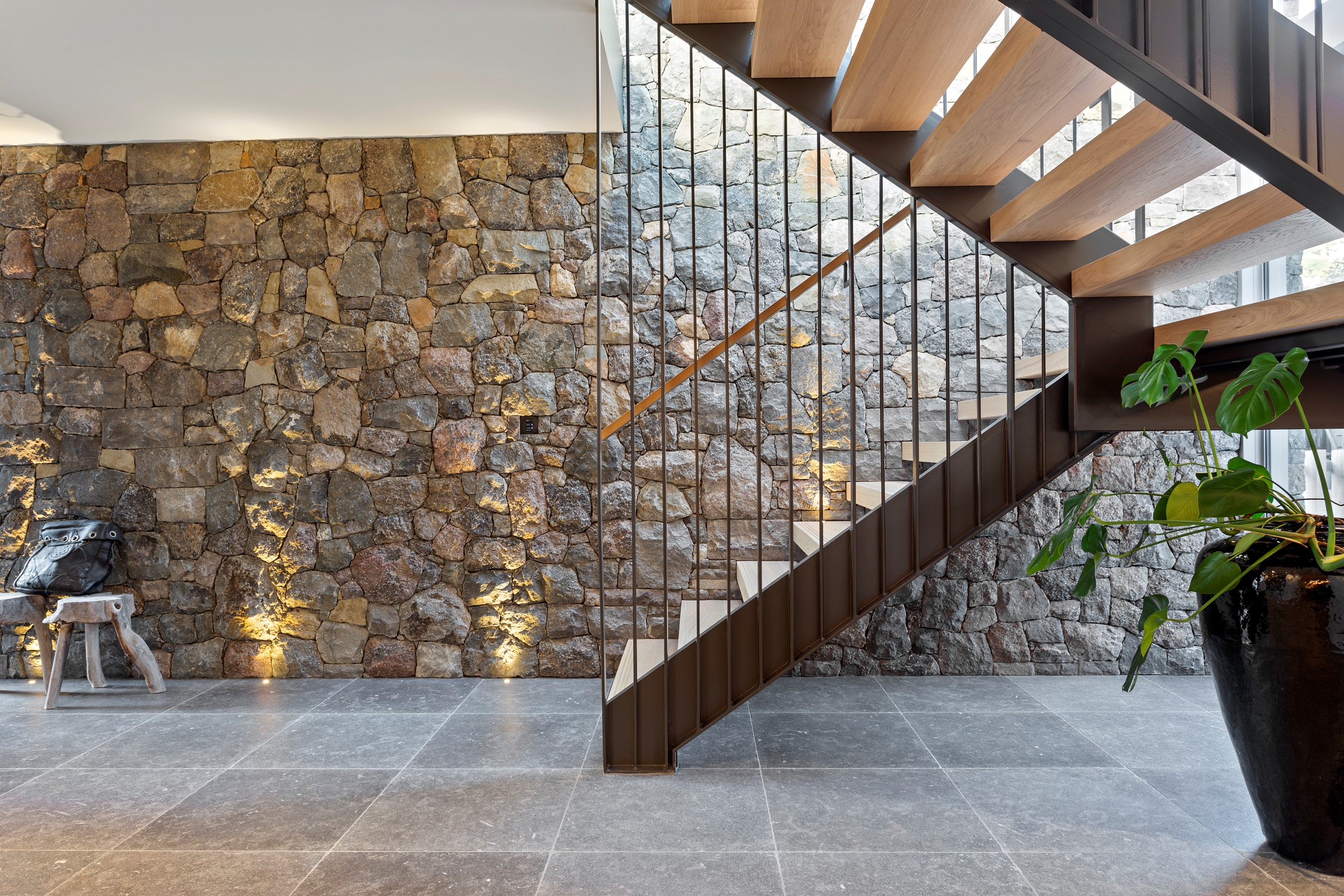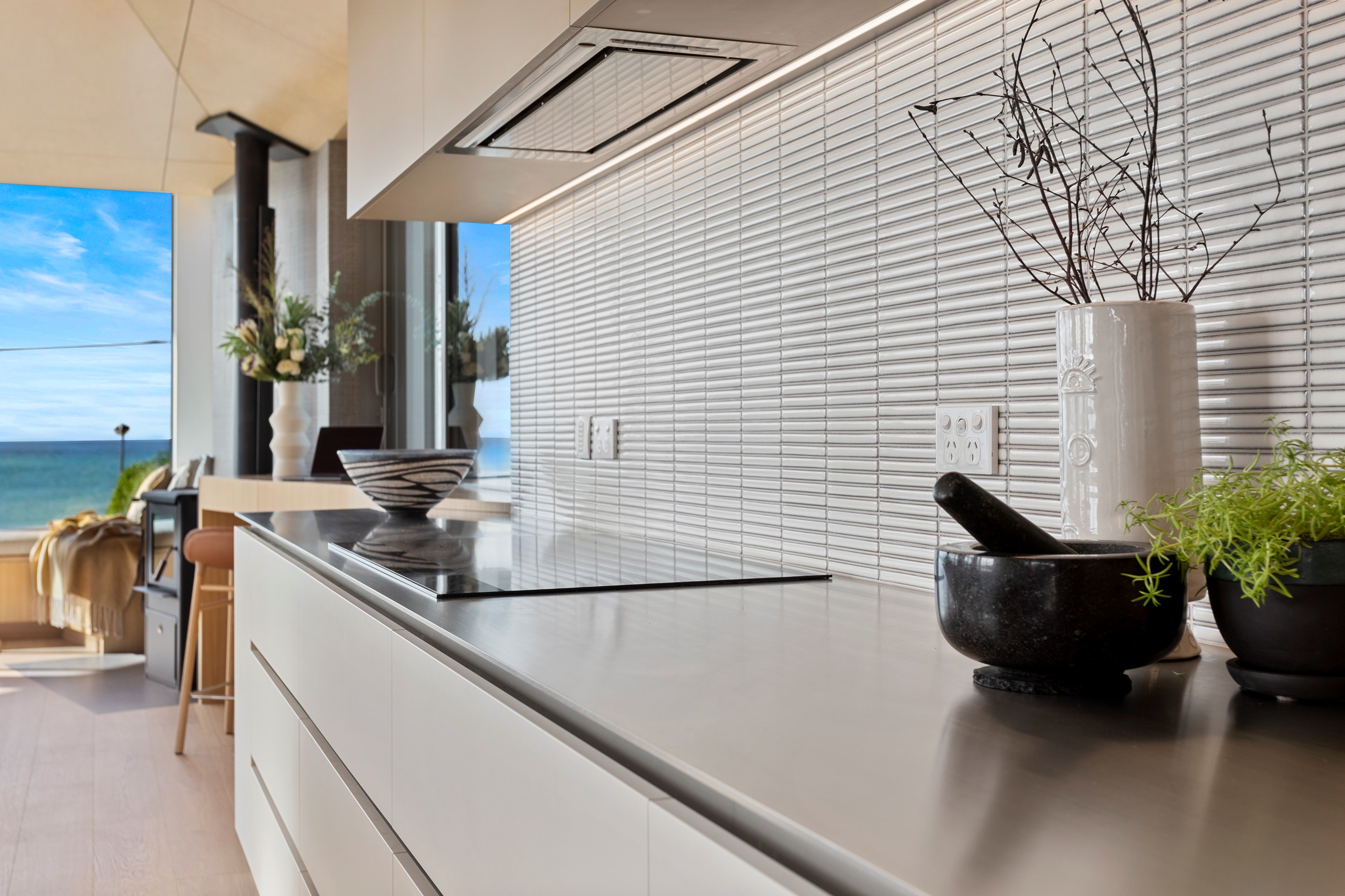 Tricky angles and lines, a cantilevered living space and myriad eye-catching features required something special from the team building this four-bedroom home. The Metzger crew was up to the challenge, demonstrating sublime skills and scrupulous craftsmanship from the footings through to the installation of the final fitting. The leading-edge 350sqm house, designed by South Architects, is built from natural products, including cedar and local stone, which relax the dwelling into its beach setting. And what a setting it is. Step inside and almost every space has views of the Pacific Ocean, from sweeping vistas to cheeky peeps. The upstairs living space is cantilevered to maximise surf views, and even the sheltered outdoor room has a screen through which you can catch glimpses of the sea and sky beyond. What’s inside is pretty impressive, too. A double-height stone feature wall and the complex plywood ceiling are details to admire. However, this house demonstrates more than flair and design nous. Sustainability and longevity measures – solar power hydronic infloor heating, extensive insulation, a lift and more – ensure it works hard for its owners and the environment.