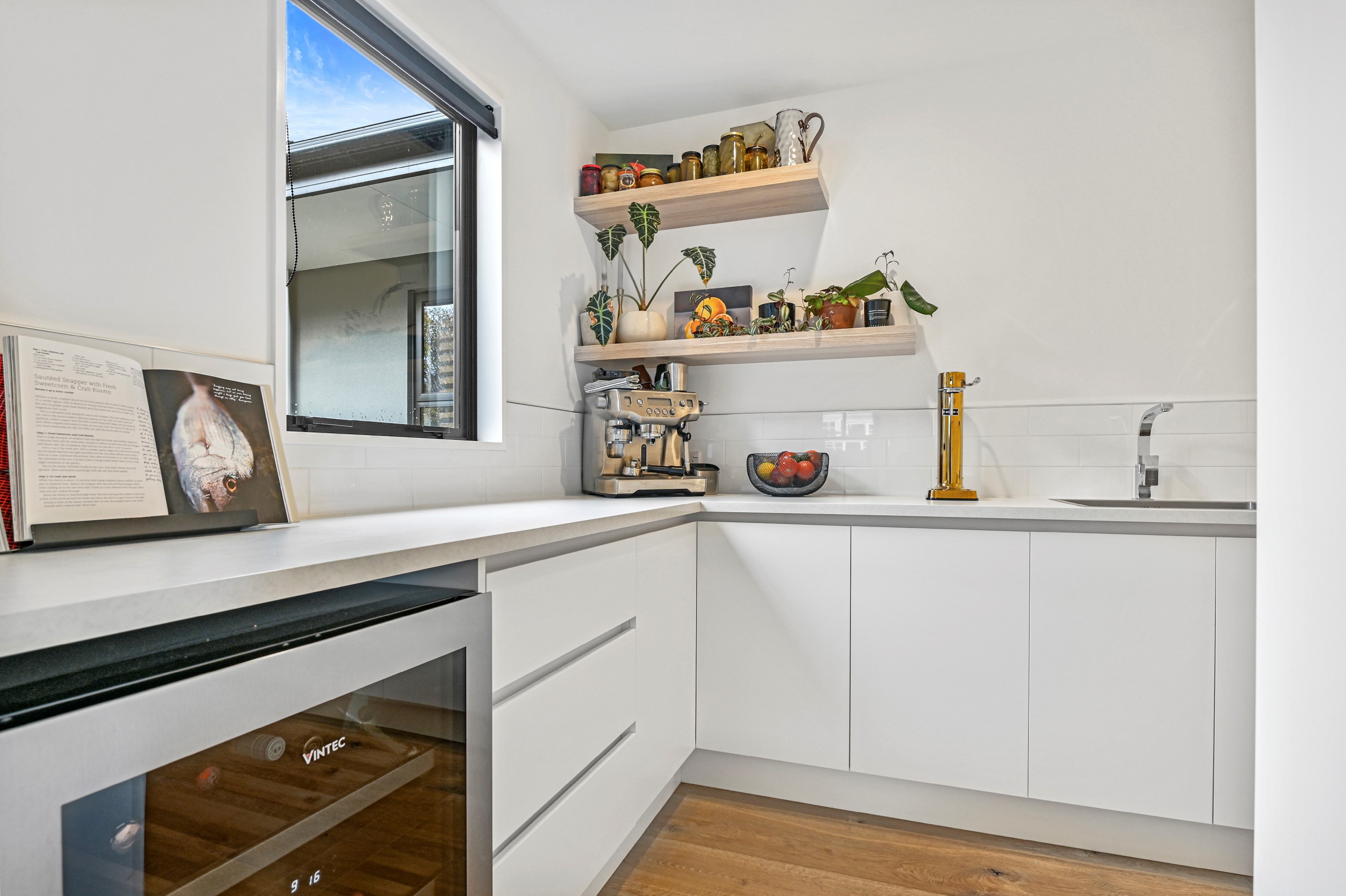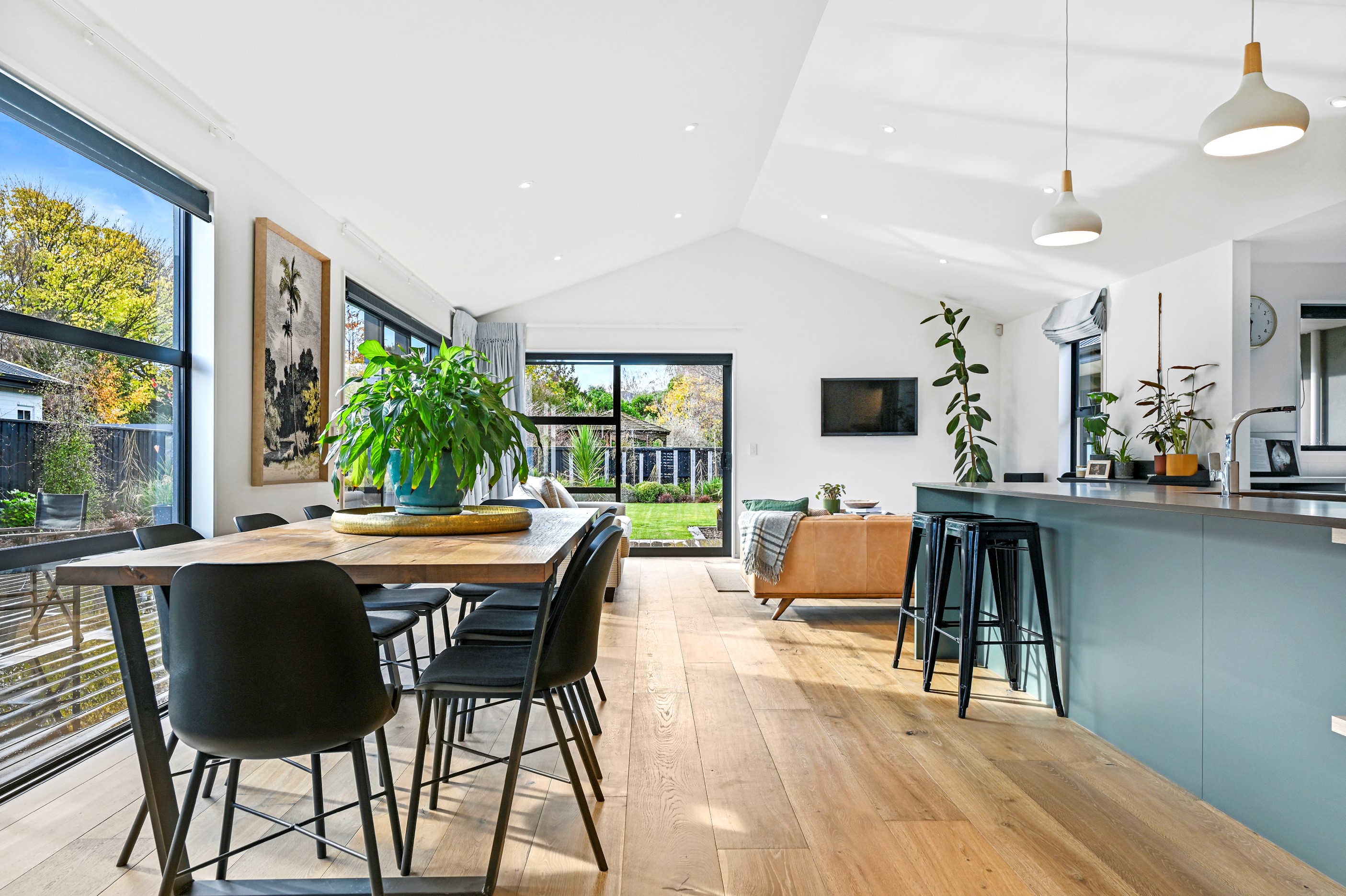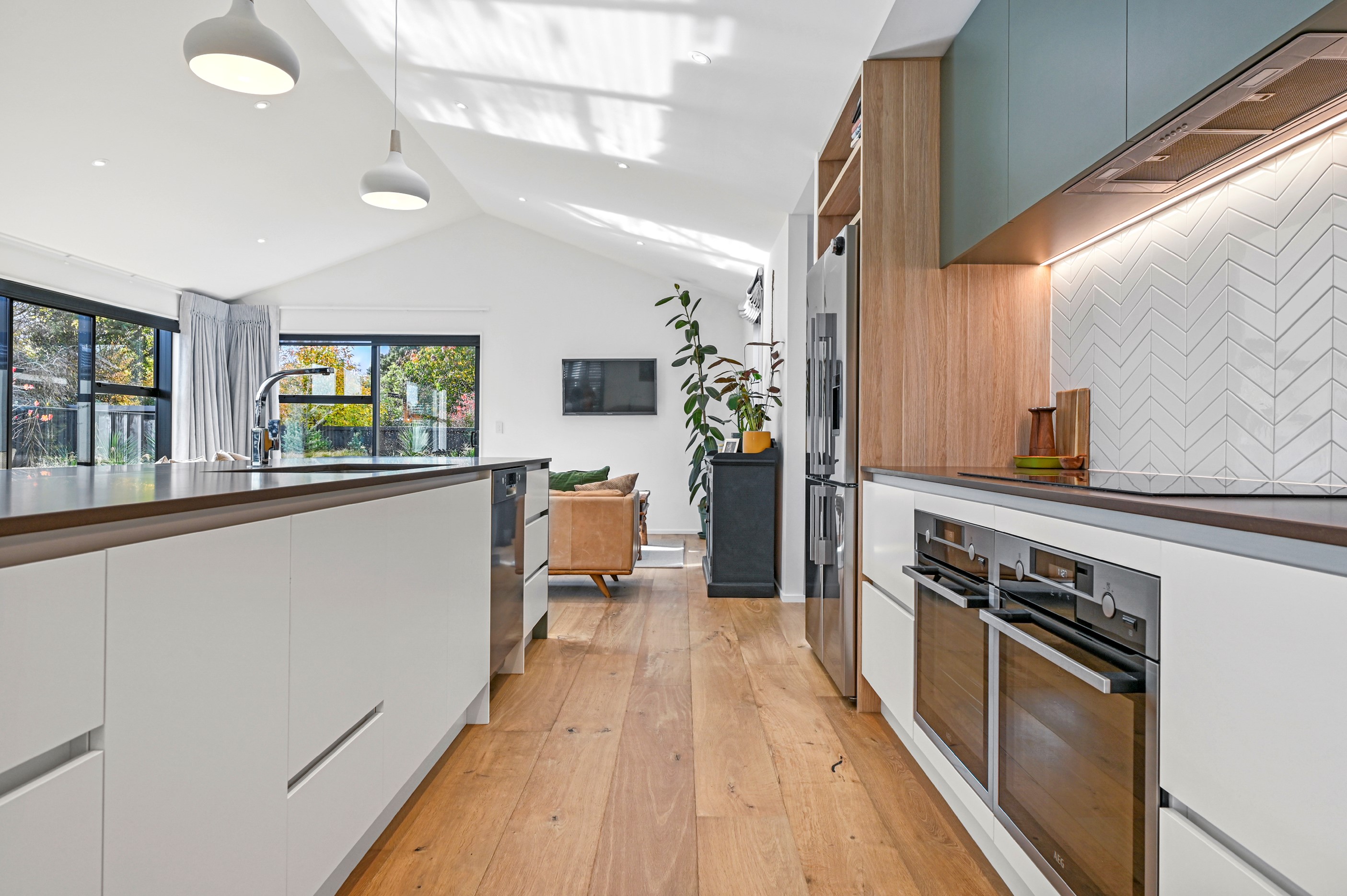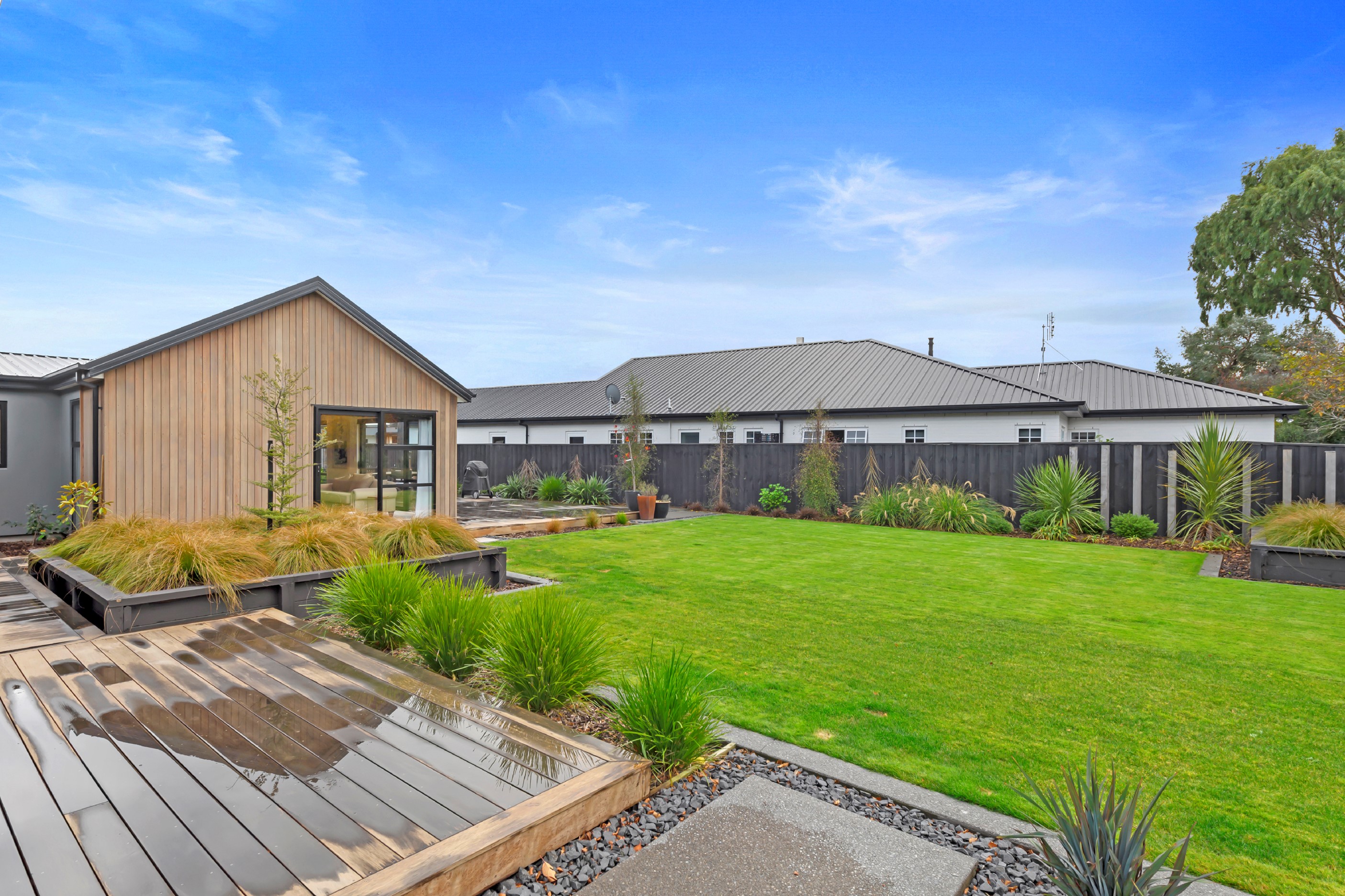 Style and entertainment are two words that define this Canterbury residence. The contemporary design of this four-bedroom home projects relaxed living at its best. Textured plaster and vertical cedar cladding connect seamlessly to hardwood decking and landscaping, all of which make for a warm welcome on arrival. Inside, the heart of this home is the kitchen, placed centre stage in the cleverly designed, open-plan, shared dining and living space. The generous island provides plenty of bench space. With Spanish stone countertops, a wine fridge, a chevron-tile splashback, walk-in pantry and bar seating, the kitchen is the star of the show. Sleek German appliances, including a dual oven, complete the cooking and entertaining hub. Living areas are enhanced by the pitched ceiling, which lends light, volume and drama to the scene. Wide-plank timber flooring connects the inside with the outdoors, where life can be lived even larger beyond the already generous 238sqm footprint. The cosy fire nook is a comfort during Canterbury cold snaps and, together with ducted heating and cooling anda water filtration system, this home is well set for a long and happy future.