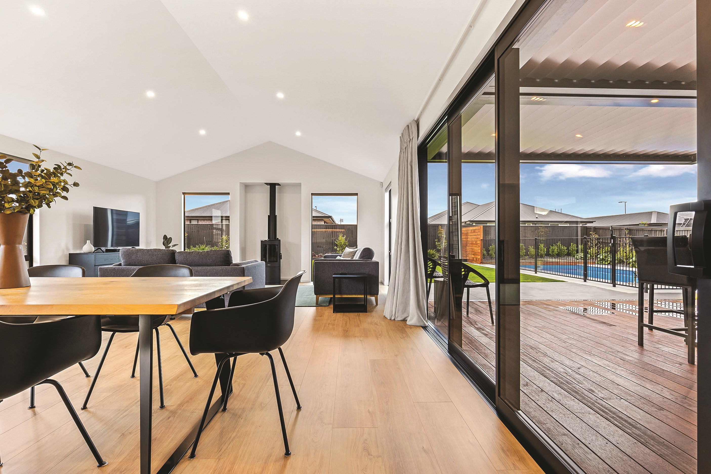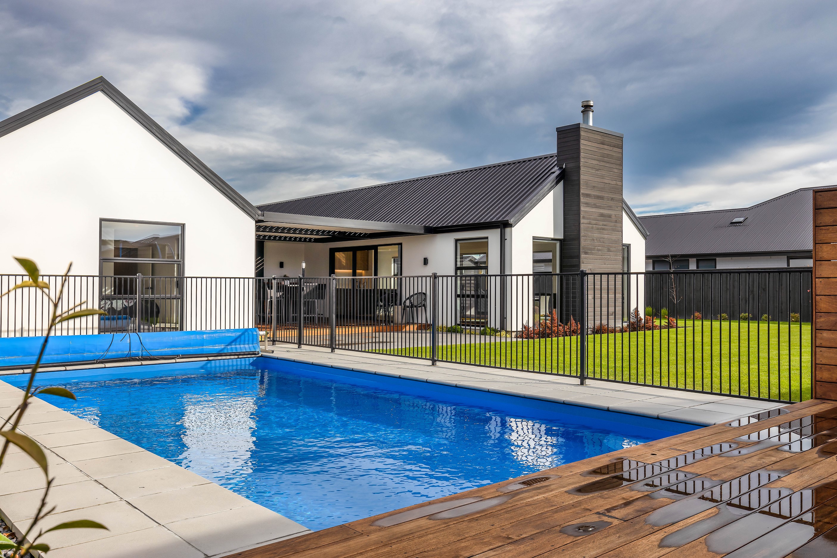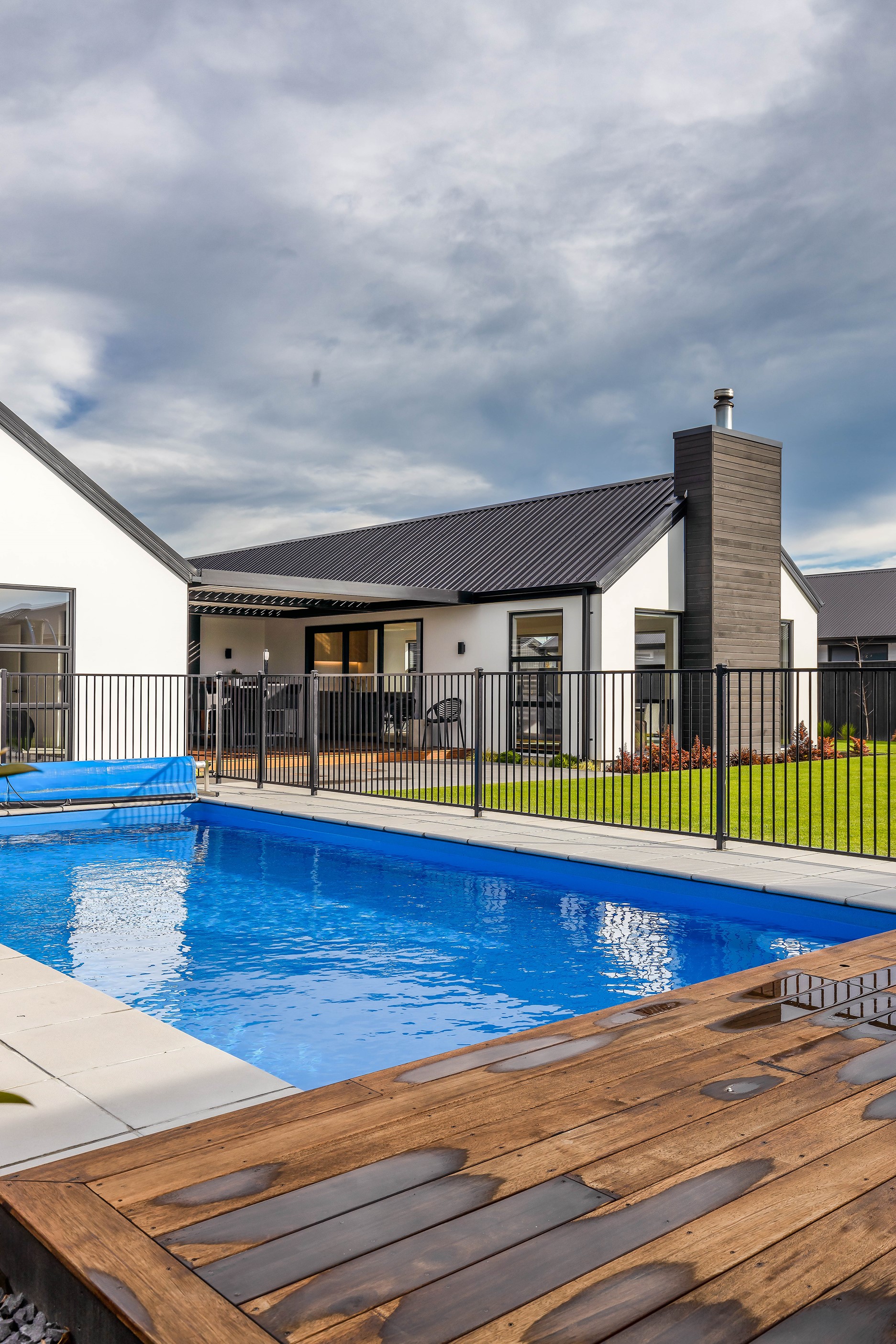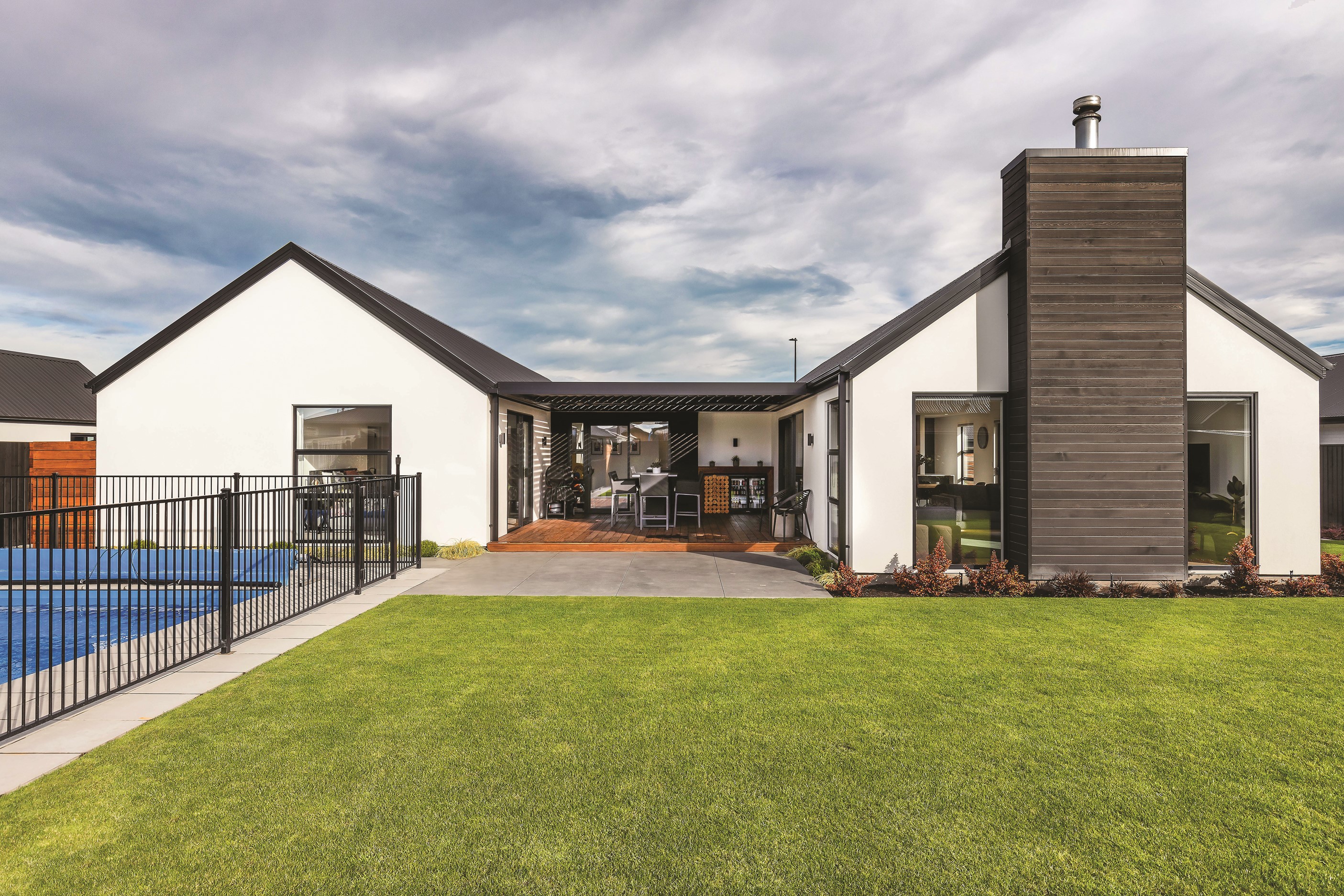 Situated in a quiet cul-de-sac, this 265sqm home is all about family. Built in a modern pavilion style, the light-filled living areas and designer kitchen feature warm hardwood flooring and honed concrete benchtops. It’s all beautiful, but also robust enough for family living. At the heart of the home, the central pavilion features a louvred shade system for year-round, sheltered dining. This area overlooks a sprawling lawn and an in-ground swimming pool. A colour palette of restful greys and whites are contrasted with bold feature walls, and the main bedroom suite includes a fully tiled ensuite, walk-in wardrobe, and large windows that look over attractive landscaping. You’ll find pitched ceilings, an internal block wall connected to the exterior to create visual cohesion, and reflective glazing on the front for privacy and warmth. Add in a handsome exterior in a white plaster cladding system with horizontal cedar accents, including the chimney casing, and you have quite the package. In terms of comforts and future-proofing, the four-bedroom two-bathroom home has a designer log burner, ducted heating, self-cleaning ovens and gas hot water. This home is truly a modern oasis for a growing family.