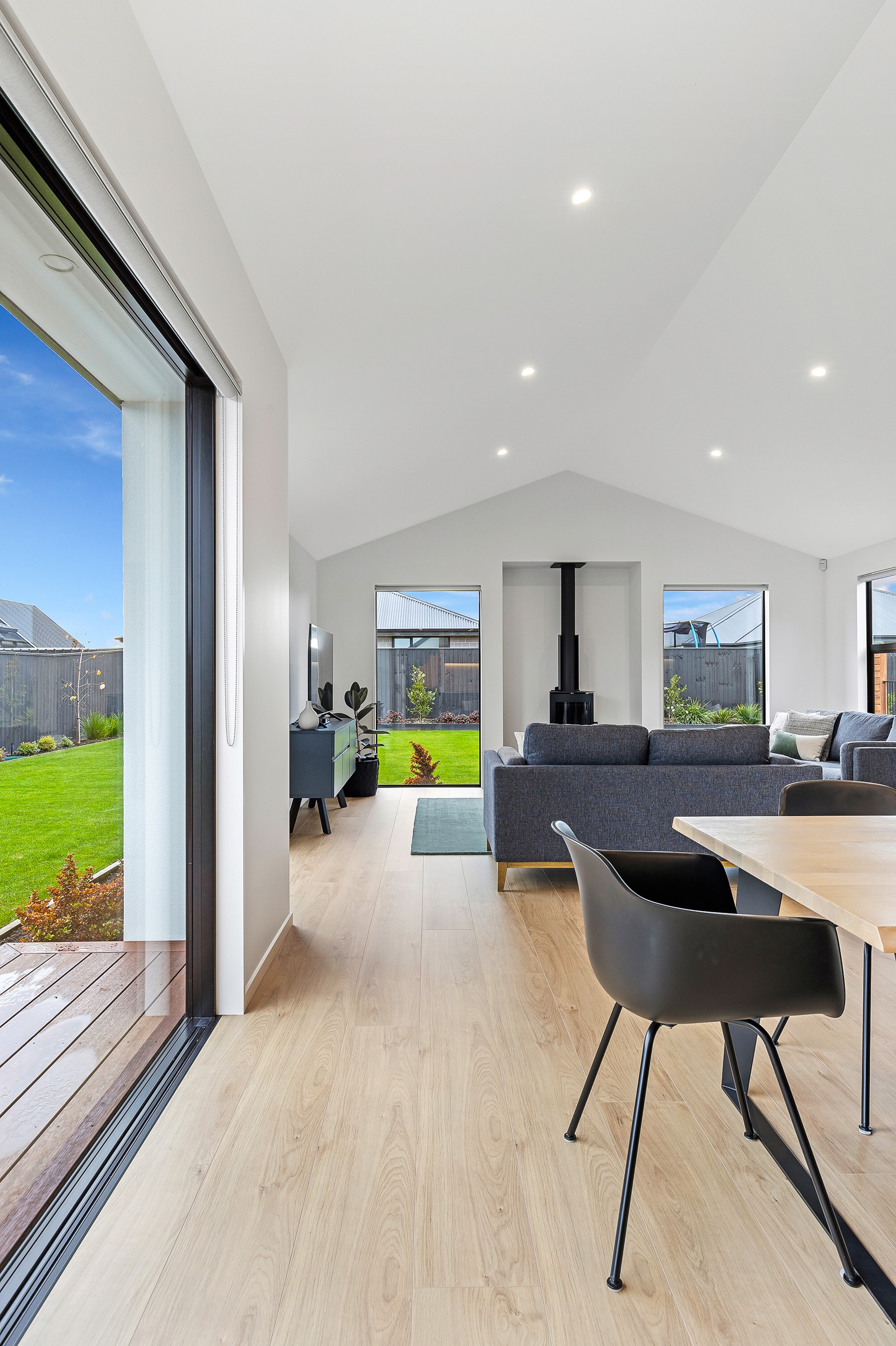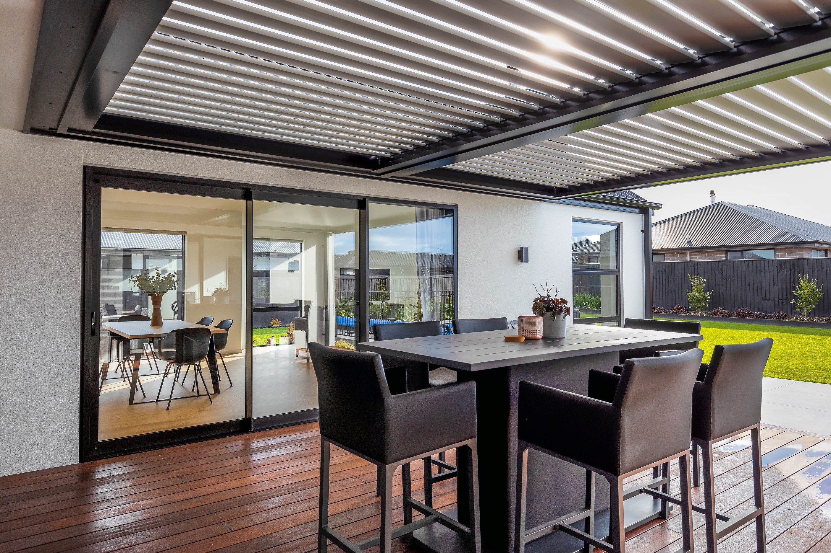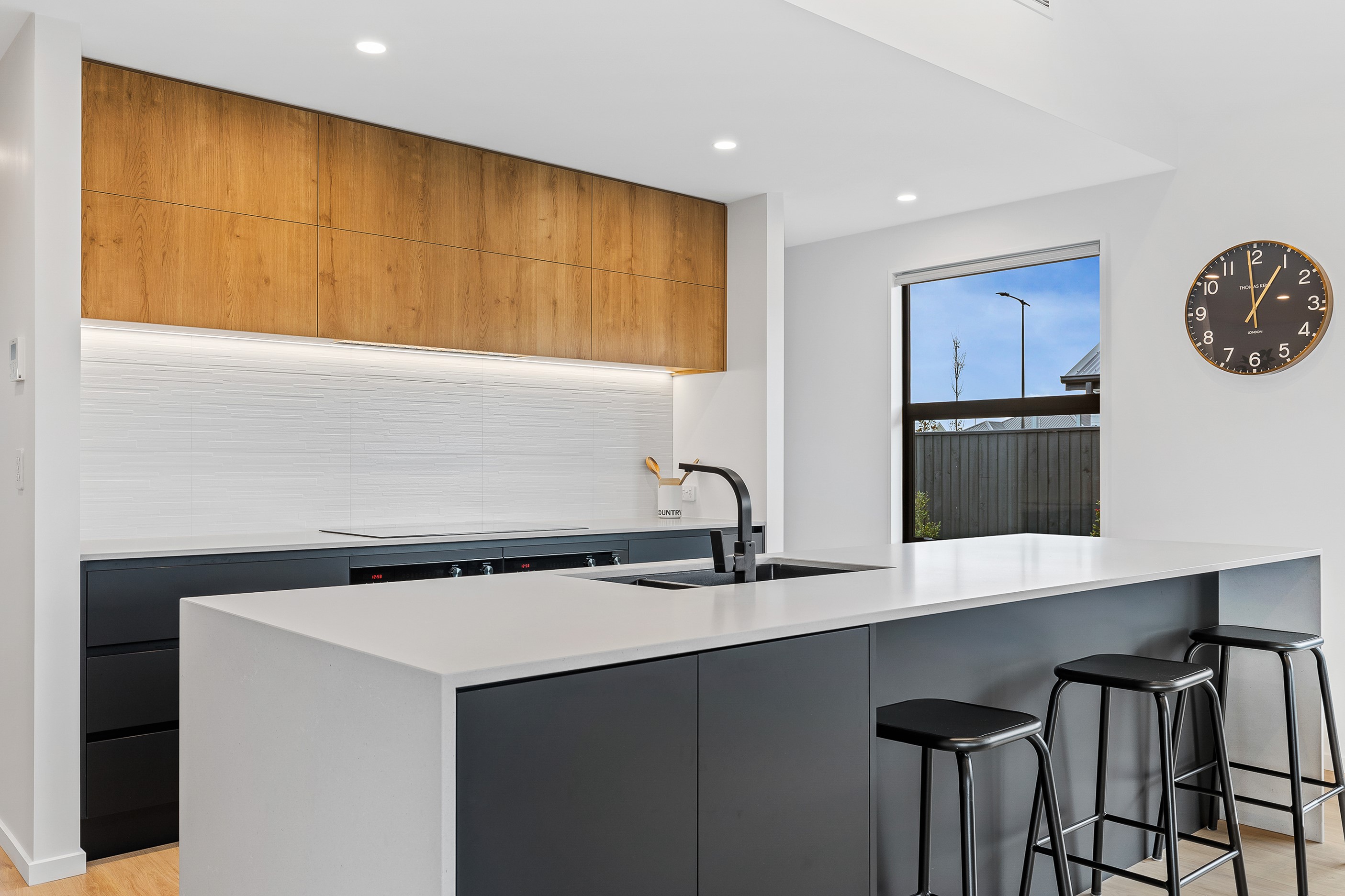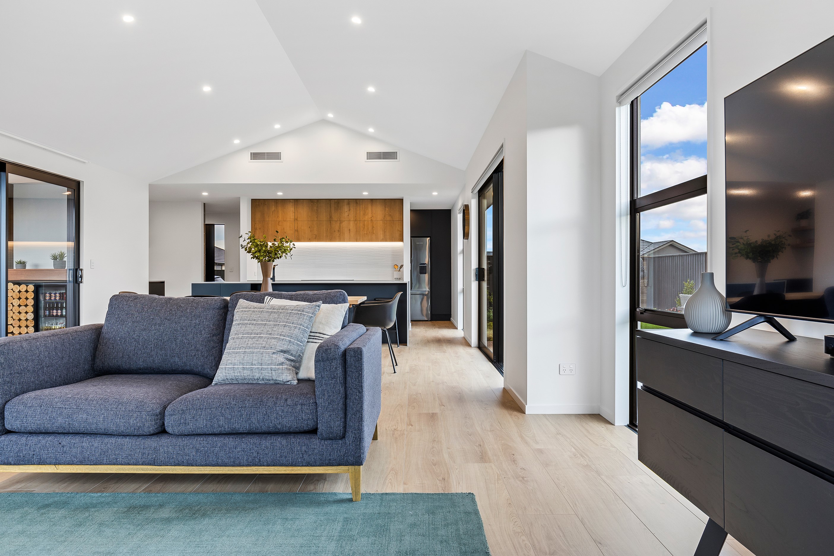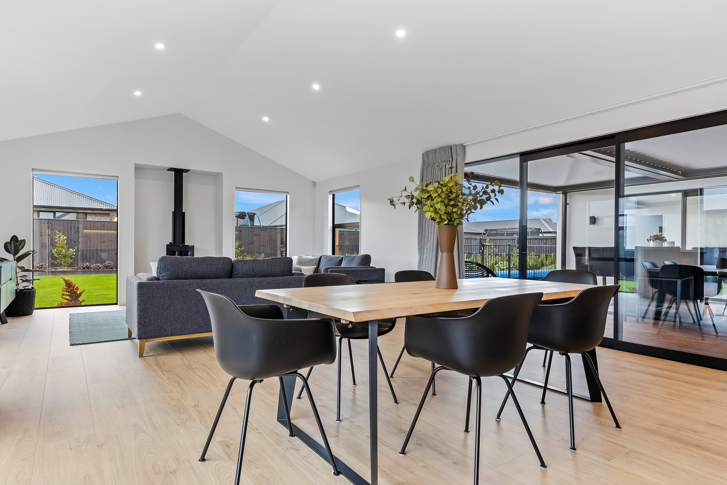 Situated in a quiet cul-de-sac, this 265sqm home is all about family. Built in a modern pavilion style, the light-filled living areas and designer kitchen feature warm hardwood flooring and honed concrete benchtops. It’s all beautiful, but also robust enough for family living. At the heart of the home, the central pavilion features a louvred shade system for year-round, sheltered dining. This area overlooks a sprawling lawn and an in-ground swimming pool. A colour palette of restful greys and whites are contrasted with bold feature walls, and the main bedroom suite includes a fully tiled ensuite, walk-in wardrobe, and large windows that look over attractive landscaping. You’ll find pitched ceilings, an internal block wall connected to the exterior to create visual cohesion, and reflective glazing on the front for privacy and warmth. Add in a handsome exterior in a white plaster cladding system with horizontal cedar accents, including the chimney casing, and you have quite the package. In terms of comforts and future-proofing, the four-bedroom two-bathroom home has a designer log burner, ducted heating, self-cleaning ovens and gas hot water. This home is truly a modern oasis for a growing family.