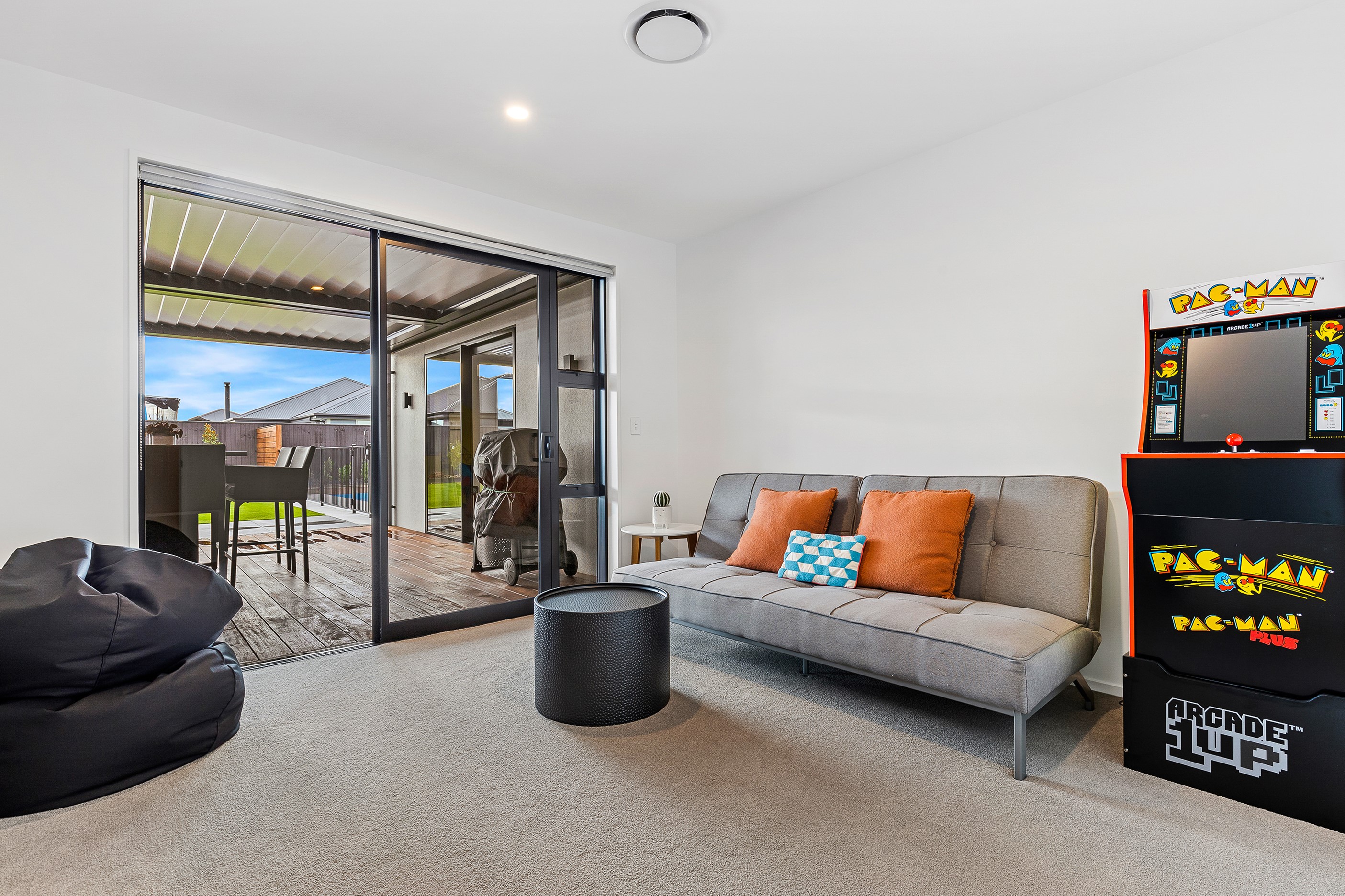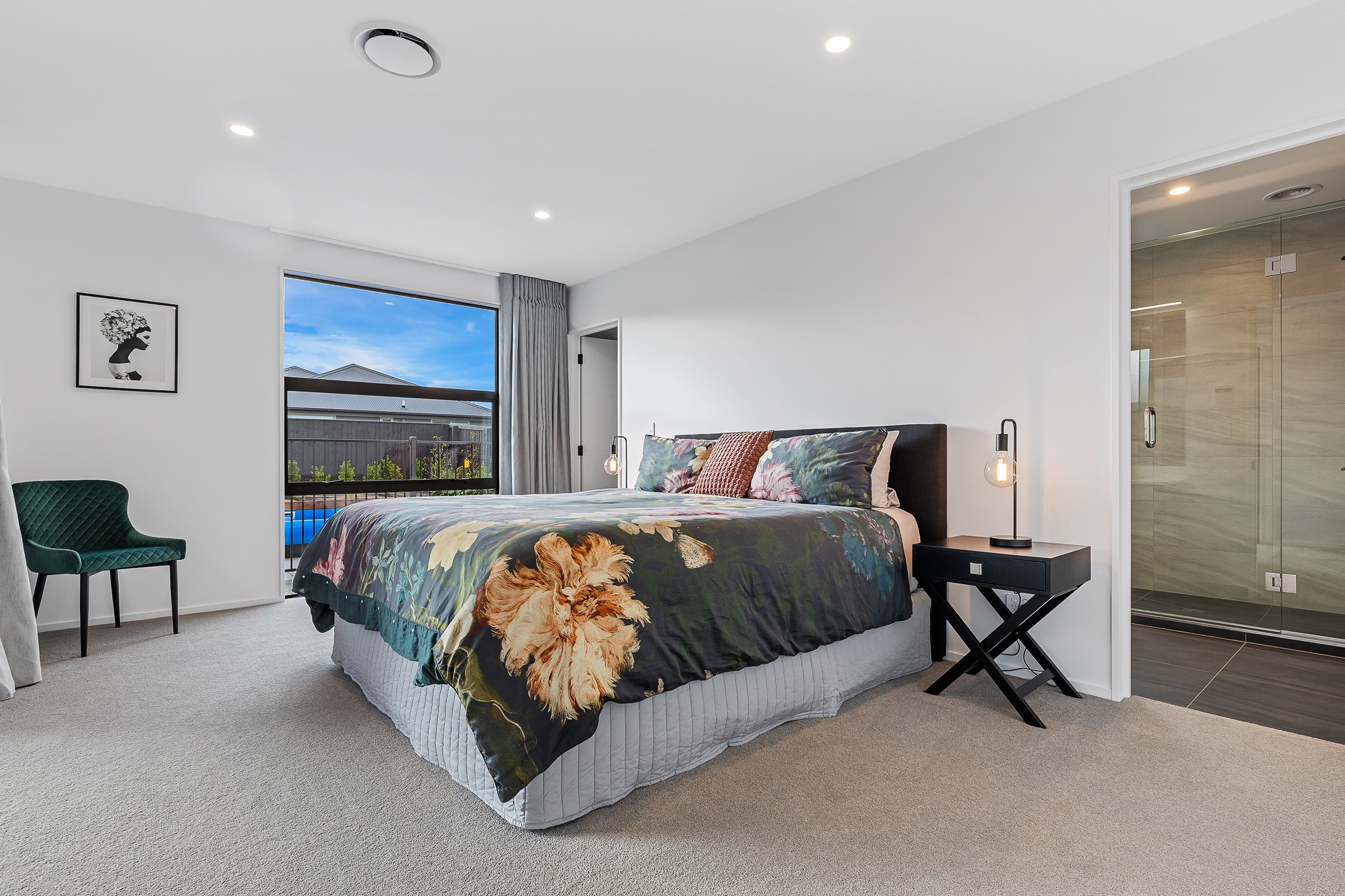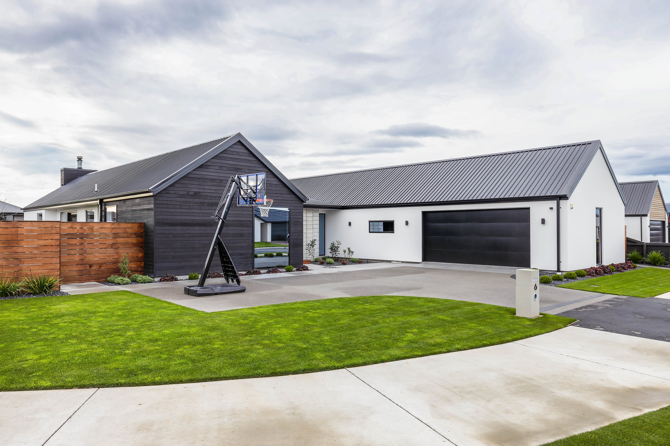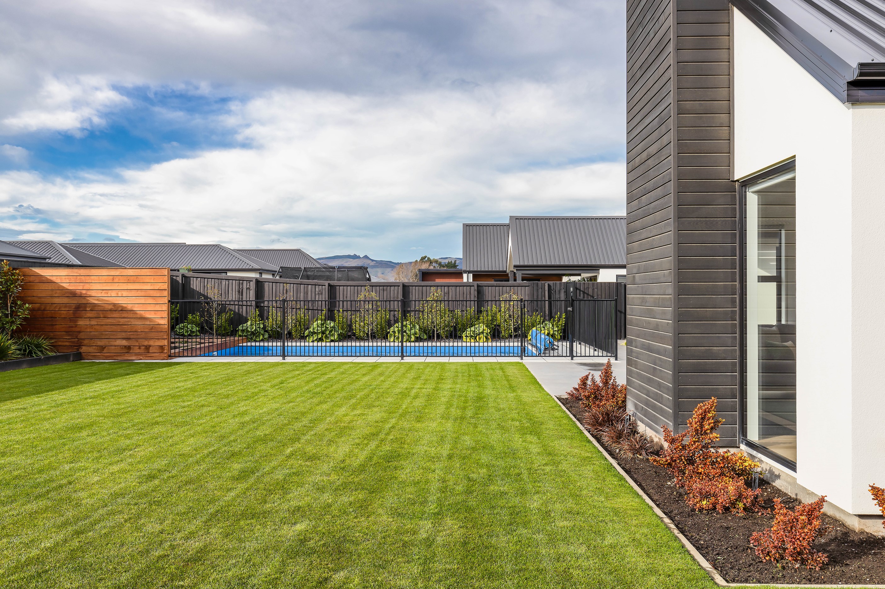 Situated in a quiet cul-de-sac, this 265sqm home is all about family. Built in a modern pavilion style, the light-filled living areas and designer kitchen feature warm hardwood flooring and honed concrete benchtops. It’s all beautiful, but also robust enough for family living. At the heart of the home, the central pavilion features a louvred shade system for year-round, sheltered dining. This area overlooks a sprawling lawn and an in-ground swimming pool. A colour palette of restful greys and whites are contrasted with bold feature walls, and the main bedroom suite includes a fully tiled ensuite, walk-in wardrobe, and large windows that look over attractive landscaping. You’ll find pitched ceilings, an internal block wall connected to the exterior to create visual cohesion, and reflective glazing on the front for privacy and warmth. Add in a handsome exterior in a white plaster cladding system with horizontal cedar accents, including the chimney casing, and you have quite the package. In terms of comforts and future-proofing, the four-bedroom two-bathroom home has a designer log burner, ducted heating, self-cleaning ovens and gas hot water. This home is truly a modern oasis for a growing family.