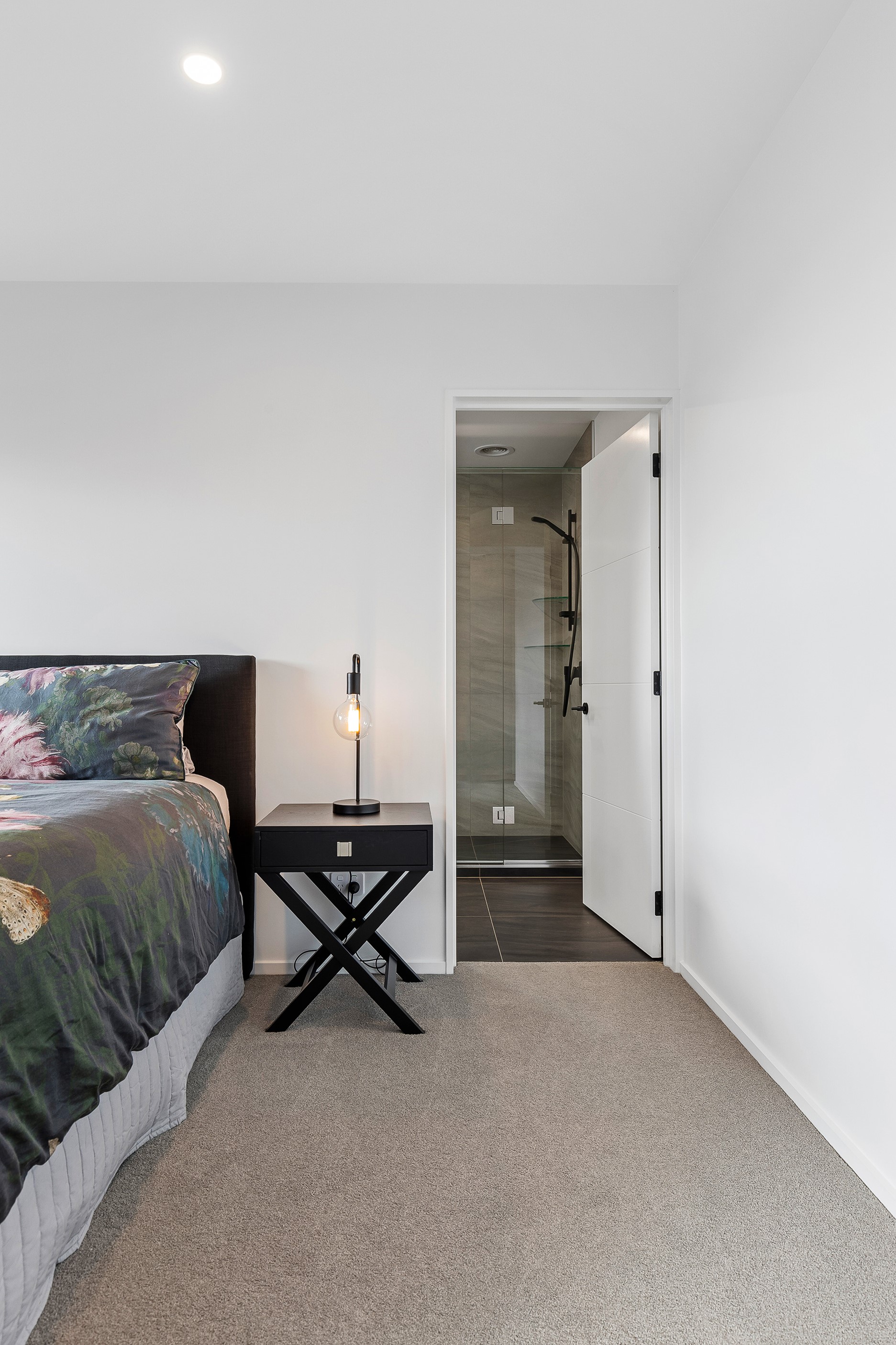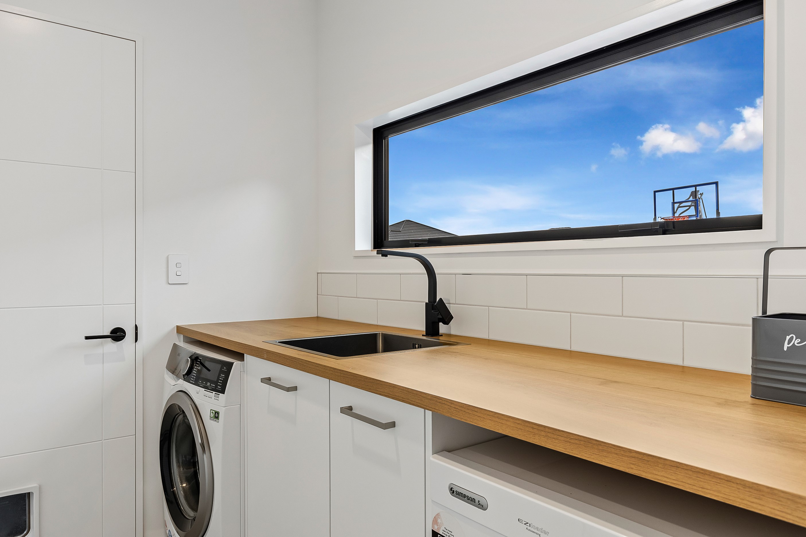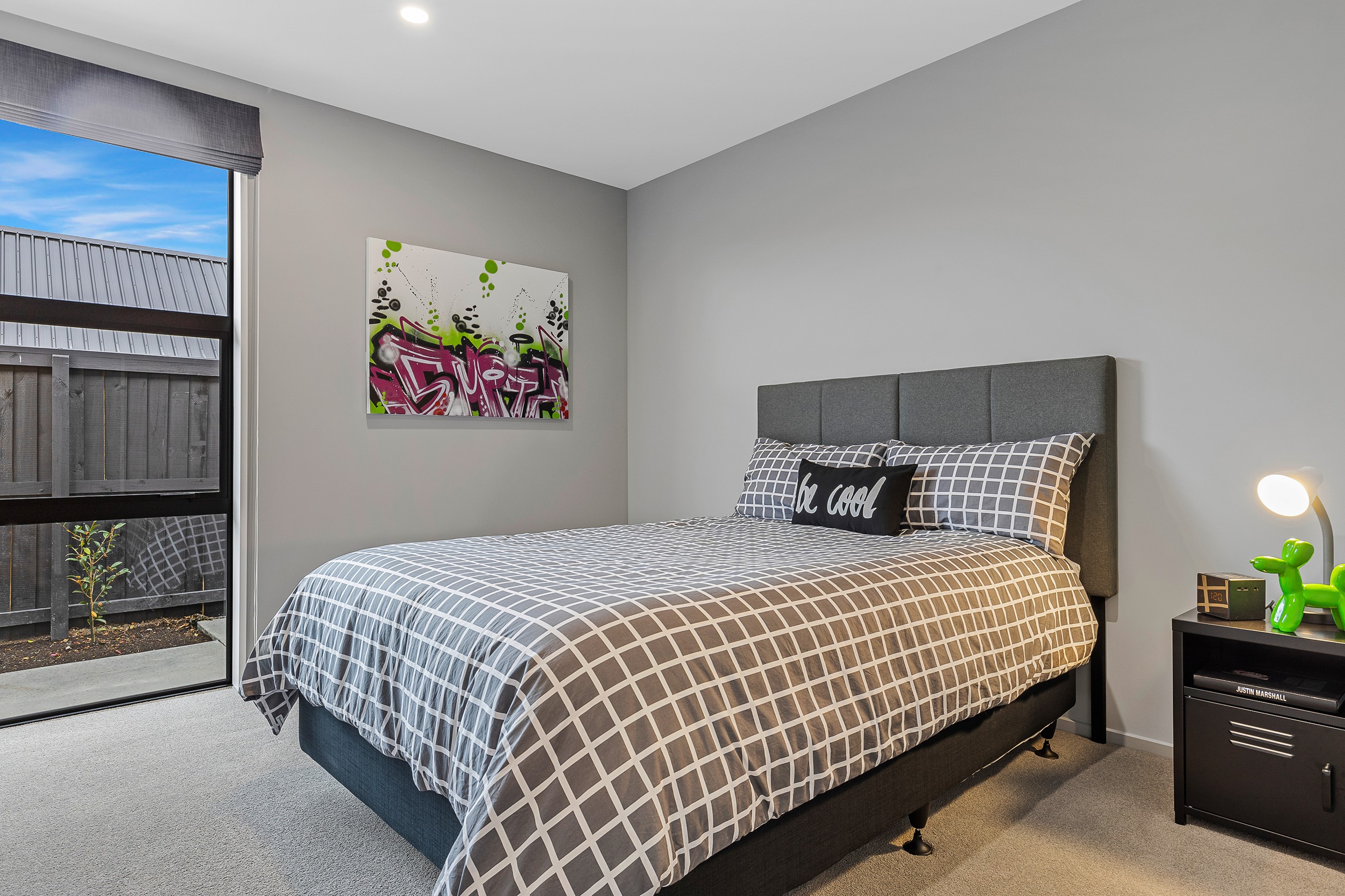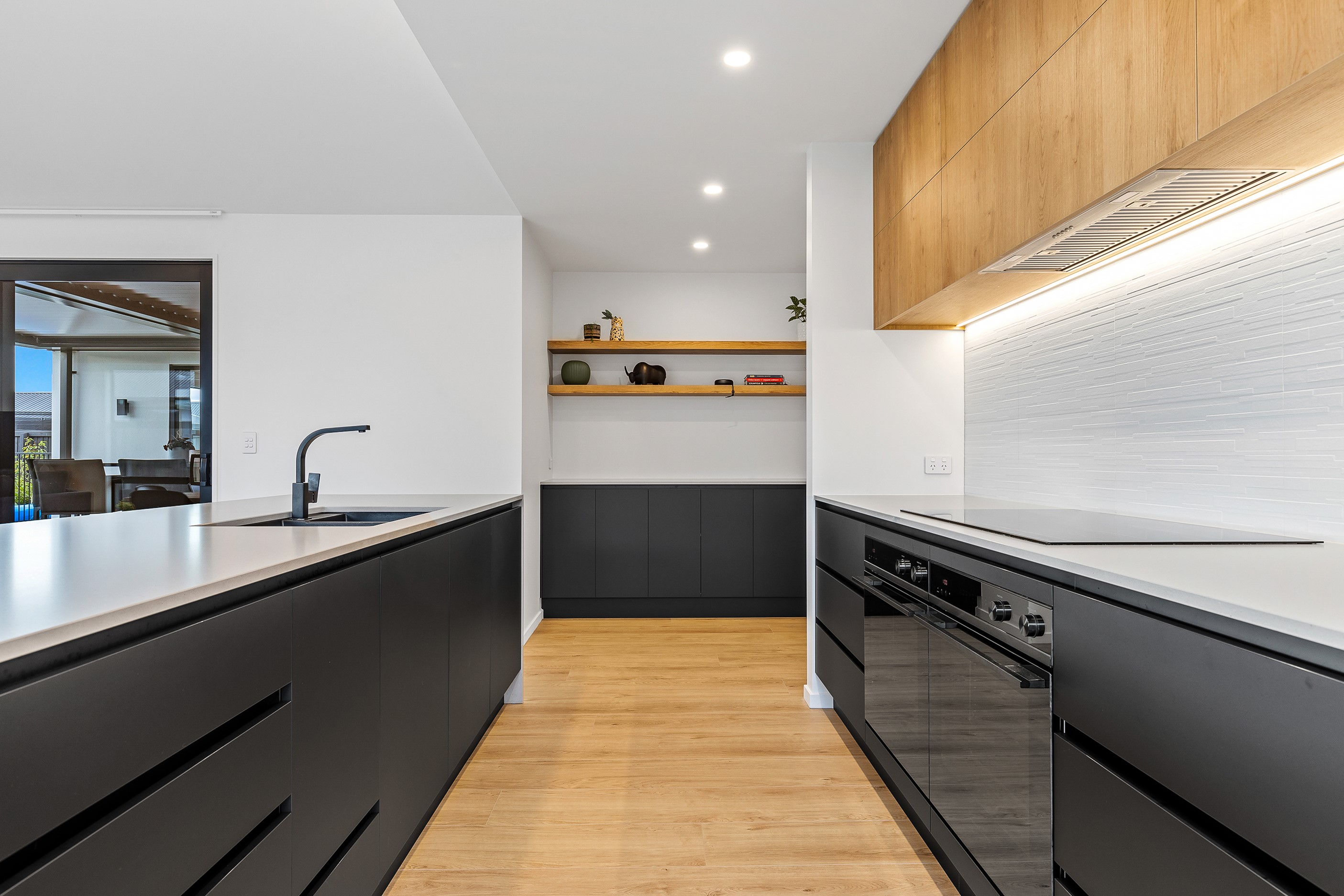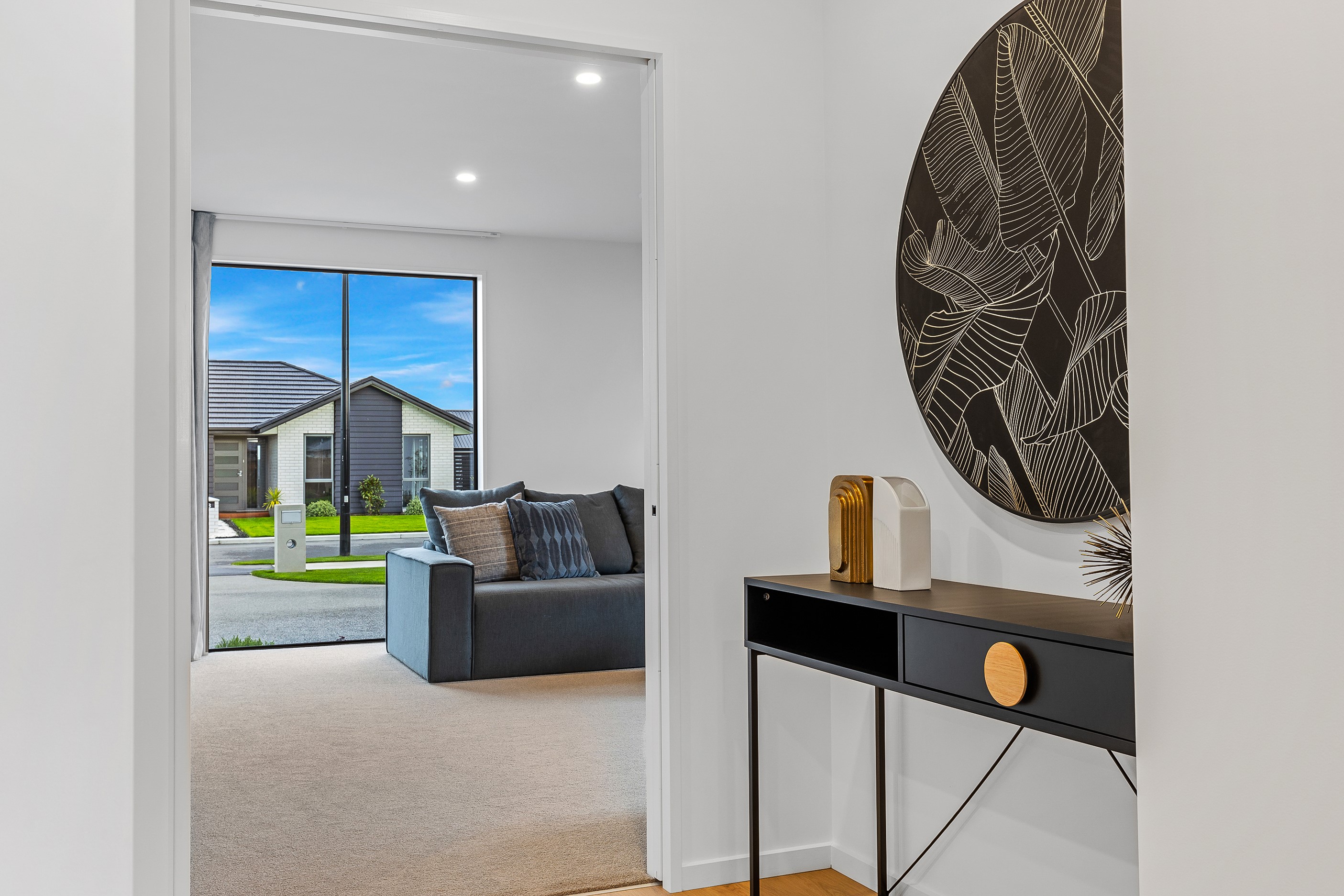 Situated in a quiet cul-de-sac, this 265sqm home is all about family. Built in a modern pavilion style, the light-filled living areas and designer kitchen feature warm hardwood flooring and honed concrete benchtops. It’s all beautiful, but also robust enough for family living. At the heart of the home, the central pavilion features a louvred shade system for year-round, sheltered dining. This area overlooks a sprawling lawn and an in-ground swimming pool. A colour palette of restful greys and whites are contrasted with bold feature walls, and the main bedroom suite includes a fully tiled ensuite, walk-in wardrobe, and large windows that look over attractive landscaping. You’ll find pitched ceilings, an internal block wall connected to the exterior to create visual cohesion, and reflective glazing on the front for privacy and warmth. Add in a handsome exterior in a white plaster cladding system with horizontal cedar accents, including the chimney casing, and you have quite the package. In terms of comforts and future-proofing, the four-bedroom two-bathroom home has a designer log burner, ducted heating, self-cleaning ovens and gas hot water. This home is truly a modern oasis for a growing family.