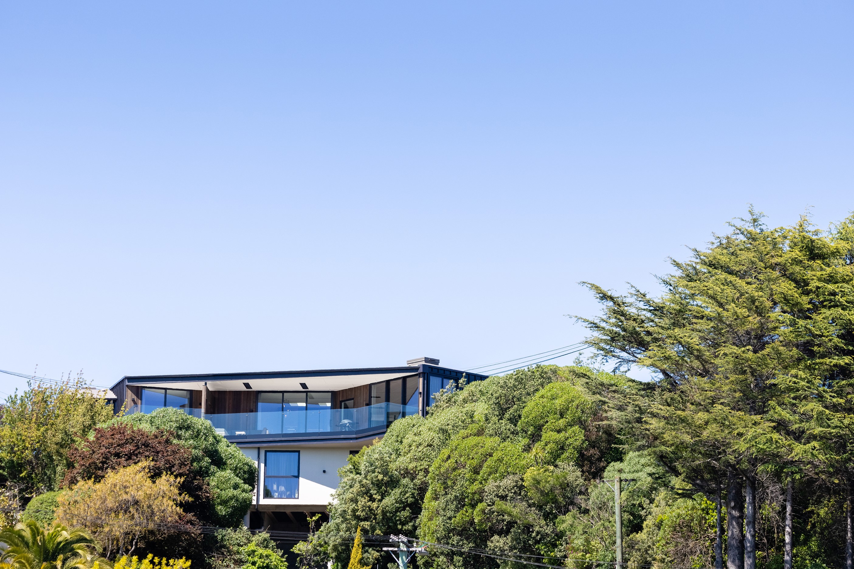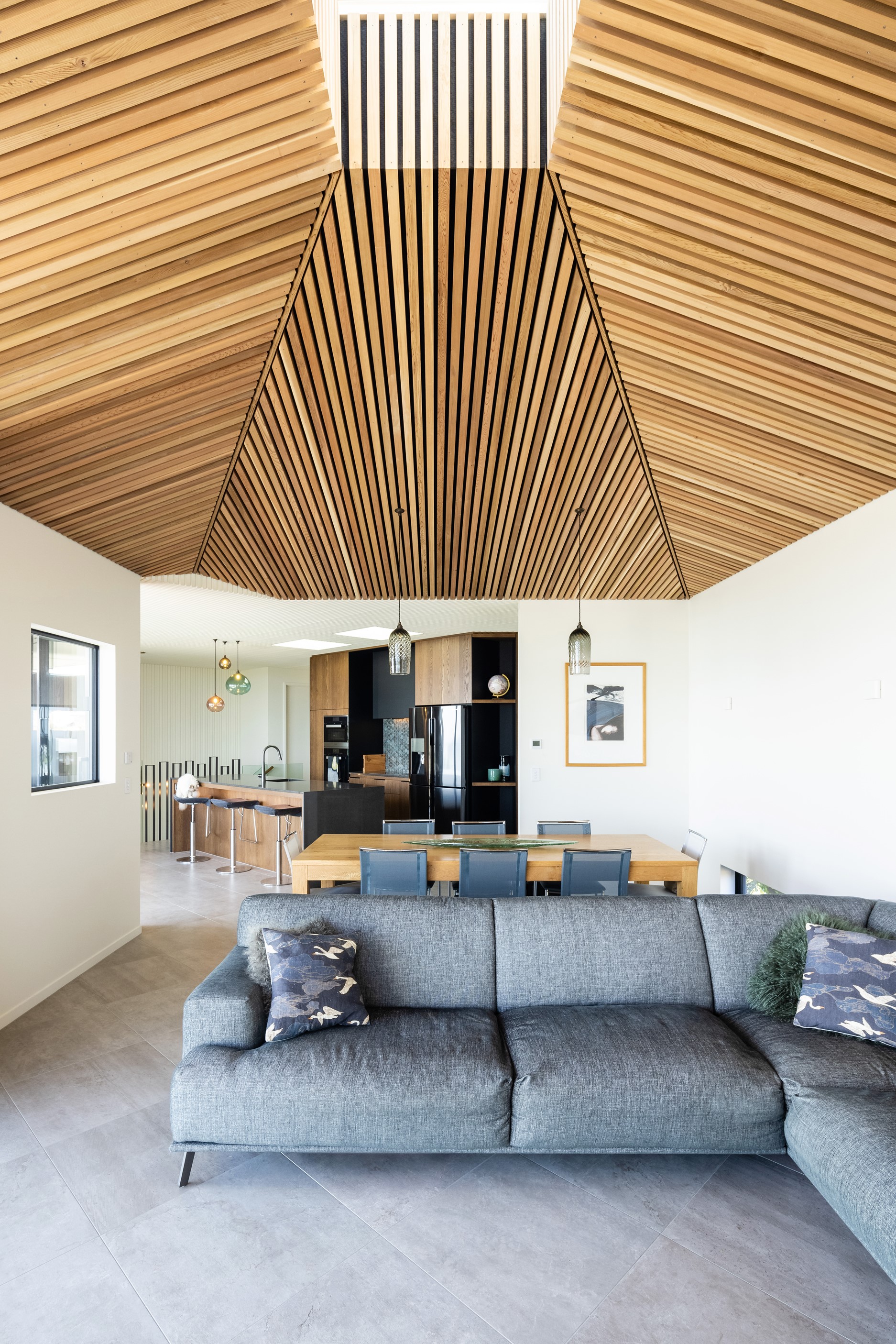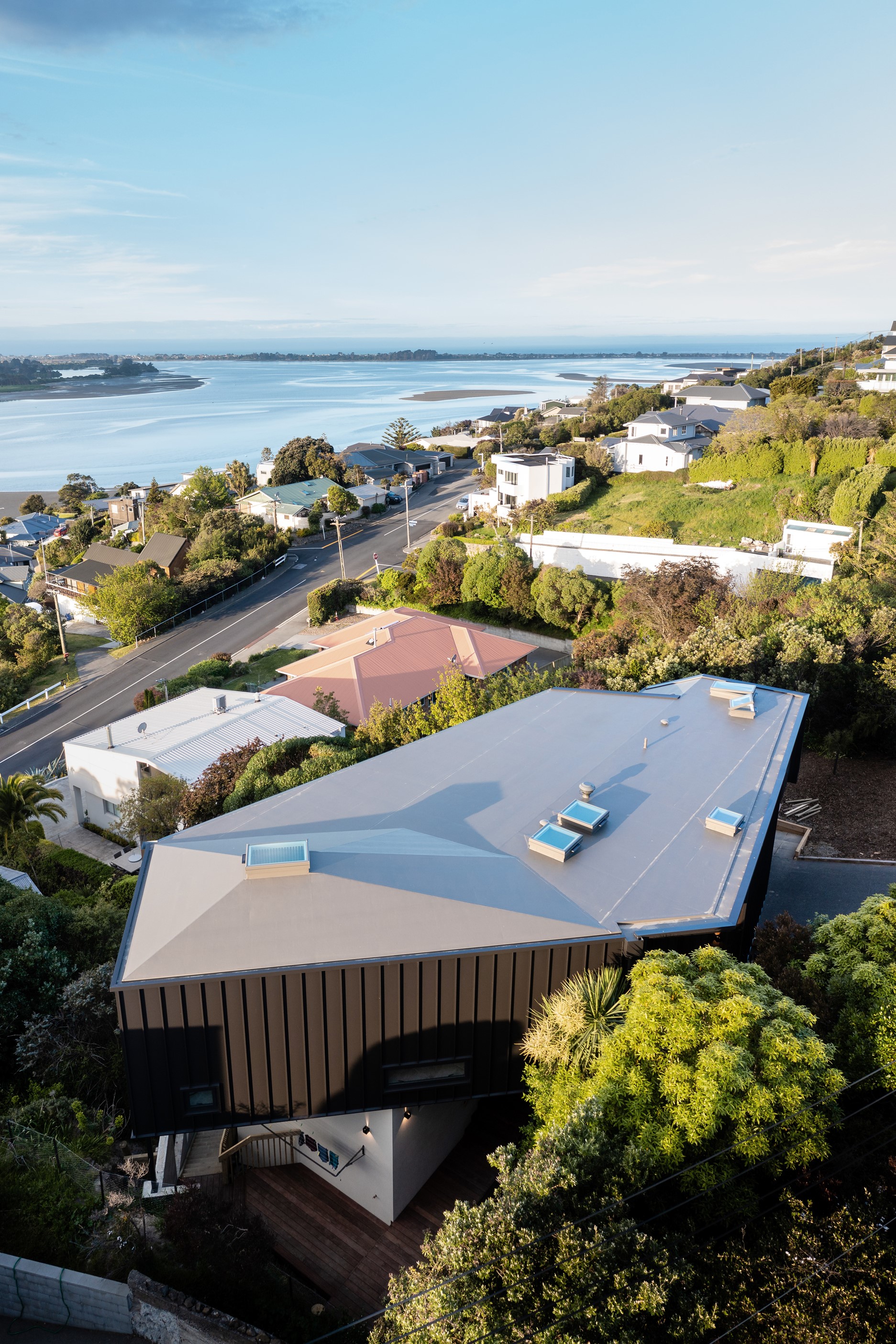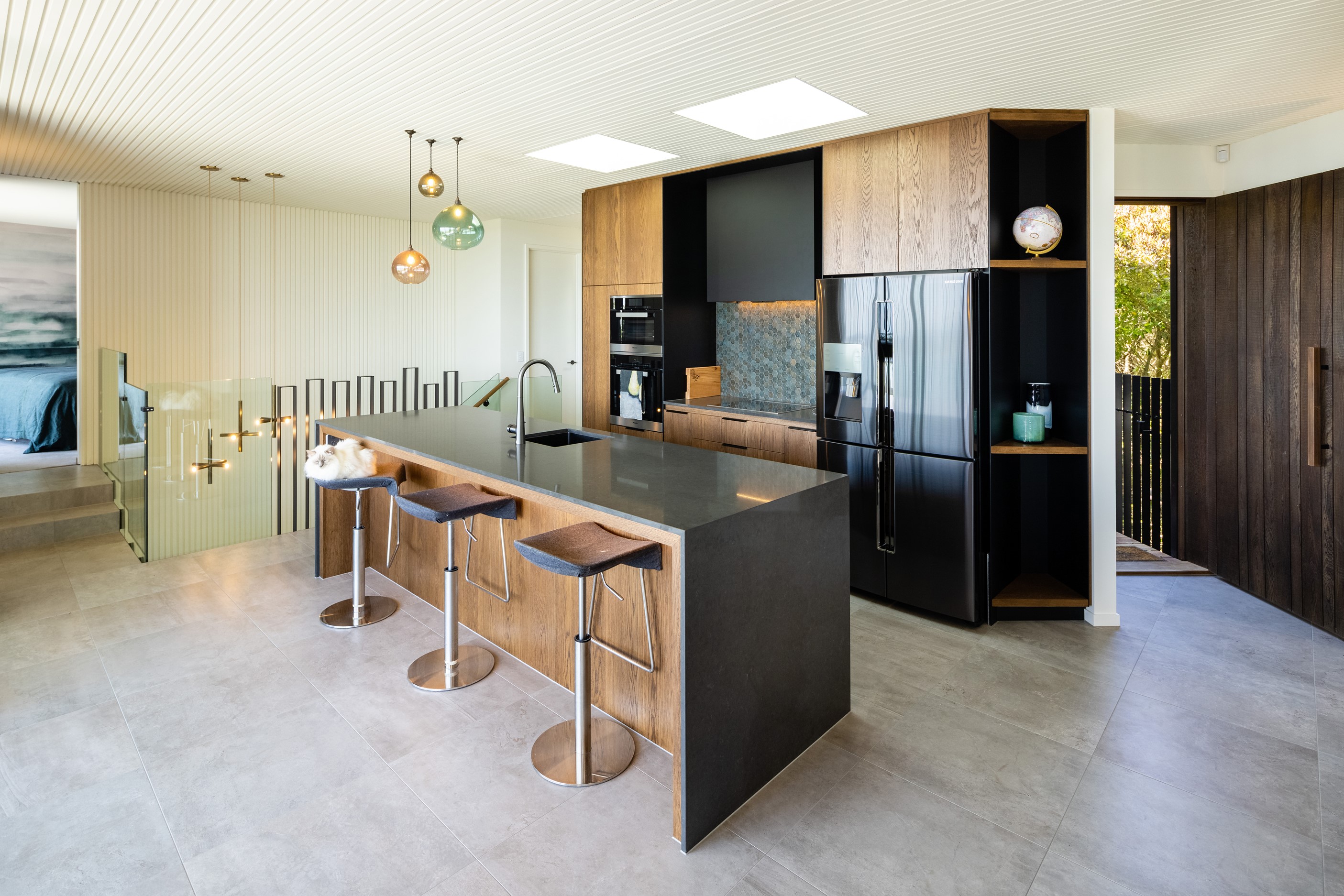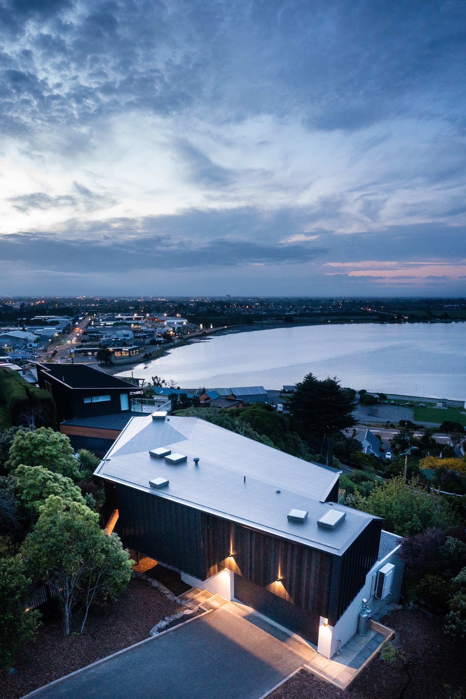 What do you do when you have a section in an awkward shape on a steep slope in an earthquake zone? If you’re this builder, you take all those challenges in your stride and emerge with this masterpiece. Designed by Max Capocaccia from MC Architecture Studio, the home intelligently exploits all available space. Most importantly, it honours the stunning views across the estuary and to the mountains in the distance. Unassuming and private from the street, the entrance is reached by a bridge, winding through native bush and trees. Once inside, however, this magnificent ode to craft opens up, with panels of glass drinking in sunlight and revealing that dazzling view. The living area, dining, kitchen, scullery, main bedroom and ensuite fill the upper floor. A balcony with a generous soffit extends the main living area to the deck. The level below features a guest bedroom and bathroom, plus a third bedroom that doubles as a home office. Refined in its expression, this is a glamorous home. Above the main living area, a vaulted cedar-batten ceiling converging in a skylight is a triumph. With shiplap timber ceilings, a luminous stairwell and bespoke built-in joinery, there are artisan delights at every turn.