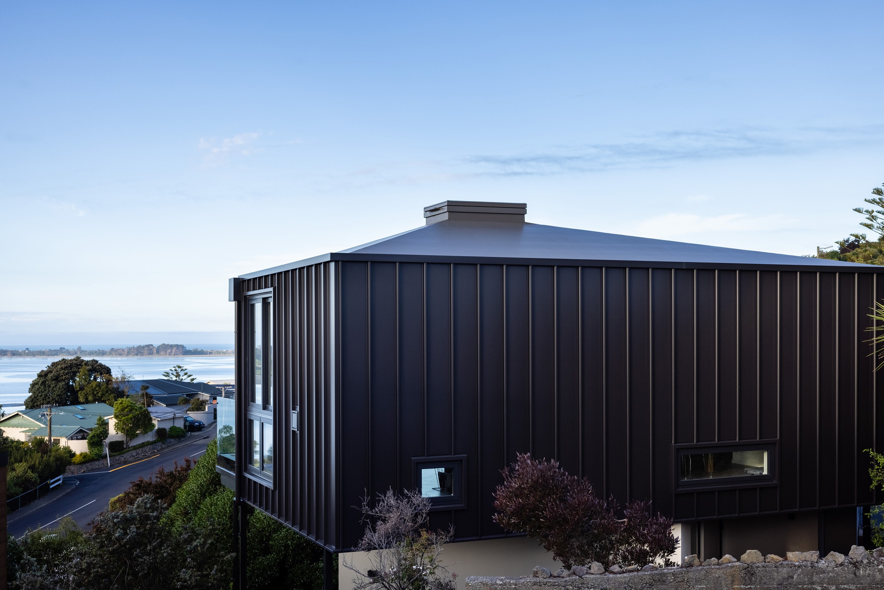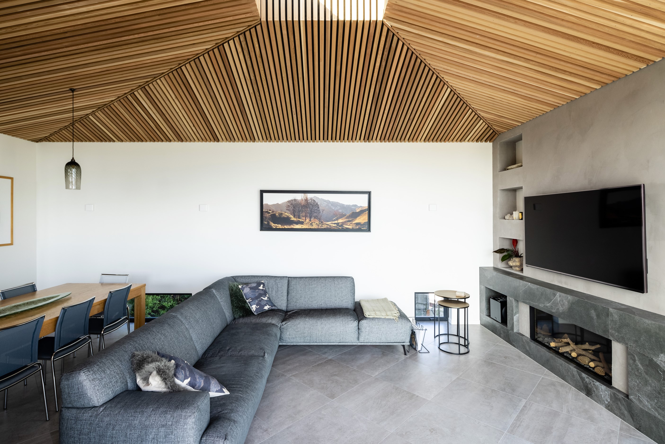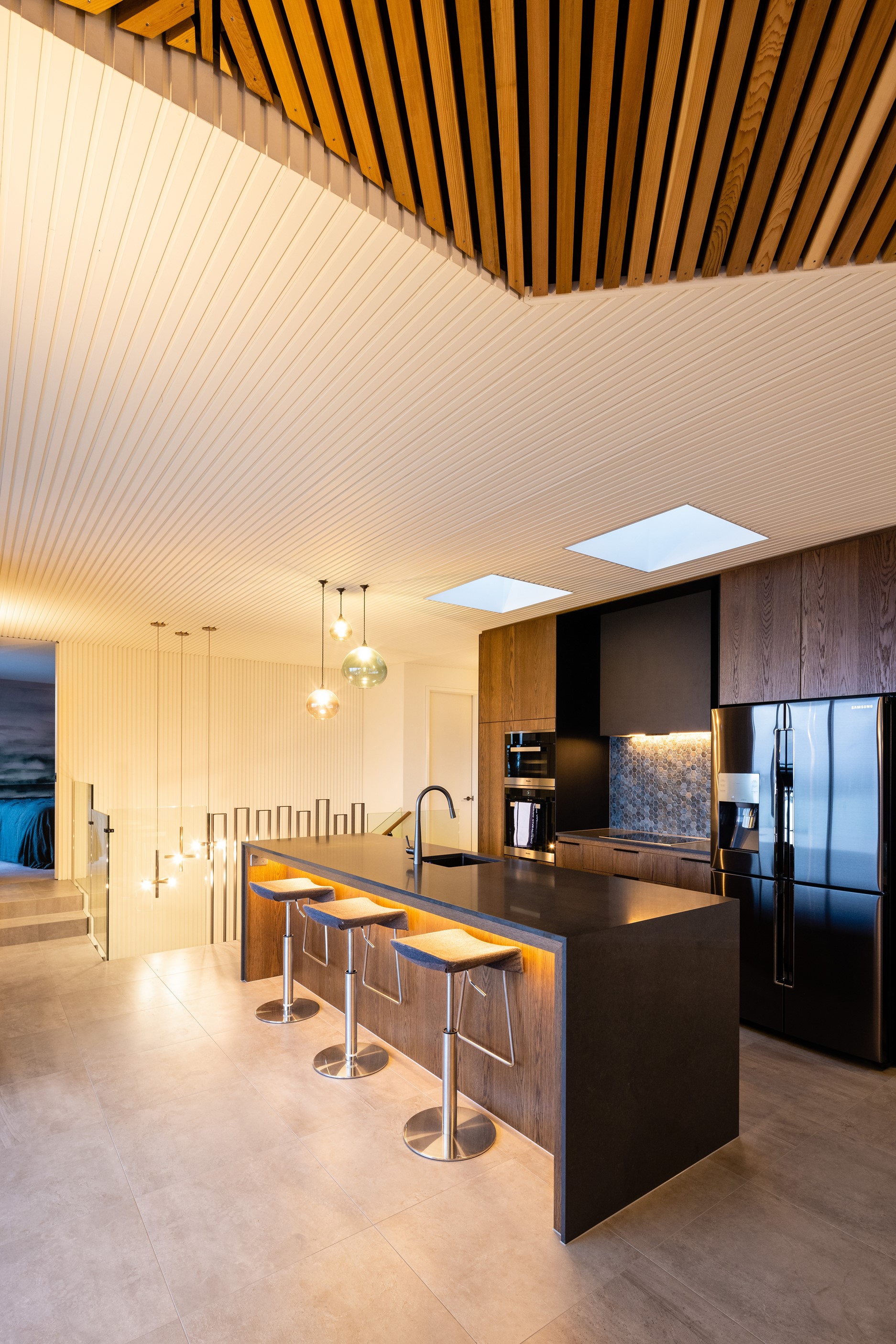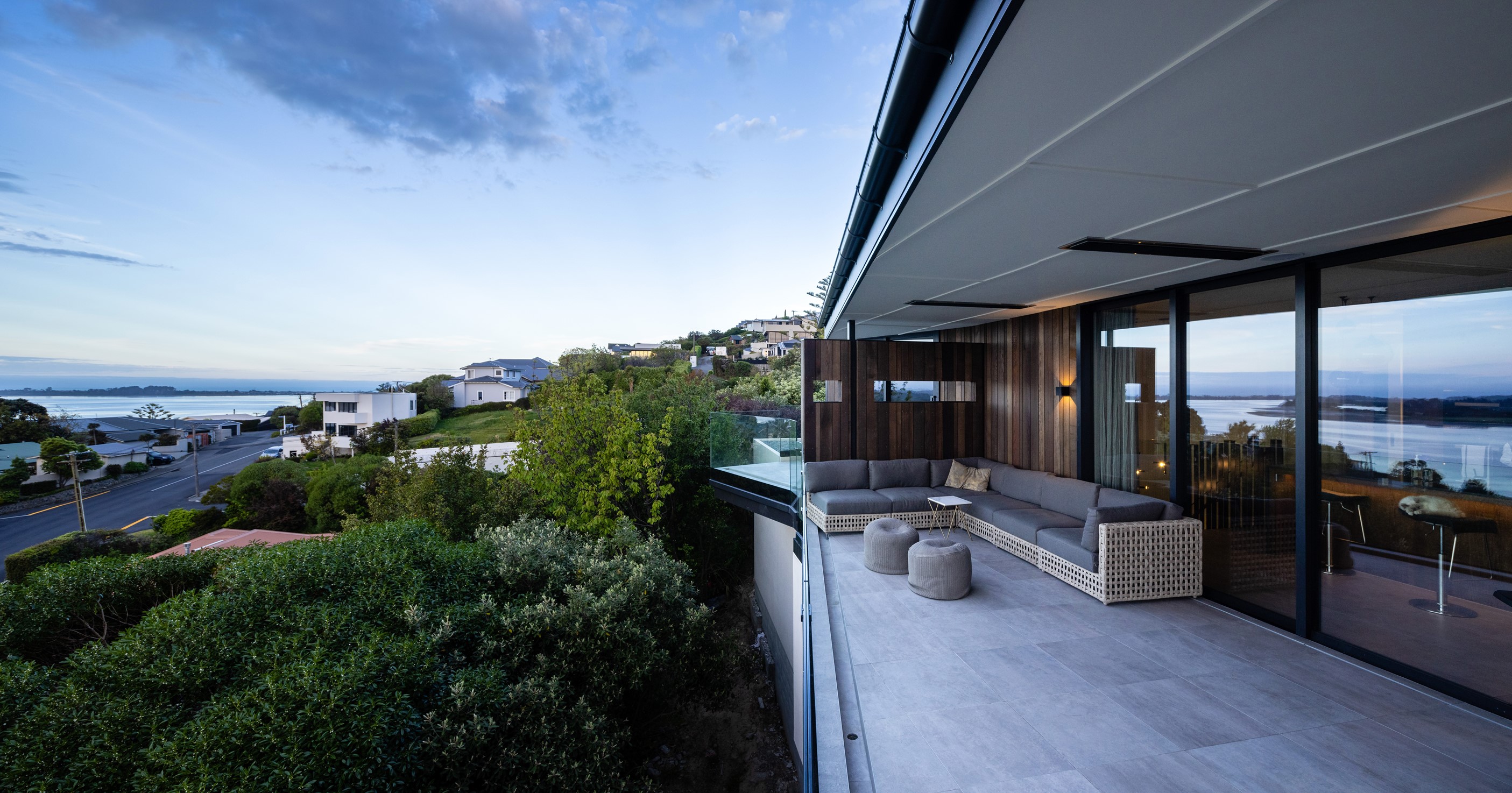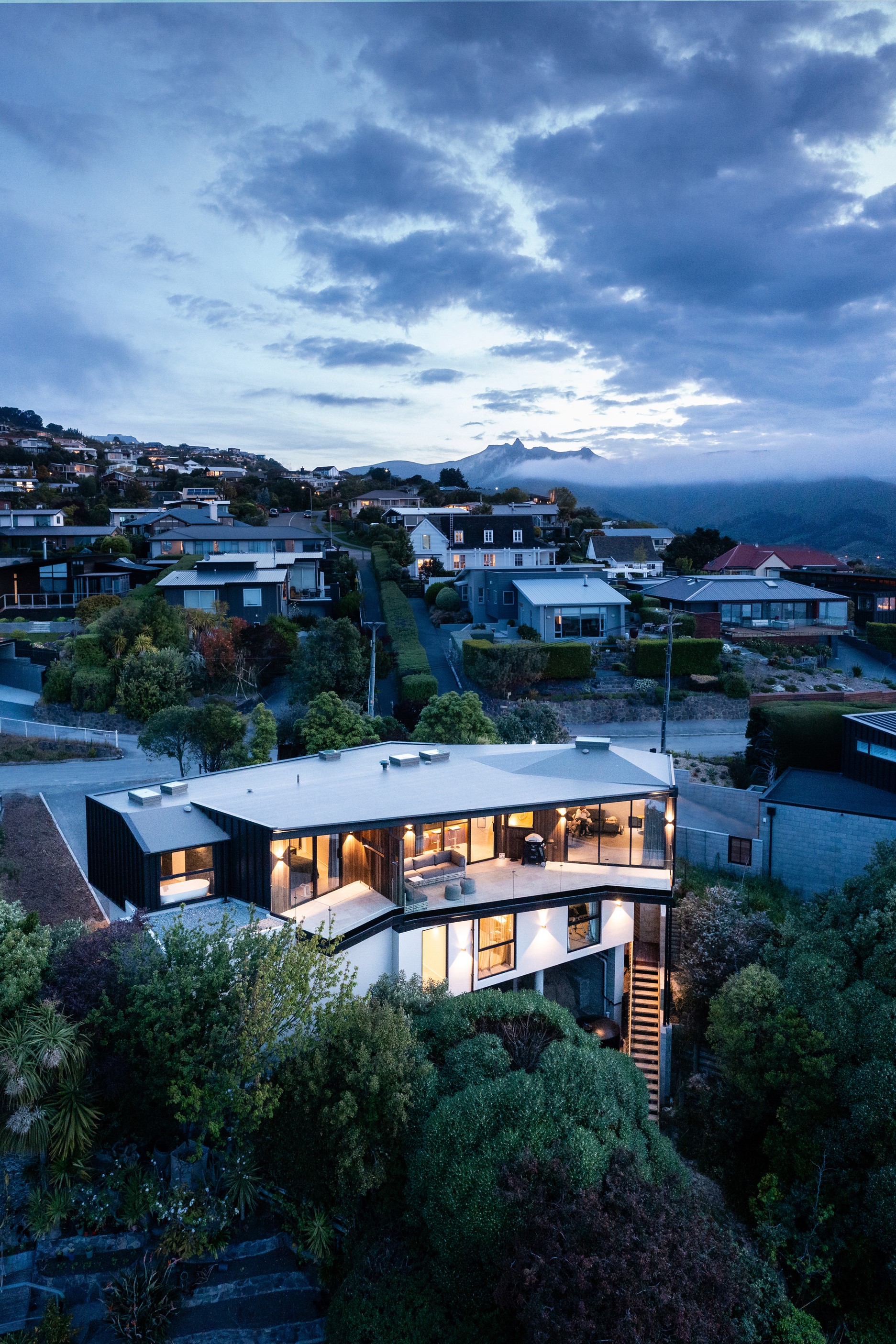 What do you do when you have a section in an awkward shape on a steep slope in an earthquake zone? If you’re this builder, you take all those challenges in your stride and emerge with this masterpiece. Designed by Max Capocaccia from MC Architecture Studio, the home intelligently exploits all available space. Most importantly, it honours the stunning views across the estuary and to the mountains in the distance. Unassuming and private from the street, the entrance is reached by a bridge, winding through native bush and trees. Once inside, however, this magnificent ode to craft opens up, with panels of glass drinking in sunlight and revealing that dazzling view. The living area, dining, kitchen, scullery, main bedroom and ensuite fill the upper floor. A balcony with a generous soffit extends the main living area to the deck. The level below features a guest bedroom and bathroom, plus a third bedroom that doubles as a home office. Refined in its expression, this is a glamorous home. Above the main living area, a vaulted cedar-batten ceiling converging in a skylight is a triumph. With shiplap timber ceilings, a luminous stairwell and bespoke built-in joinery, there are artisan delights at every turn.