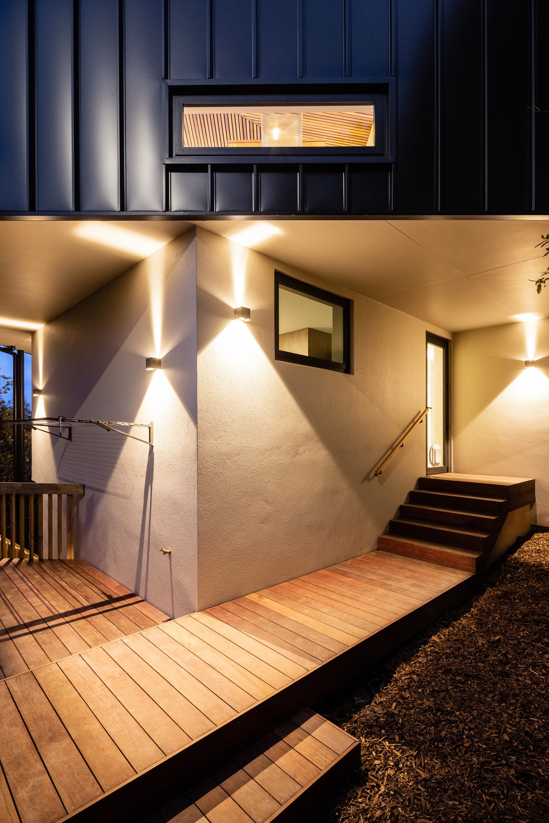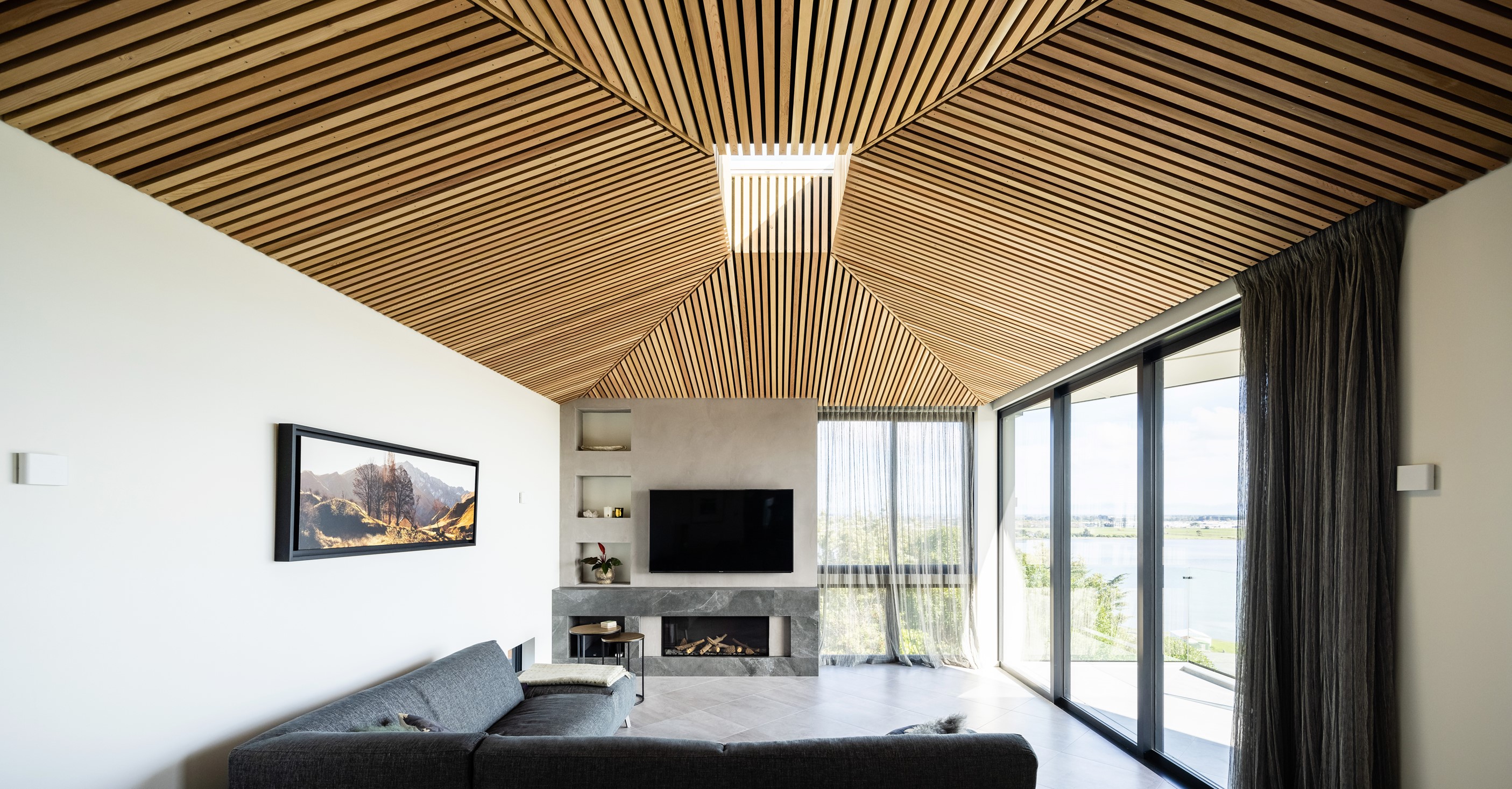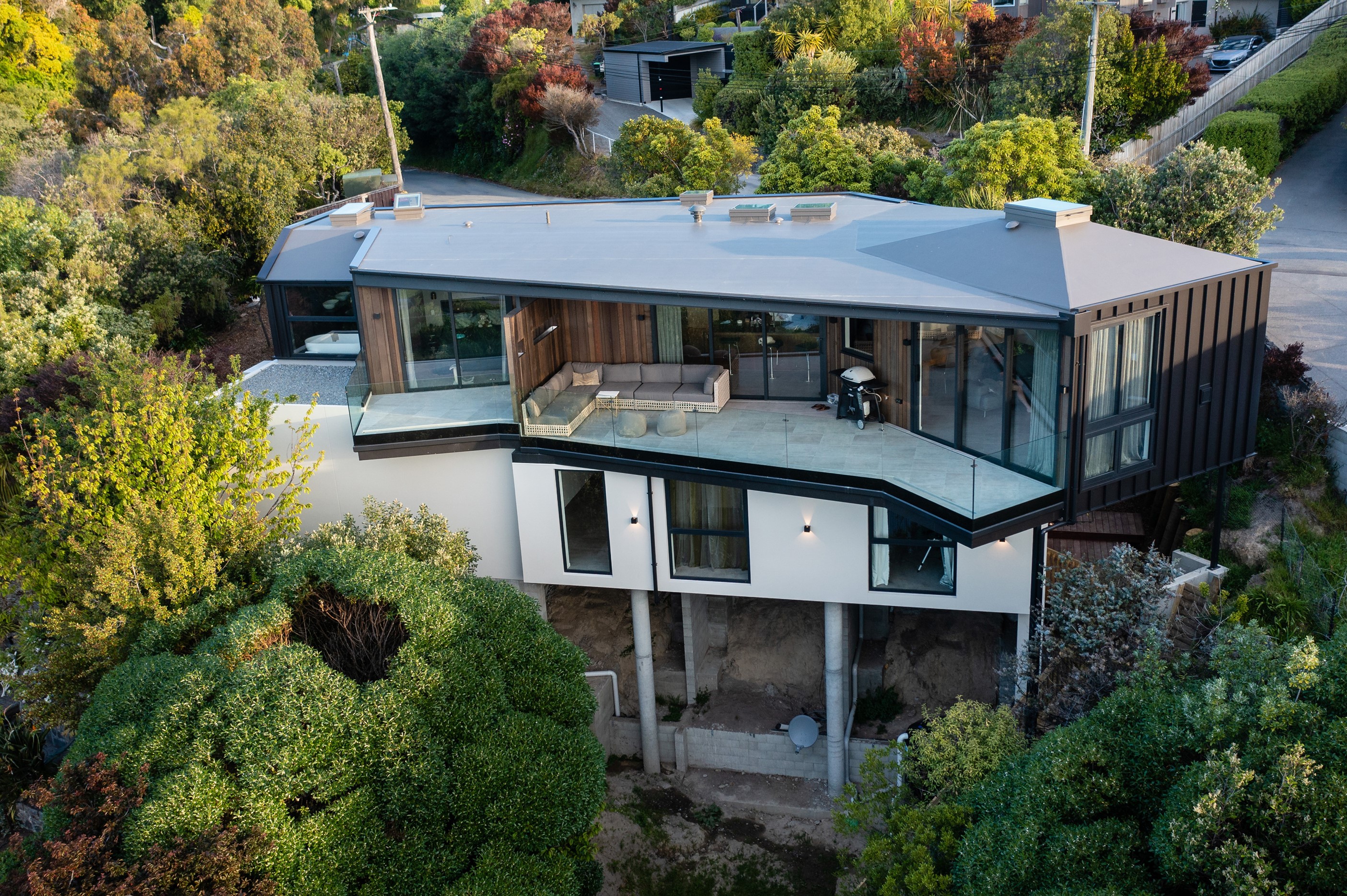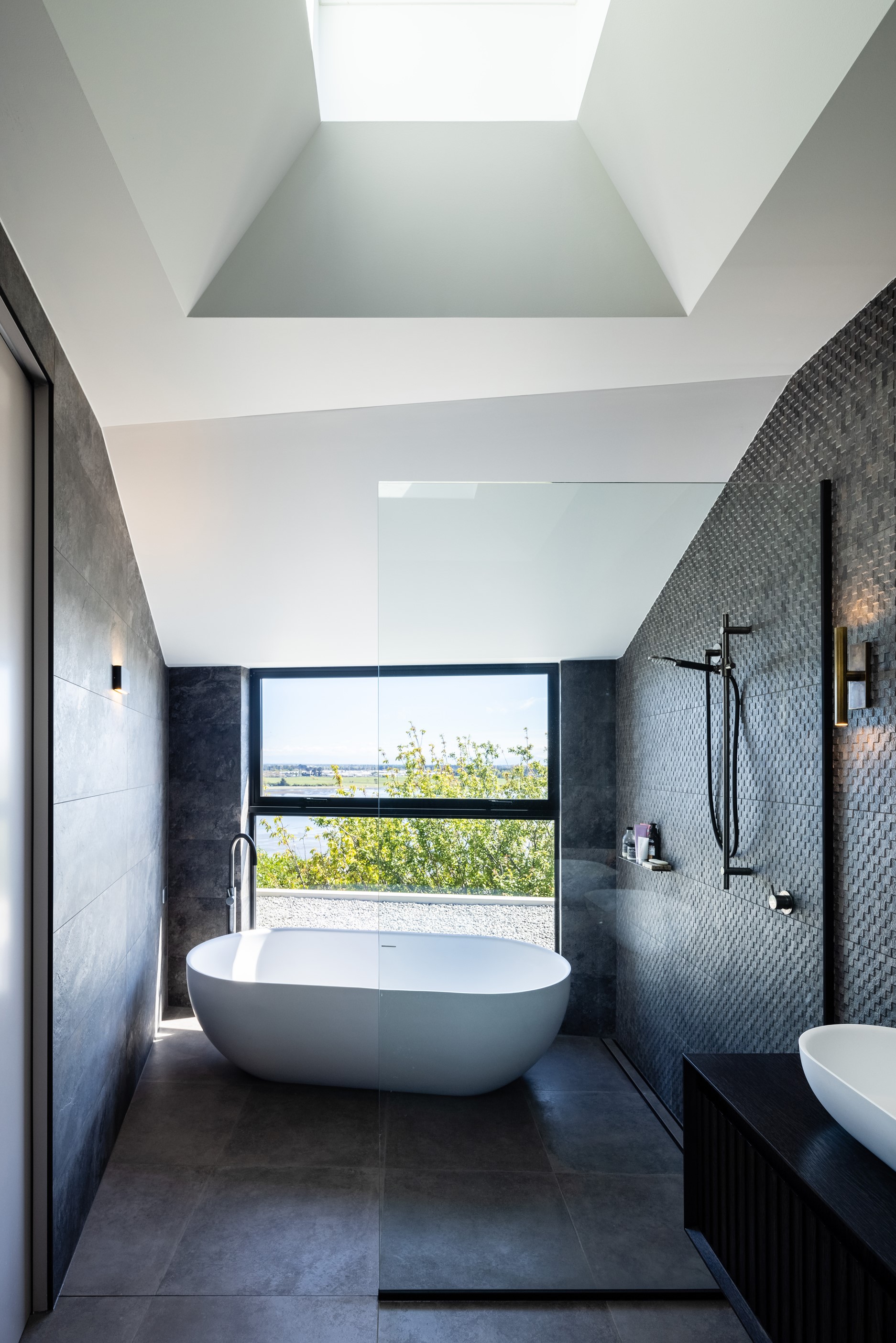 What do you do when you have a section in an awkward shape on a steep slope in an earthquake zone? If you’re this builder, you take all those challenges in your stride and emerge with this masterpiece. Designed by Max Capocaccia from MC Architecture Studio, the home intelligently exploits all available space. Most importantly, it honours the stunning views across the estuary and to the mountains in the distance. Unassuming and private from the street, the entrance is reached by a bridge, winding through native bush and trees. Once inside, however, this magnificent ode to craft opens up, with panels of glass drinking in sunlight and revealing that dazzling view. The living area, dining, kitchen, scullery, main bedroom and ensuite fill the upper floor. A balcony with a generous soffit extends the main living area to the deck. The level below features a guest bedroom and bathroom, plus a third bedroom that doubles as a home office. Refined in its expression, this is a glamorous home. Above the main living area, a vaulted cedar-batten ceiling converging in a skylight is a triumph. With shiplap timber ceilings, a luminous stairwell and bespoke built-in joinery, there are artisan delights at every turn.