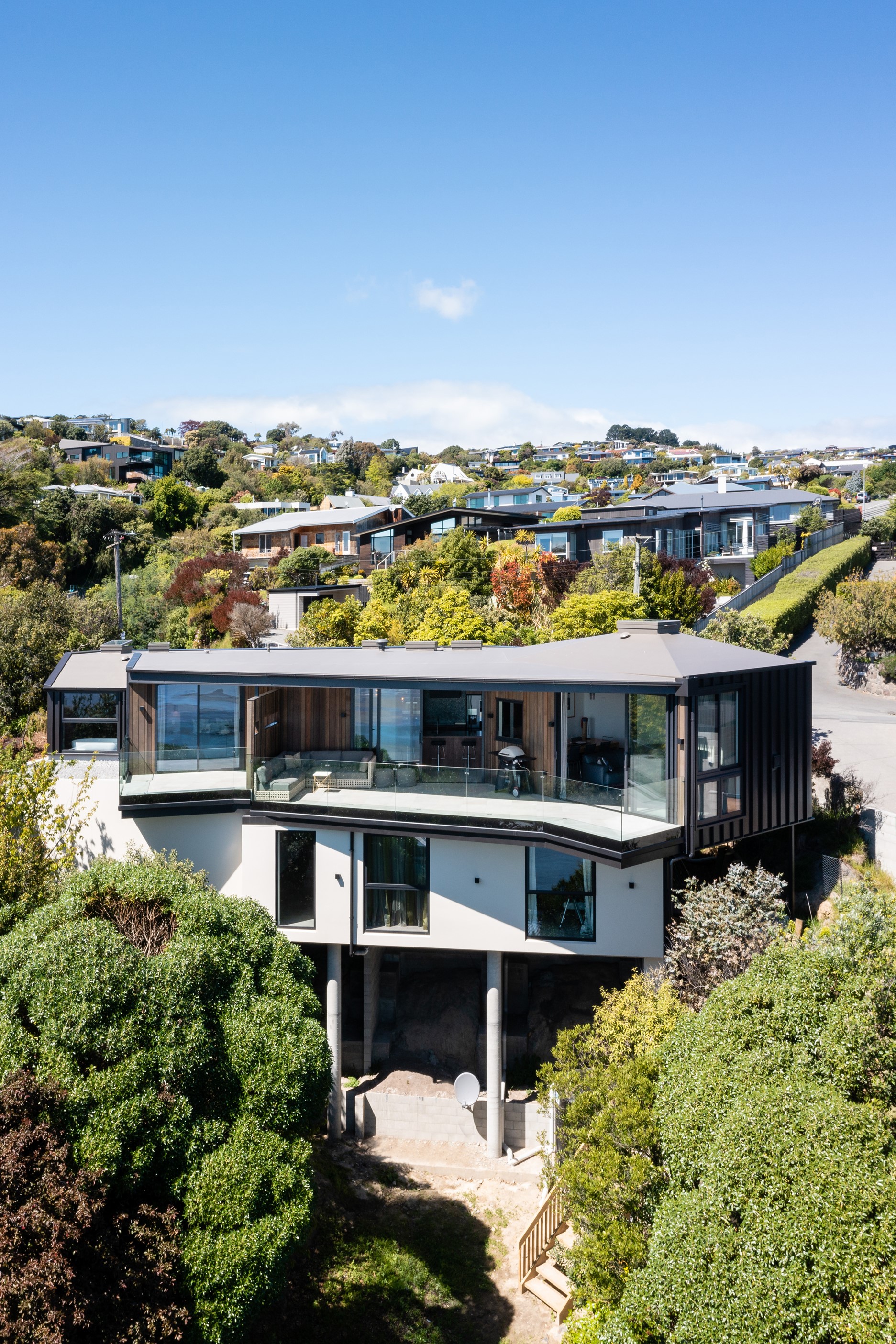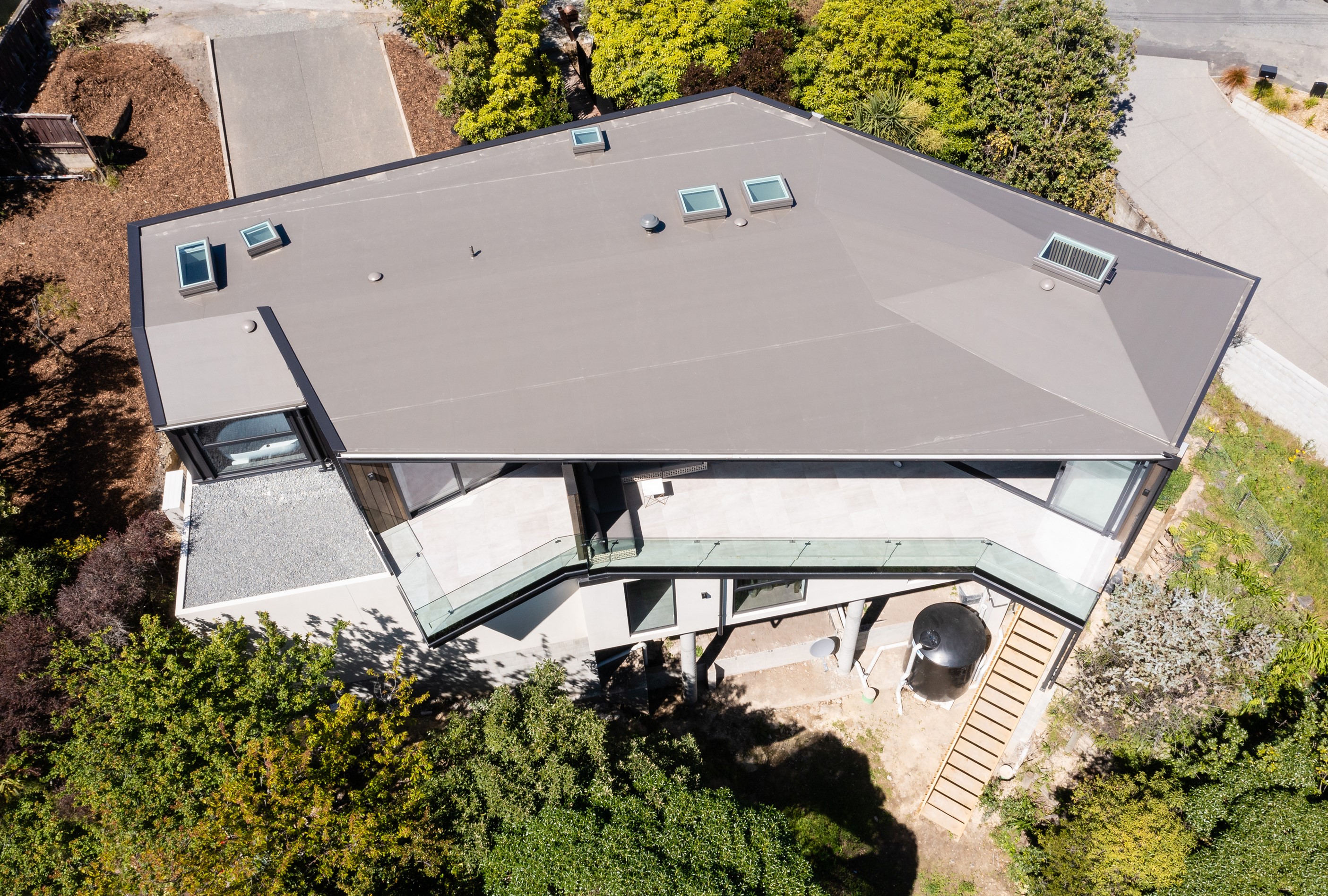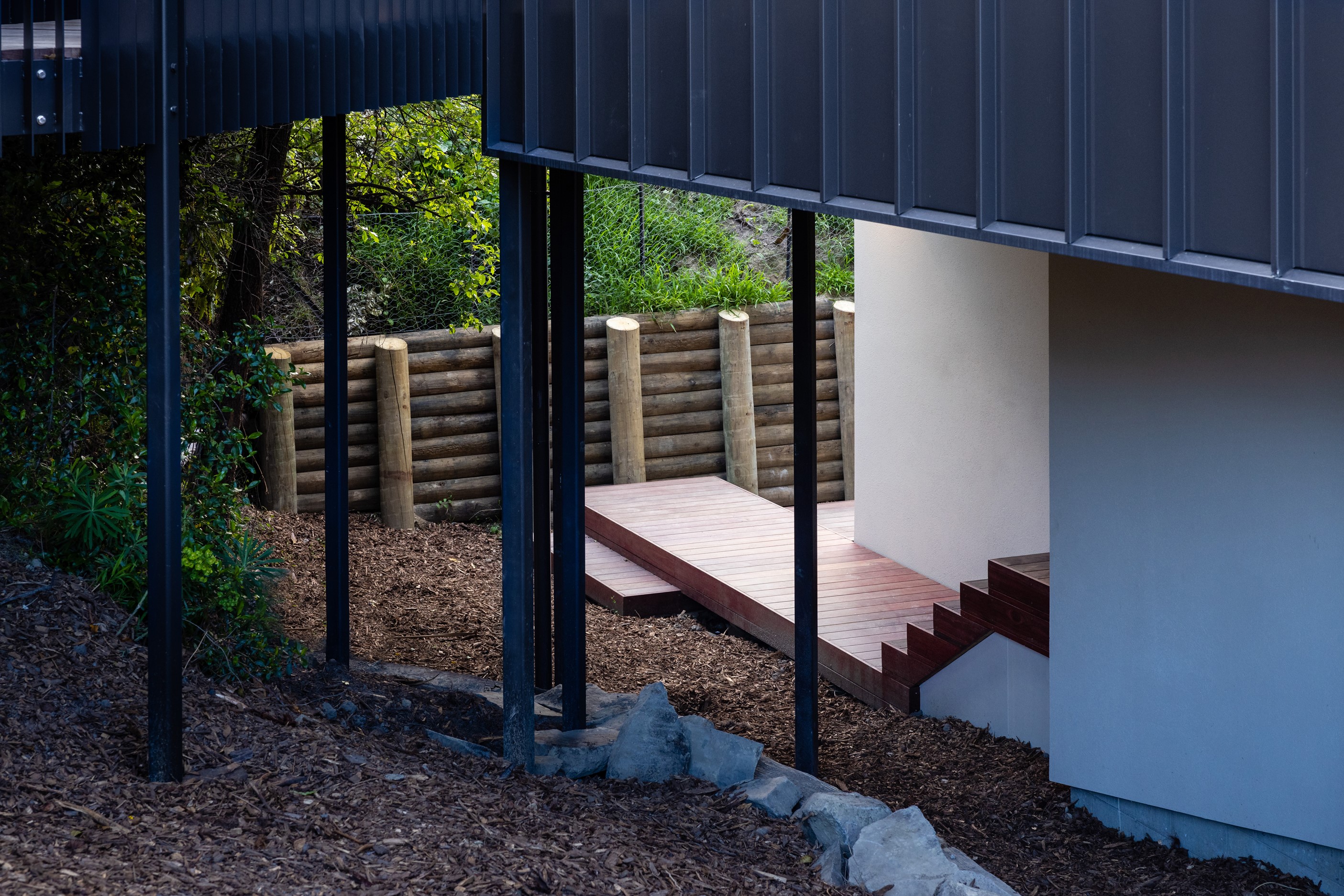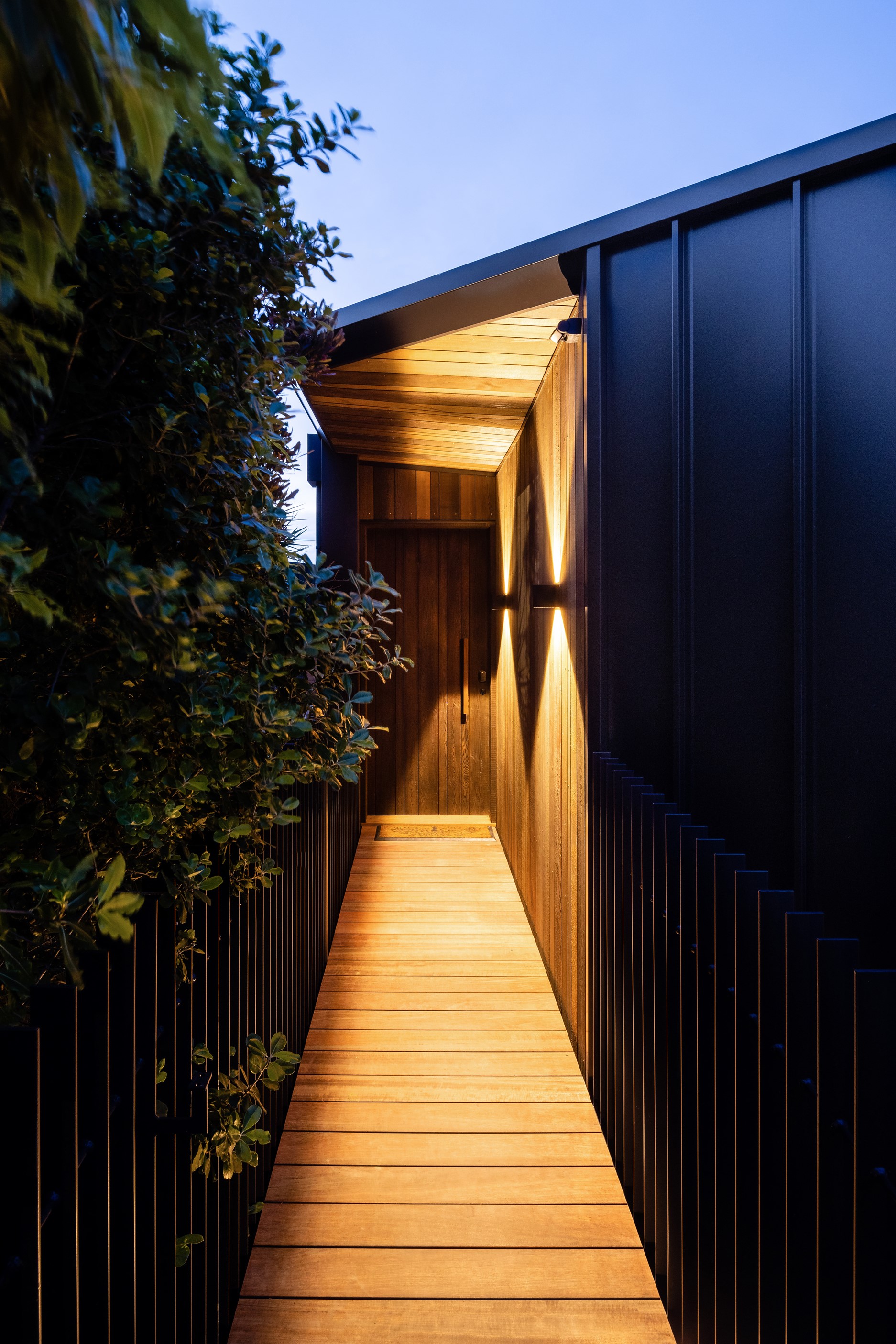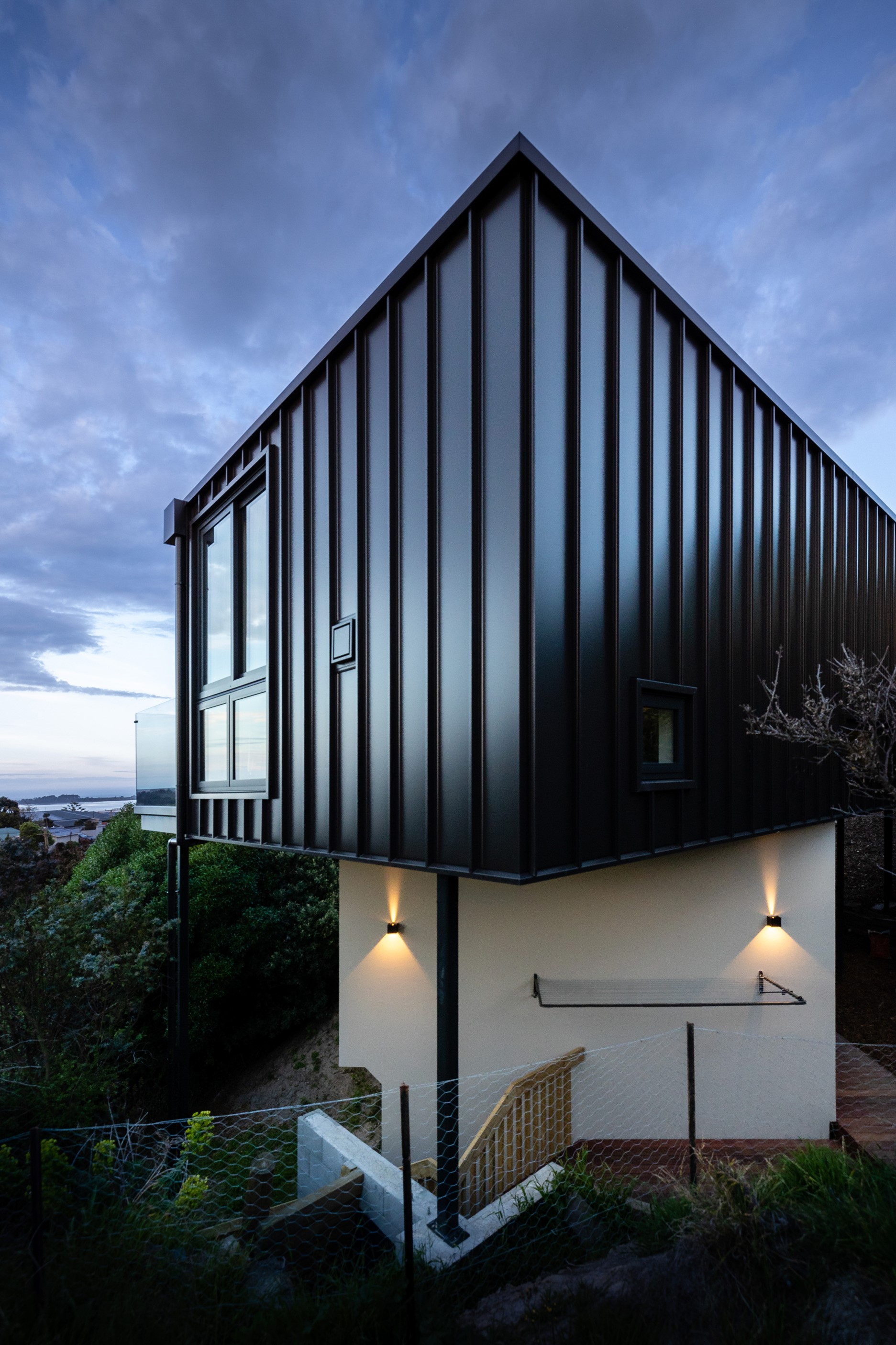 What do you do when you have a section in an awkward shape on a steep slope in an earthquake zone? If you’re this builder, you take all those challenges in your stride and emerge with this masterpiece. Designed by Max Capocaccia from MC Architecture Studio, the home intelligently exploits all available space. Most importantly, it honours the stunning views across the estuary and to the mountains in the distance. Unassuming and private from the street, the entrance is reached by a bridge, winding through native bush and trees. Once inside, however, this magnificent ode to craft opens up, with panels of glass drinking in sunlight and revealing that dazzling view. The living area, dining, kitchen, scullery, main bedroom and ensuite fill the upper floor. A balcony with a generous soffit extends the main living area to the deck. The level below features a guest bedroom and bathroom, plus a third bedroom that doubles as a home office. Refined in its expression, this is a glamorous home. Above the main living area, a vaulted cedar-batten ceiling converging in a skylight is a triumph. With shiplap timber ceilings, a luminous stairwell and bespoke built-in joinery, there are artisan delights at every turn.