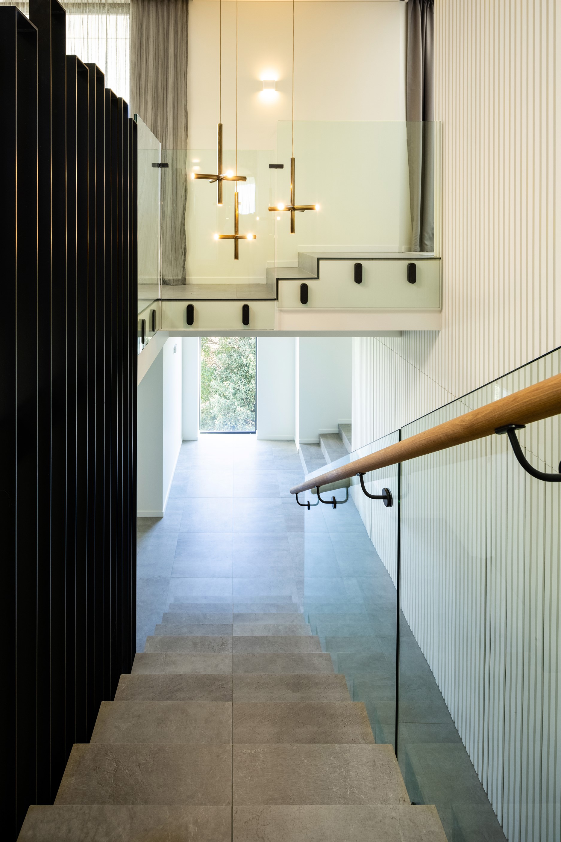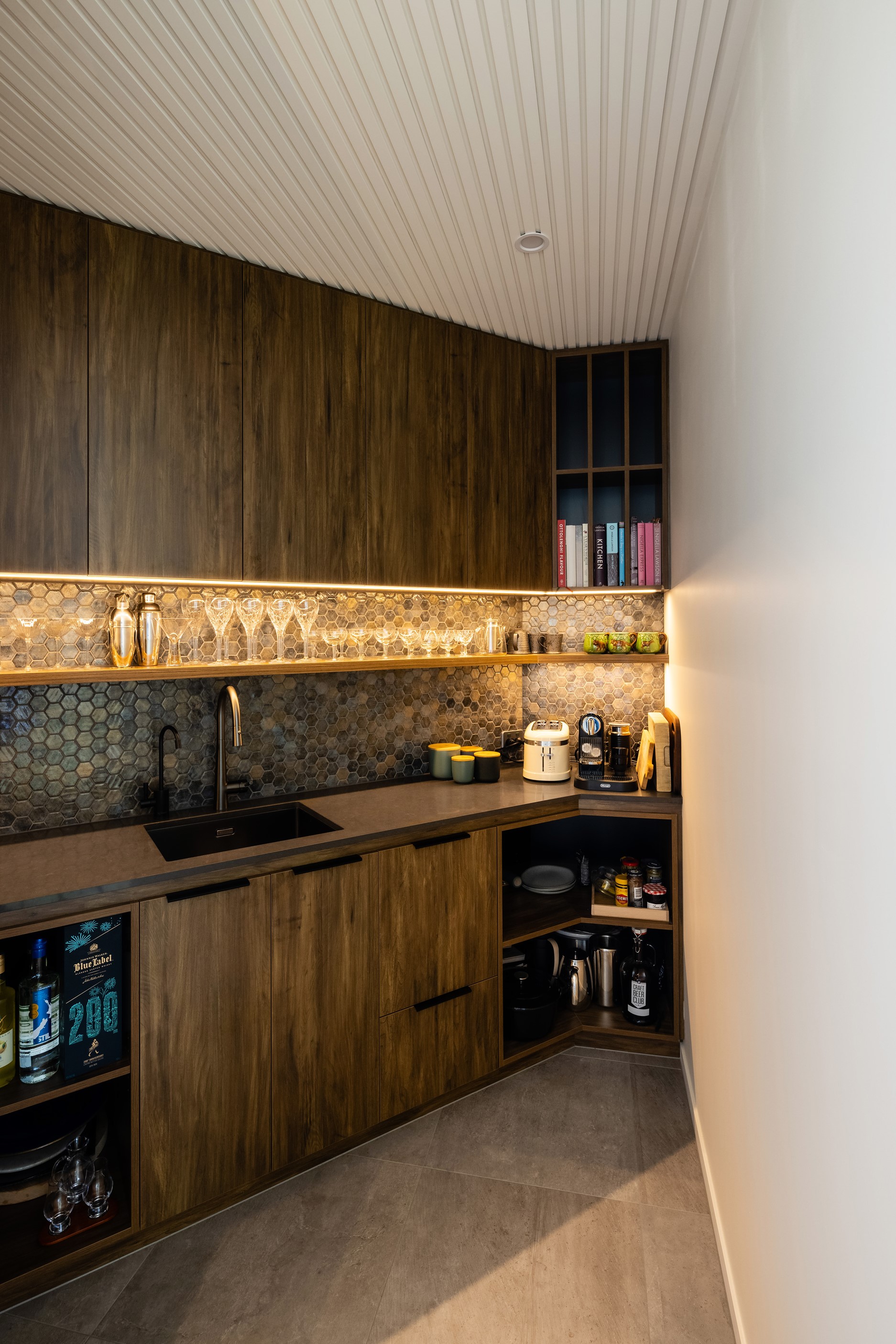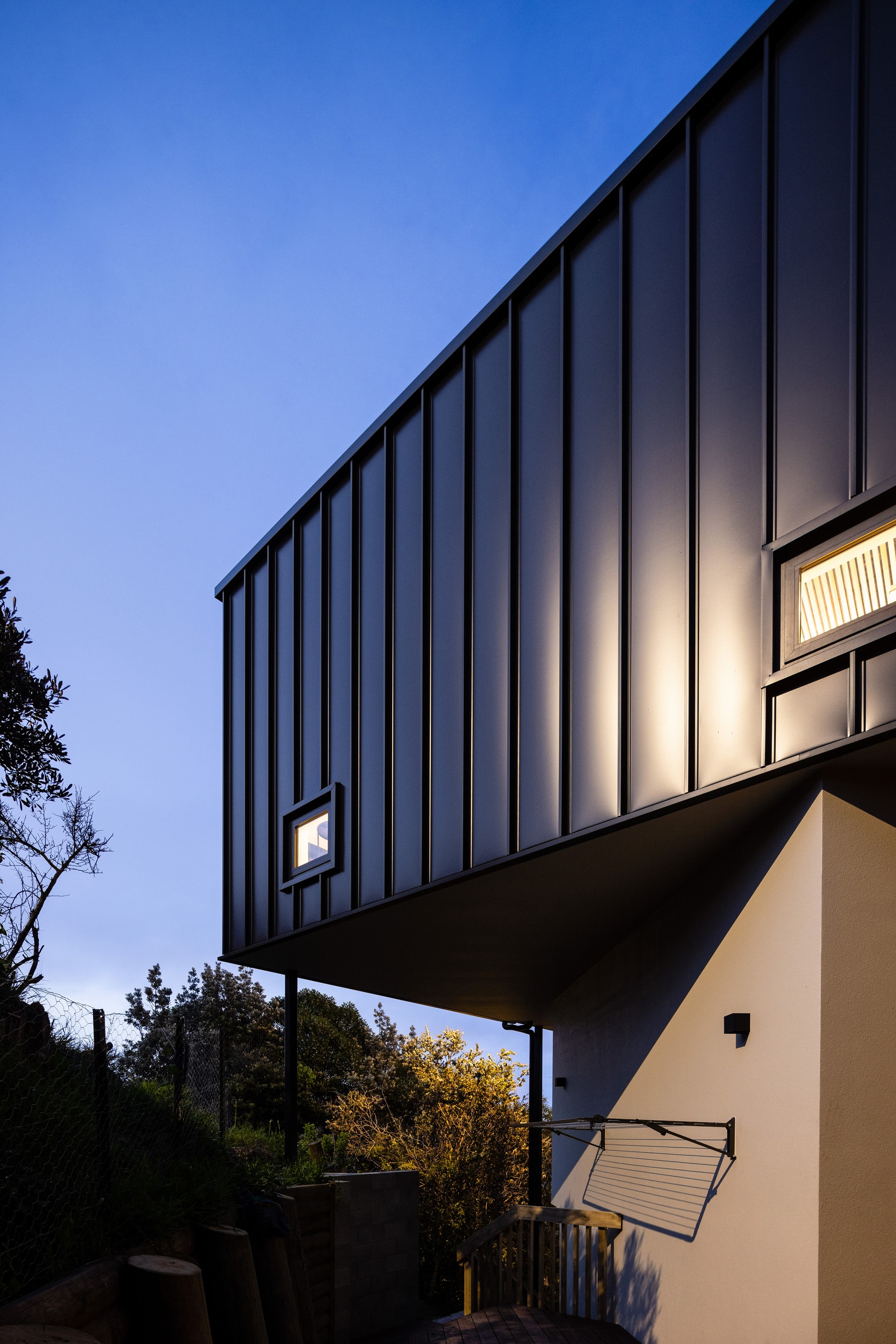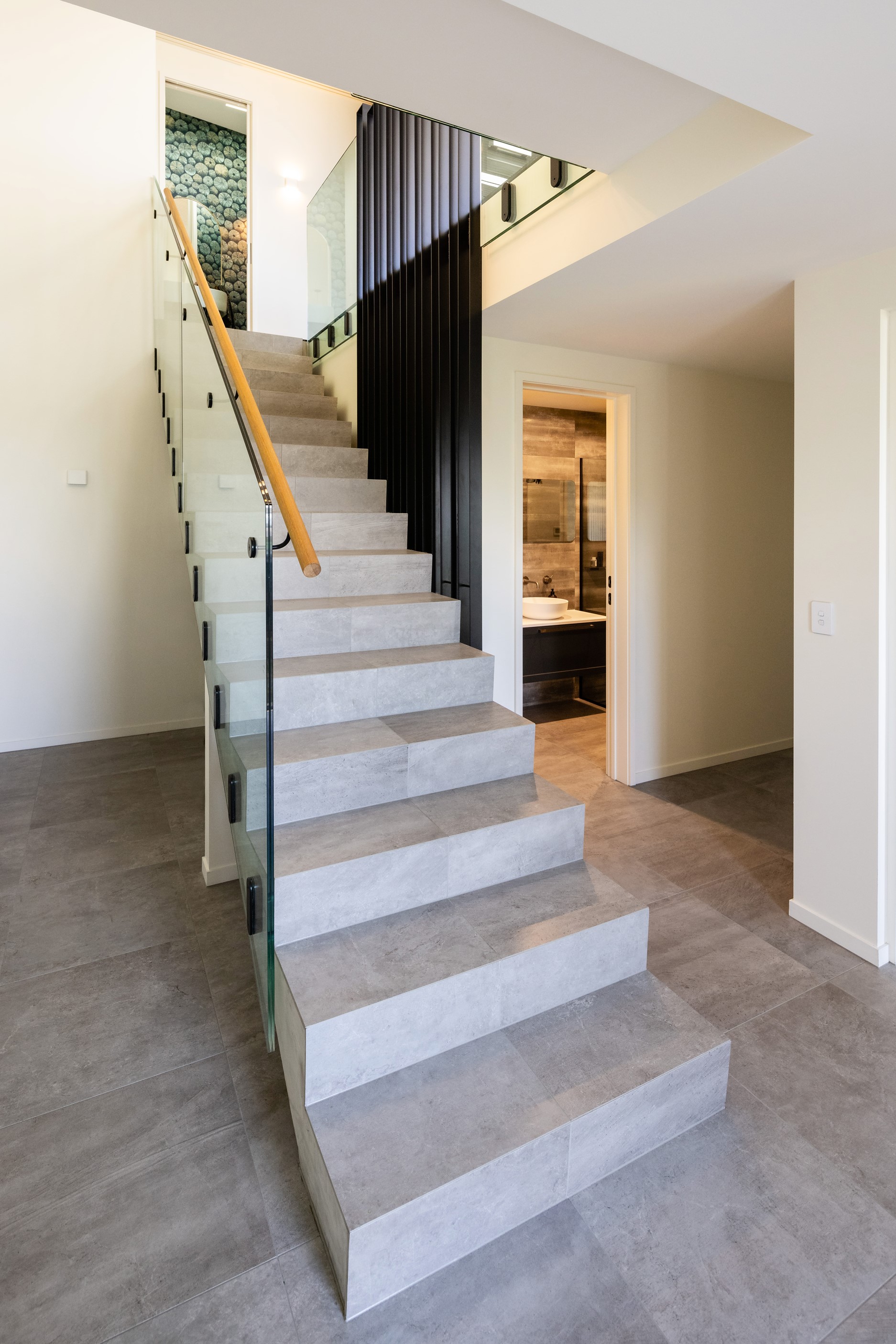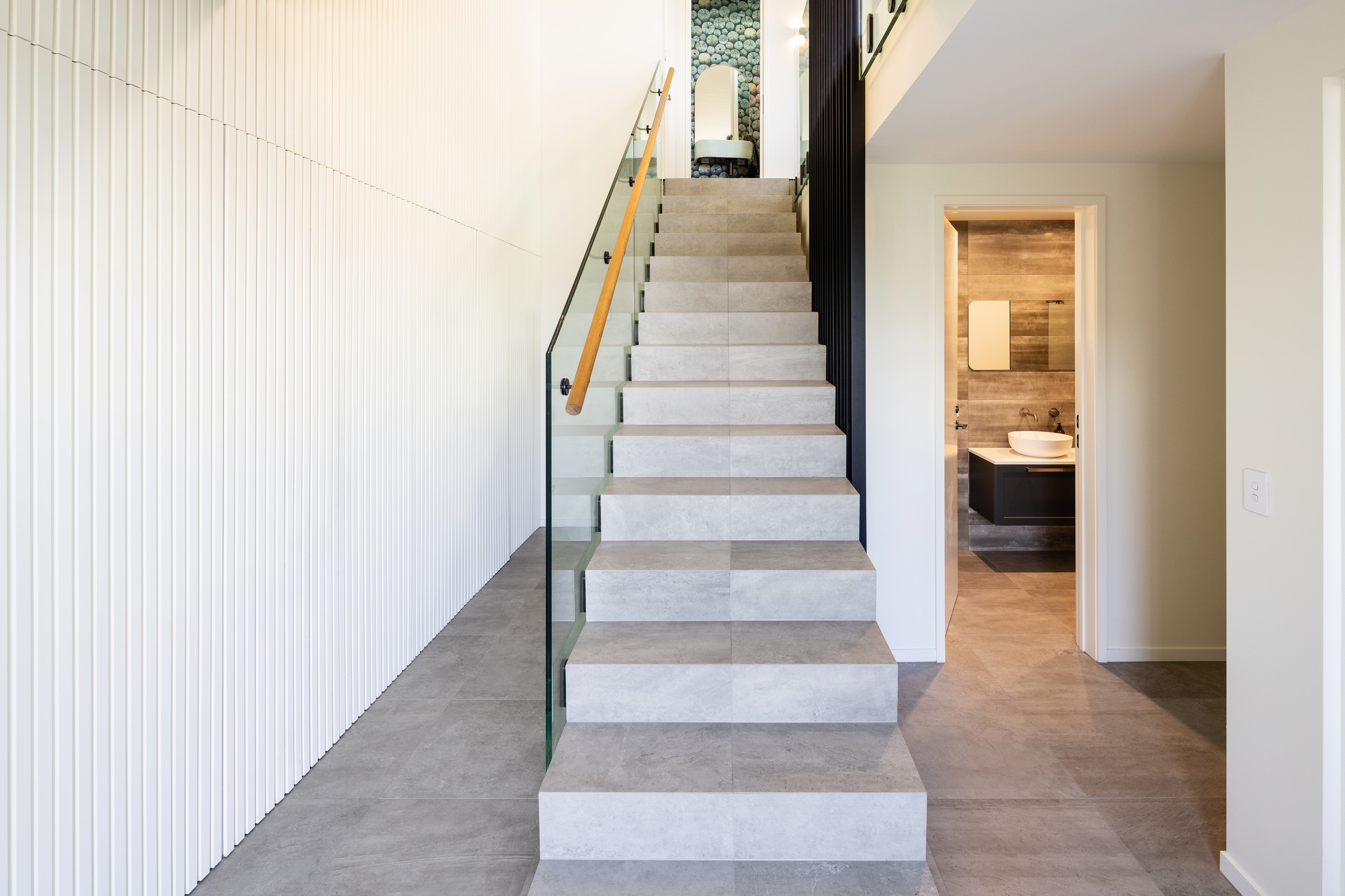 What do you do when you have a section in an awkward shape on a steep slope in an earthquake zone? If you’re this builder, you take all those challenges in your stride and emerge with this masterpiece. Designed by Max Capocaccia from MC Architecture Studio, the home intelligently exploits all available space. Most importantly, it honours the stunning views across the estuary and to the mountains in the distance. Unassuming and private from the street, the entrance is reached by a bridge, winding through native bush and trees. Once inside, however, this magnificent ode to craft opens up, with panels of glass drinking in sunlight and revealing that dazzling view. The living area, dining, kitchen, scullery, main bedroom and ensuite fill the upper floor. A balcony with a generous soffit extends the main living area to the deck. The level below features a guest bedroom and bathroom, plus a third bedroom that doubles as a home office. Refined in its expression, this is a glamorous home. Above the main living area, a vaulted cedar-batten ceiling converging in a skylight is a triumph. With shiplap timber ceilings, a luminous stairwell and bespoke built-in joinery, there are artisan delights at every turn.