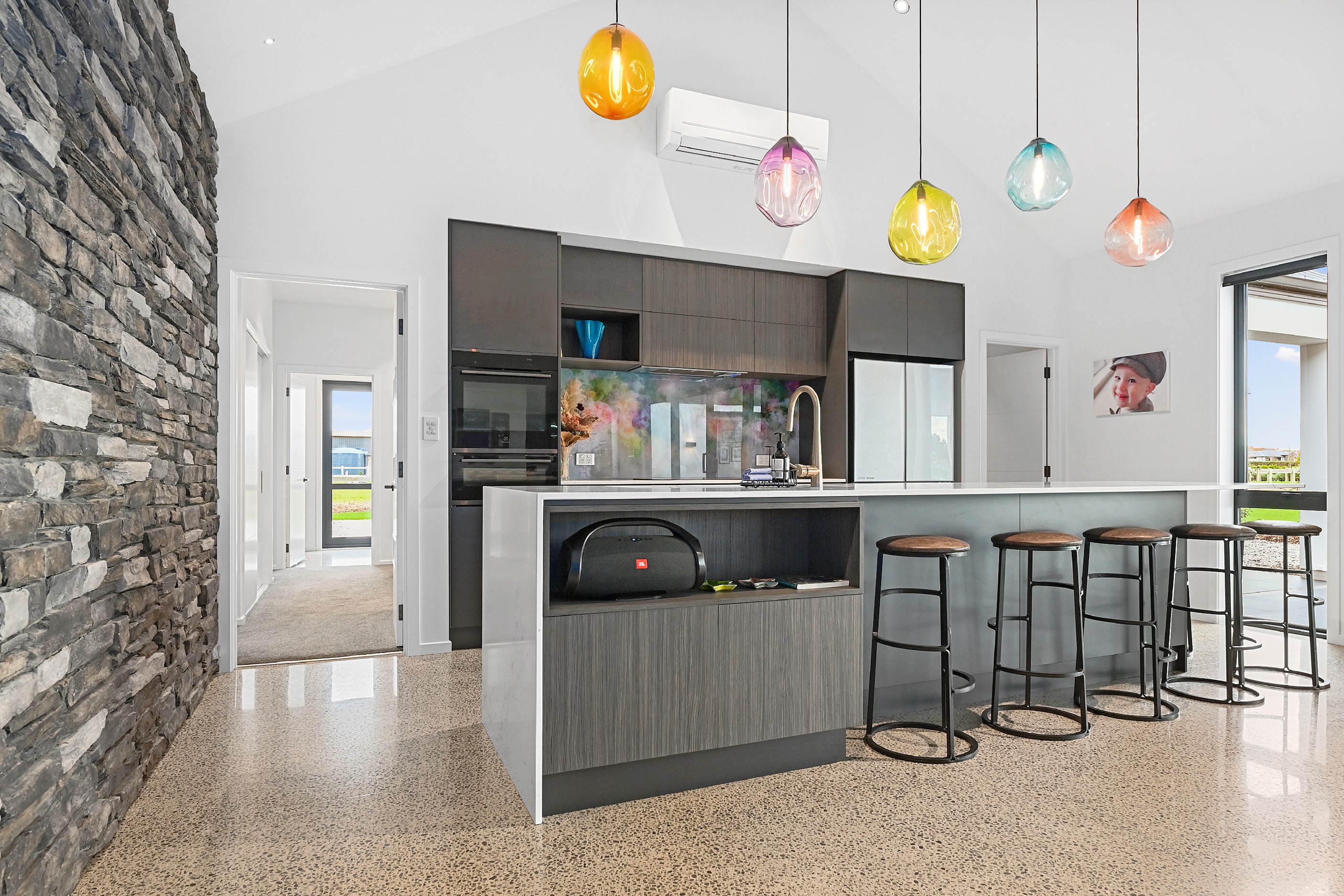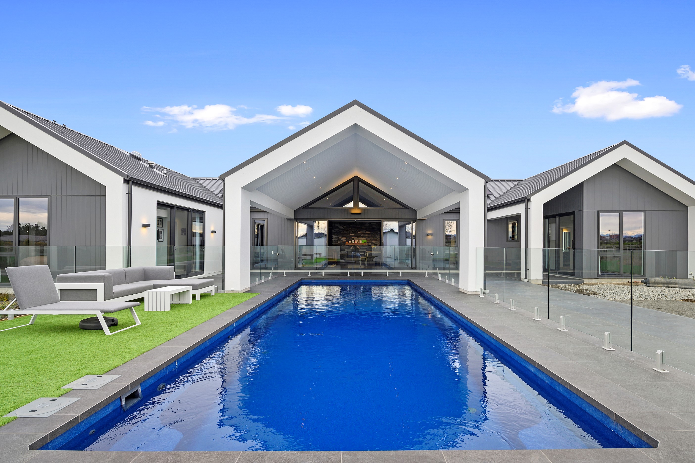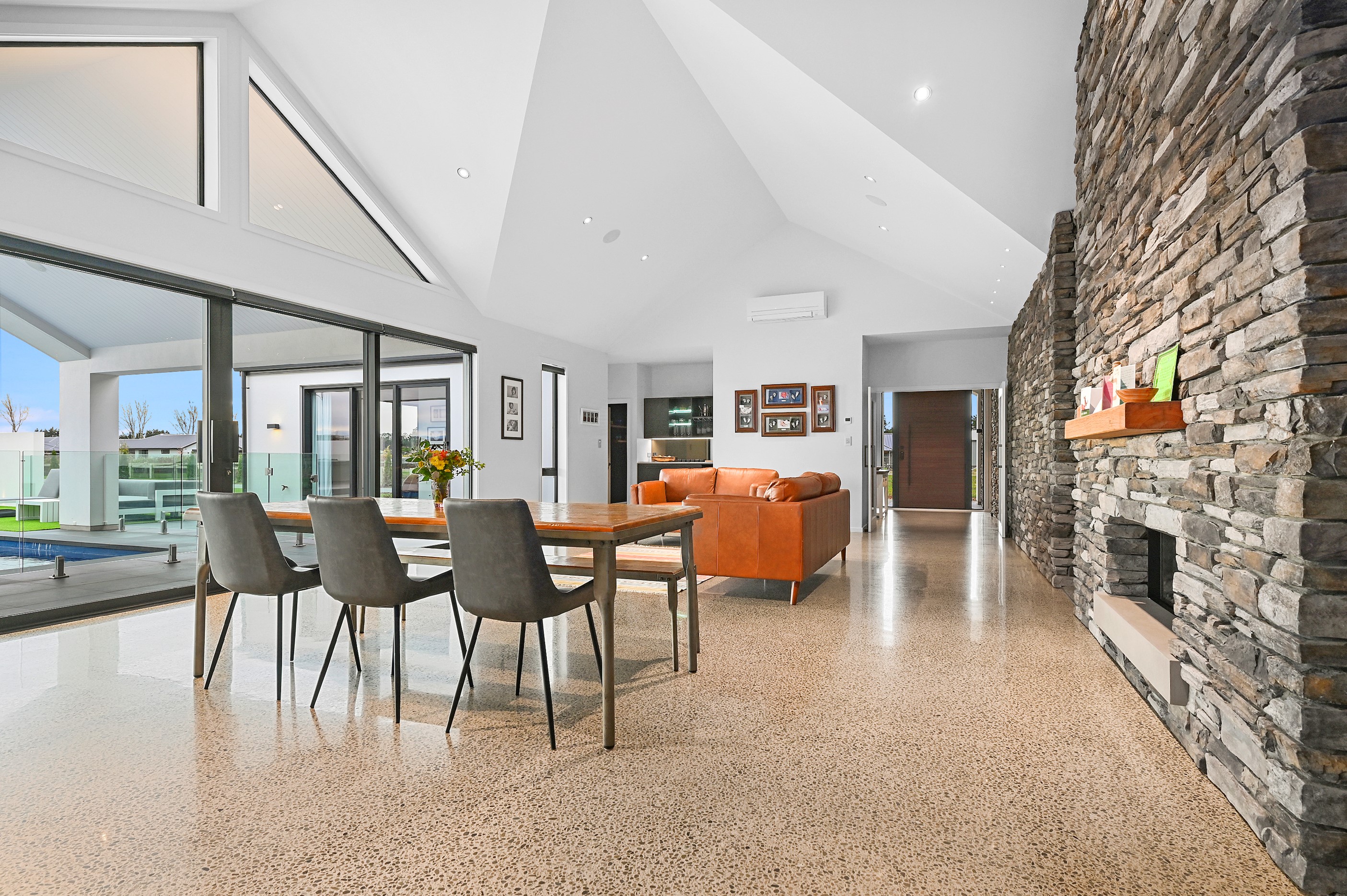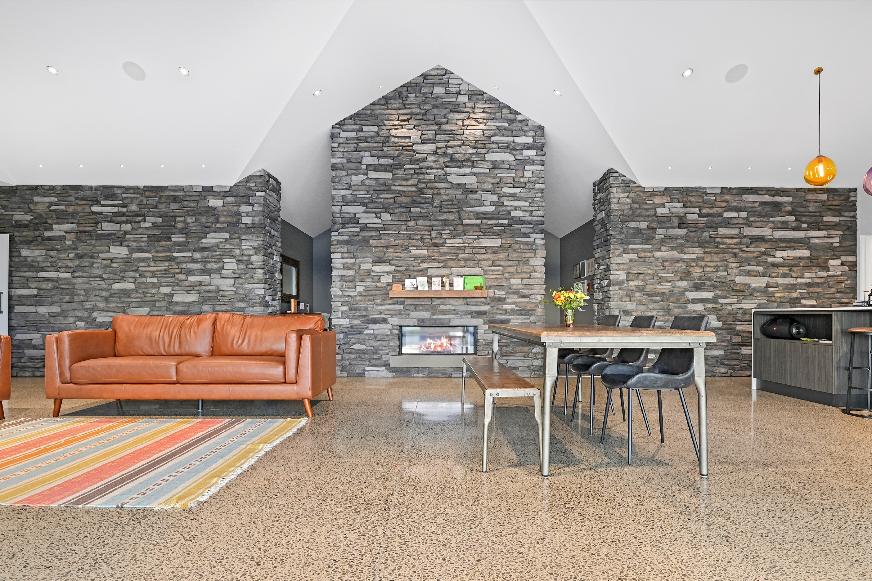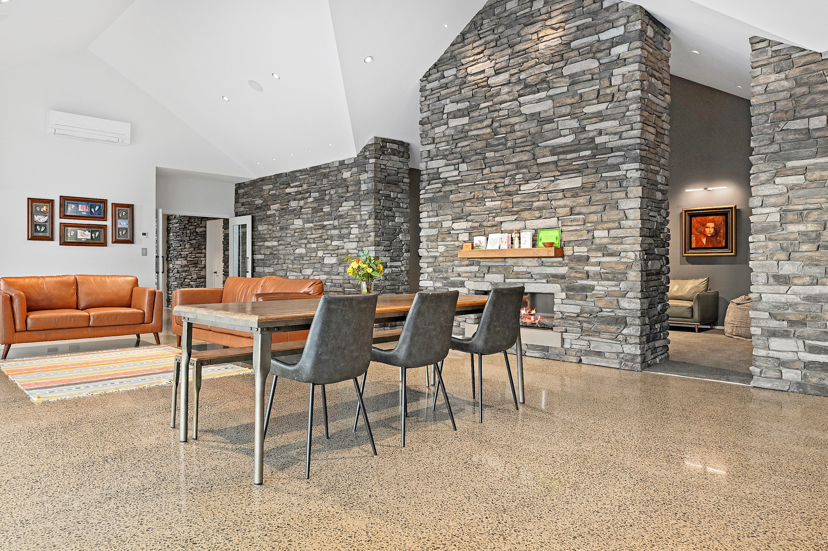On approach to this bespoke Canterbury home for Mum, Dad and their four boys, the stone veneer wall creates a dramatic entrance. Maintaining the sense of occasion, the towering 2400mm wood-grain plasma door opens up to the extensive interior. Grandeur continues with the stone wall leading to the huge pavilion-style main living area, where stonework rises more than four metres high to meet the ceiling. It wraps all sides of the wall, enclosing a central double-sided gas fire embellished with Cerano hearths and grey ironbark mantelpieces. All this aside, the statement piece is the vaulted ceiling, meeting at the axis of each gable– a complex feat and credit to the building team. Highly polished concrete floors reflect light in the living area, which opens onto an expansive outdoor area – the capacious swimming pool takes centre stage here. Every amenity has been included, with the 361sqm, five-bedroom home featuring a media room and a television room, two bathrooms, powder room and separate toilet. The garage is big enough for a gym. Entertaining has been well considered, with a spacious kitchen and a dedicated bar. For this family home, every possible luxury has been afforded.