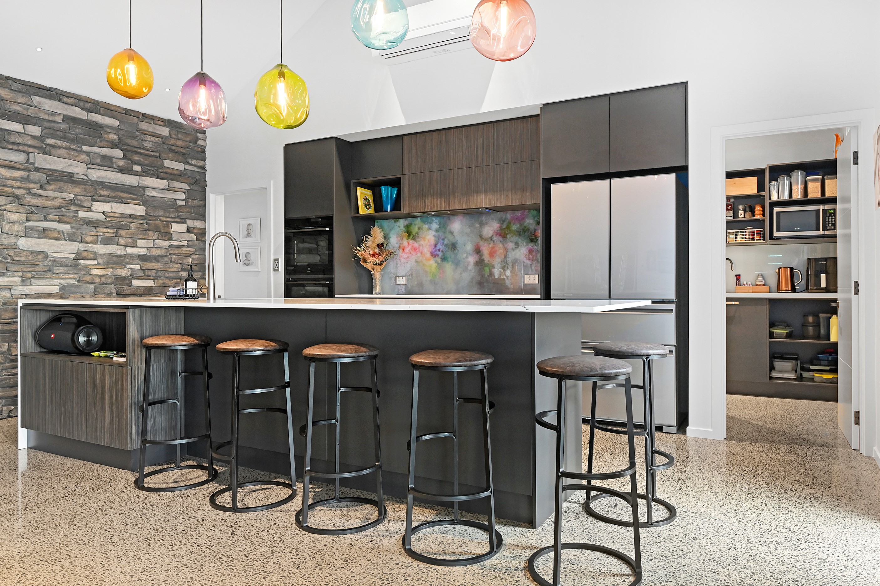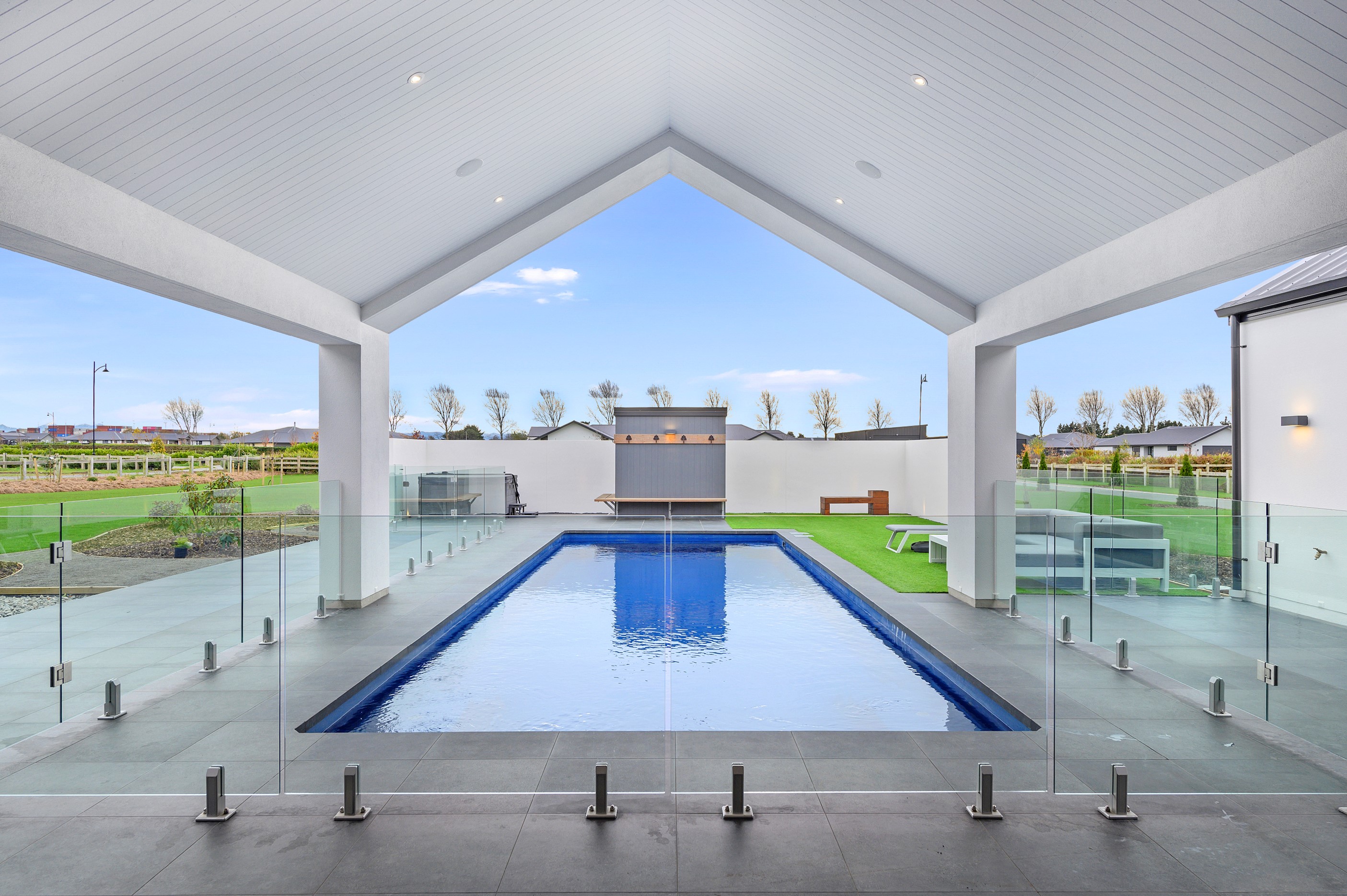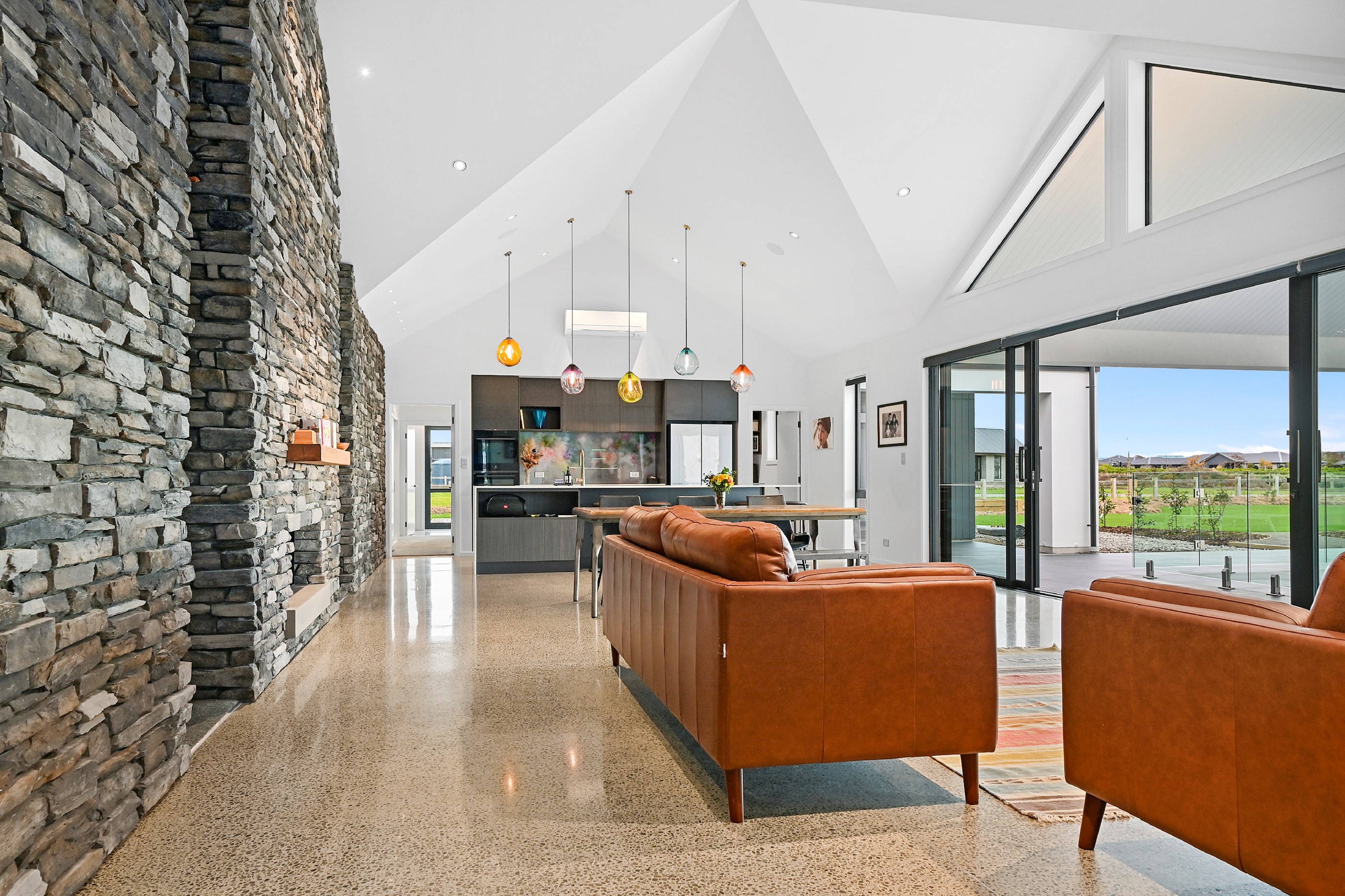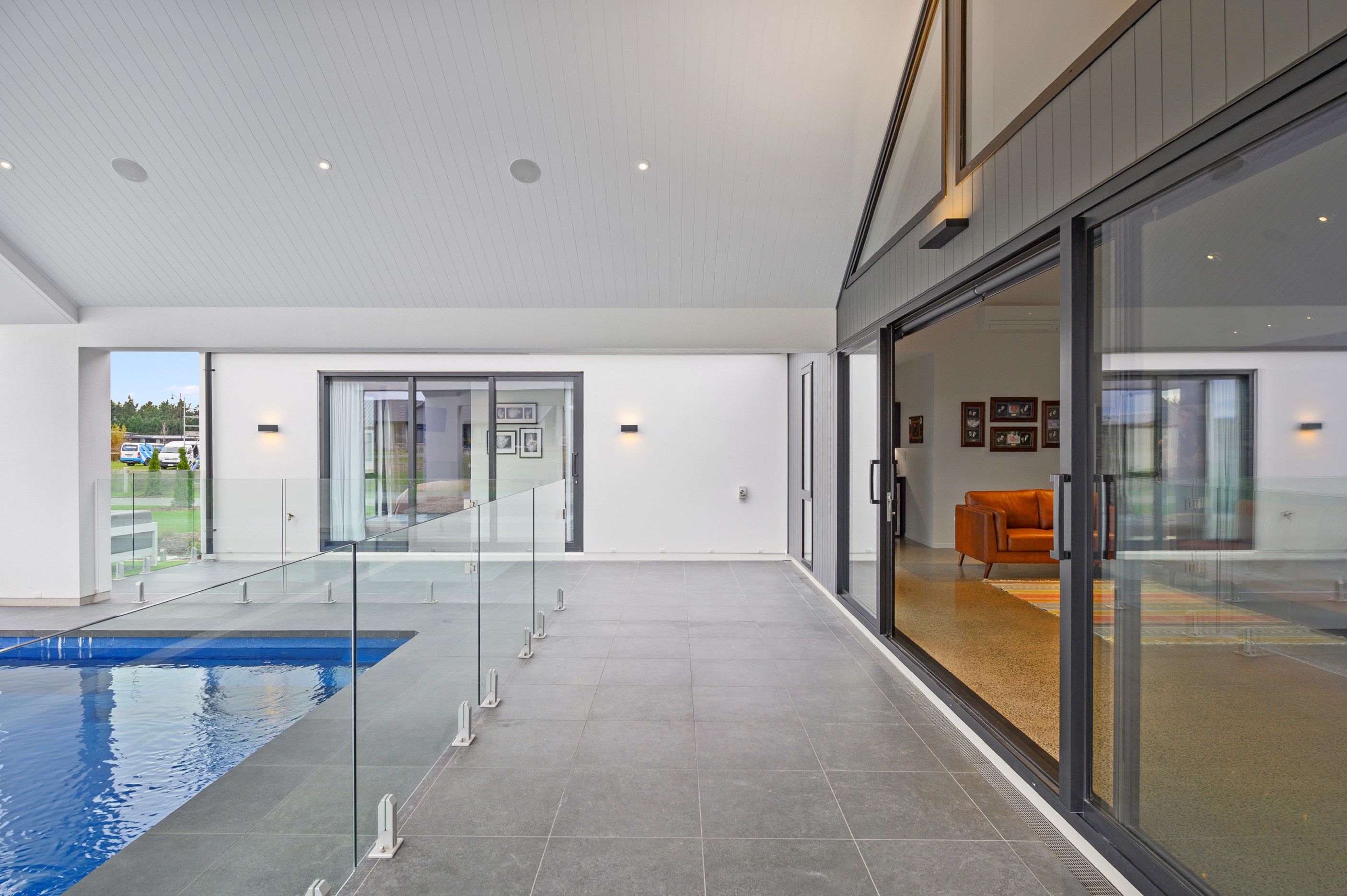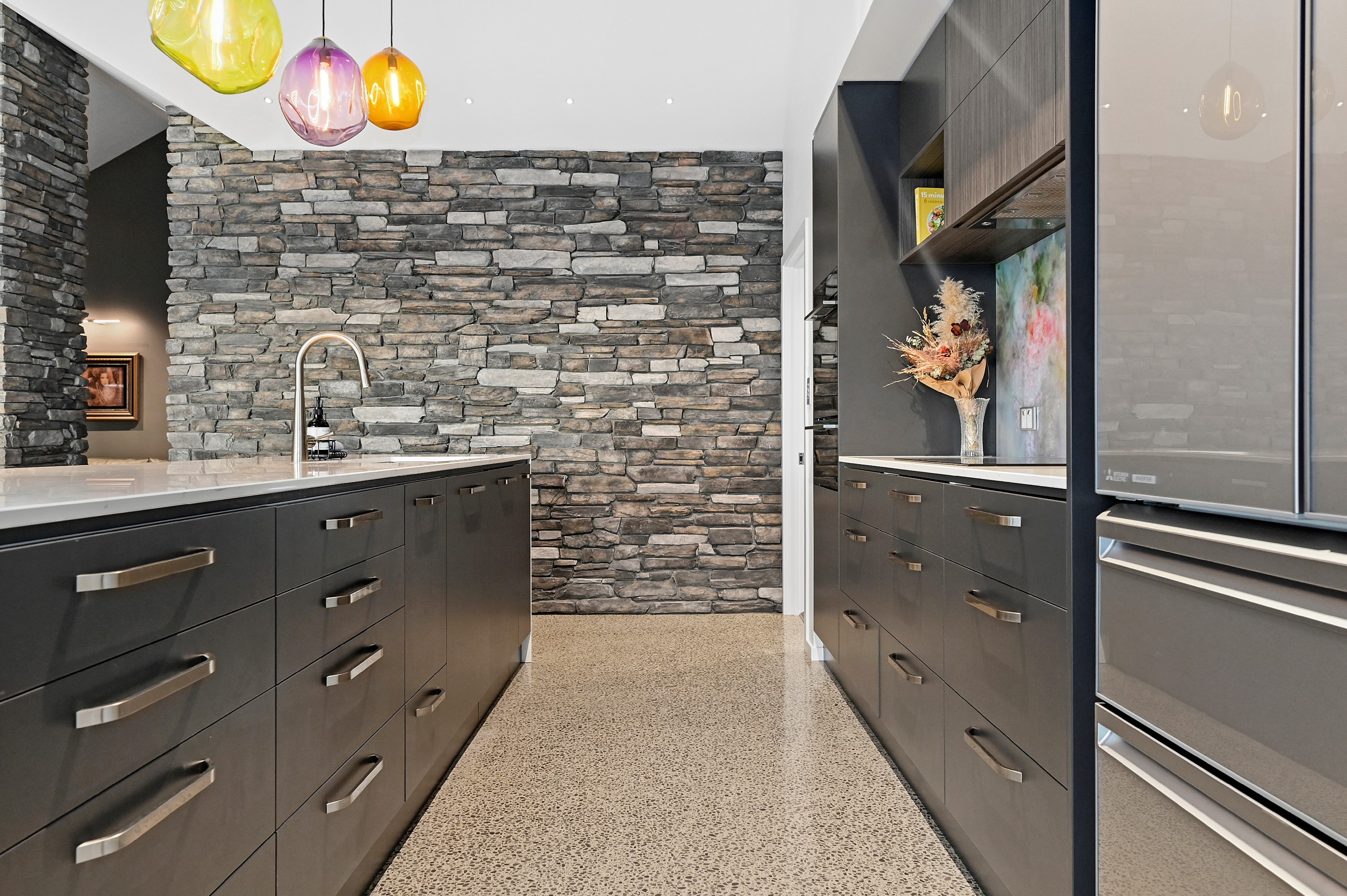 On approach to this bespoke Canterbury home for Mum, Dad and their four boys, the stone veneer wall creates a dramatic entrance. Maintaining the sense of occasion, the towering 2400mm wood-grain plasma door opens up to the extensive interior. Grandeur continues with the stone wall leading to the huge pavilion-style main living area, where stonework rises more than four metres high to meet the ceiling. It wraps all sides of the wall, enclosing a central double-sided gas fire embellished with Cerano hearths and grey ironbark mantelpieces. All this aside, the statement piece is the vaulted ceiling, meeting at the axis of each gable– a complex feat and credit to the building team. Highly polished concrete floors reflect light in the living area, which opens onto an expansive outdoor area – the capacious swimming pool takes centre stage here. Every amenity has been included, with the 361sqm, five-bedroom home featuring a media room and a television room, two bathrooms, powder room and separate toilet. The garage is big enough for a gym. Entertaining has been well considered, with a spacious kitchen and a dedicated bar. For this family home, every possible luxury has been afforded.