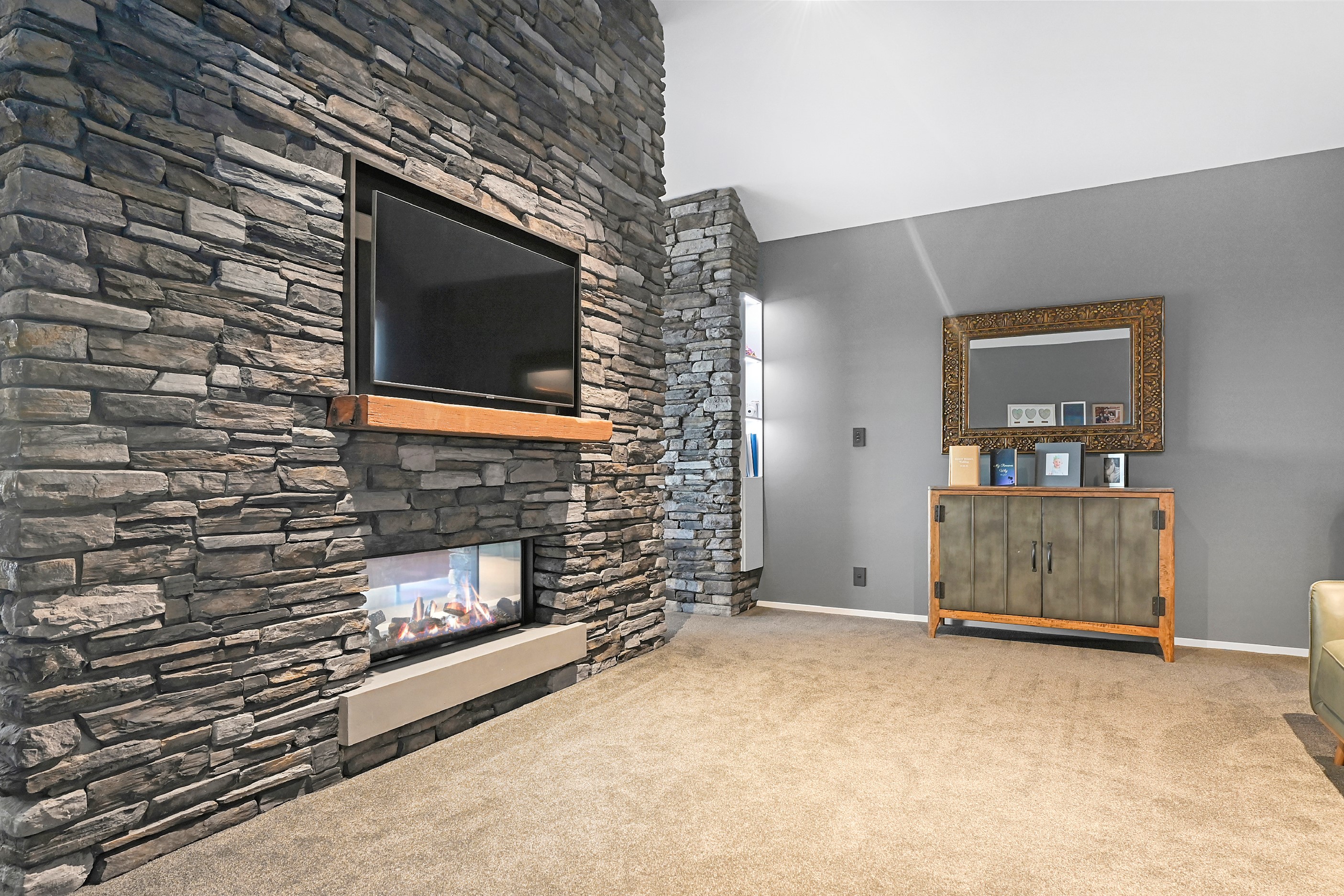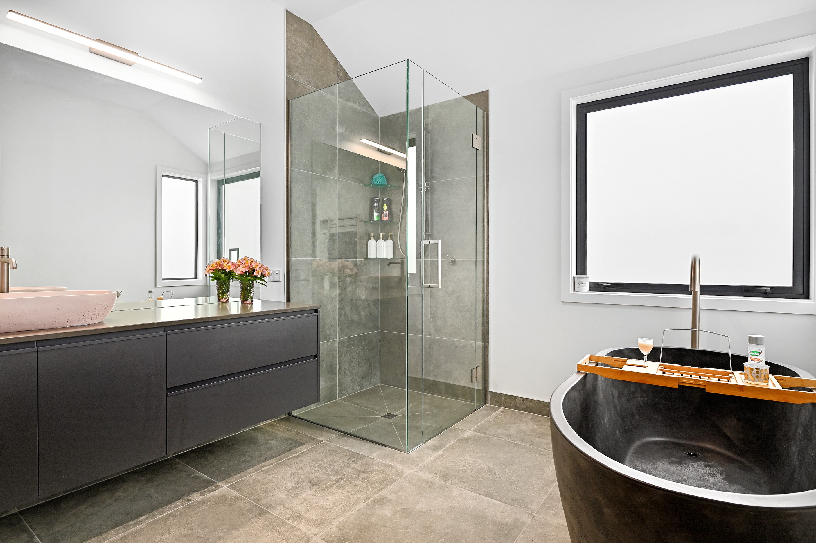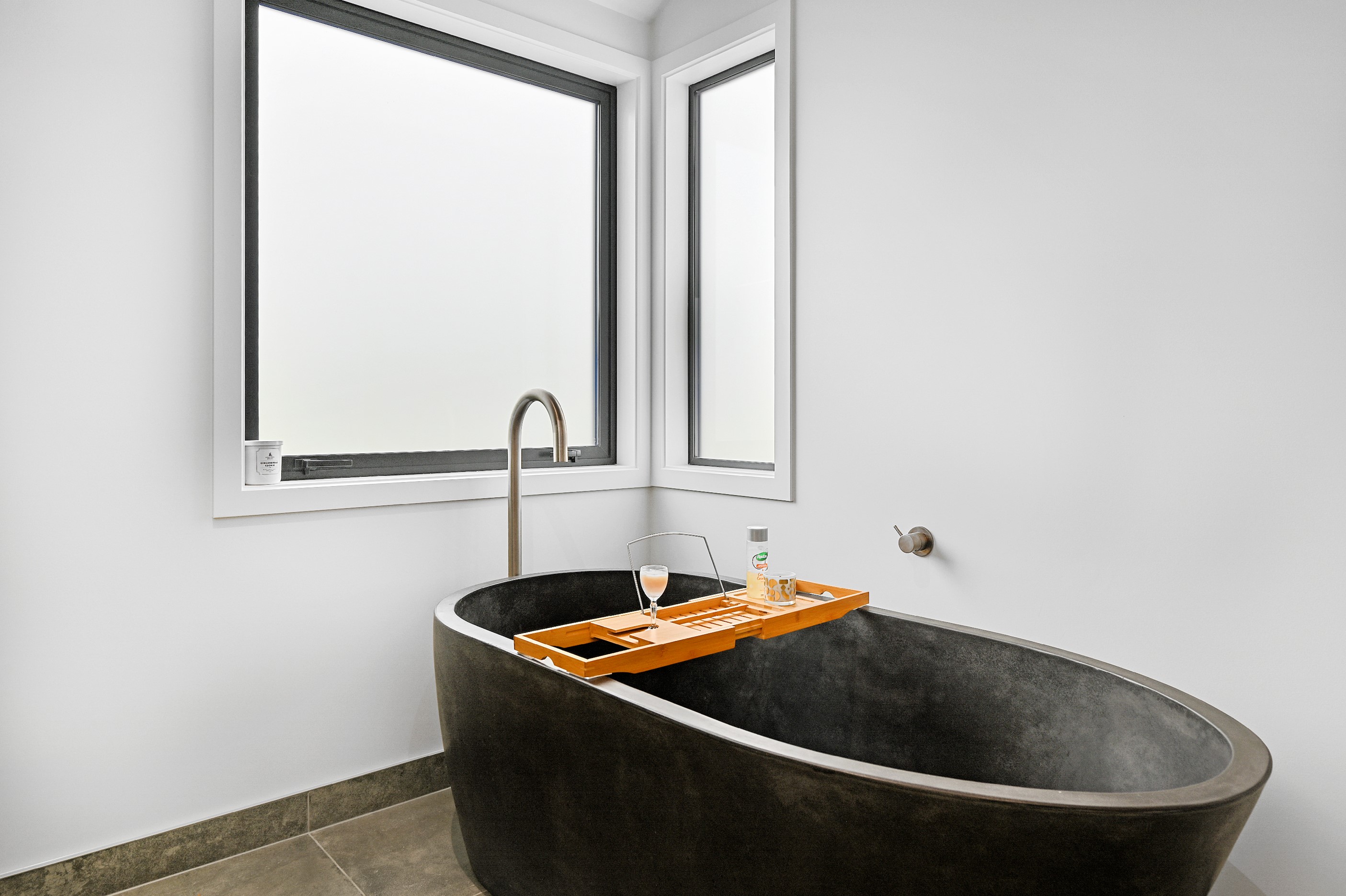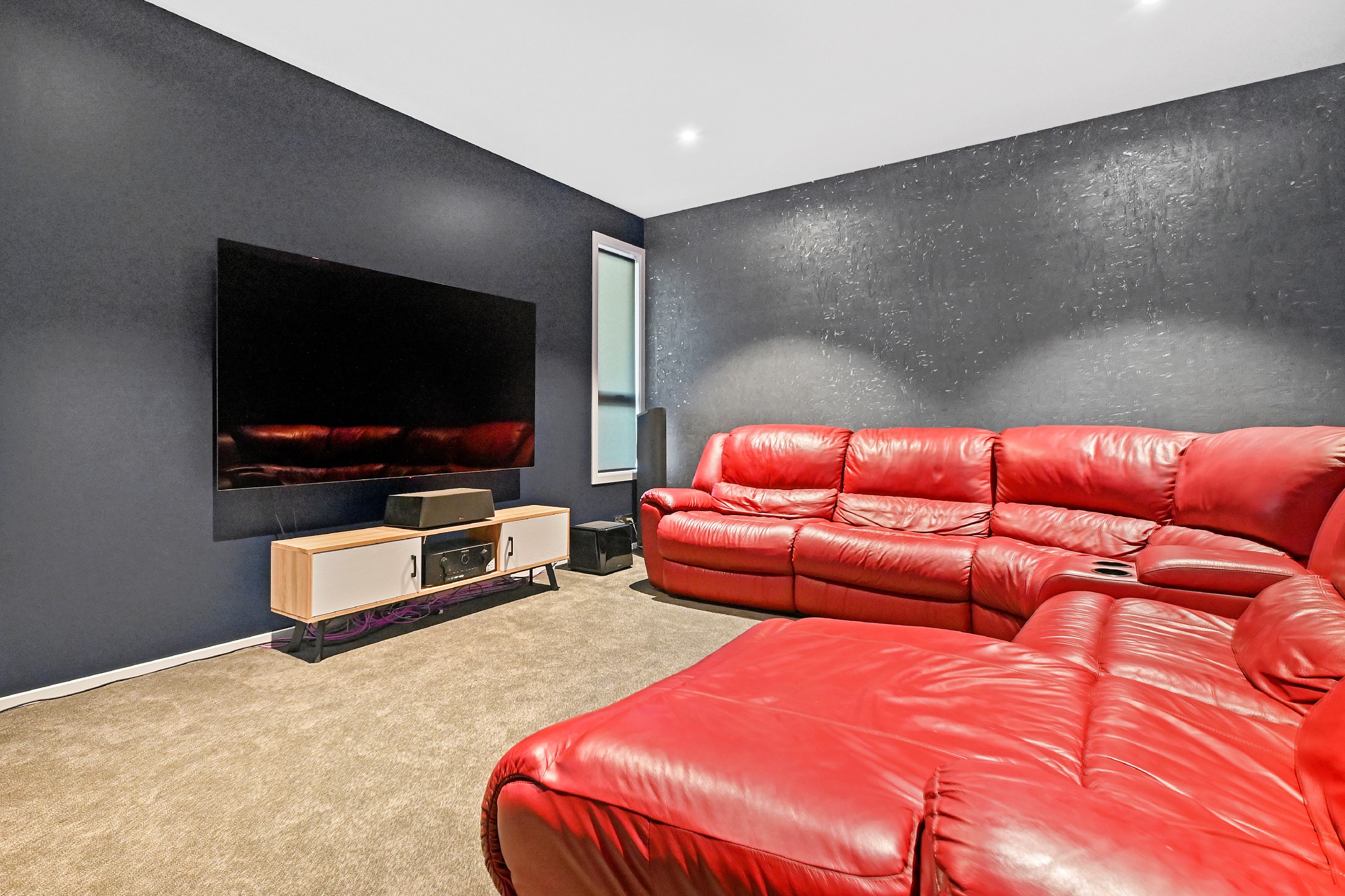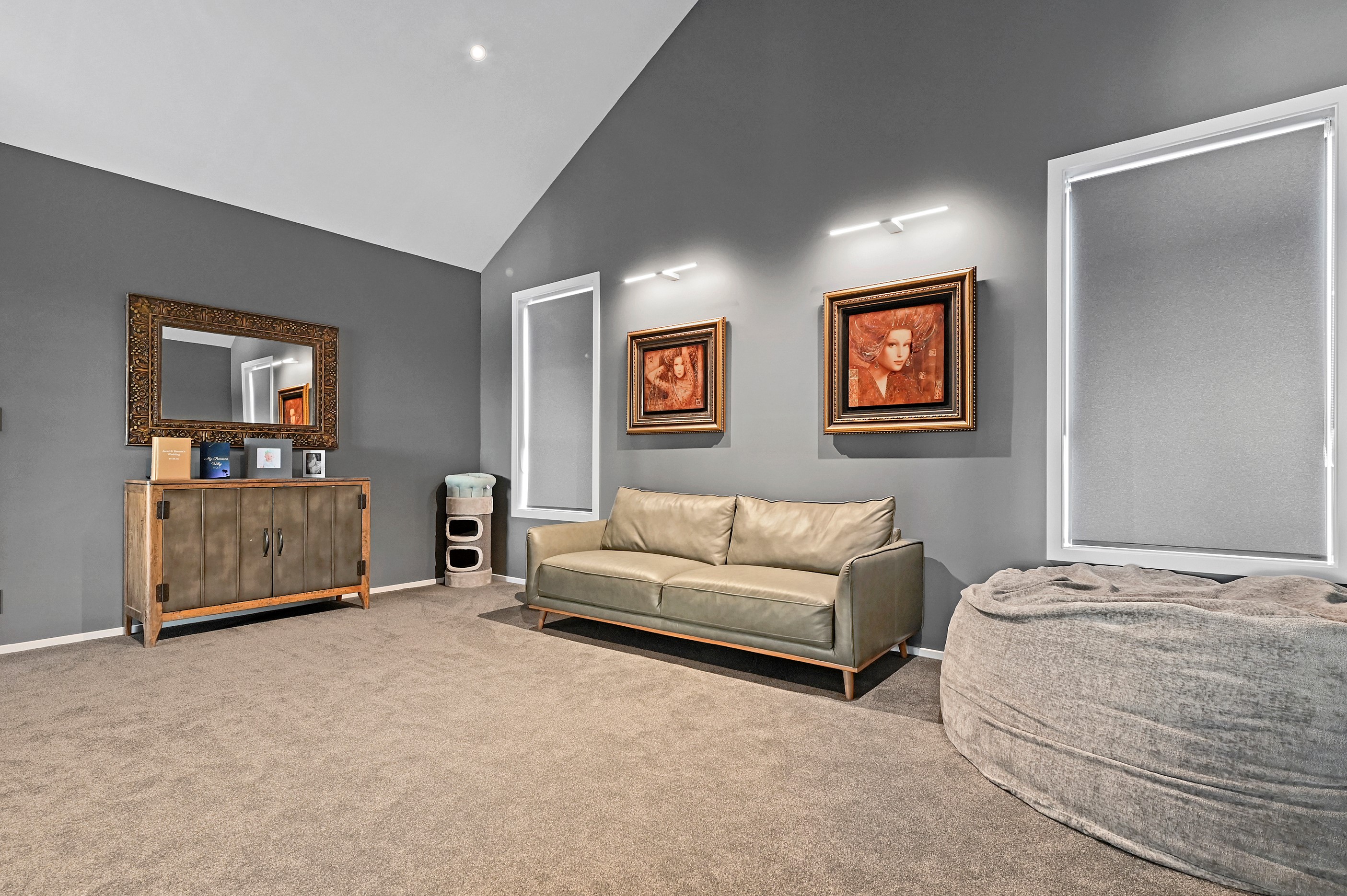 On approach to this bespoke Canterbury home for Mum, Dad and their four boys, the stone veneer wall creates a dramatic entrance. Maintaining the sense of occasion, the towering 2400mm wood-grain plasma door opens up to the extensive interior. Grandeur continues with the stone wall leading to the huge pavilion-style main living area, where stonework rises more than four metres high to meet the ceiling. It wraps all sides of the wall, enclosing a central double-sided gas fire embellished with Cerano hearths and grey ironbark mantelpieces. All this aside, the statement piece is the vaulted ceiling, meeting at the axis of each gable– a complex feat and credit to the building team. Highly polished concrete floors reflect light in the living area, which opens onto an expansive outdoor area – the capacious swimming pool takes centre stage here. Every amenity has been included, with the 361sqm, five-bedroom home featuring a media room and a television room, two bathrooms, powder room and separate toilet. The garage is big enough for a gym. Entertaining has been well considered, with a spacious kitchen and a dedicated bar. For this family home, every possible luxury has been afforded.