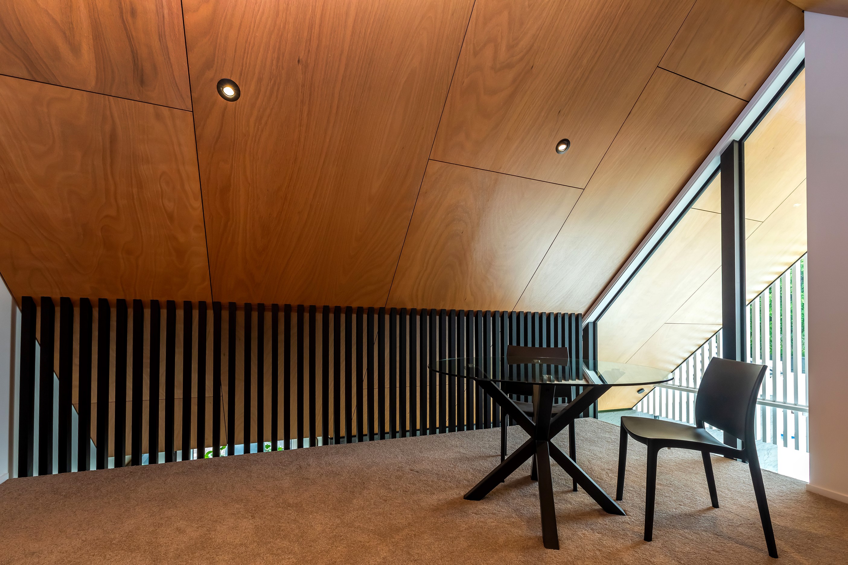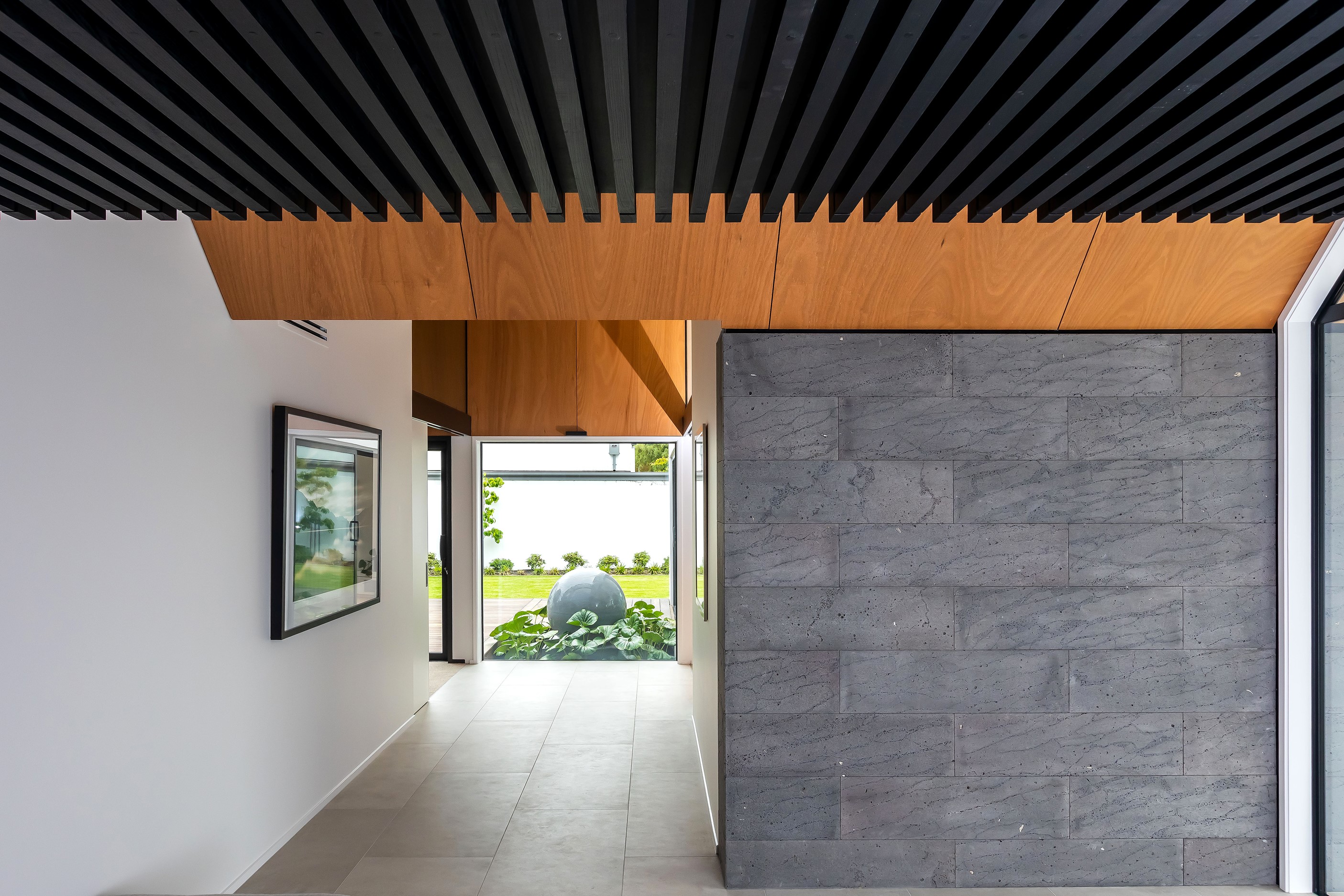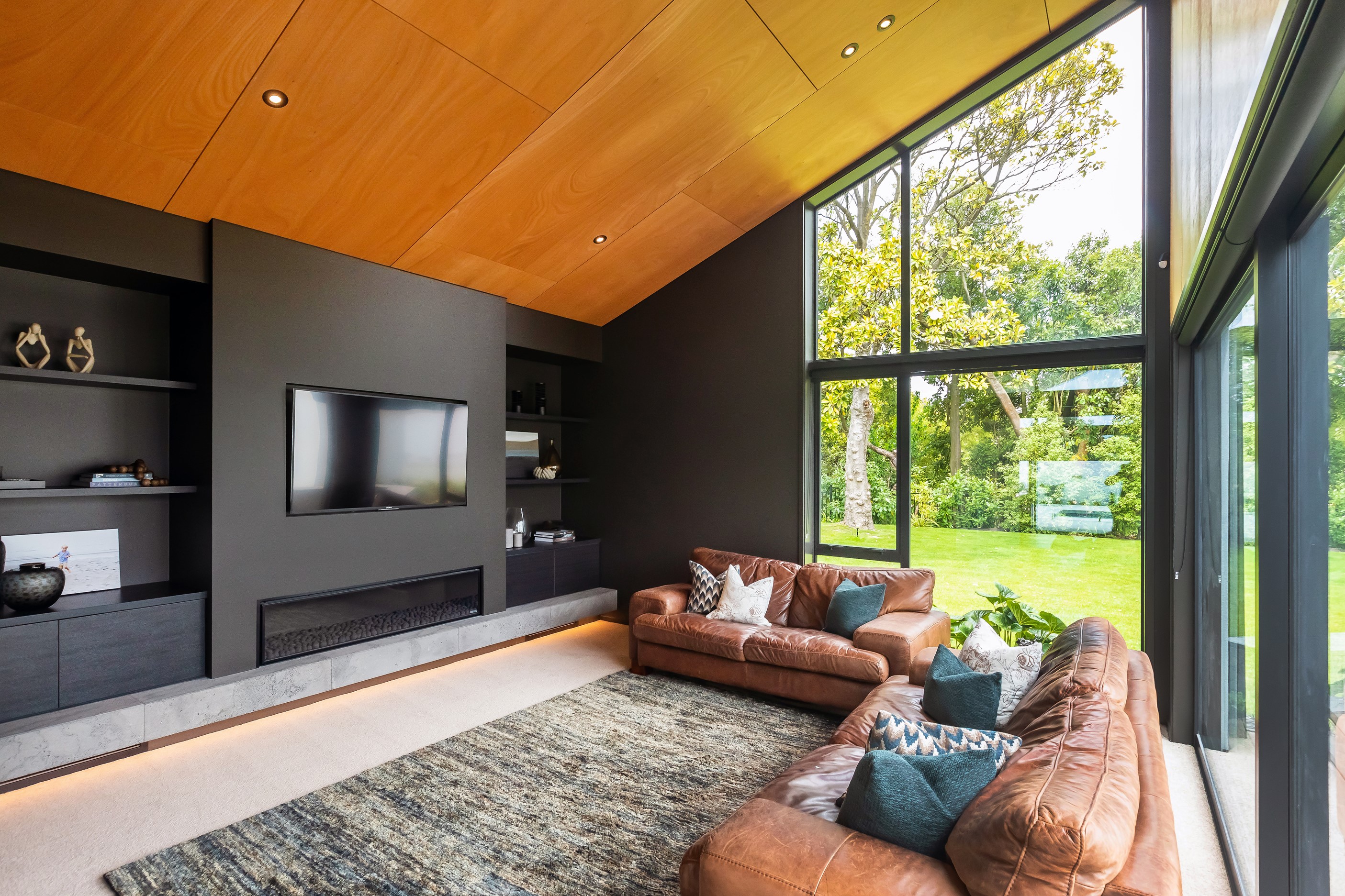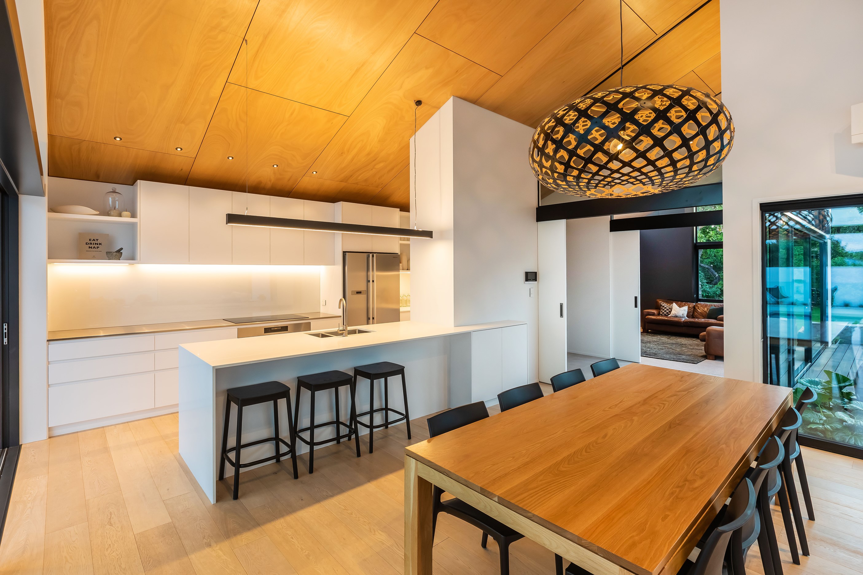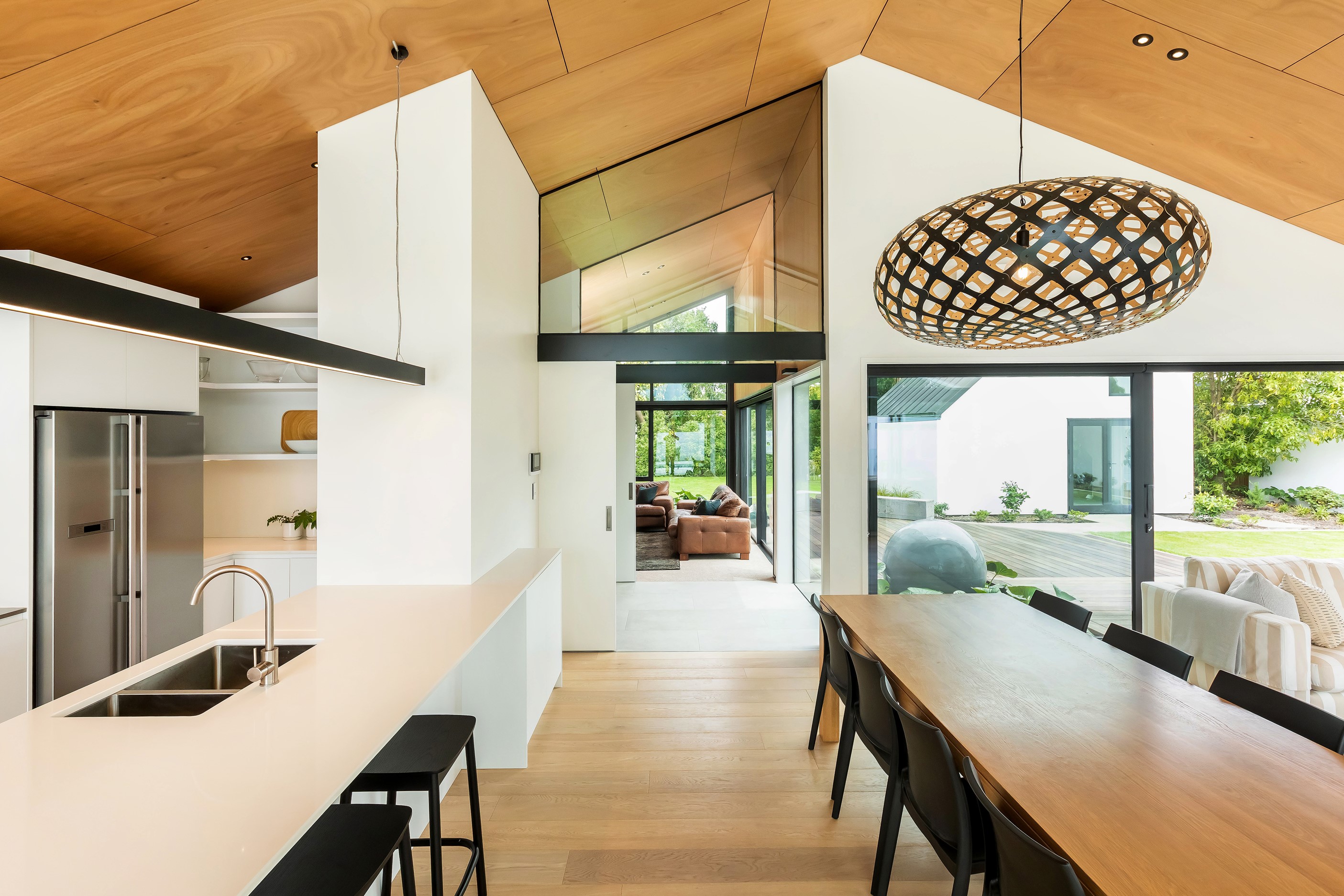 The contemporary lines of this impeccably built residence belie its past. In crafting a home for his family, the owner-builder’s starting point was an earthquake-damaged dwelling that needed demolishing. But with some foundations still sound, the decision was made to “respect the old and showcase the new”. The rear of the house and garage retained solid foundations, so the architect incorporated their existing rooflines and designed the main house around them. With this sensitive approach came challenges – not that you’d know it, this beautiful home successfully blends the past with the present. What it also does is blur the lines between inside and out, which seemingly expands the 246sqm footprint. Towering windows and vast sliding doors give direct access to sky views, mature trees and landscaping. Wood panelling on the gabled ceiling is another nod to nature. Other favourite features of the four-bedroom home are the Timaru bluestone wall at the entrance and black oak batten screens that highlight the staircase. With solar panels, double-glazing, thermally broken joinery and hydronic underfloor heating, every detail has been carefully considered and accounted for.