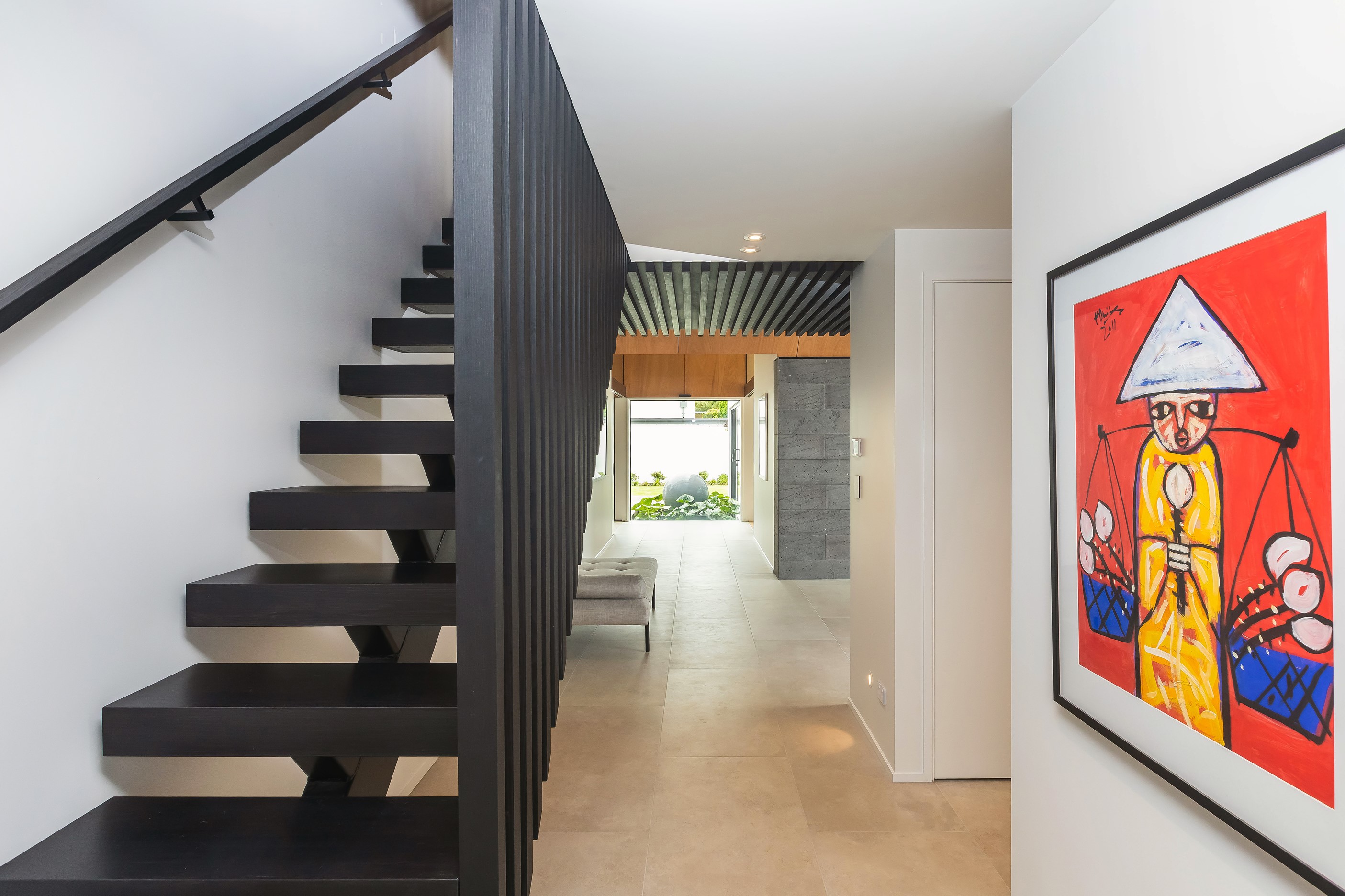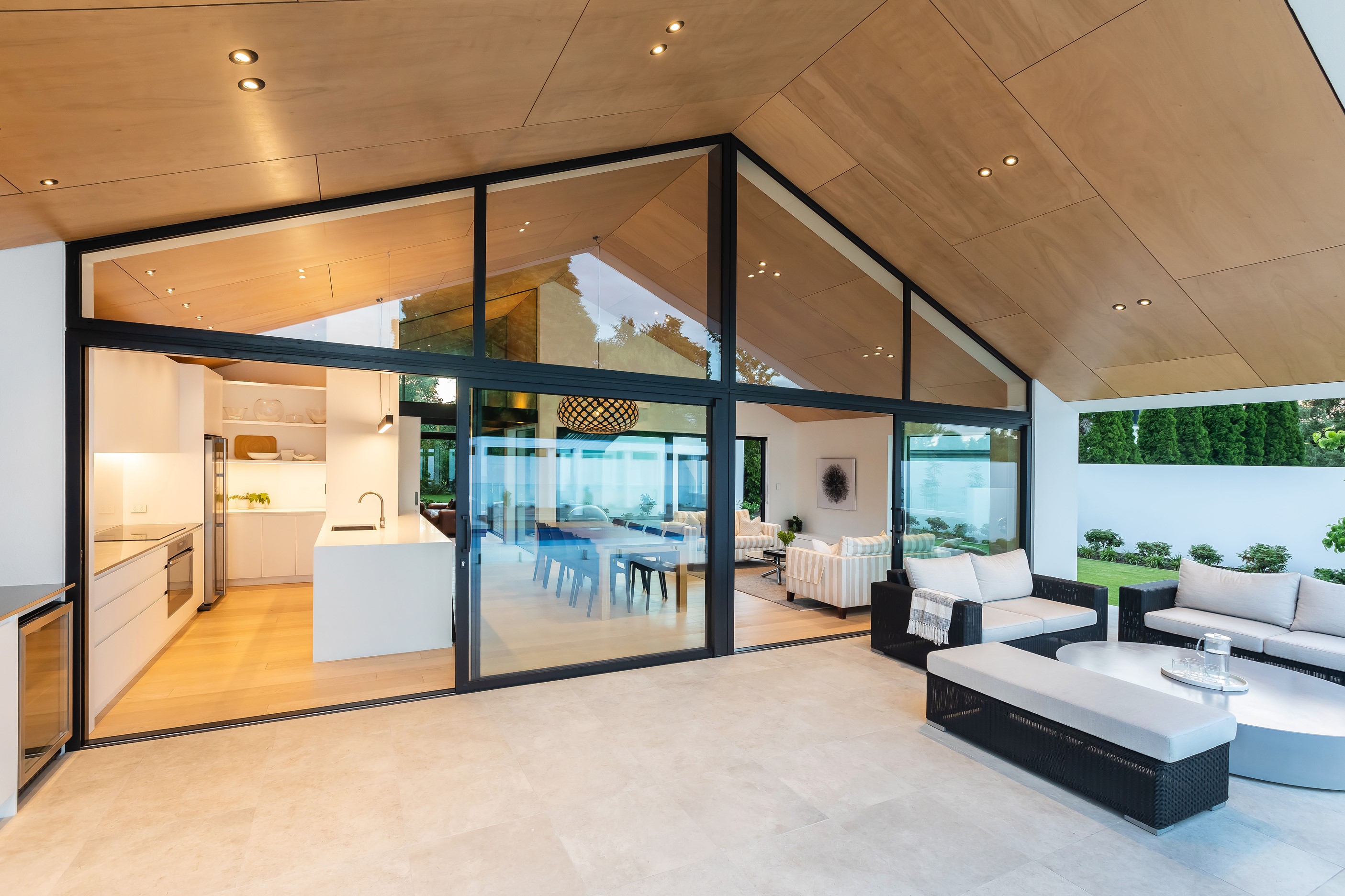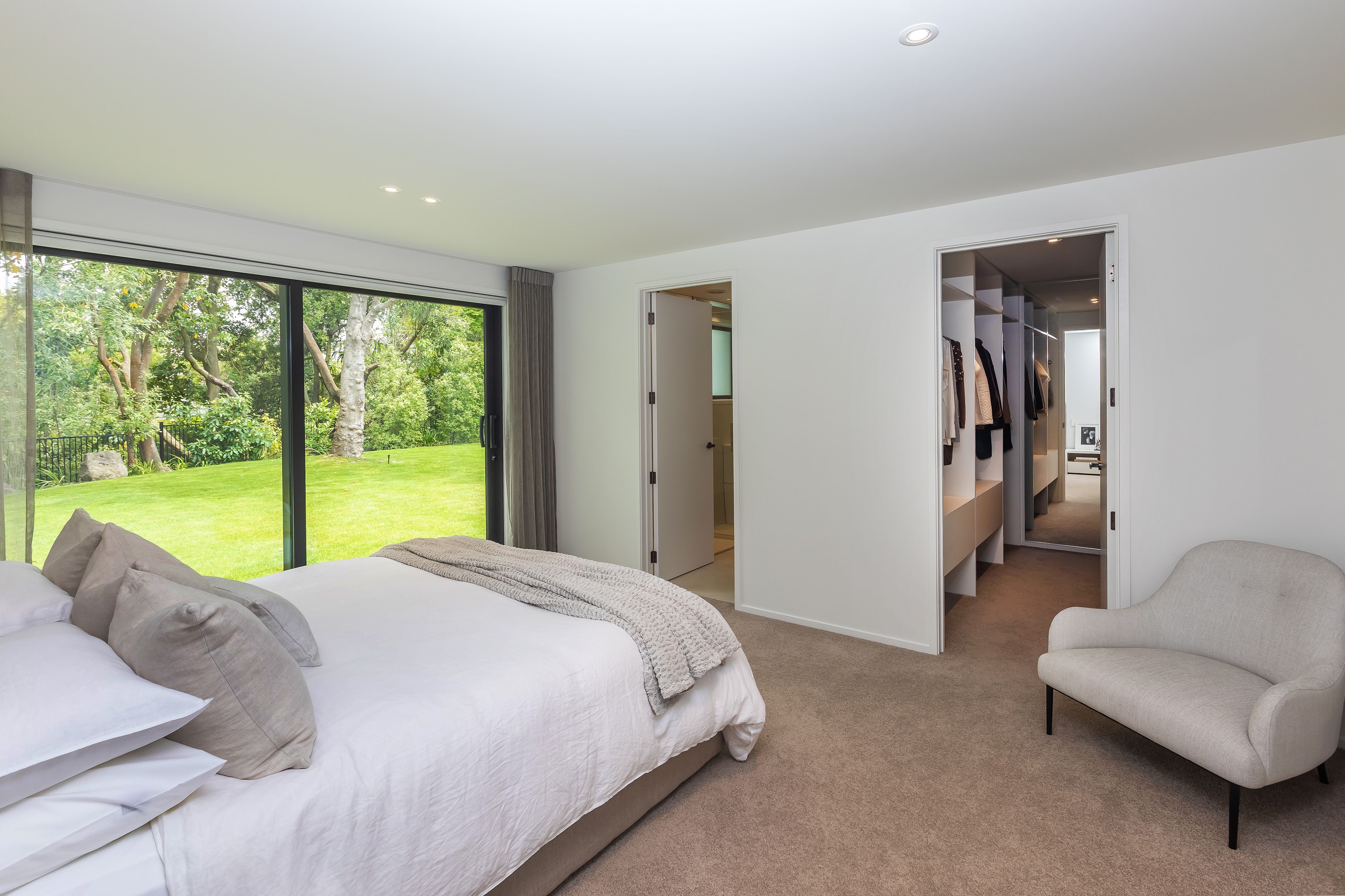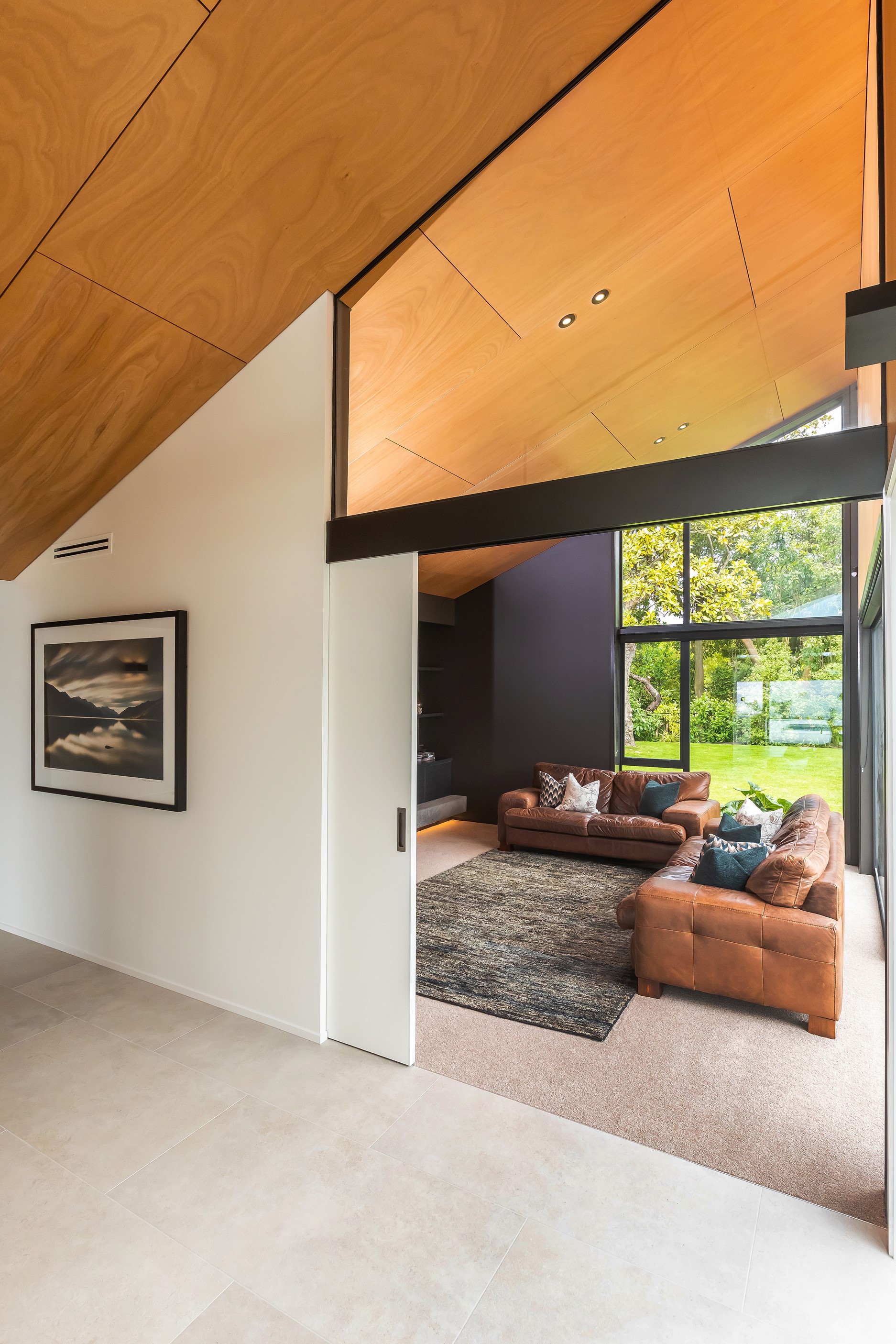 The contemporary lines of this impeccably built residence belie its past. In crafting a home for his family, the owner-builder’s starting point was an earthquake-damaged dwelling that needed demolishing. But with some foundations still sound, the decision was made to “respect the old and showcase the new”. The rear of the house and garage retained solid foundations, so the architect incorporated their existing rooflines and designed the main house around them. With this sensitive approach came challenges – not that you’d know it, this beautiful home successfully blends the past with the present. What it also does is blur the lines between inside and out, which seemingly expands the 246sqm footprint. Towering windows and vast sliding doors give direct access to sky views, mature trees and landscaping. Wood panelling on the gabled ceiling is another nod to nature. Other favourite features of the four-bedroom home are the Timaru bluestone wall at the entrance and black oak batten screens that highlight the staircase. With solar panels, double-glazing, thermally broken joinery and hydronic underfloor heating, every detail has been carefully considered and accounted for.