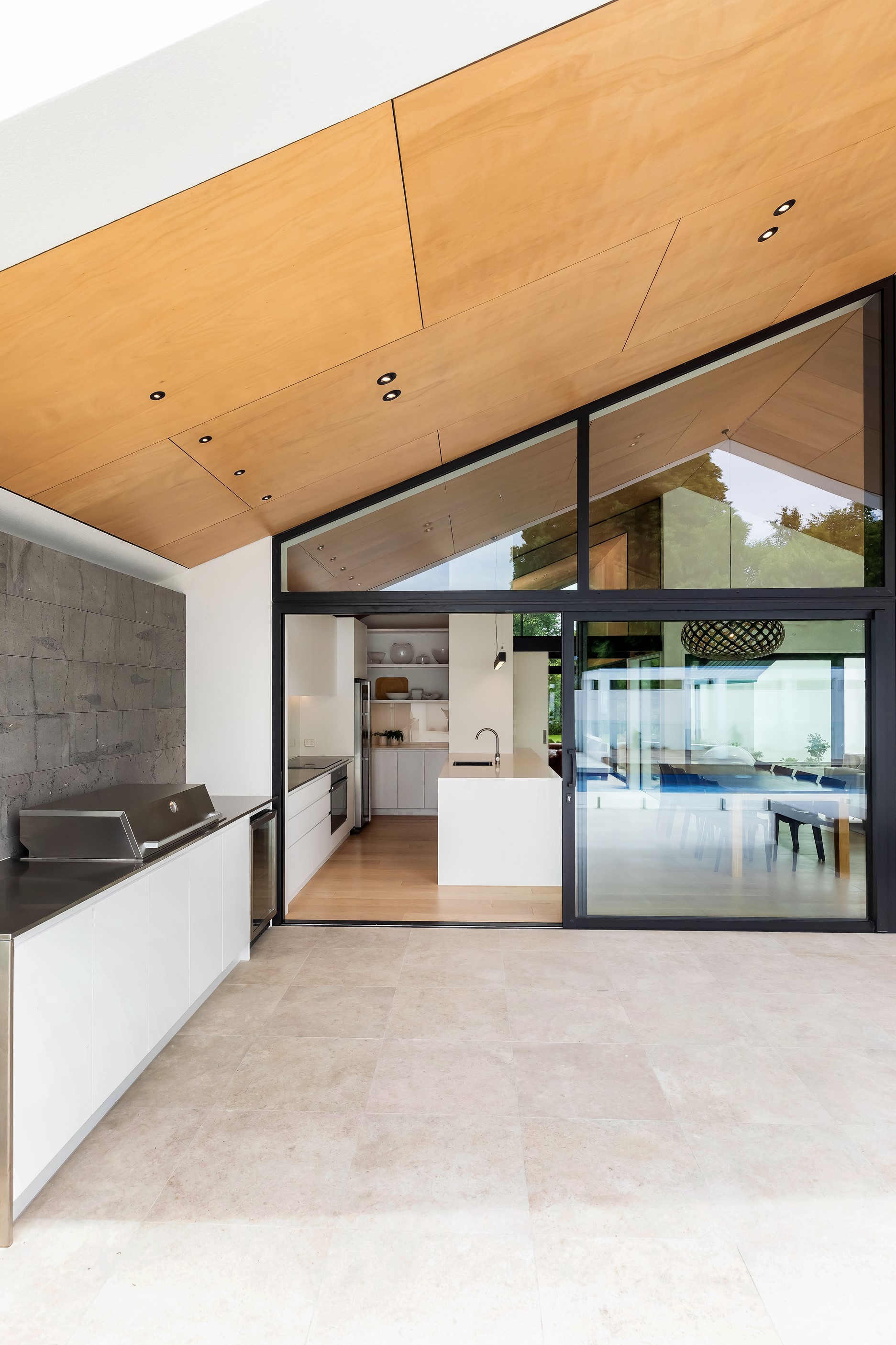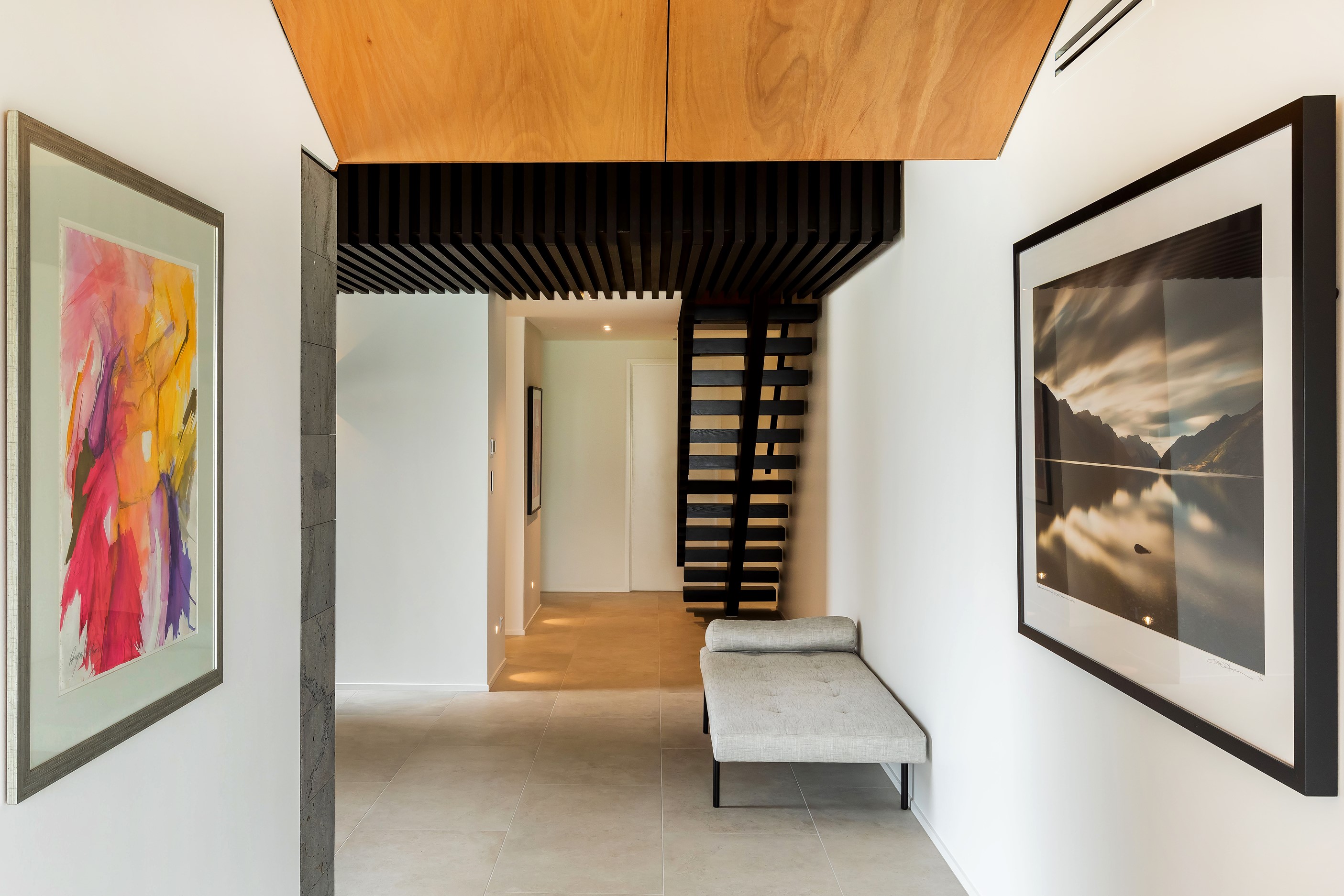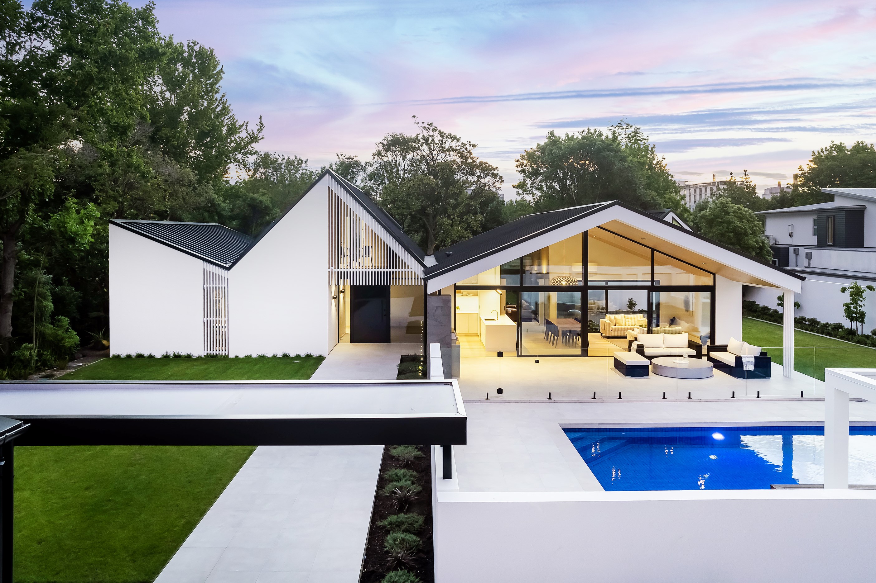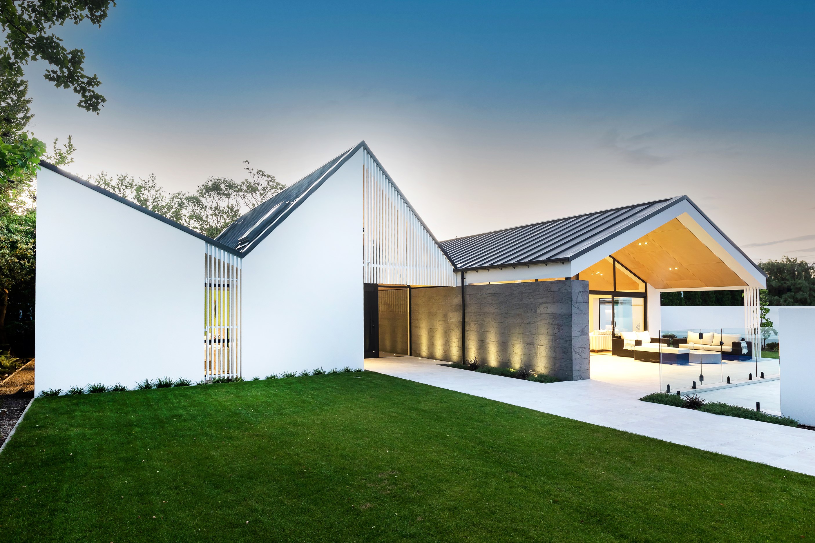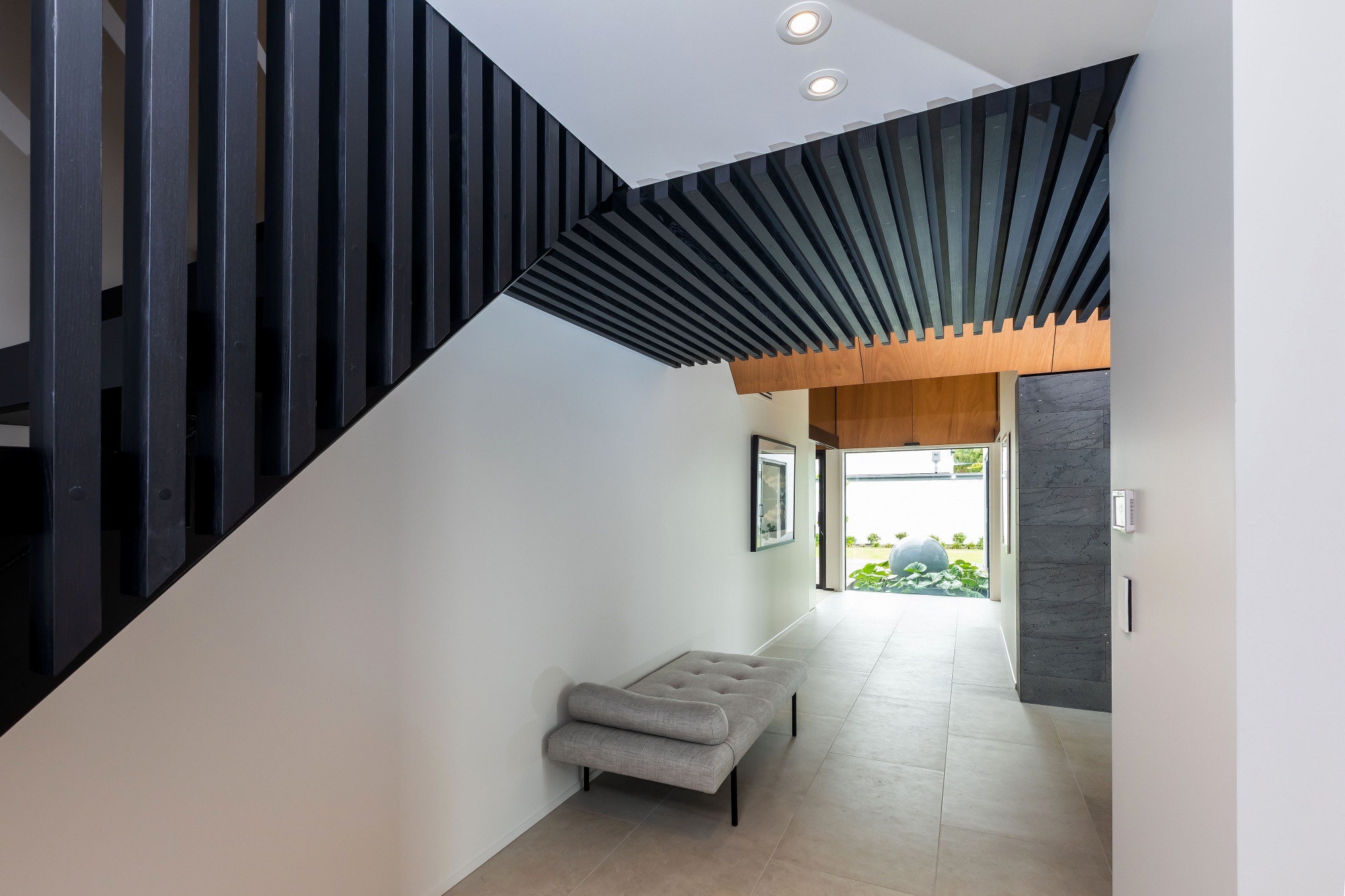 The contemporary lines of this impeccably built residence belie its past. In crafting a home for his family, the owner-builder’s starting point was an earthquake-damaged dwelling that needed demolishing. But with some foundations still sound, the decision was made to “respect the old and showcase the new”. The rear of the house and garage retained solid foundations, so the architect incorporated their existing rooflines and designed the main house around them. With this sensitive approach came challenges – not that you’d know it, this beautiful home successfully blends the past with the present. What it also does is blur the lines between inside and out, which seemingly expands the 246sqm footprint. Towering windows and vast sliding doors give direct access to sky views, mature trees and landscaping. Wood panelling on the gabled ceiling is another nod to nature. Other favourite features of the four-bedroom home are the Timaru bluestone wall at the entrance and black oak batten screens that highlight the staircase. With solar panels, double-glazing, thermally broken joinery and hydronic underfloor heating, every detail has been carefully considered and accounted for.