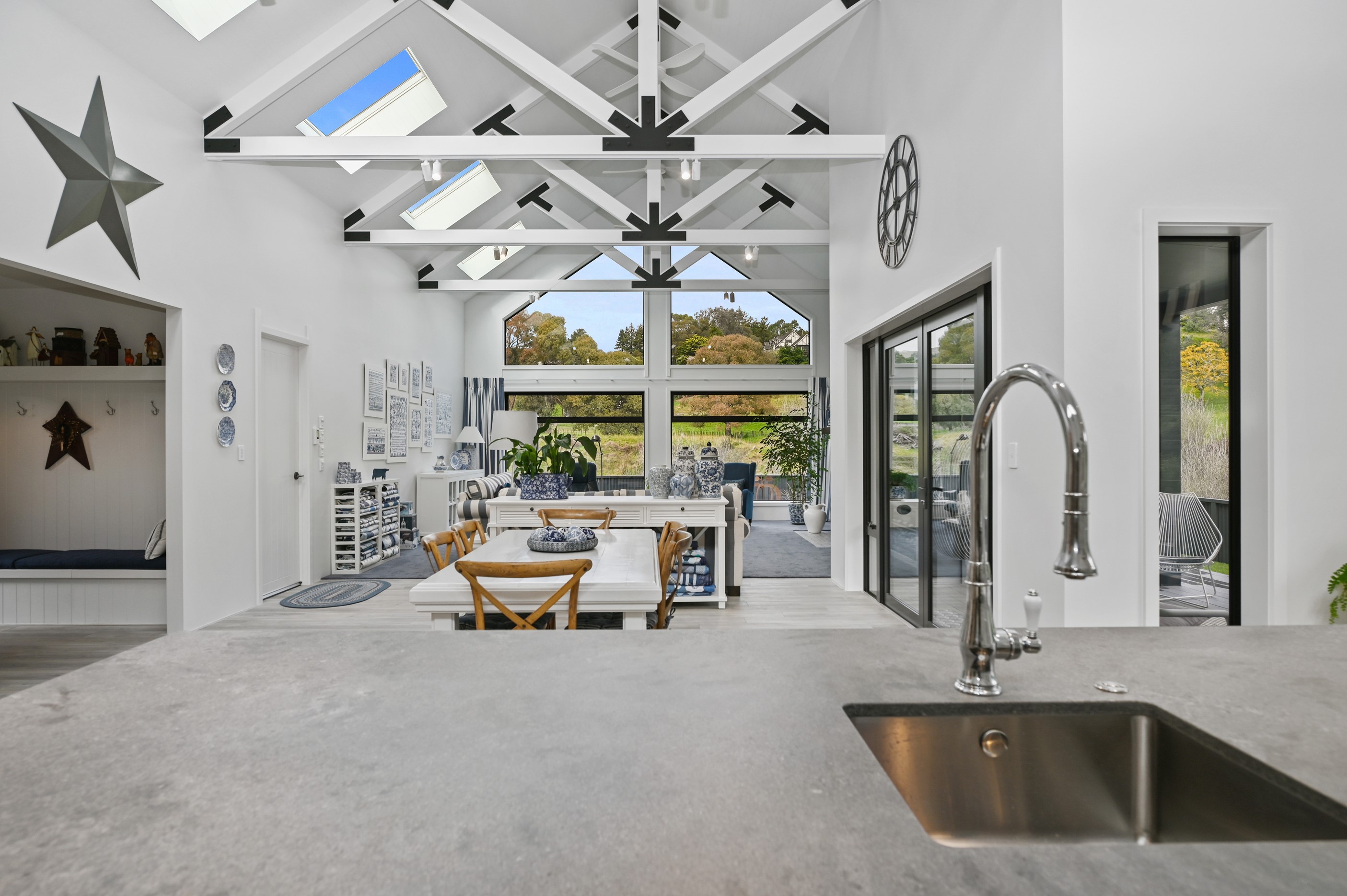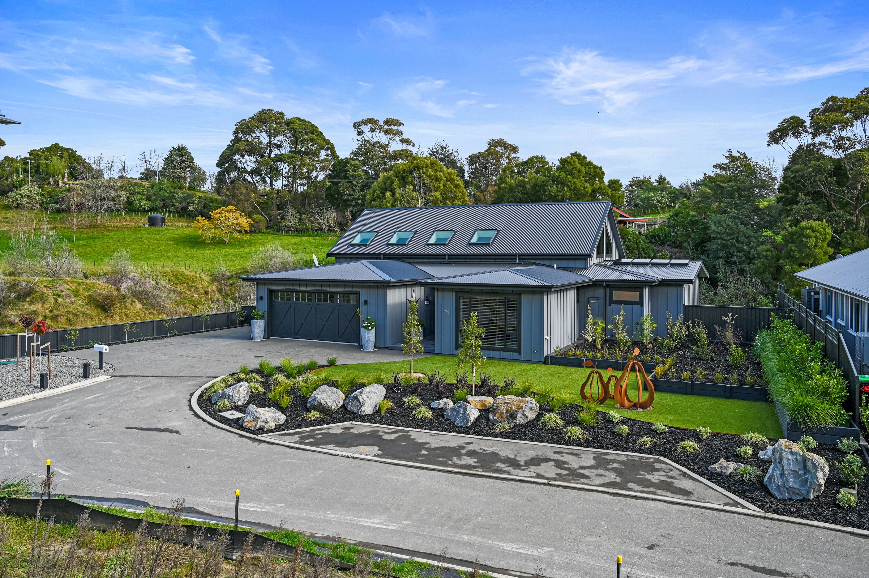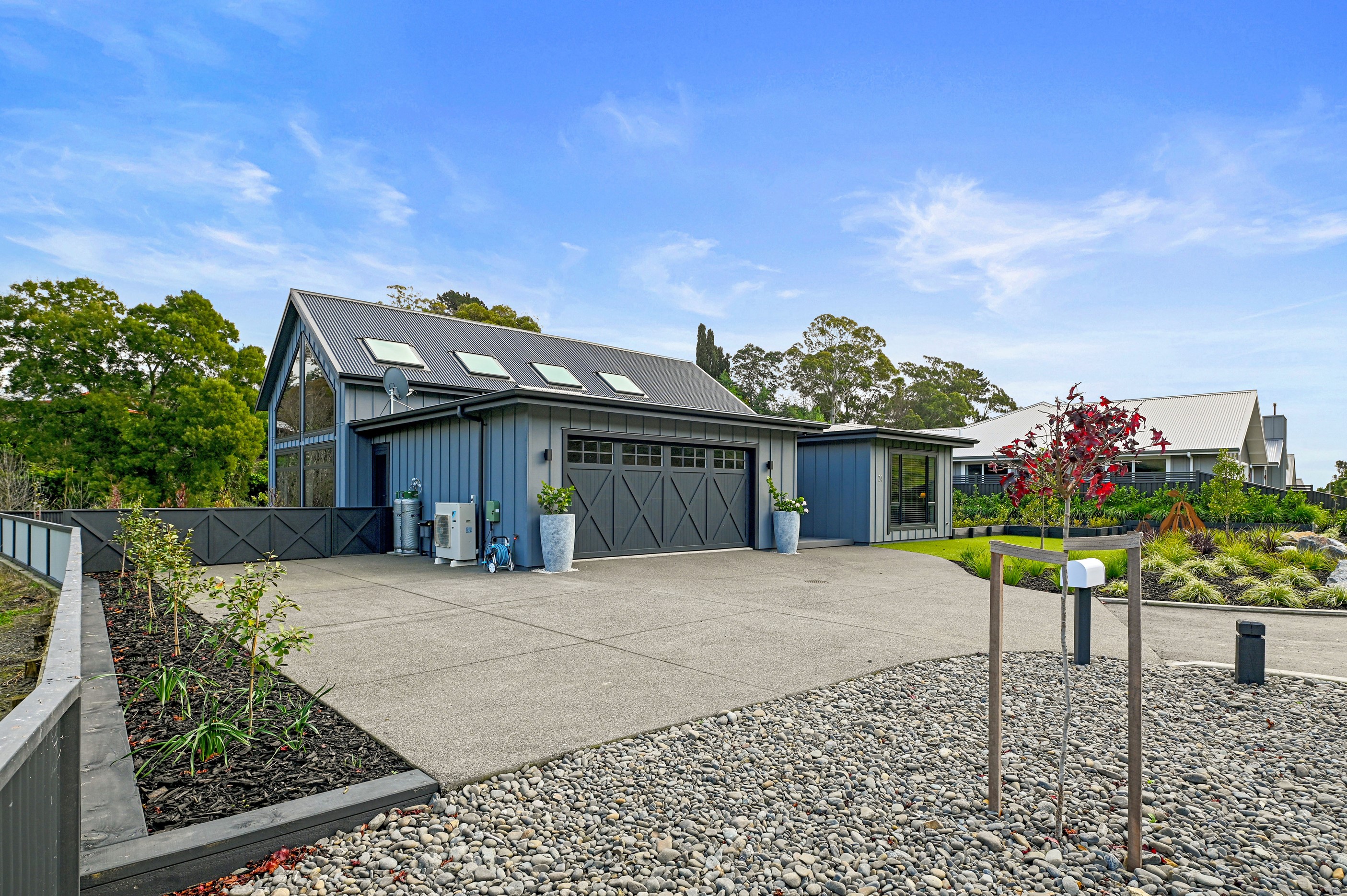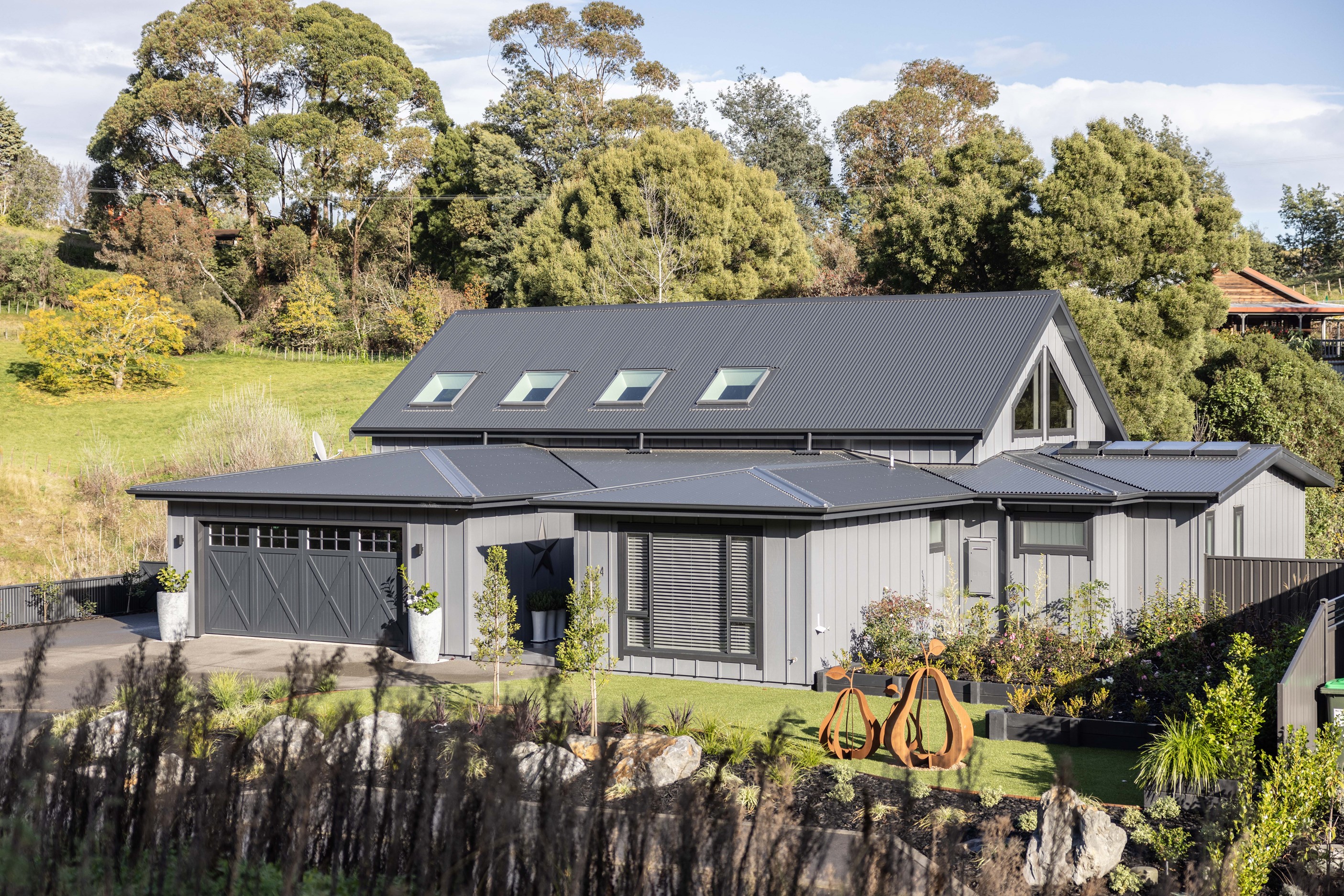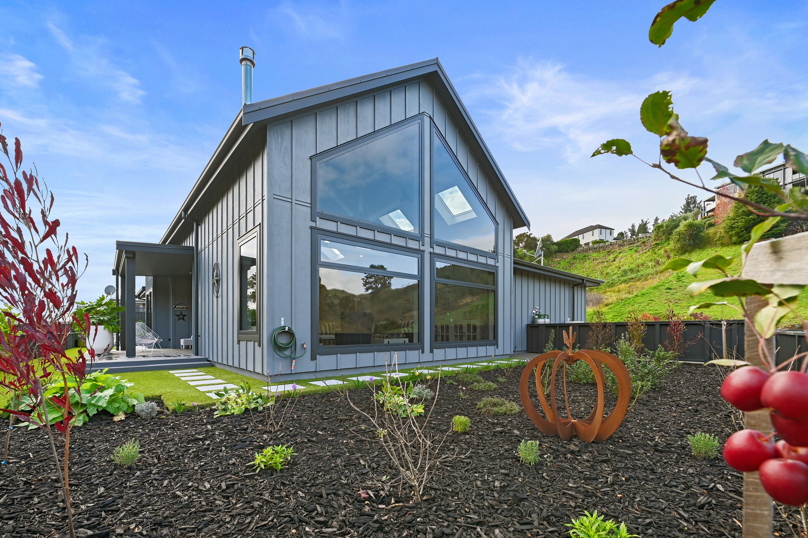 Nestled amid bush-clad hills, this Havelock North home provides a lovely place to dwell, linger and connect with friends and family. Slate blue-grey cladding, charcoal joinery and corrugated roofing lend understated elegance to the exterior. This is enhanced by rock work, landscaping and sculptures placed on the front lawn. Step inside, and the two-bedroom 194sqm home is light, bright and airy. Vaulted ceilings, clerestory windows, skylights and expanses of glazing usher in an abundance of natural light. The palette of white walls and ceilings, blue feature walls, grey carpet and timber floors is a natural and neutral offering. The open-plan design combines the kitchen, dining and living spaces, all of which are crowned by a lofty ceiling with exposed trusses. In the kitchen, stone benchtops and a sizeable island provide the cook with plenty of workspace, as well as the ability to connect with guests and the views. A window seat is a great place for friends to relax. Roof windows illuminate the main bedroom, which boasts a generous walk-in wardrobe and ensuite with a tiled shower. Lingering in this stylish home is a pleasure.