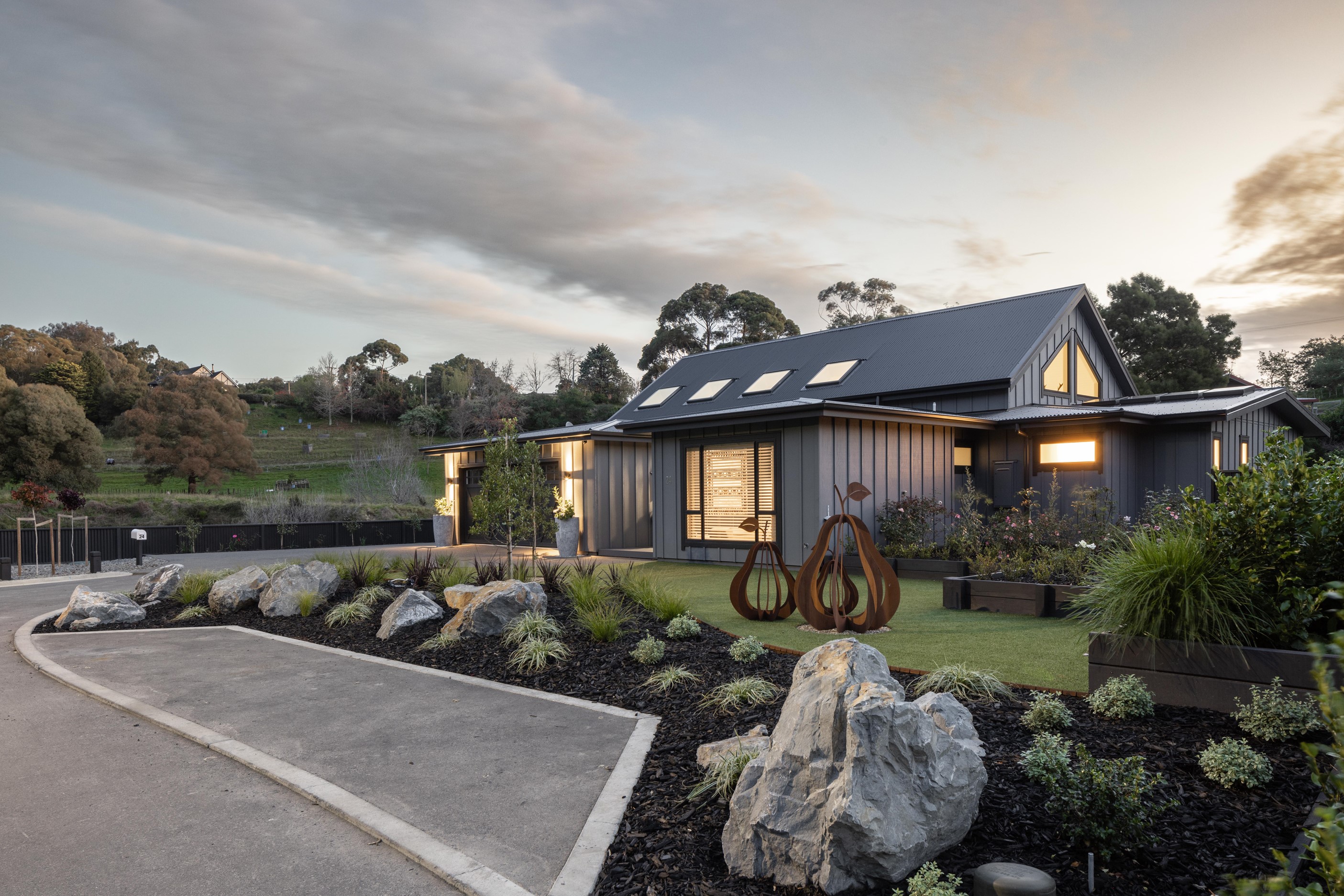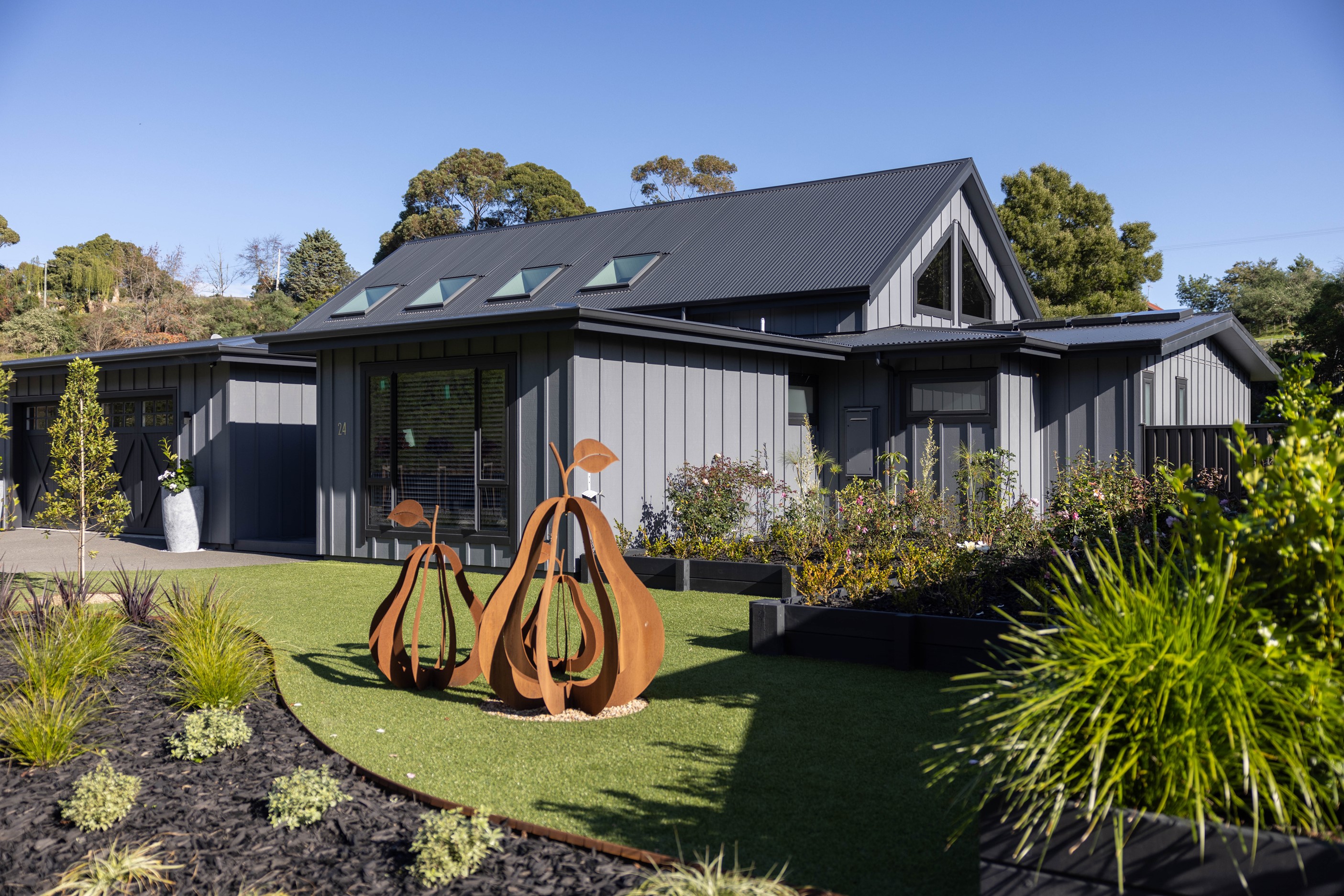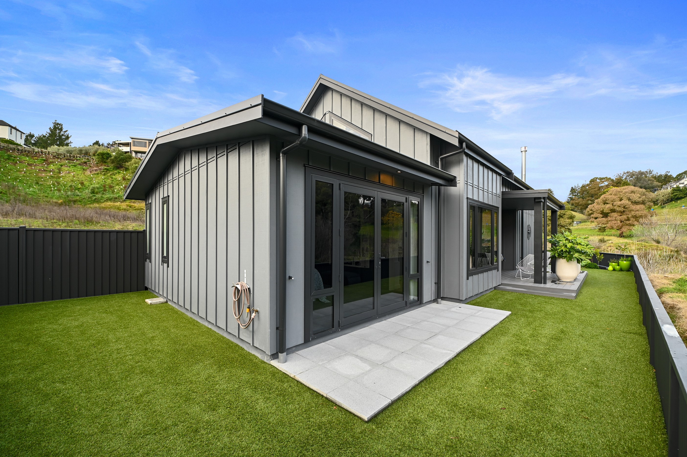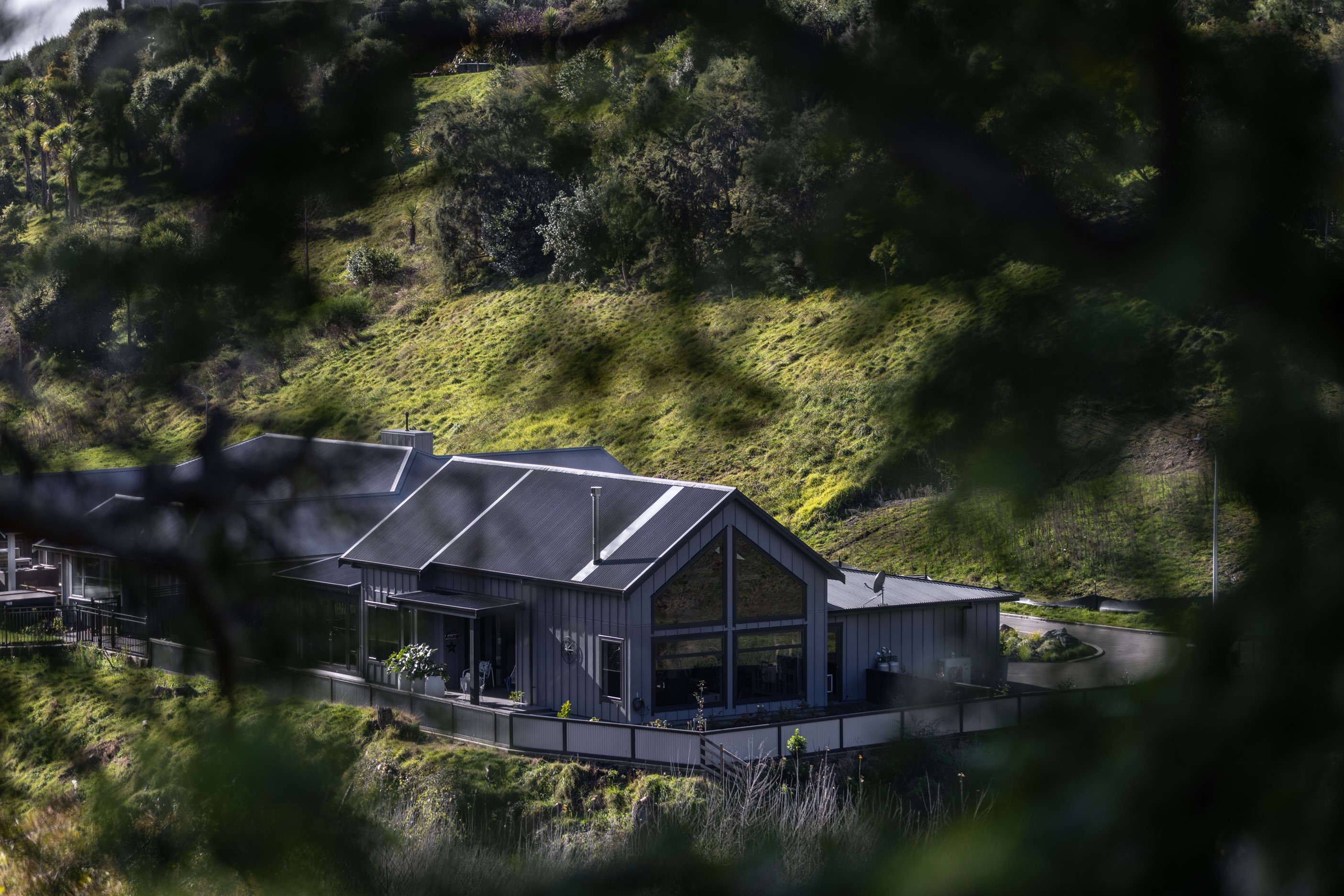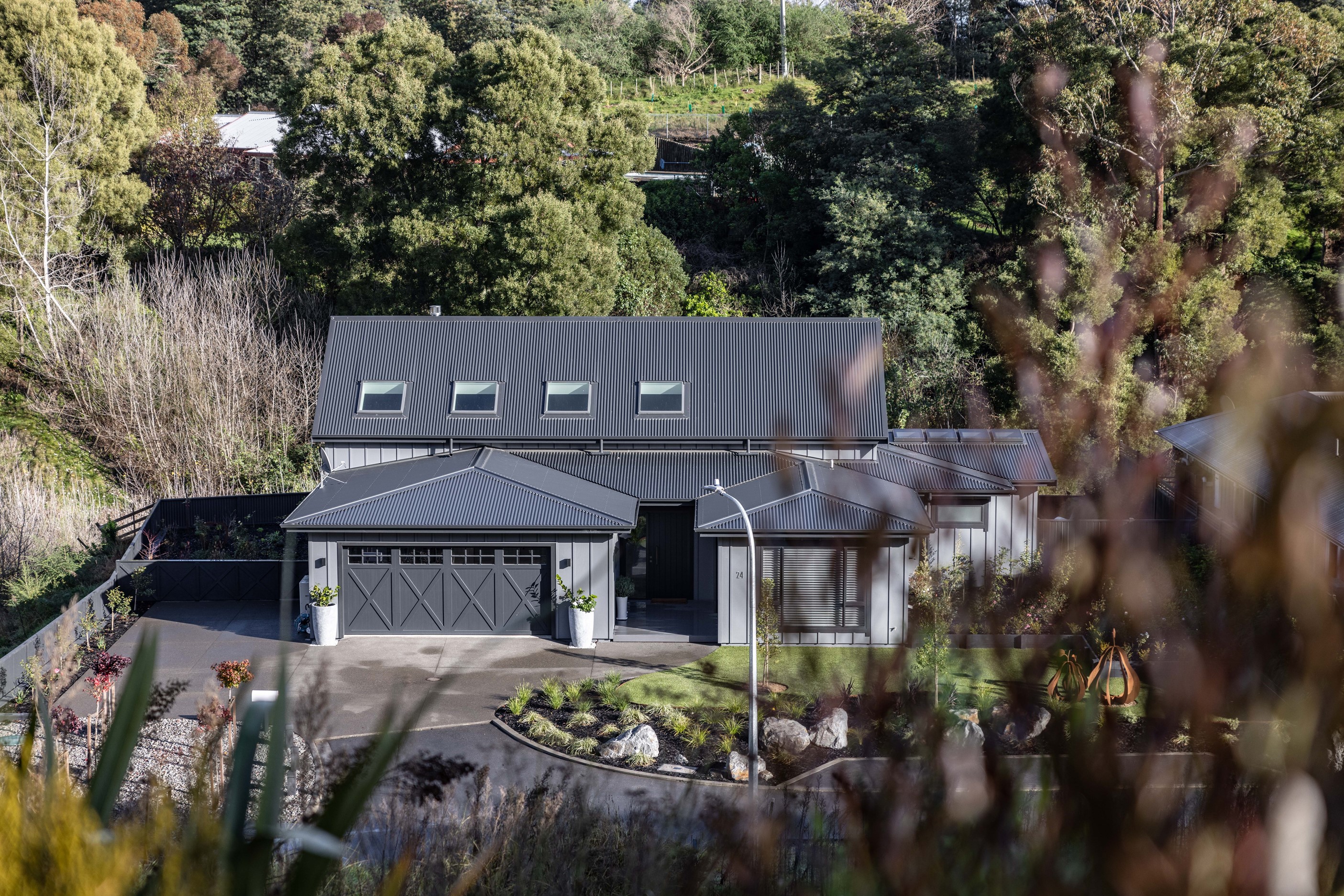 Nestled amid bush-clad hills, this Havelock North home provides a lovely place to dwell, linger and connect with friends and family. Slate blue-grey cladding, charcoal joinery and corrugated roofing lend understated elegance to the exterior. This is enhanced by rock work, landscaping and sculptures placed on the front lawn. Step inside, and the two-bedroom 194sqm home is light, bright and airy. Vaulted ceilings, clerestory windows, skylights and expanses of glazing usher in an abundance of natural light. The palette of white walls and ceilings, blue feature walls, grey carpet and timber floors is a natural and neutral offering. The open-plan design combines the kitchen, dining and living spaces, all of which are crowned by a lofty ceiling with exposed trusses. In the kitchen, stone benchtops and a sizeable island provide the cook with plenty of workspace, as well as the ability to connect with guests and the views. A window seat is a great place for friends to relax. Roof windows illuminate the main bedroom, which boasts a generous walk-in wardrobe and ensuite with a tiled shower. Lingering in this stylish home is a pleasure.