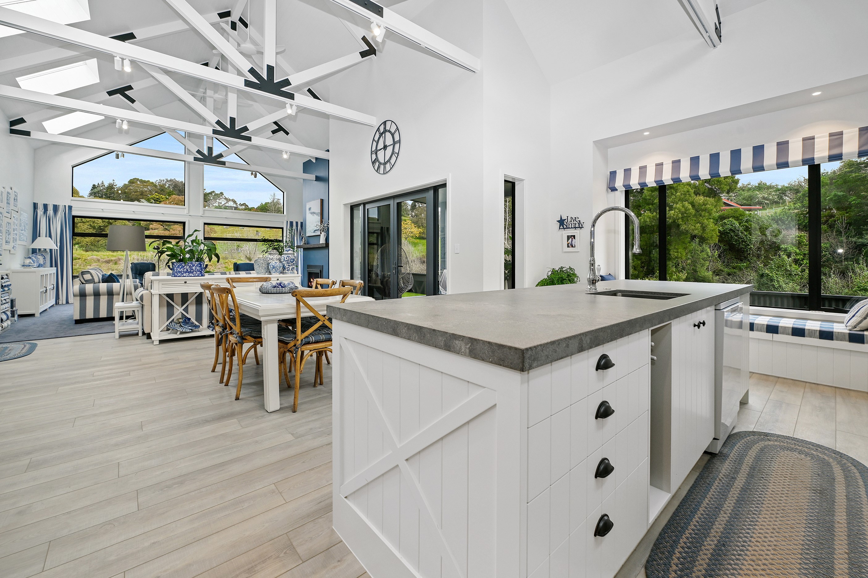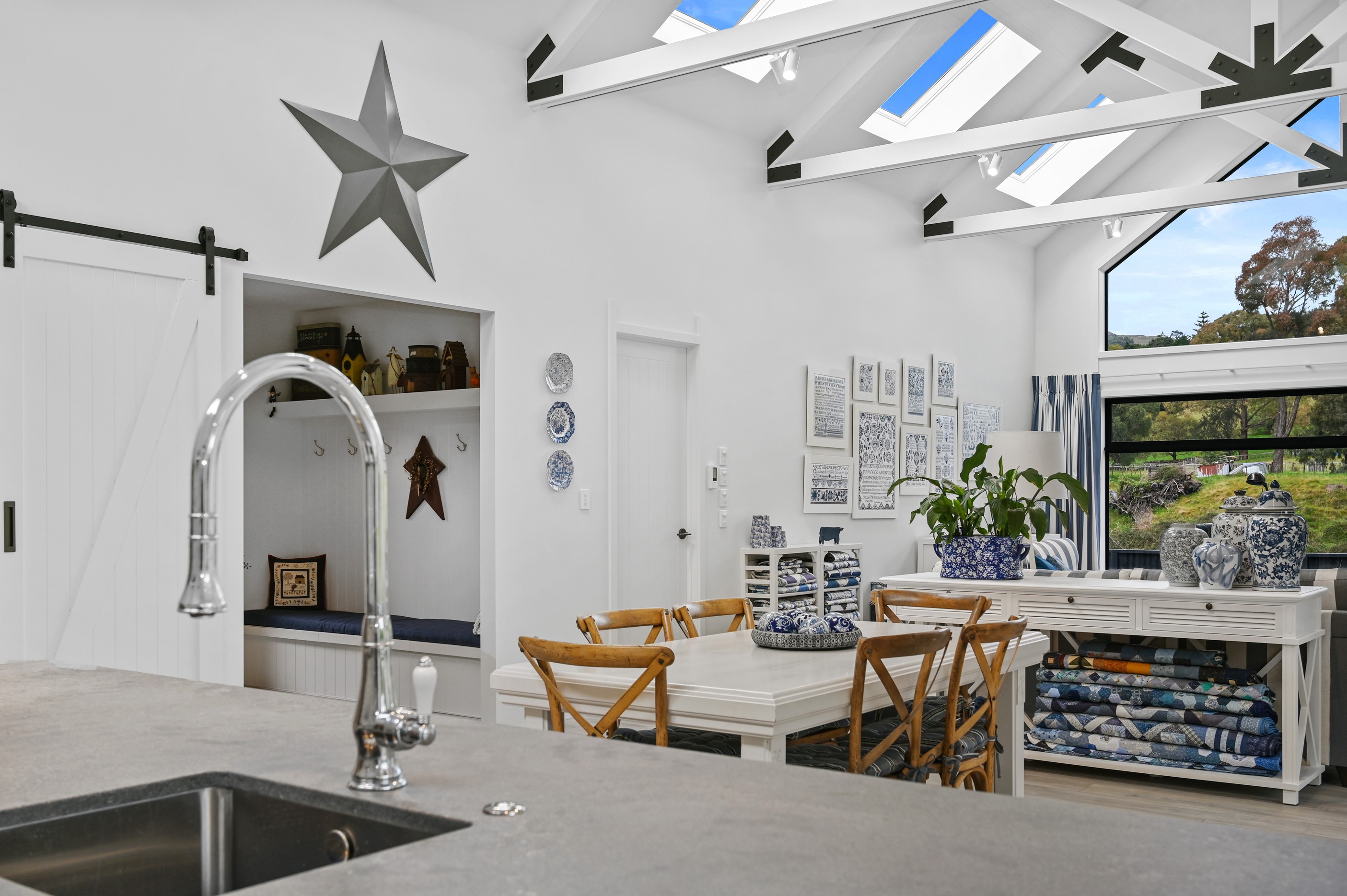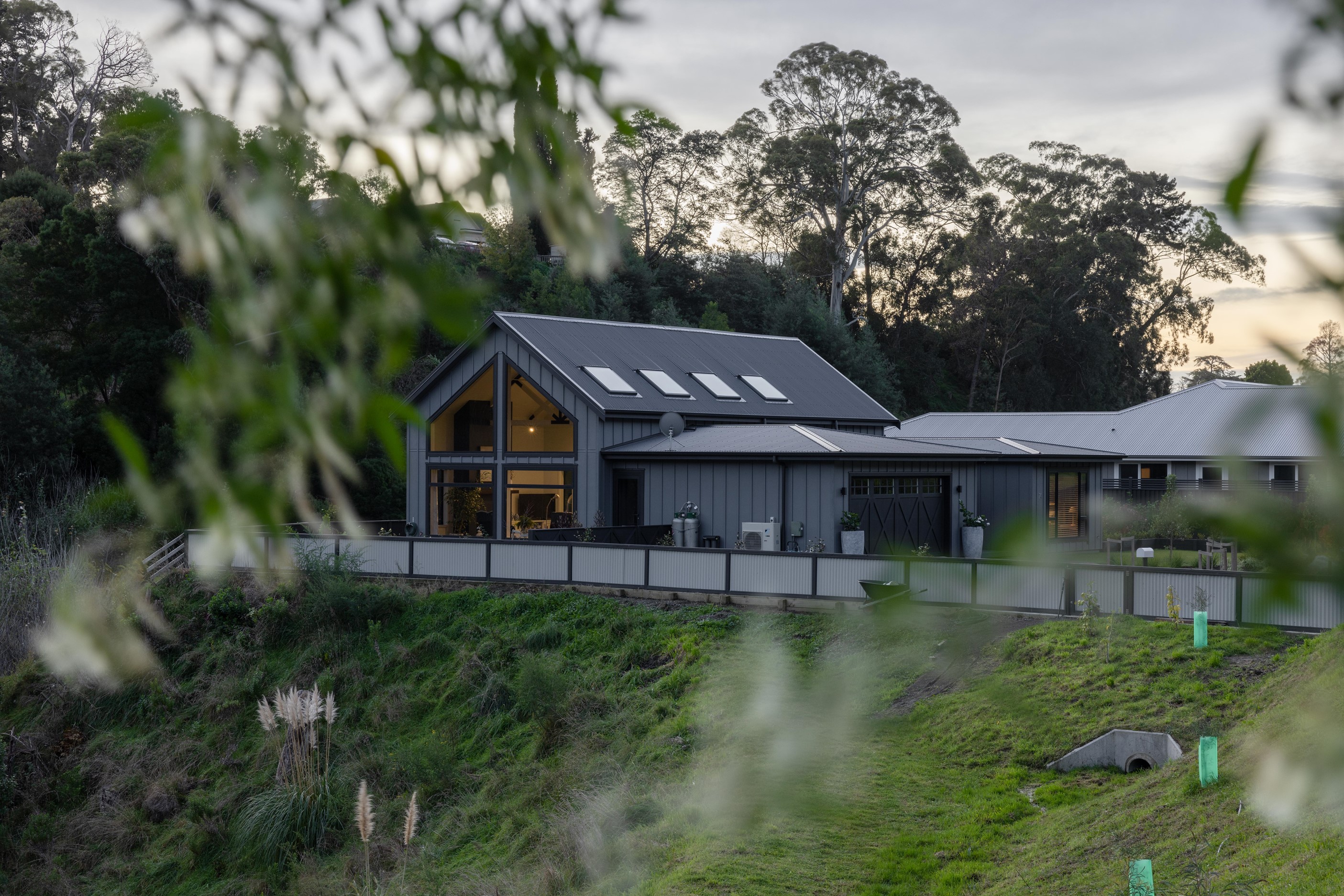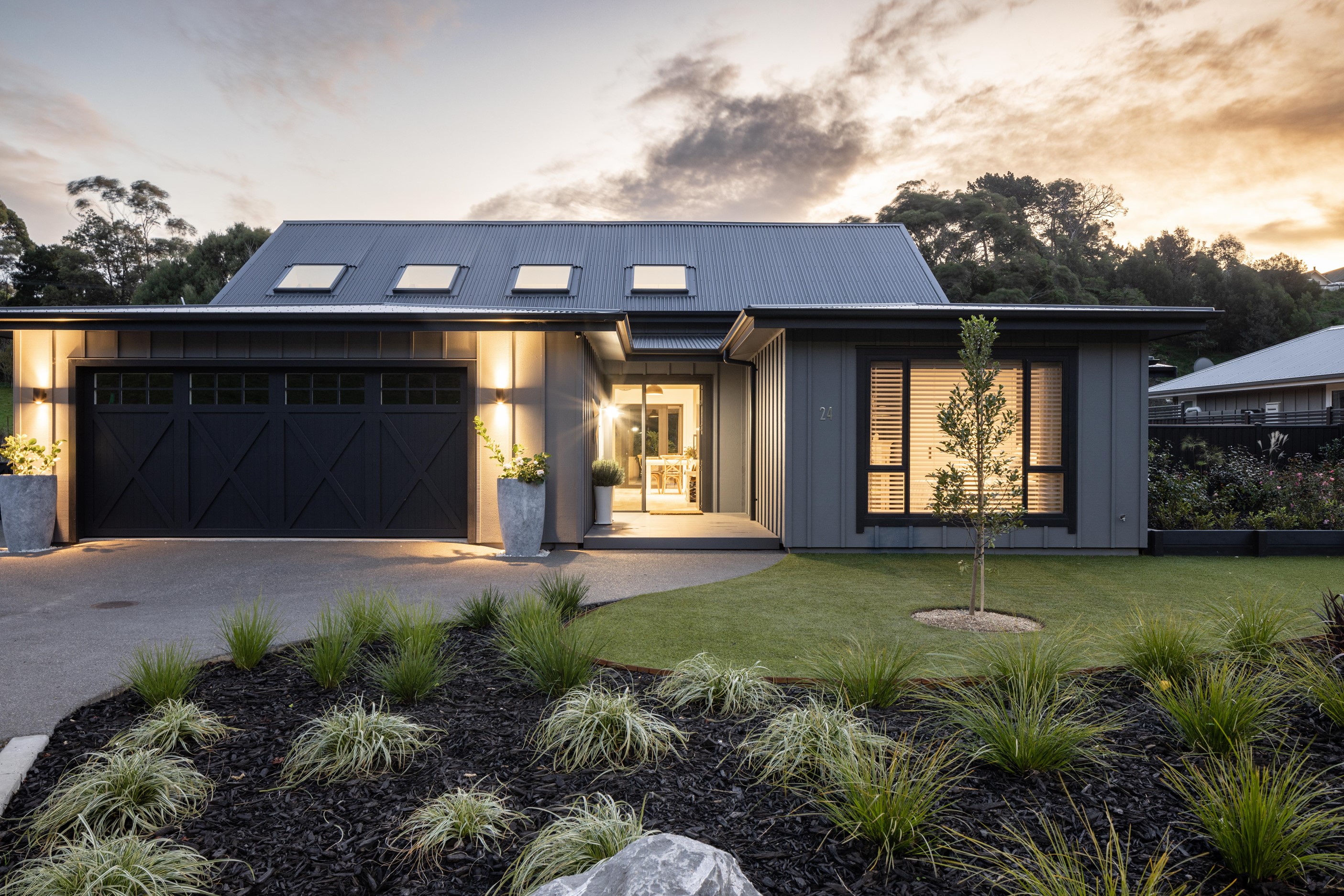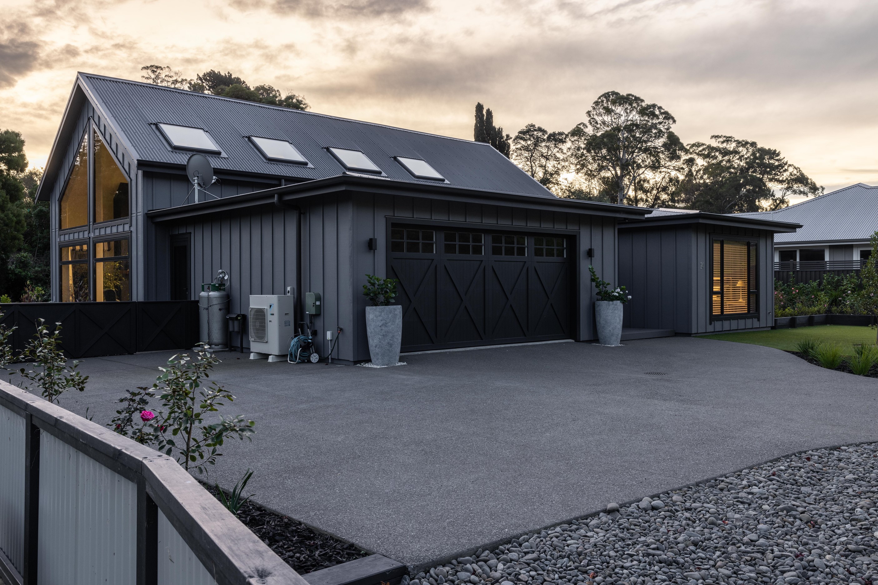 Nestled amid bush-clad hills, this Havelock North home provides a lovely place to dwell, linger and connect with friends and family. Slate blue-grey cladding, charcoal joinery and corrugated roofing lend understated elegance to the exterior. This is enhanced by rock work, landscaping and sculptures placed on the front lawn. Step inside, and the two-bedroom 194sqm home is light, bright and airy. Vaulted ceilings, clerestory windows, skylights and expanses of glazing usher in an abundance of natural light. The palette of white walls and ceilings, blue feature walls, grey carpet and timber floors is a natural and neutral offering. The open-plan design combines the kitchen, dining and living spaces, all of which are crowned by a lofty ceiling with exposed trusses. In the kitchen, stone benchtops and a sizeable island provide the cook with plenty of workspace, as well as the ability to connect with guests and the views. A window seat is a great place for friends to relax. Roof windows illuminate the main bedroom, which boasts a generous walk-in wardrobe and ensuite with a tiled shower. Lingering in this stylish home is a pleasure.