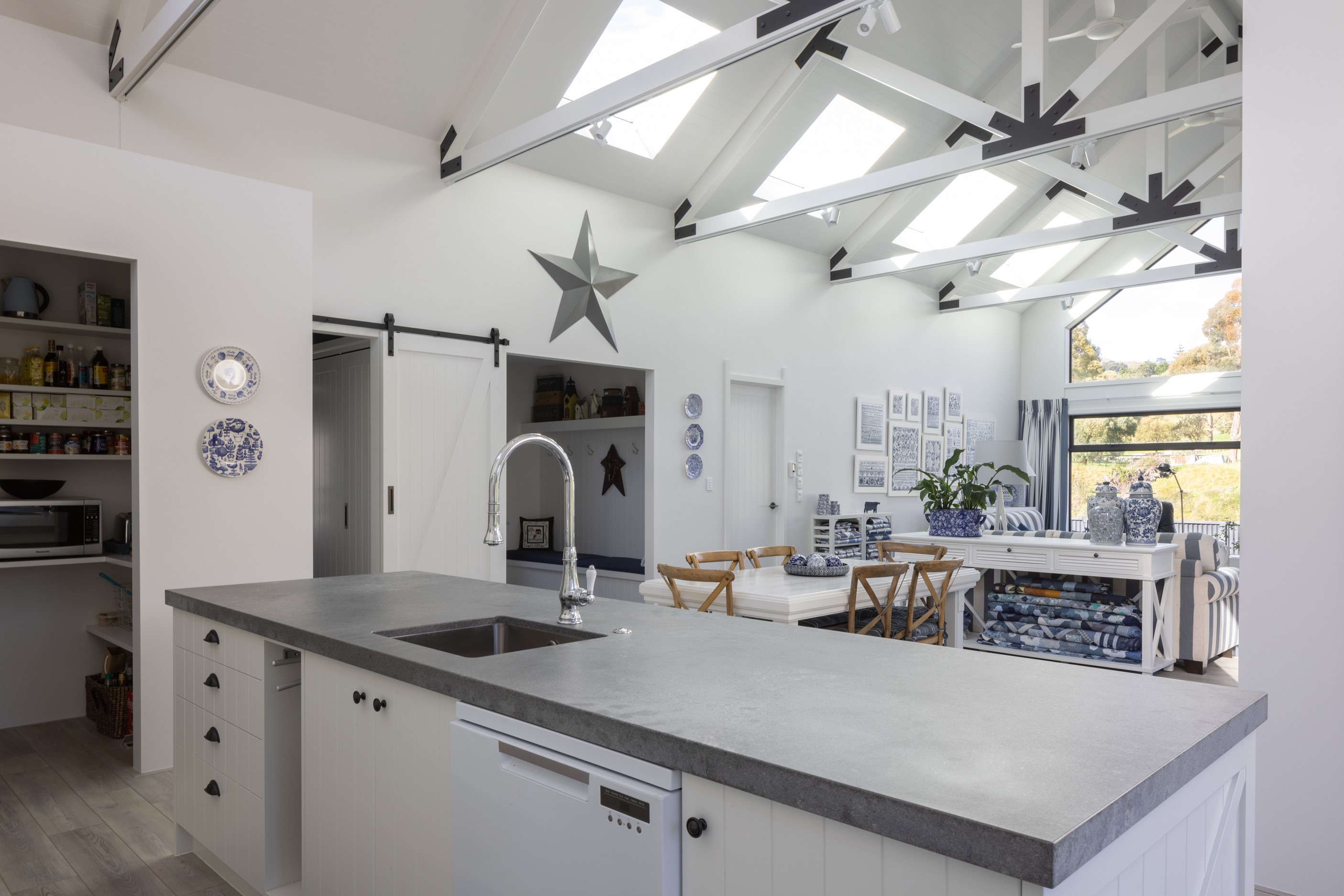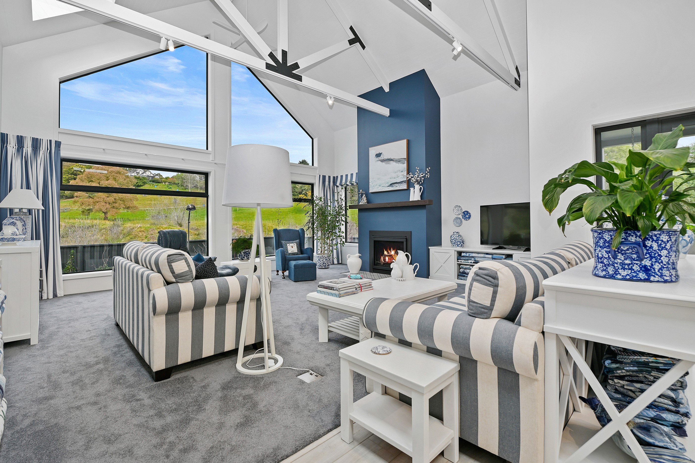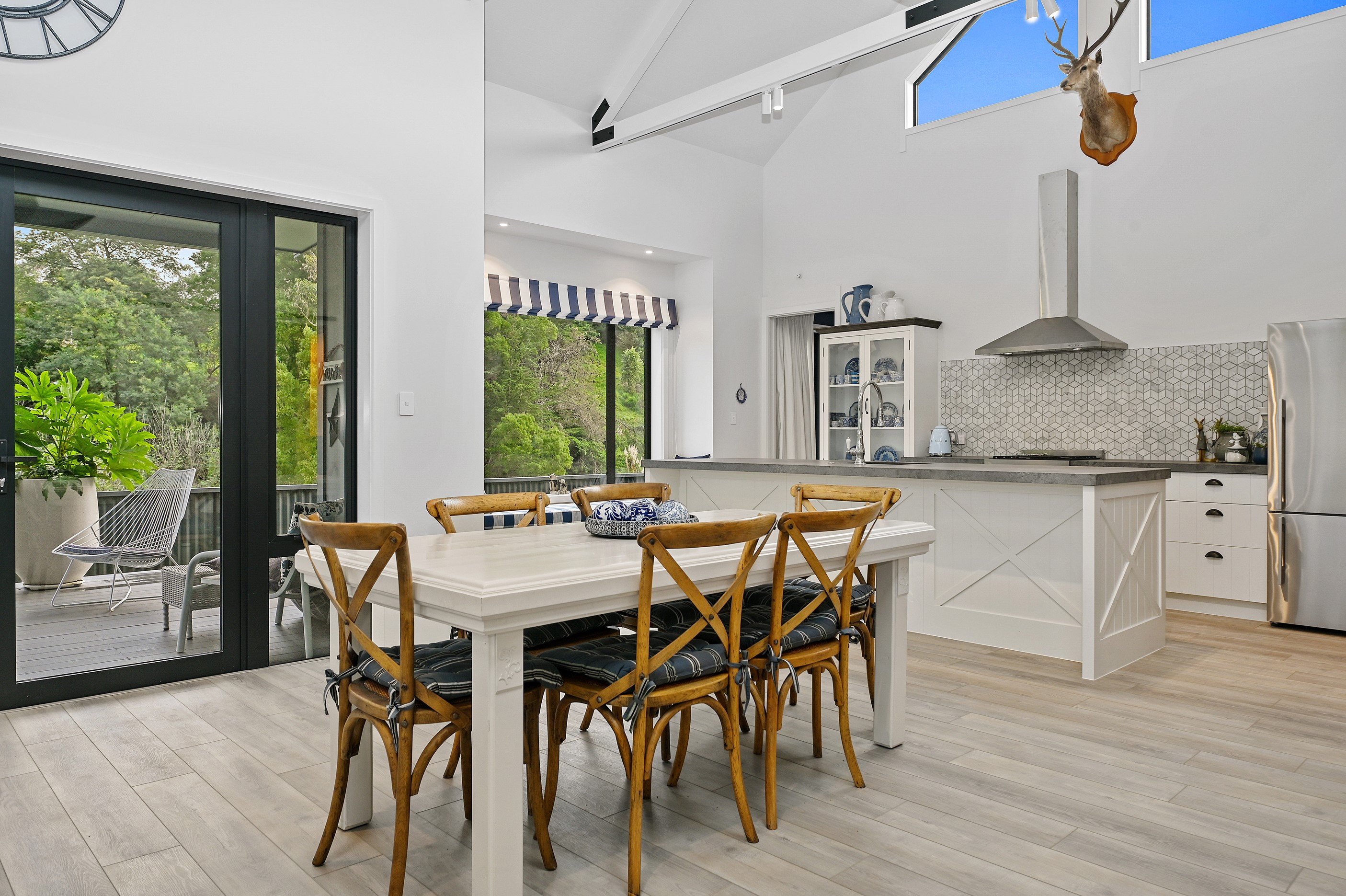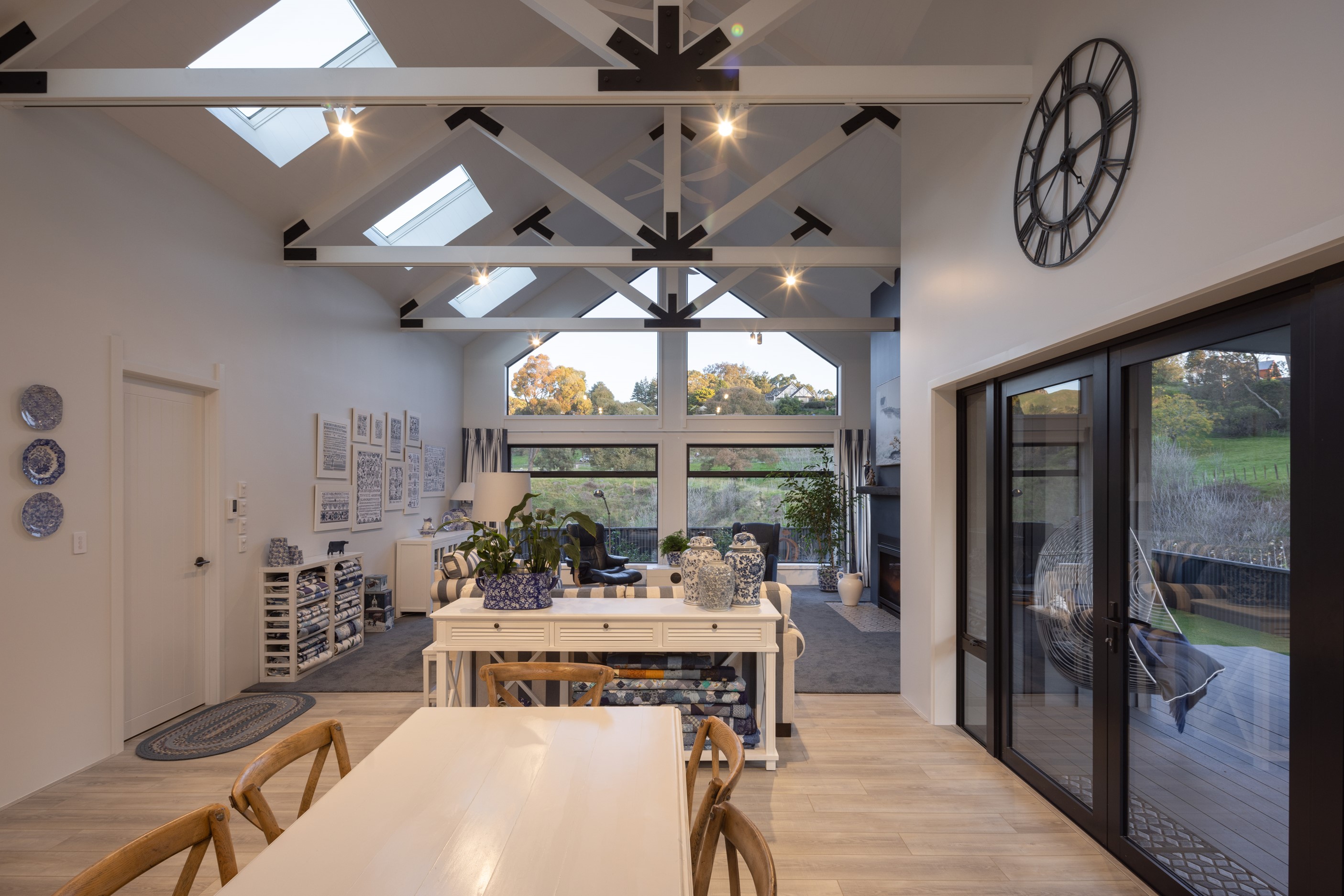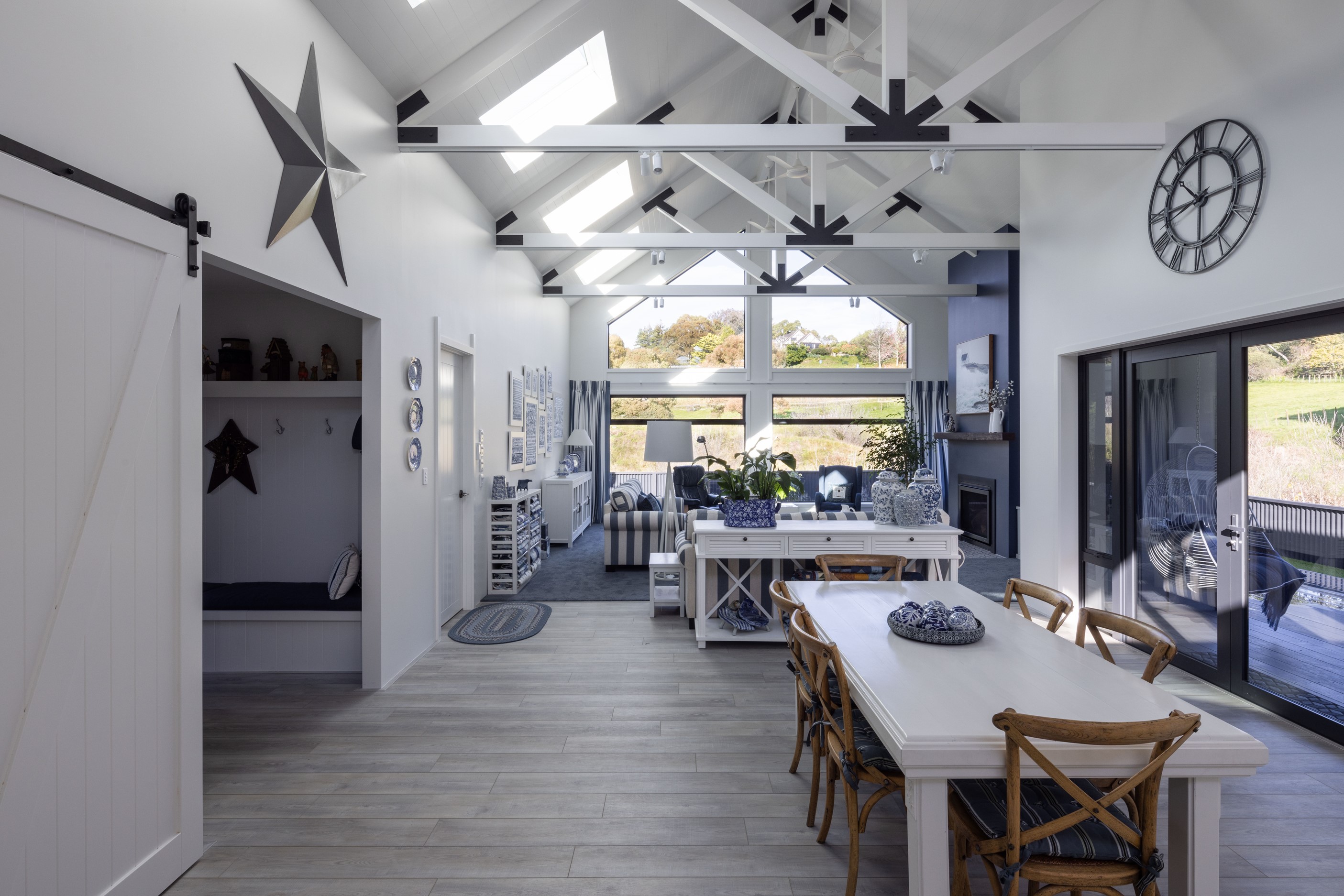 Nestled amid bush-clad hills, this Havelock North home provides a lovely place to dwell, linger and connect with friends and family. Slate blue-grey cladding, charcoal joinery and corrugated roofing lend understated elegance to the exterior. This is enhanced by rock work, landscaping and sculptures placed on the front lawn. Step inside, and the two-bedroom 194sqm home is light, bright and airy. Vaulted ceilings, clerestory windows, skylights and expanses of glazing usher in an abundance of natural light. The palette of white walls and ceilings, blue feature walls, grey carpet and timber floors is a natural and neutral offering. The open-plan design combines the kitchen, dining and living spaces, all of which are crowned by a lofty ceiling with exposed trusses. In the kitchen, stone benchtops and a sizeable island provide the cook with plenty of workspace, as well as the ability to connect with guests and the views. A window seat is a great place for friends to relax. Roof windows illuminate the main bedroom, which boasts a generous walk-in wardrobe and ensuite with a tiled shower. Lingering in this stylish home is a pleasure.