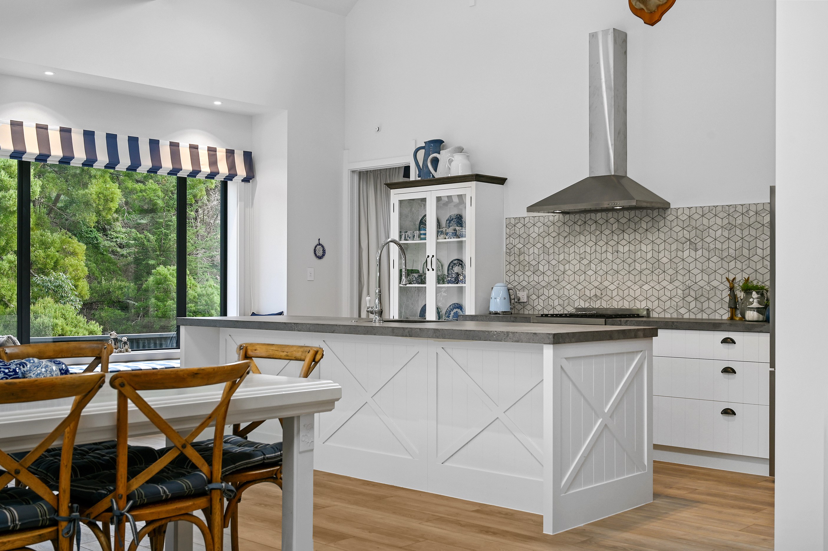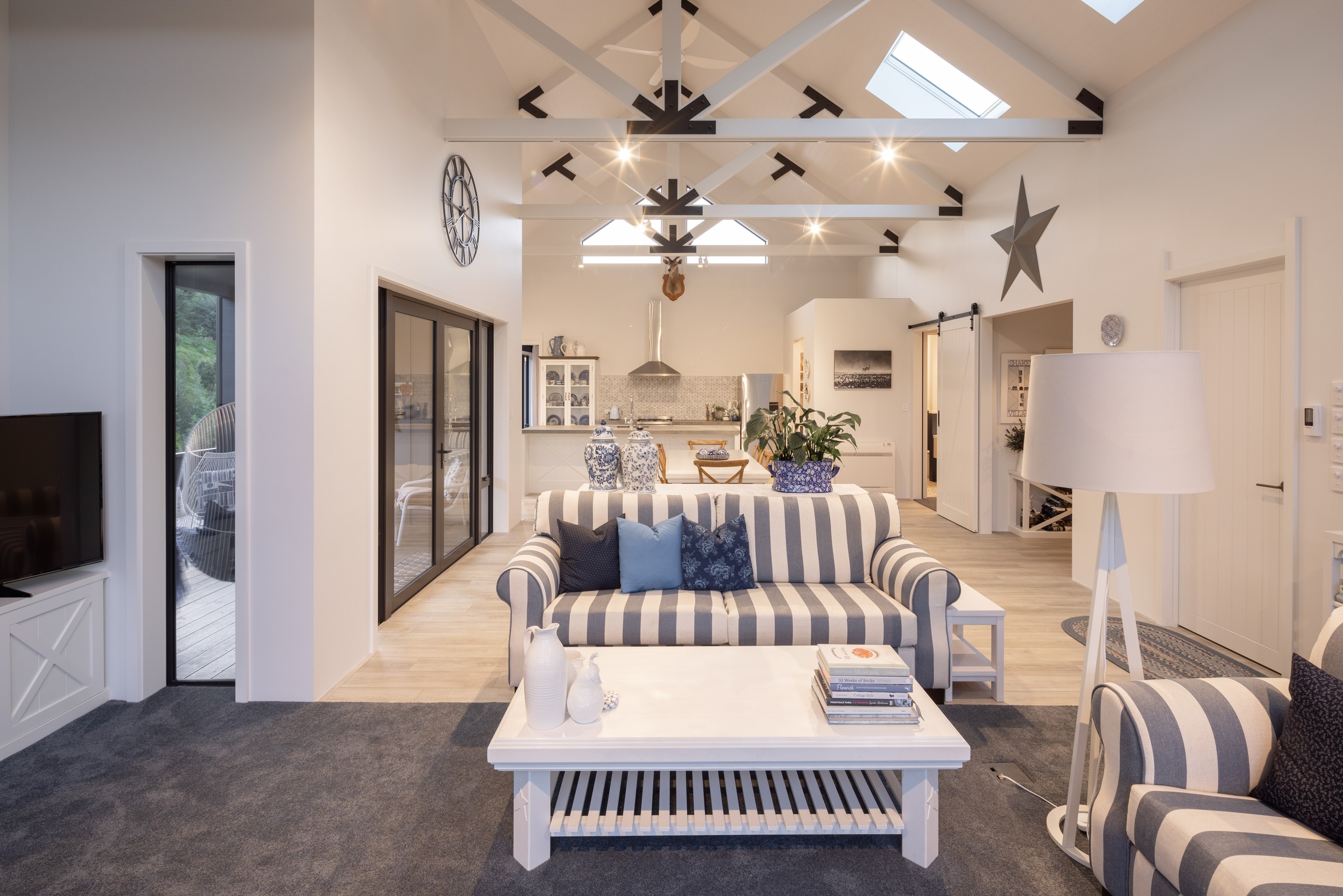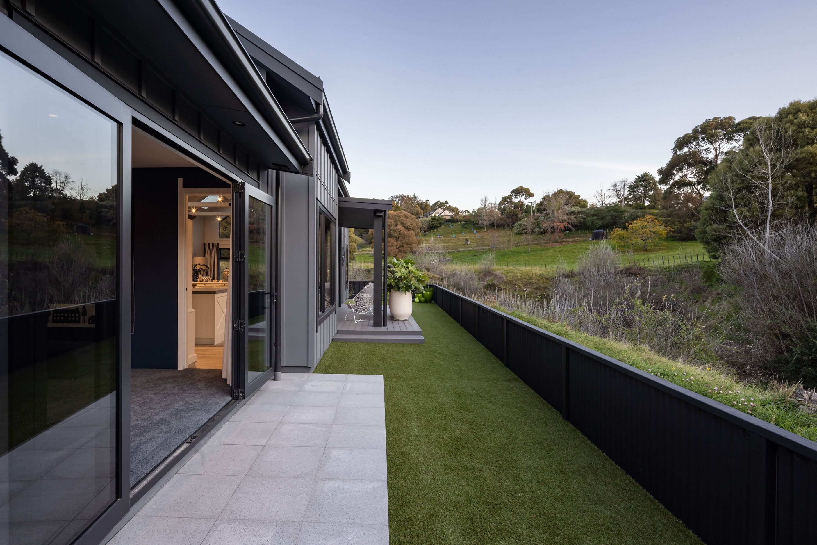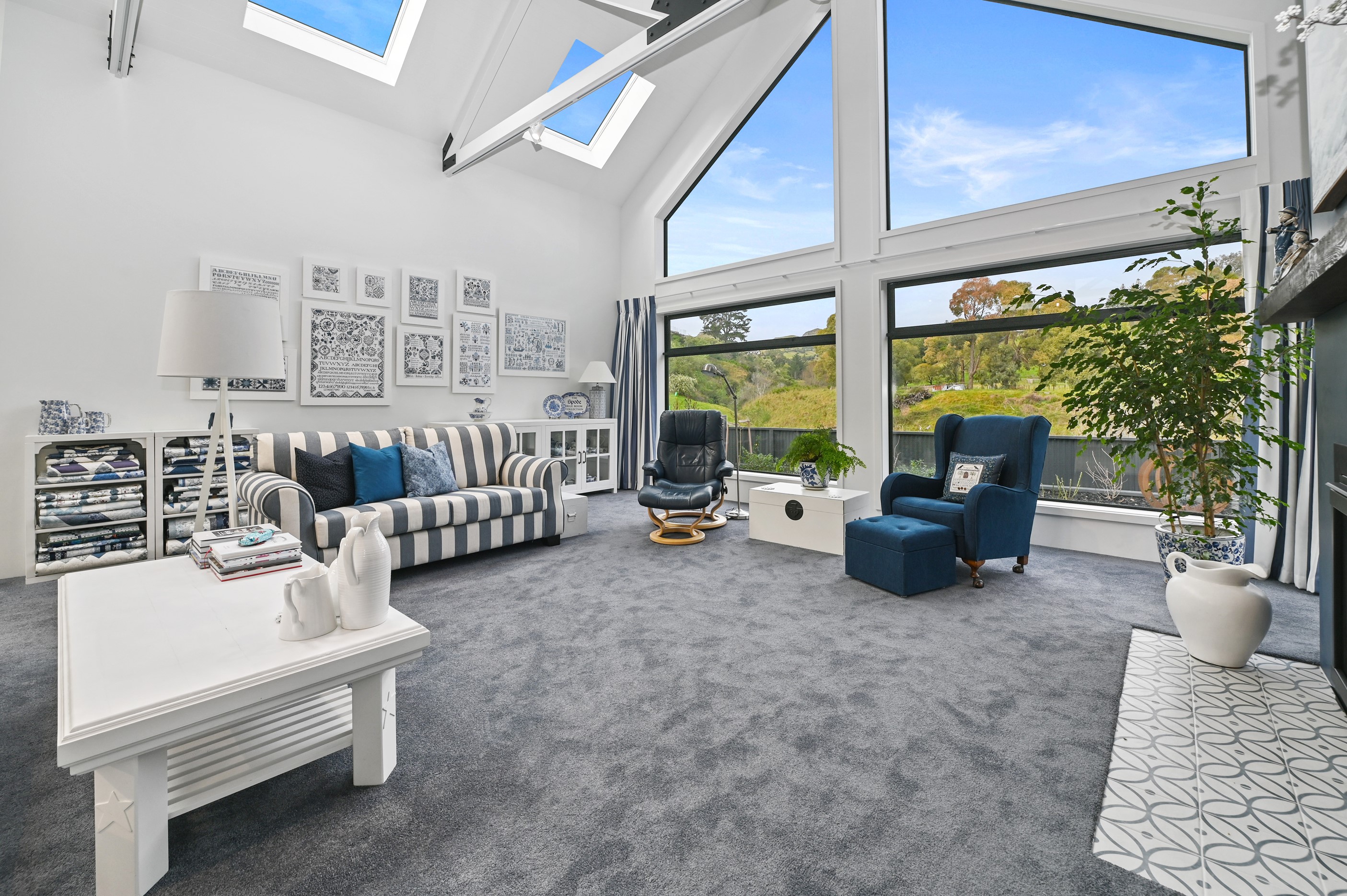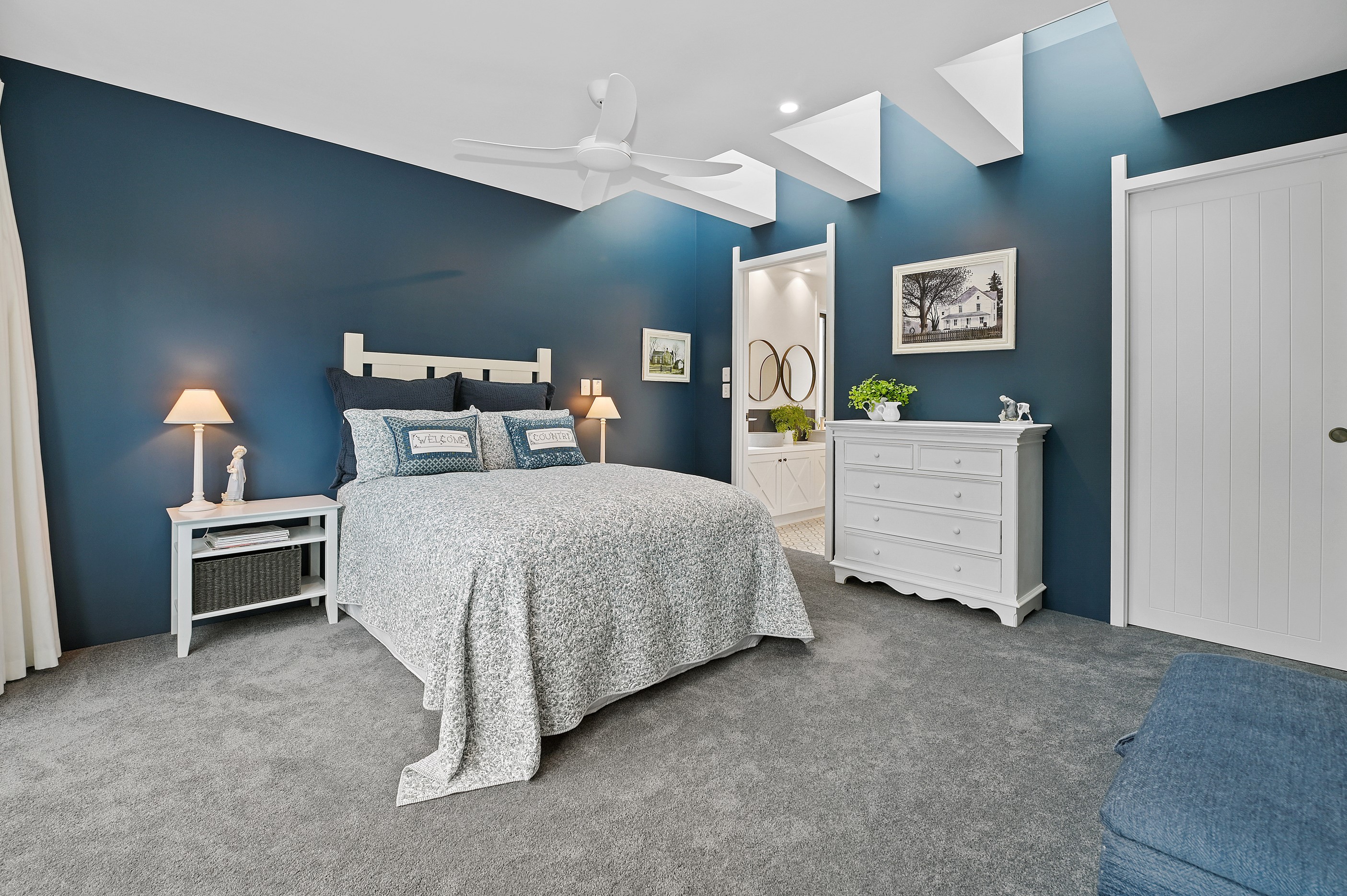 Nestled amid bush-clad hills, this Havelock North home provides a lovely place to dwell, linger and connect with friends and family. Slate blue-grey cladding, charcoal joinery and corrugated roofing lend understated elegance to the exterior. This is enhanced by rock work, landscaping and sculptures placed on the front lawn. Step inside, and the two-bedroom 194sqm home is light, bright and airy. Vaulted ceilings, clerestory windows, skylights and expanses of glazing usher in an abundance of natural light. The palette of white walls and ceilings, blue feature walls, grey carpet and timber floors is a natural and neutral offering. The open-plan design combines the kitchen, dining and living spaces, all of which are crowned by a lofty ceiling with exposed trusses. In the kitchen, stone benchtops and a sizeable island provide the cook with plenty of workspace, as well as the ability to connect with guests and the views. A window seat is a great place for friends to relax. Roof windows illuminate the main bedroom, which boasts a generous walk-in wardrobe and ensuite with a tiled shower. Lingering in this stylish home is a pleasure.
