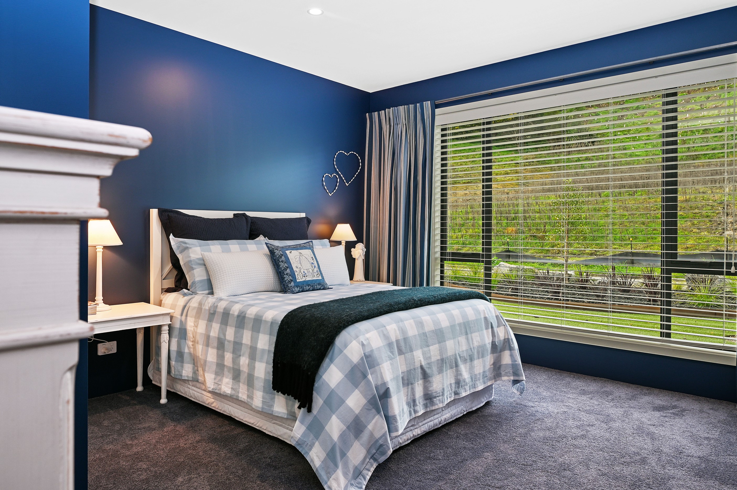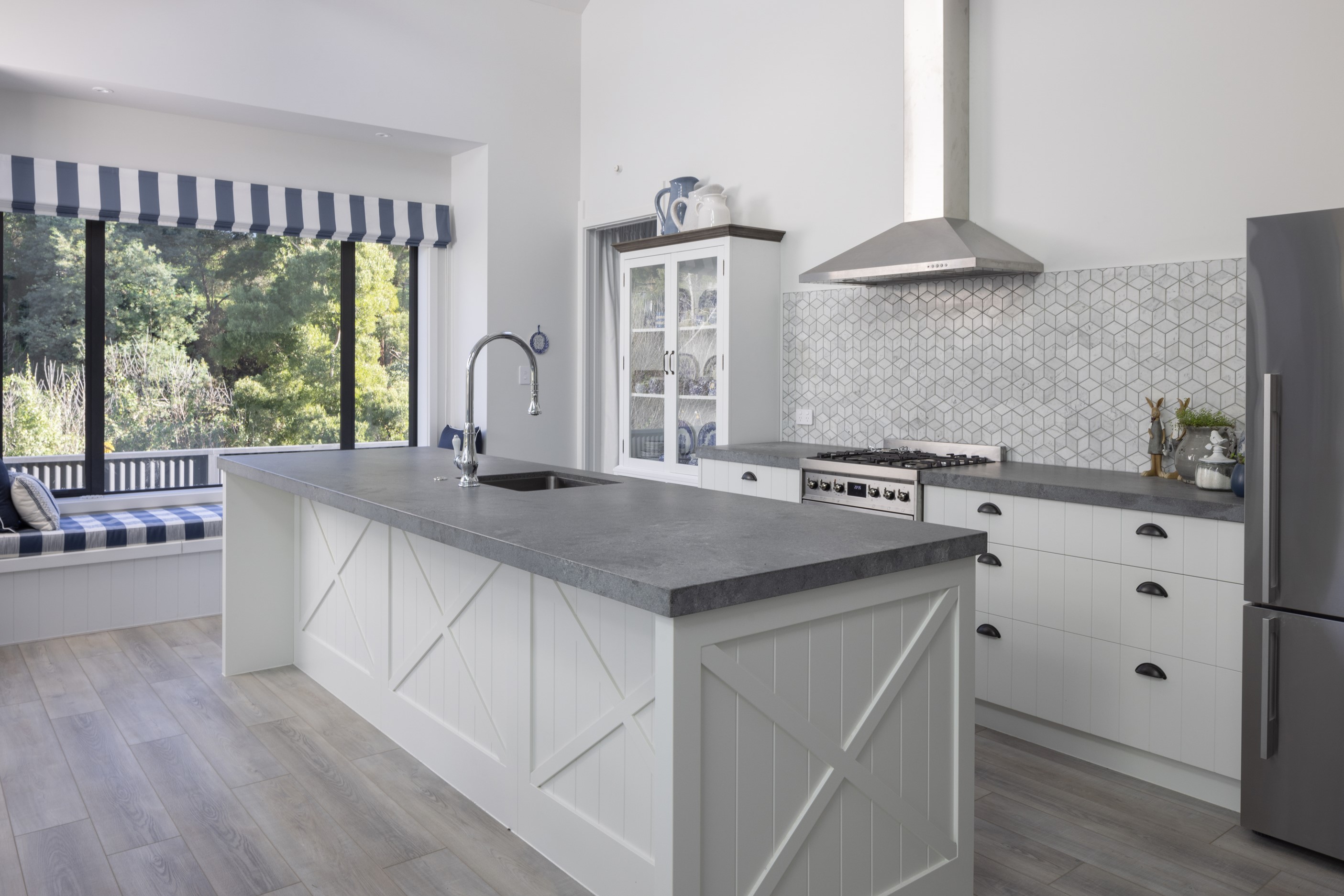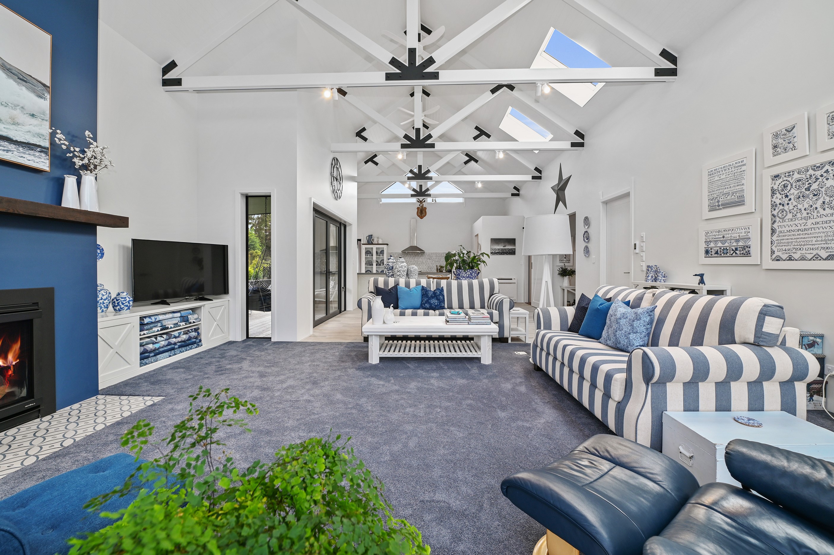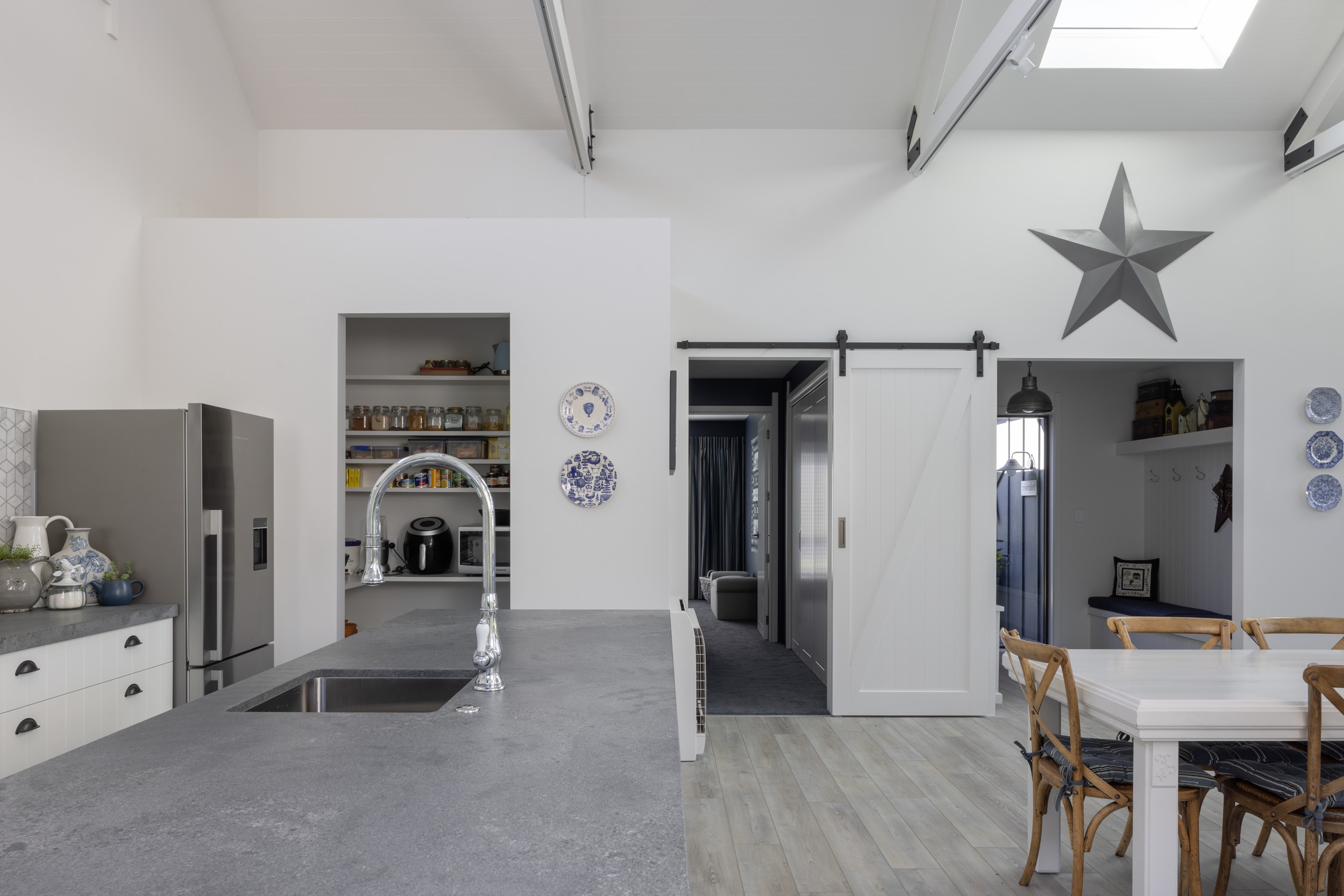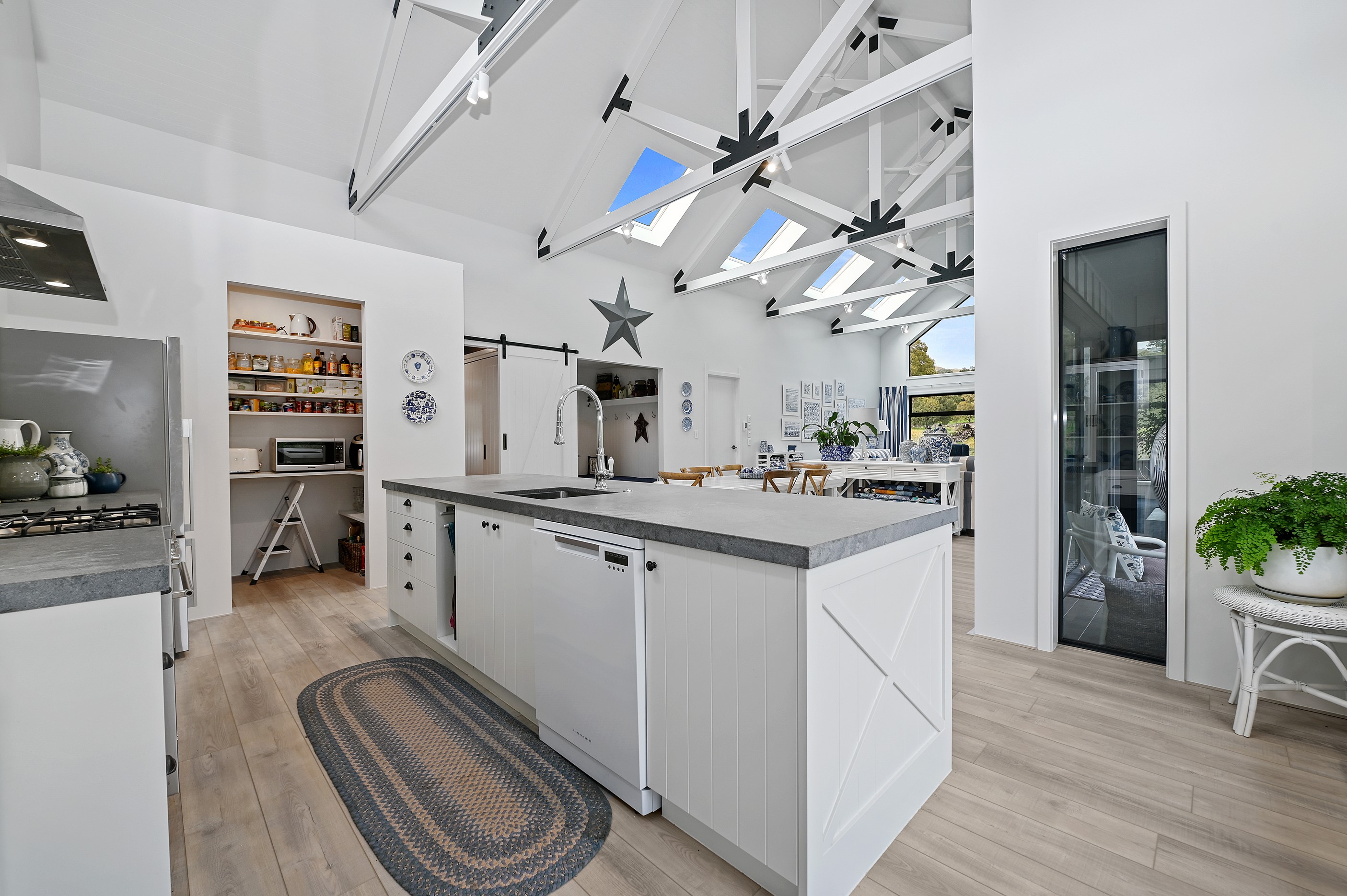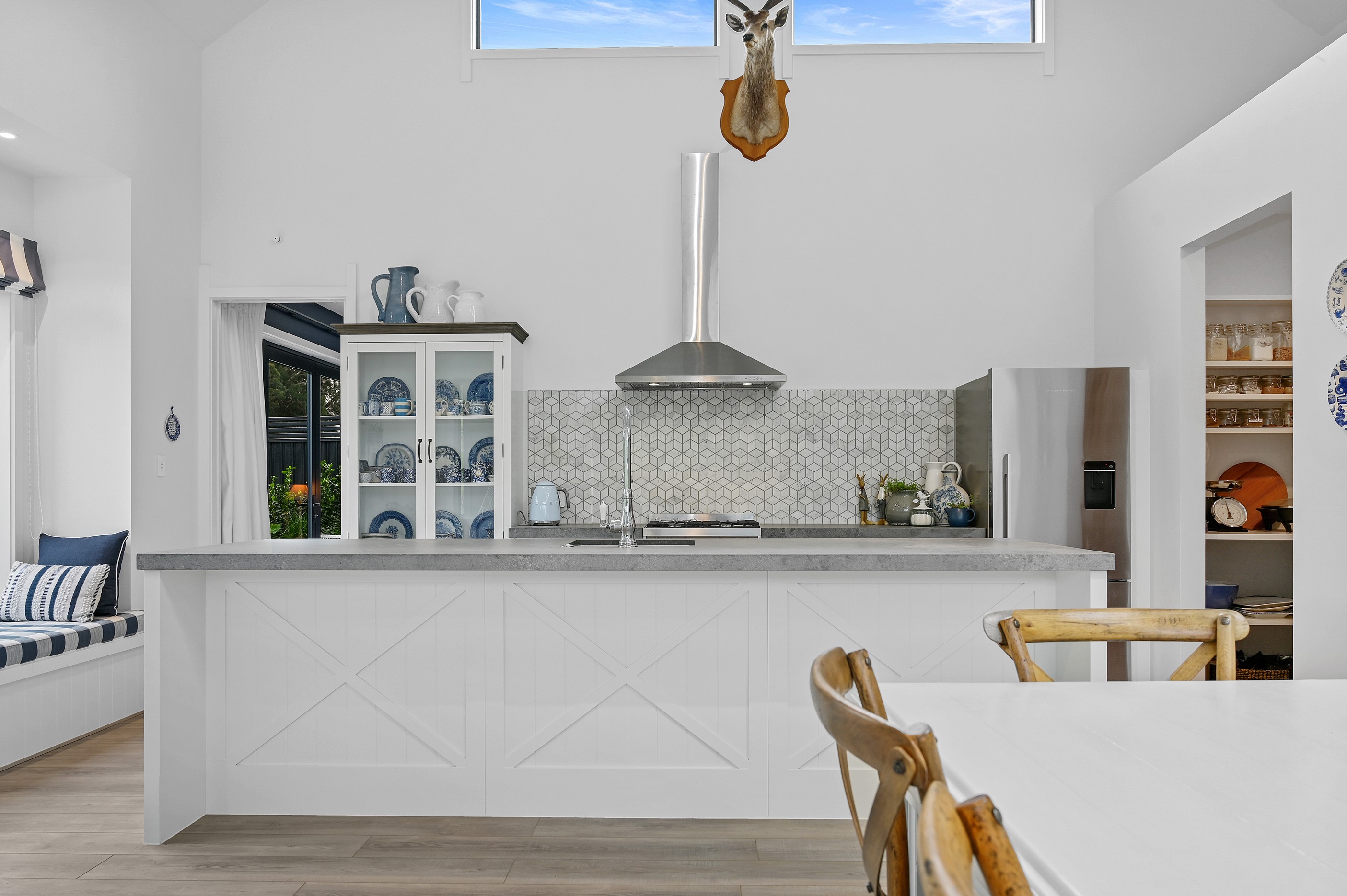 Nestled amid bush-clad hills, this Havelock North home provides a lovely place to dwell, linger and connect with friends and family. Slate blue-grey cladding, charcoal joinery and corrugated roofing lend understated elegance to the exterior. This is enhanced by rock work, landscaping and sculptures placed on the front lawn. Step inside, and the two-bedroom 194sqm home is light, bright and airy. Vaulted ceilings, clerestory windows, skylights and expanses of glazing usher in an abundance of natural light. The palette of white walls and ceilings, blue feature walls, grey carpet and timber floors is a natural and neutral offering. The open-plan design combines the kitchen, dining and living spaces, all of which are crowned by a lofty ceiling with exposed trusses. In the kitchen, stone benchtops and a sizeable island provide the cook with plenty of workspace, as well as the ability to connect with guests and the views. A window seat is a great place for friends to relax. Roof windows illuminate the main bedroom, which boasts a generous walk-in wardrobe and ensuite with a tiled shower. Lingering in this stylish home is a pleasure.