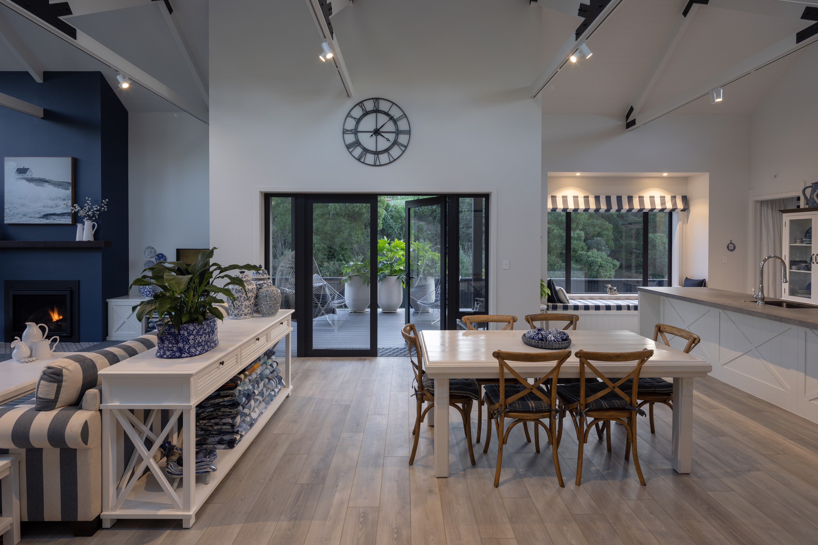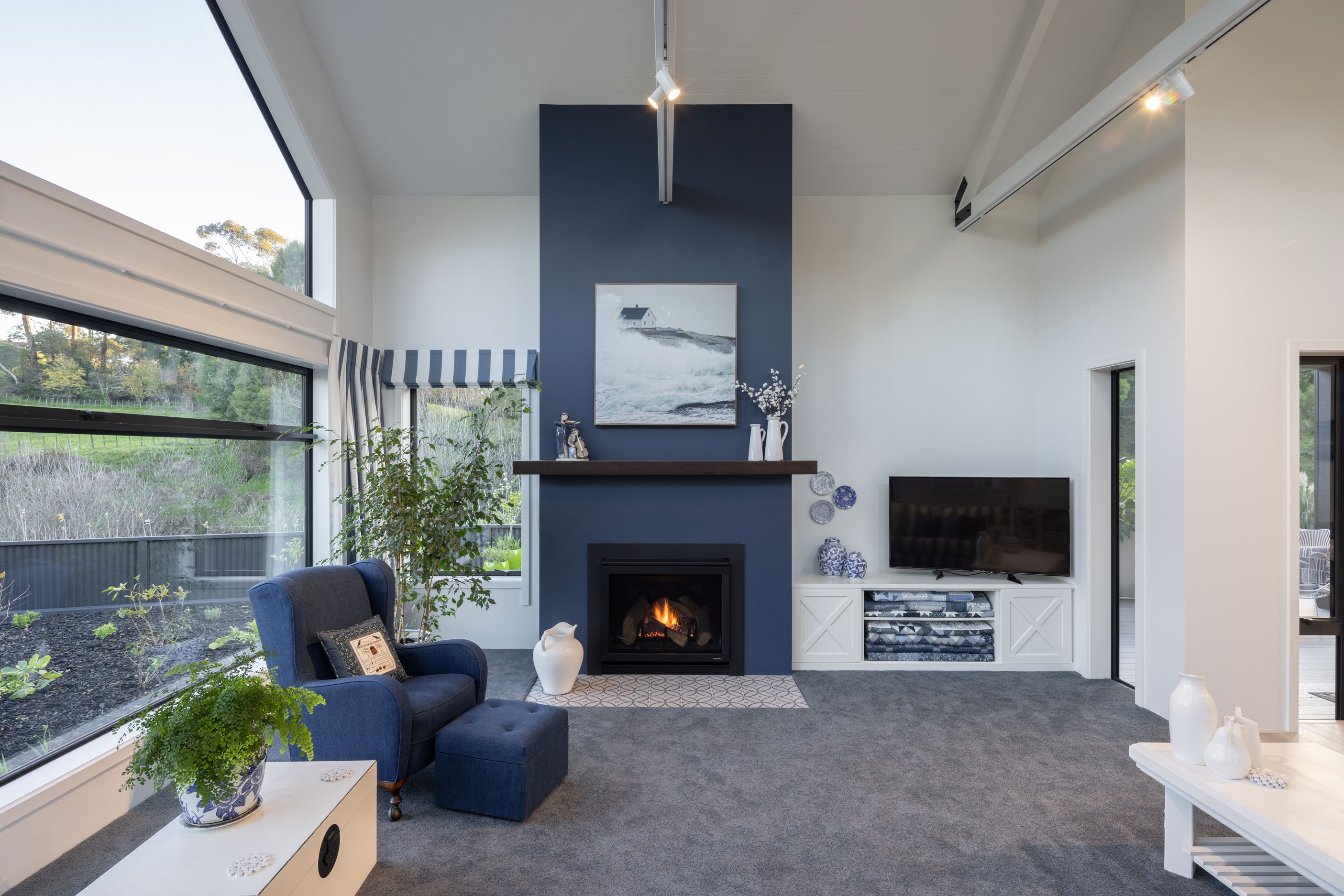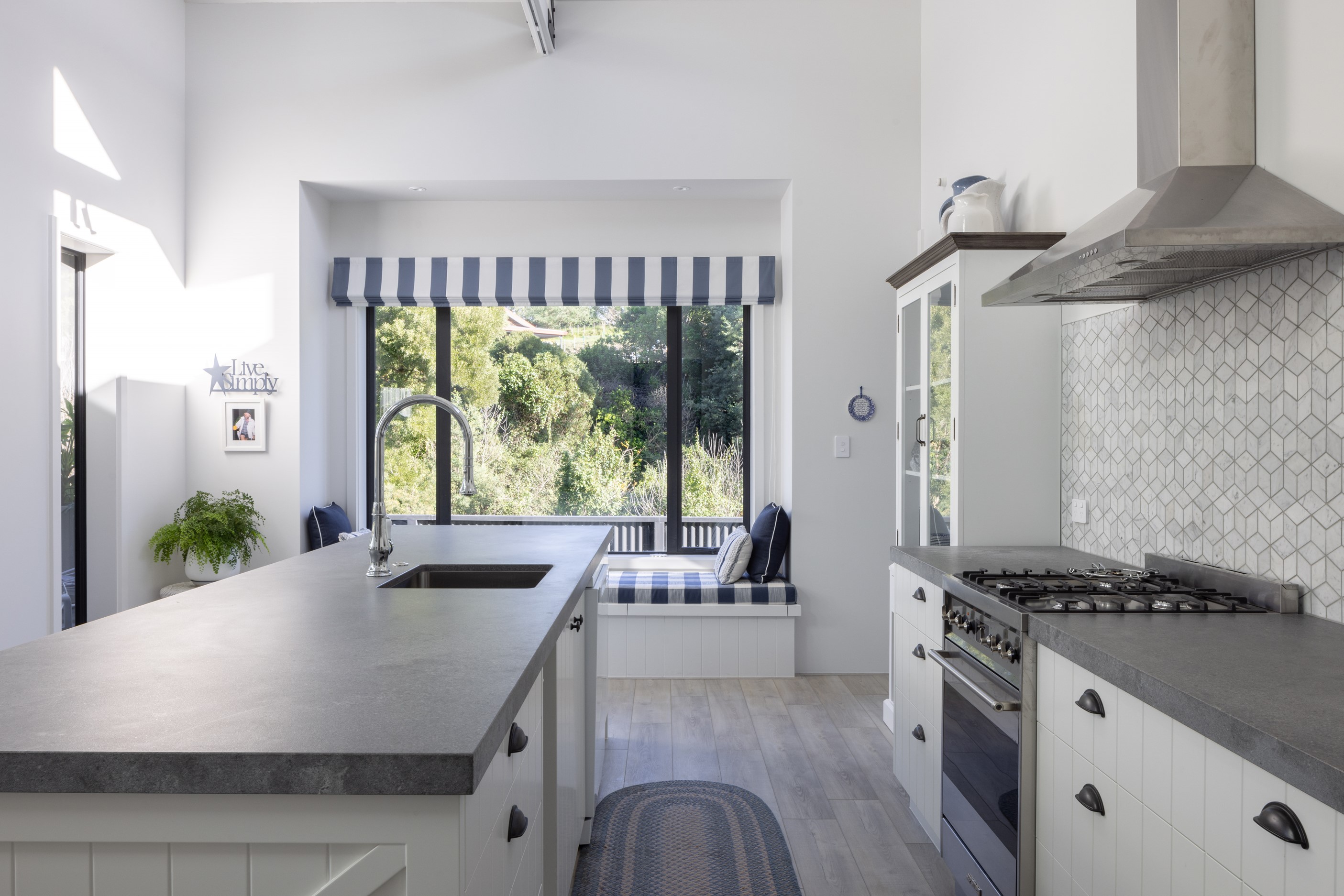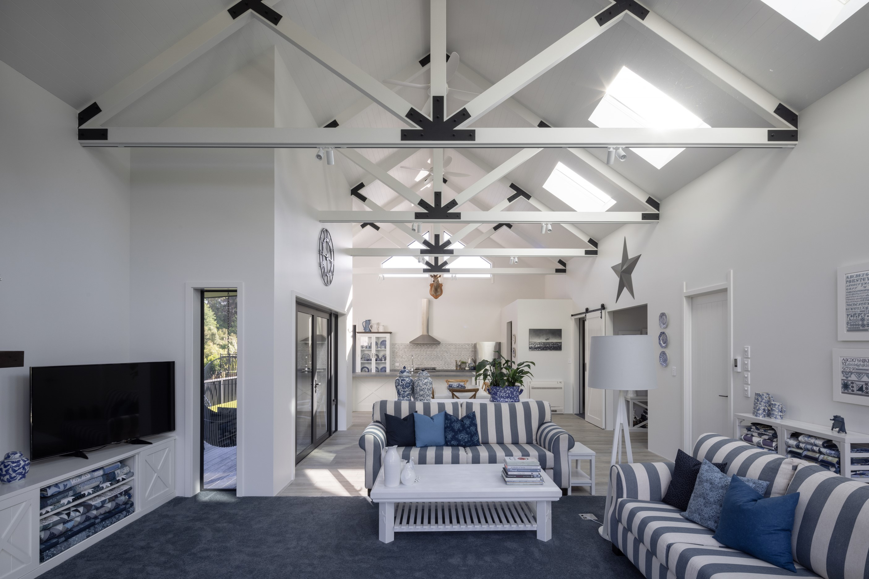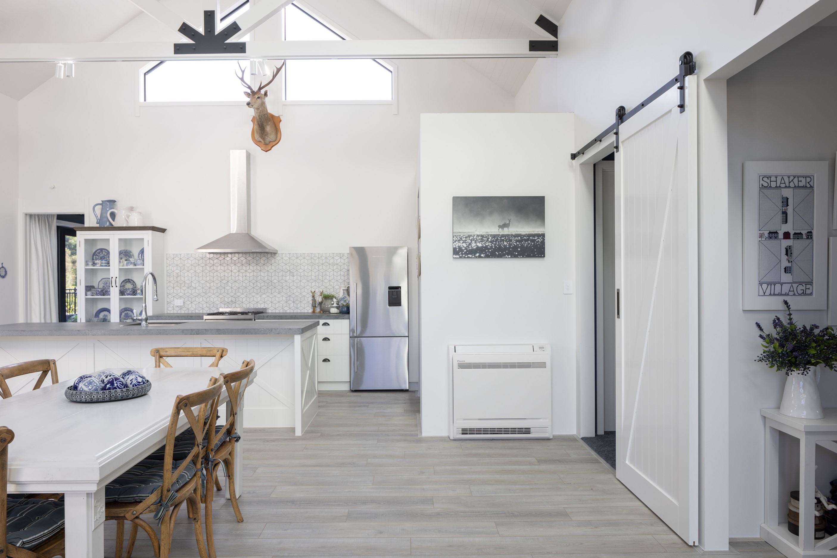 Nestled amid bush-clad hills, this Havelock North home provides a lovely place to dwell, linger and connect with friends and family. Slate blue-grey cladding, charcoal joinery and corrugated roofing lend understated elegance to the exterior. This is enhanced by rock work, landscaping and sculptures placed on the front lawn. Step inside, and the two-bedroom 194sqm home is light, bright and airy. Vaulted ceilings, clerestory windows, skylights and expanses of glazing usher in an abundance of natural light. The palette of white walls and ceilings, blue feature walls, grey carpet and timber floors is a natural and neutral offering. The open-plan design combines the kitchen, dining and living spaces, all of which are crowned by a lofty ceiling with exposed trusses. In the kitchen, stone benchtops and a sizeable island provide the cook with plenty of workspace, as well as the ability to connect with guests and the views. A window seat is a great place for friends to relax. Roof windows illuminate the main bedroom, which boasts a generous walk-in wardrobe and ensuite with a tiled shower. Lingering in this stylish home is a pleasure.