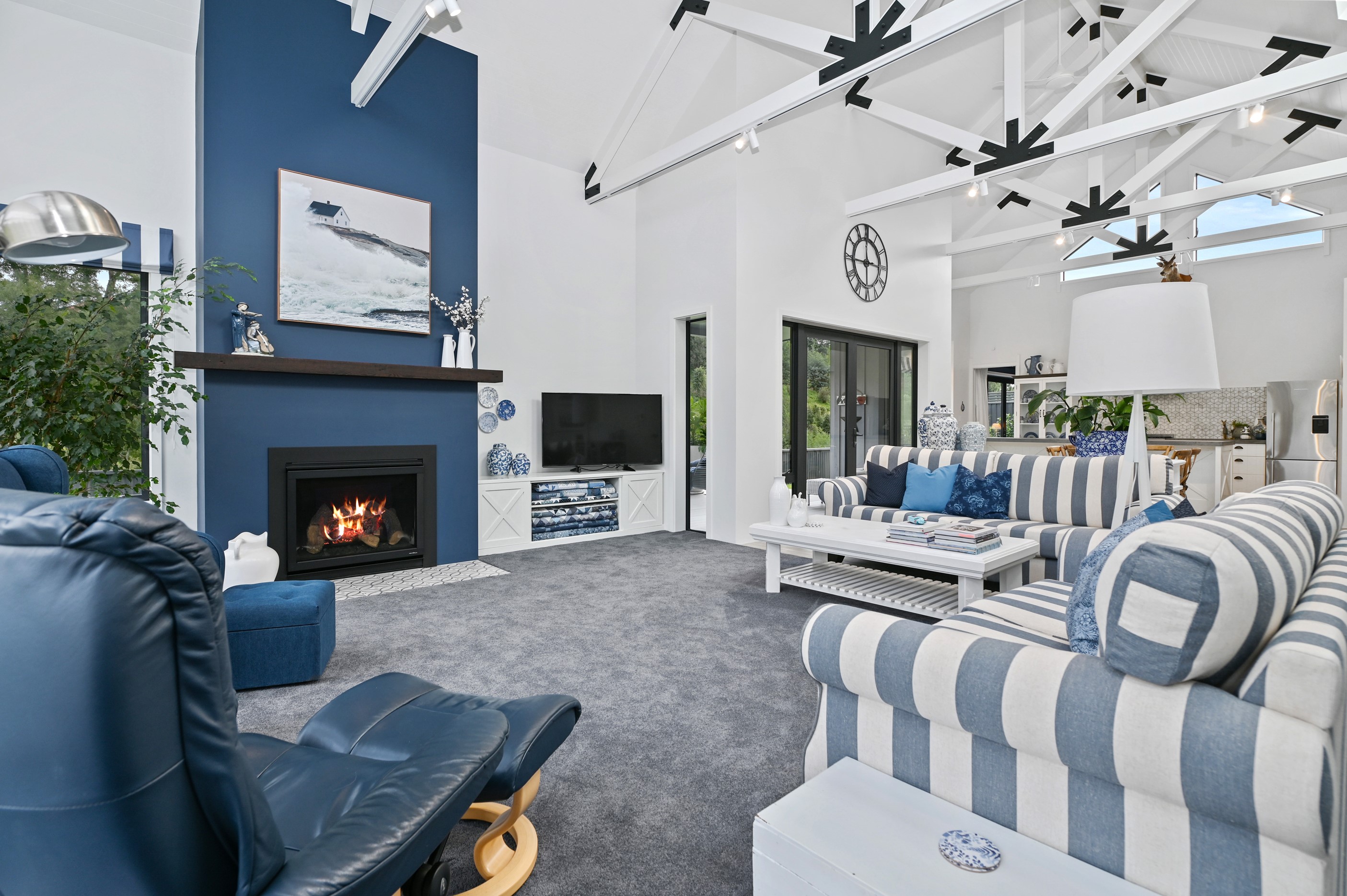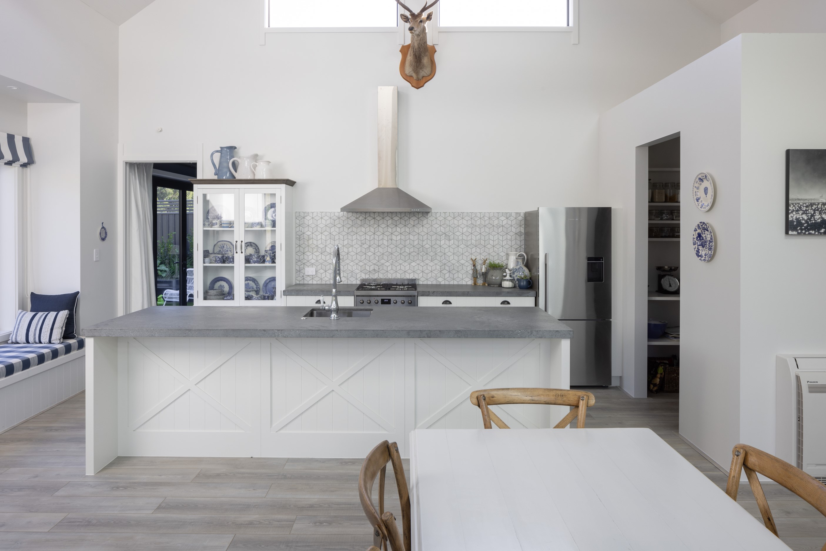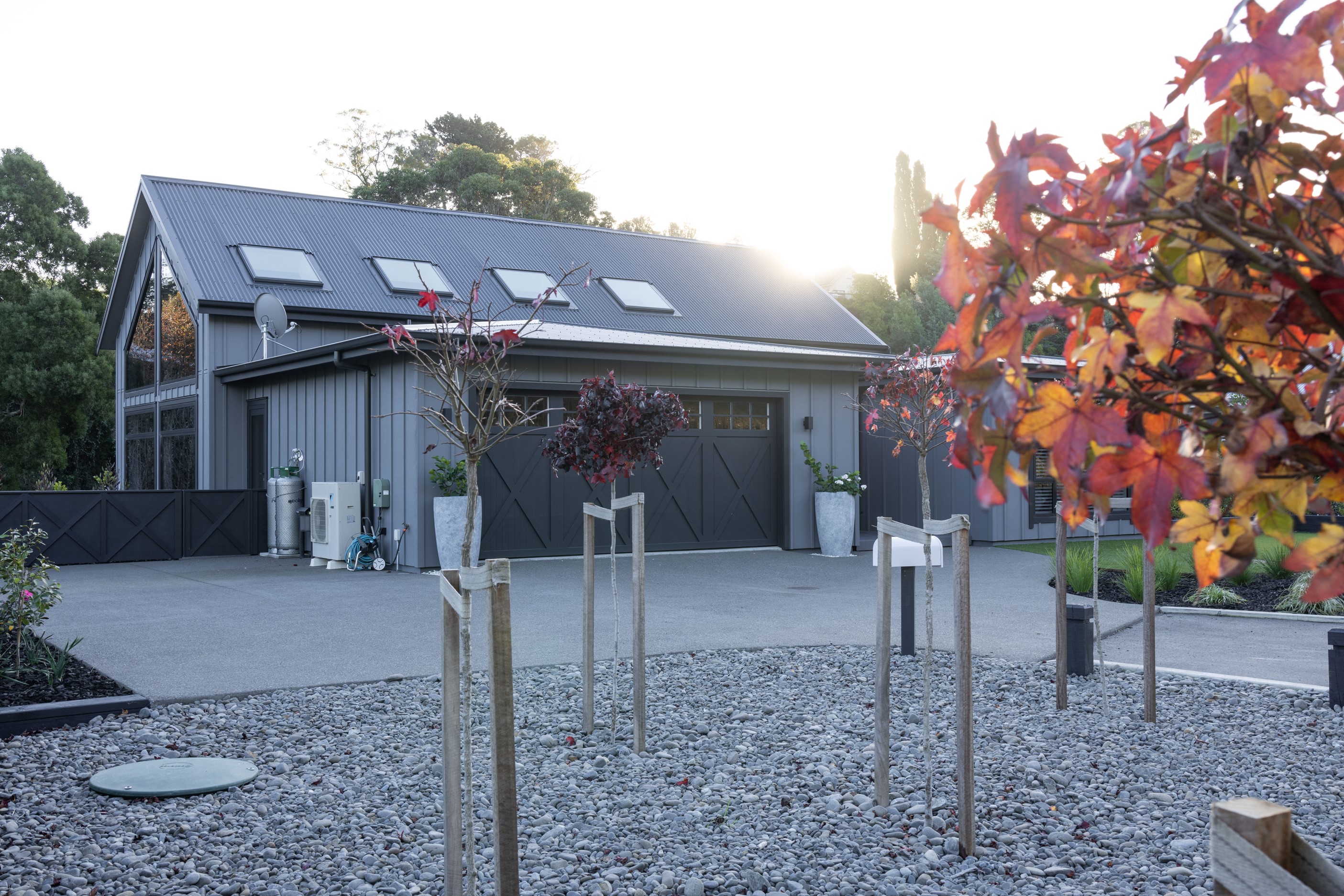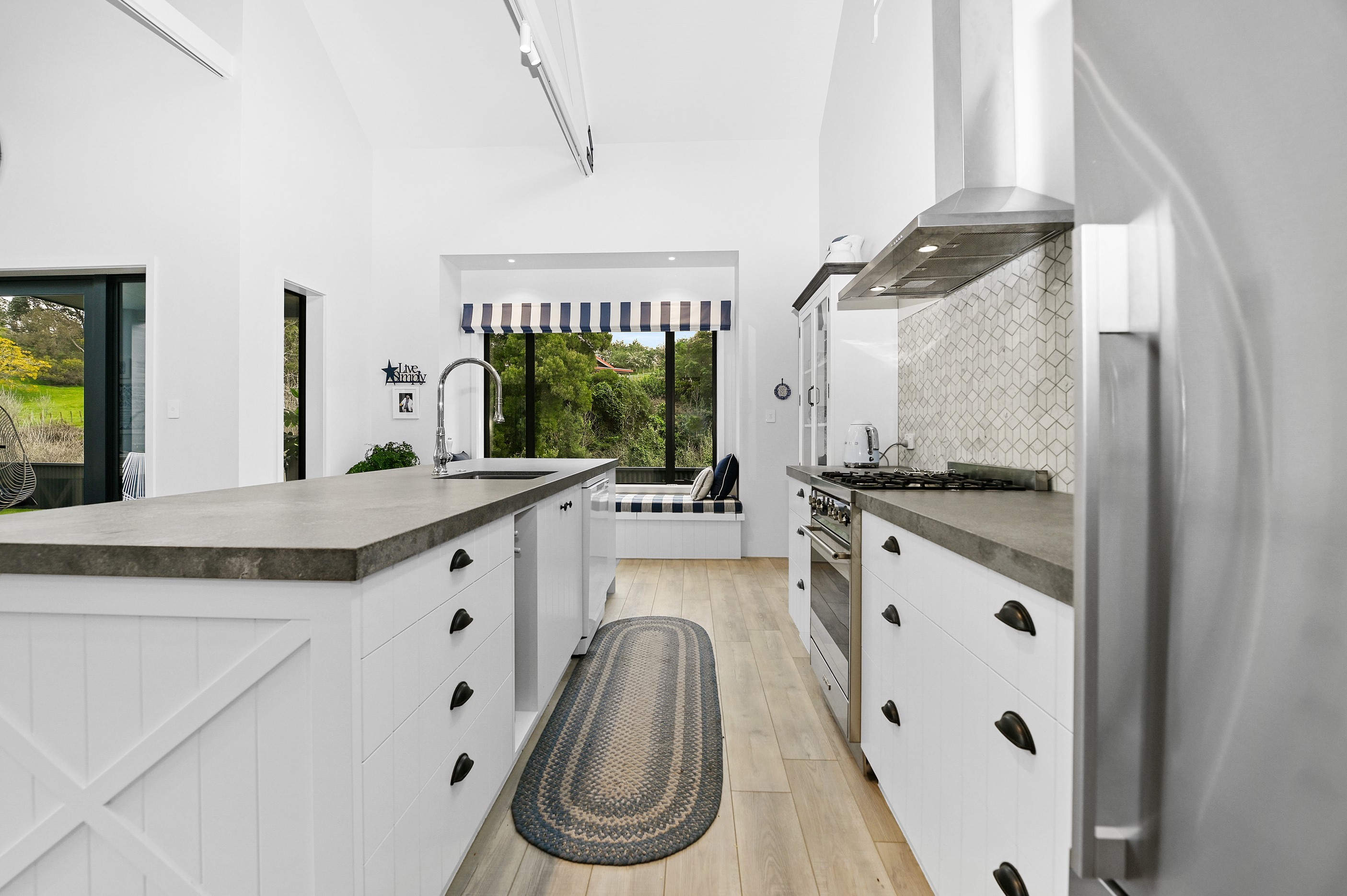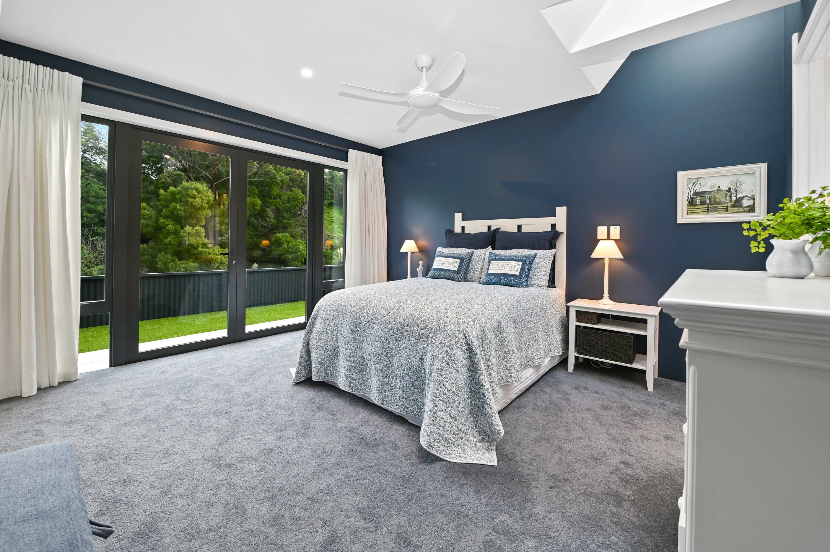 Nestled amid bush-clad hills, this Havelock North home provides a lovely place to dwell, linger and connect with friends and family. Slate blue-grey cladding, charcoal joinery and corrugated roofing lend understated elegance to the exterior. This is enhanced by rock work, landscaping and sculptures placed on the front lawn. Step inside, and the two-bedroom 194sqm home is light, bright and airy. Vaulted ceilings, clerestory windows, skylights and expanses of glazing usher in an abundance of natural light. The palette of white walls and ceilings, blue feature walls, grey carpet and timber floors is a natural and neutral offering. The open-plan design combines the kitchen, dining and living spaces, all of which are crowned by a lofty ceiling with exposed trusses. In the kitchen, stone benchtops and a sizeable island provide the cook with plenty of workspace, as well as the ability to connect with guests and the views. A window seat is a great place for friends to relax. Roof windows illuminate the main bedroom, which boasts a generous walk-in wardrobe and ensuite with a tiled shower. Lingering in this stylish home is a pleasure.