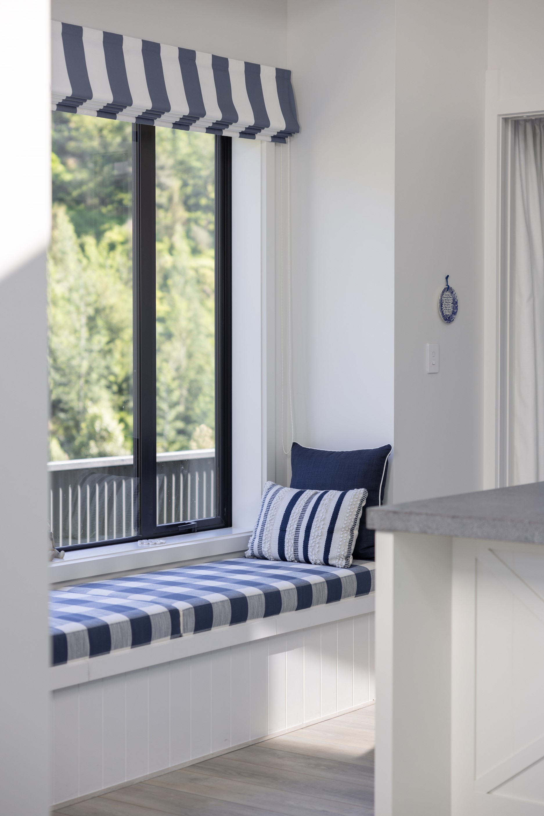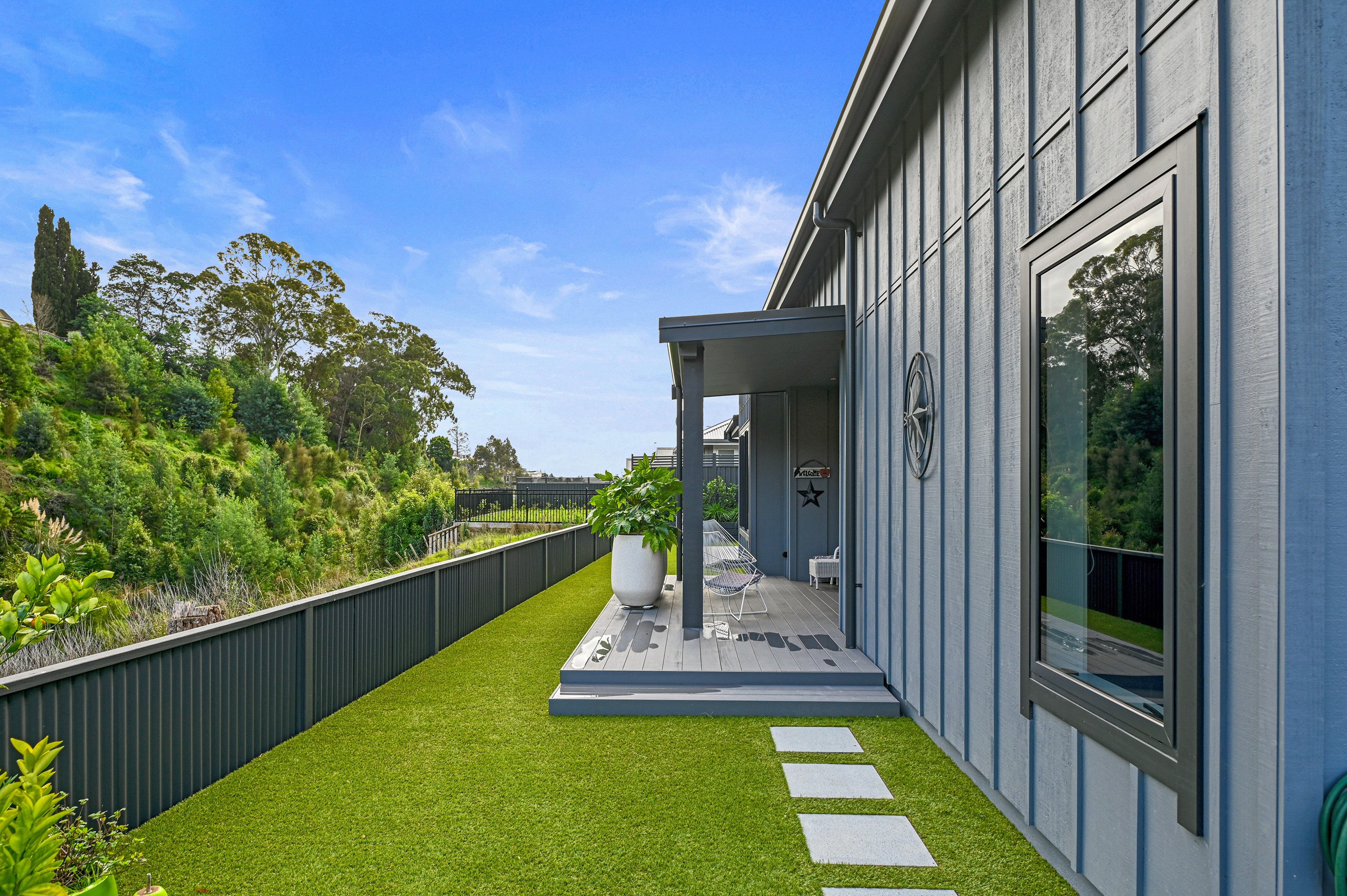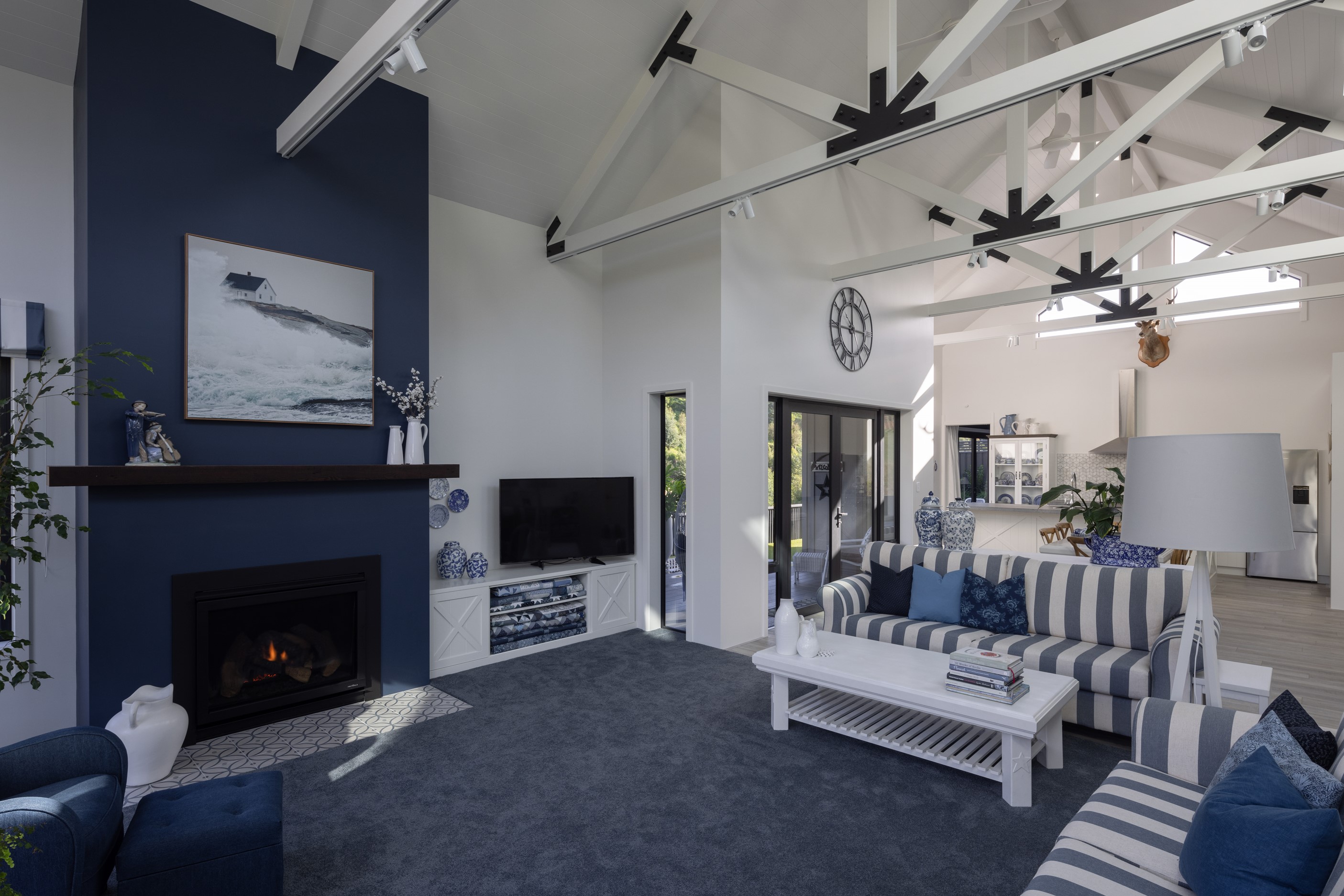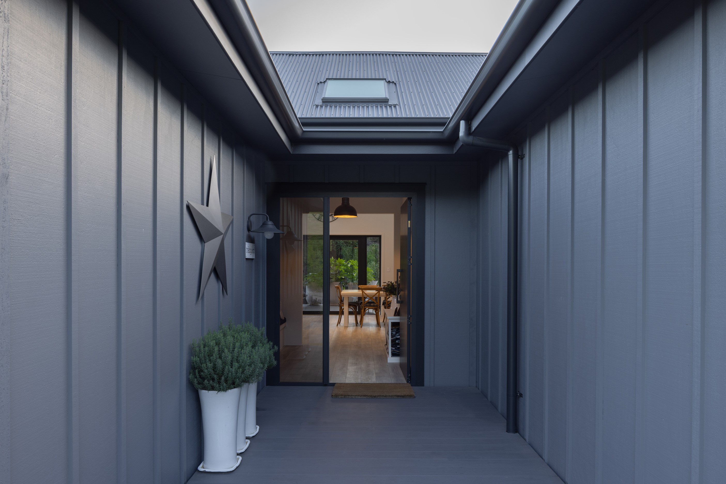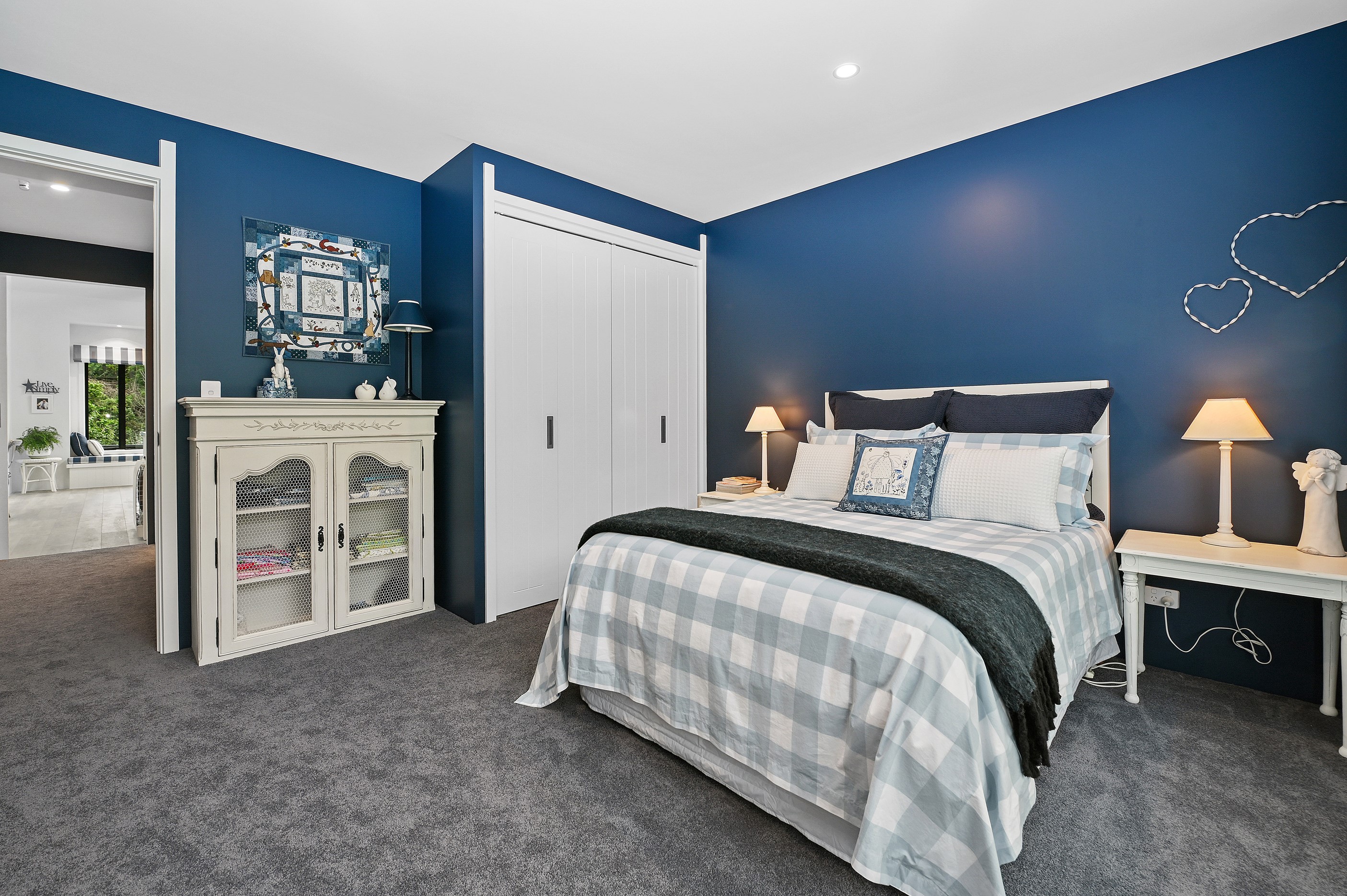 Nestled amid bush-clad hills, this Havelock North home provides a lovely place to dwell, linger and connect with friends and family. Slate blue-grey cladding, charcoal joinery and corrugated roofing lend understated elegance to the exterior. This is enhanced by rock work, landscaping and sculptures placed on the front lawn. Step inside, and the two-bedroom 194sqm home is light, bright and airy. Vaulted ceilings, clerestory windows, skylights and expanses of glazing usher in an abundance of natural light. The palette of white walls and ceilings, blue feature walls, grey carpet and timber floors is a natural and neutral offering. The open-plan design combines the kitchen, dining and living spaces, all of which are crowned by a lofty ceiling with exposed trusses. In the kitchen, stone benchtops and a sizeable island provide the cook with plenty of workspace, as well as the ability to connect with guests and the views. A window seat is a great place for friends to relax. Roof windows illuminate the main bedroom, which boasts a generous walk-in wardrobe and ensuite with a tiled shower. Lingering in this stylish home is a pleasure.