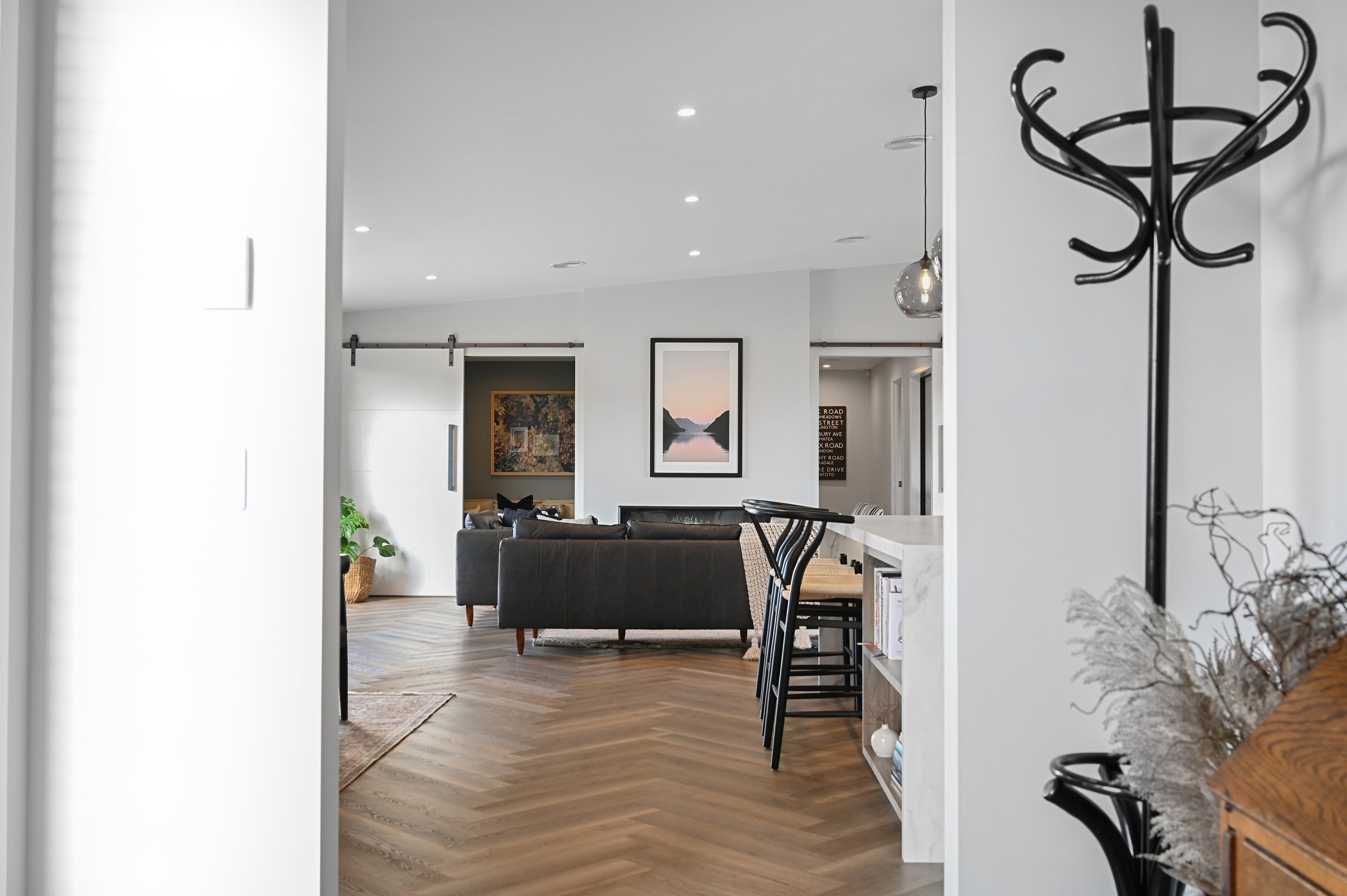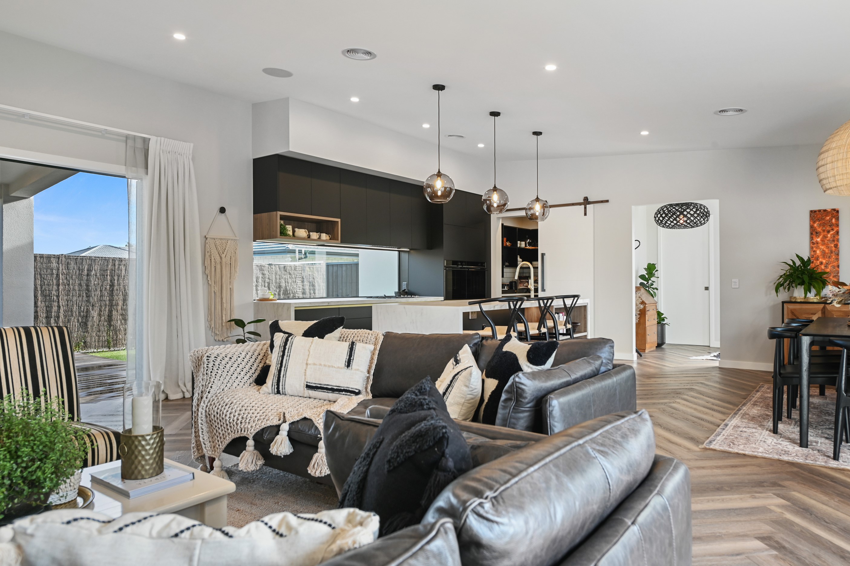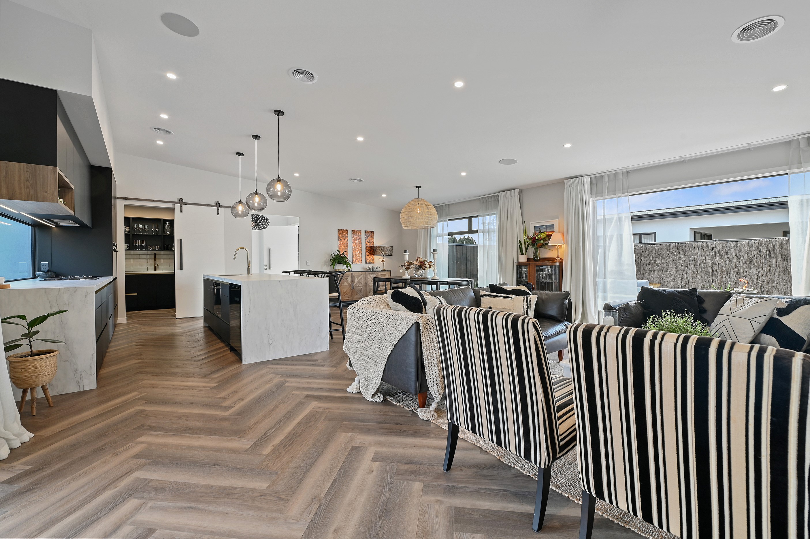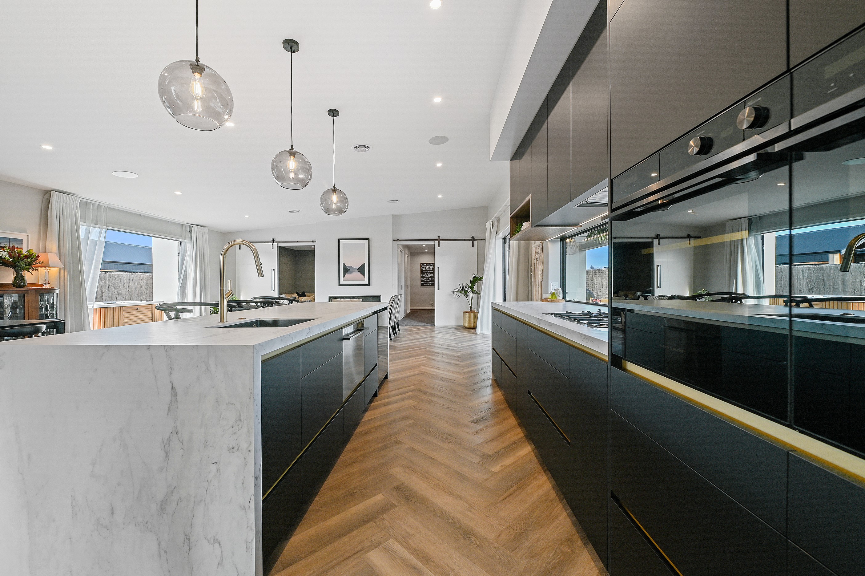 In this house, the lines between indoors and out have been blurred beautifully. The kitchen, dining and living areas open to decks on both sides of the 255sqm home. On one side there’s a patio with a spa pool; on the other, a portico with everything needed for alfresco dining and relaxing. It’s seamless. This is Gearey Homes’ second build for the owners, who are now empty nesters. They wanted open-plan living and indoor-outdoor flow radiating from a large kitchen. These spaces are beautifully presented with herringbone flooring, and are designed for entertaining. Four bedrooms and two bathrooms make this house ideal for visiting friends and family. You’ll also find a media lounge behind barn-style doors. This house is warm, too. With a ducted heat pump, air-conditioning and gas fire, temperatures are constant and comfortable. The clients enjoy travelling and wanted a place they could lock up and leave. What could be more easy-care than hardwood decking, and plaster and stained timber cladding with cavity systems? The building team is rightly proud of the quality and workmanship throughout the Hawke’s Bay residence, which provides the owners everything they need.