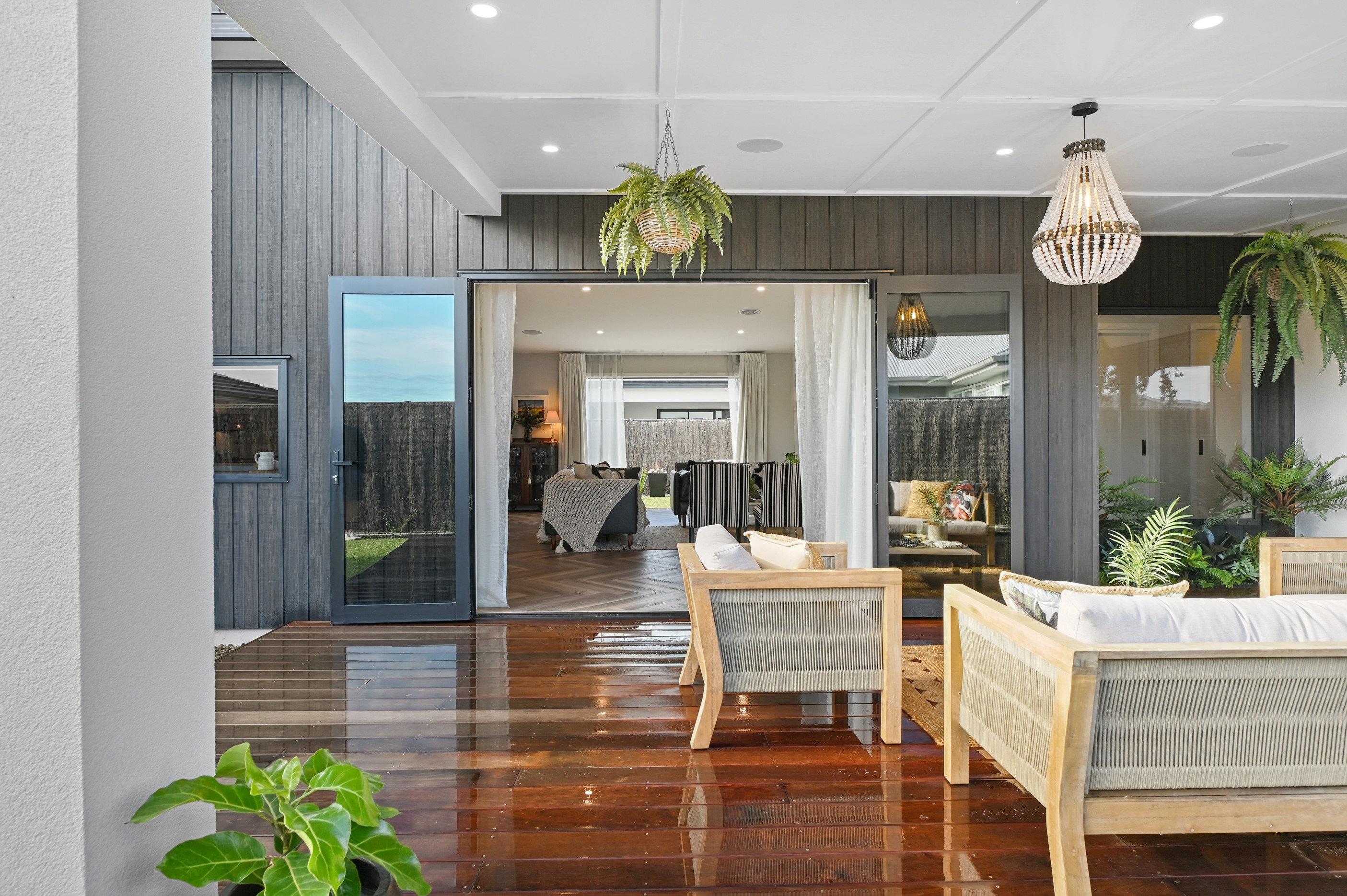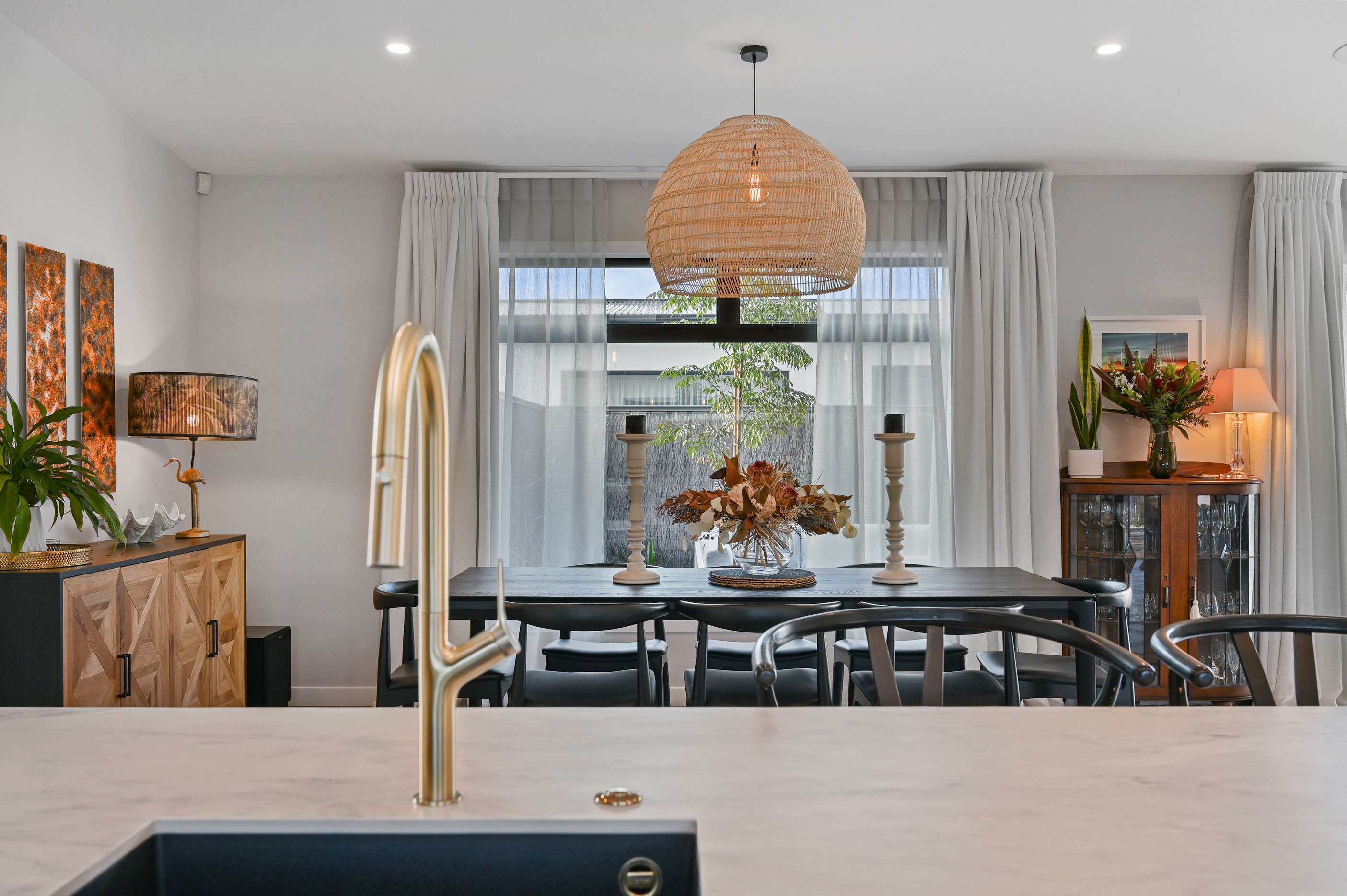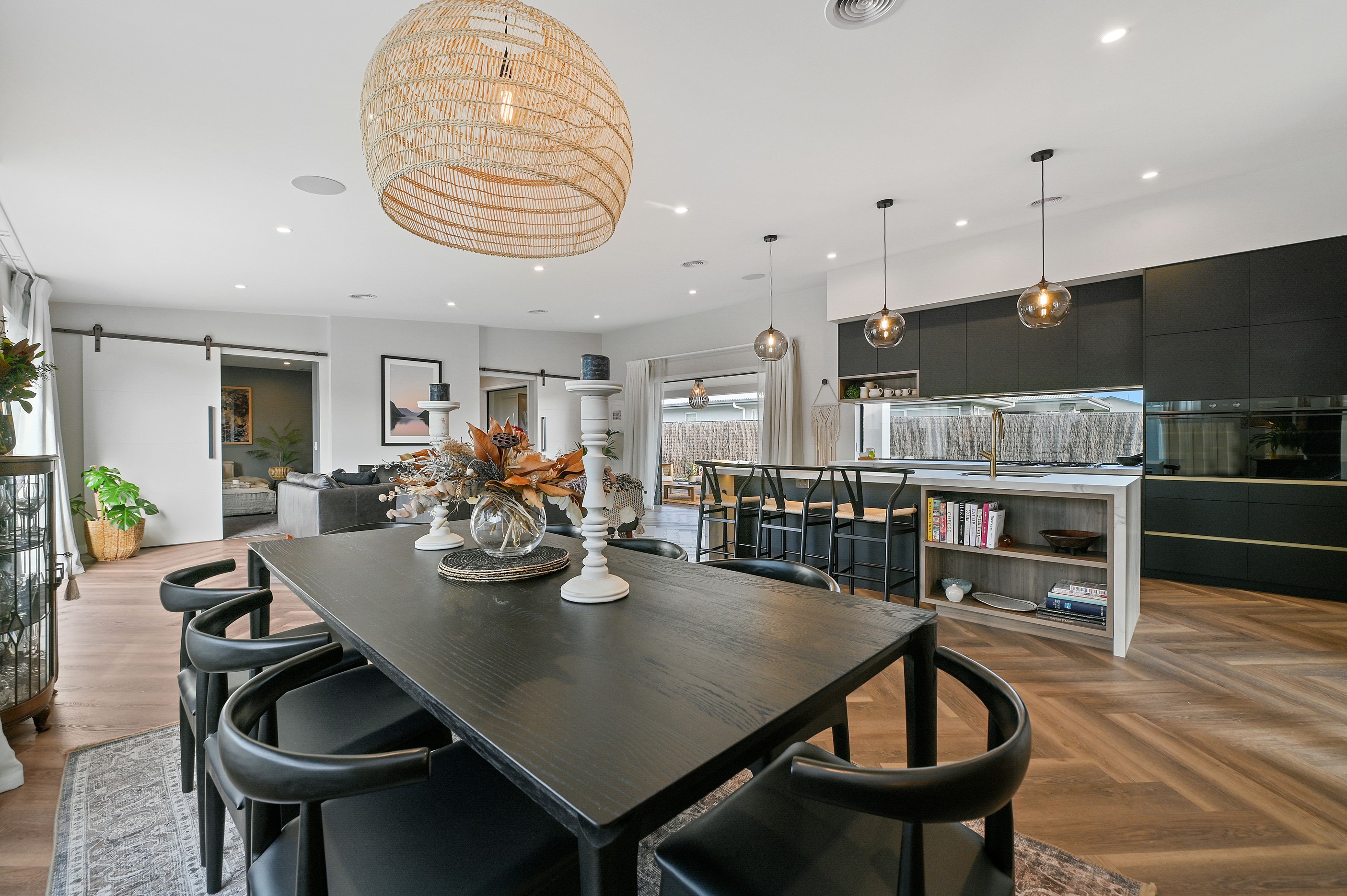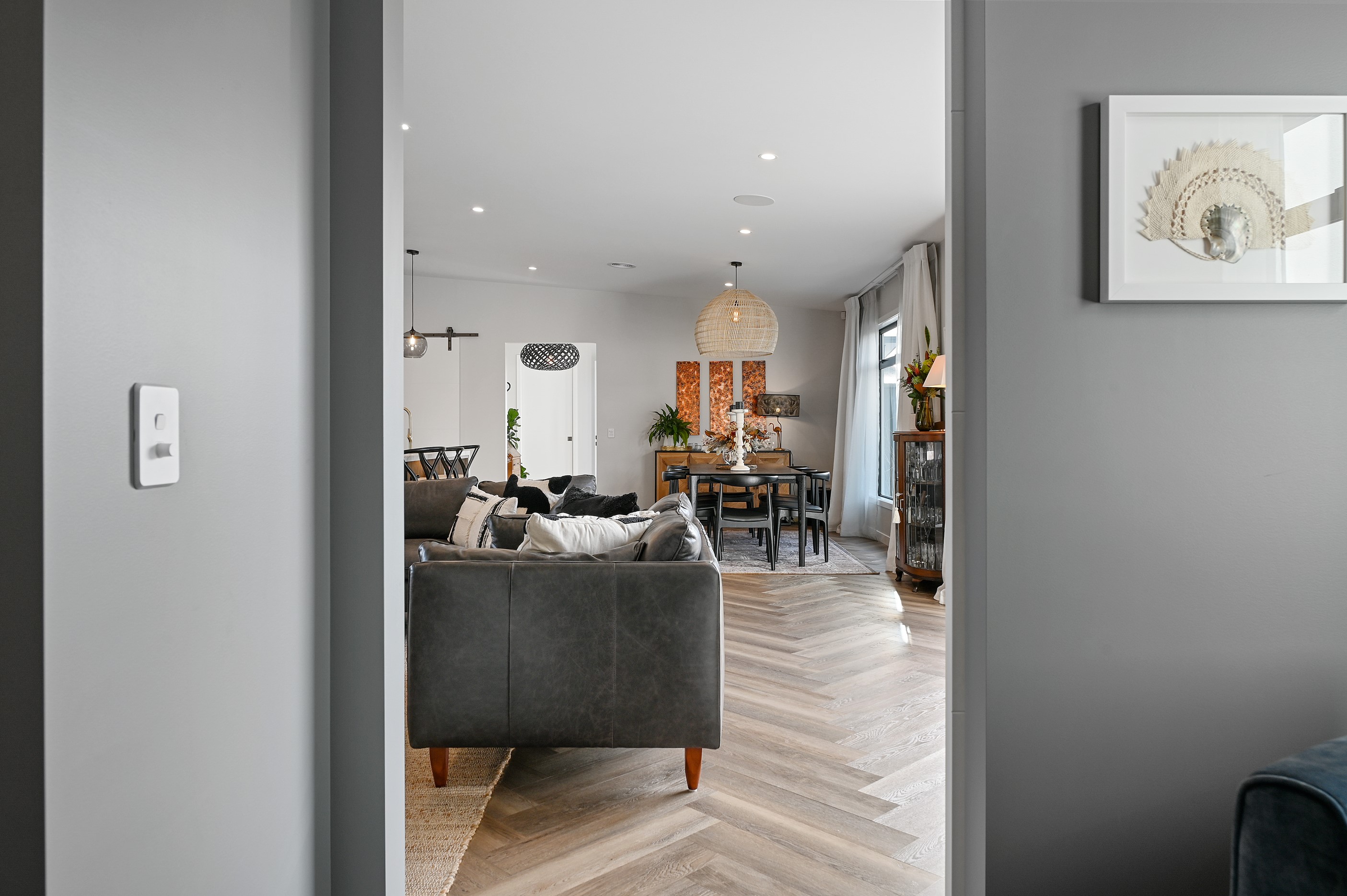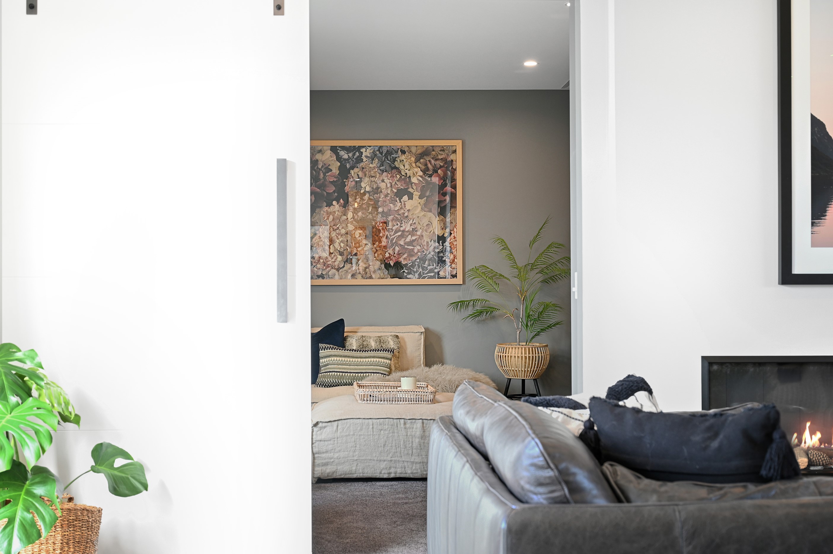 In this house, the lines between indoors and out have been blurred beautifully. The kitchen, dining and living areas open to decks on both sides of the 255sqm home. On one side there’s a patio with a spa pool; on the other, a portico with everything needed for alfresco dining and relaxing. It’s seamless. This is Gearey Homes’ second build for the owners, who are now empty nesters. They wanted open-plan living and indoor-outdoor flow radiating from a large kitchen. These spaces are beautifully presented with herringbone flooring, and are designed for entertaining. Four bedrooms and two bathrooms make this house ideal for visiting friends and family. You’ll also find a media lounge behind barn-style doors. This house is warm, too. With a ducted heat pump, air-conditioning and gas fire, temperatures are constant and comfortable. The clients enjoy travelling and wanted a place they could lock up and leave. What could be more easy-care than hardwood decking, and plaster and stained timber cladding with cavity systems? The building team is rightly proud of the quality and workmanship throughout the Hawke’s Bay residence, which provides the owners everything they need.