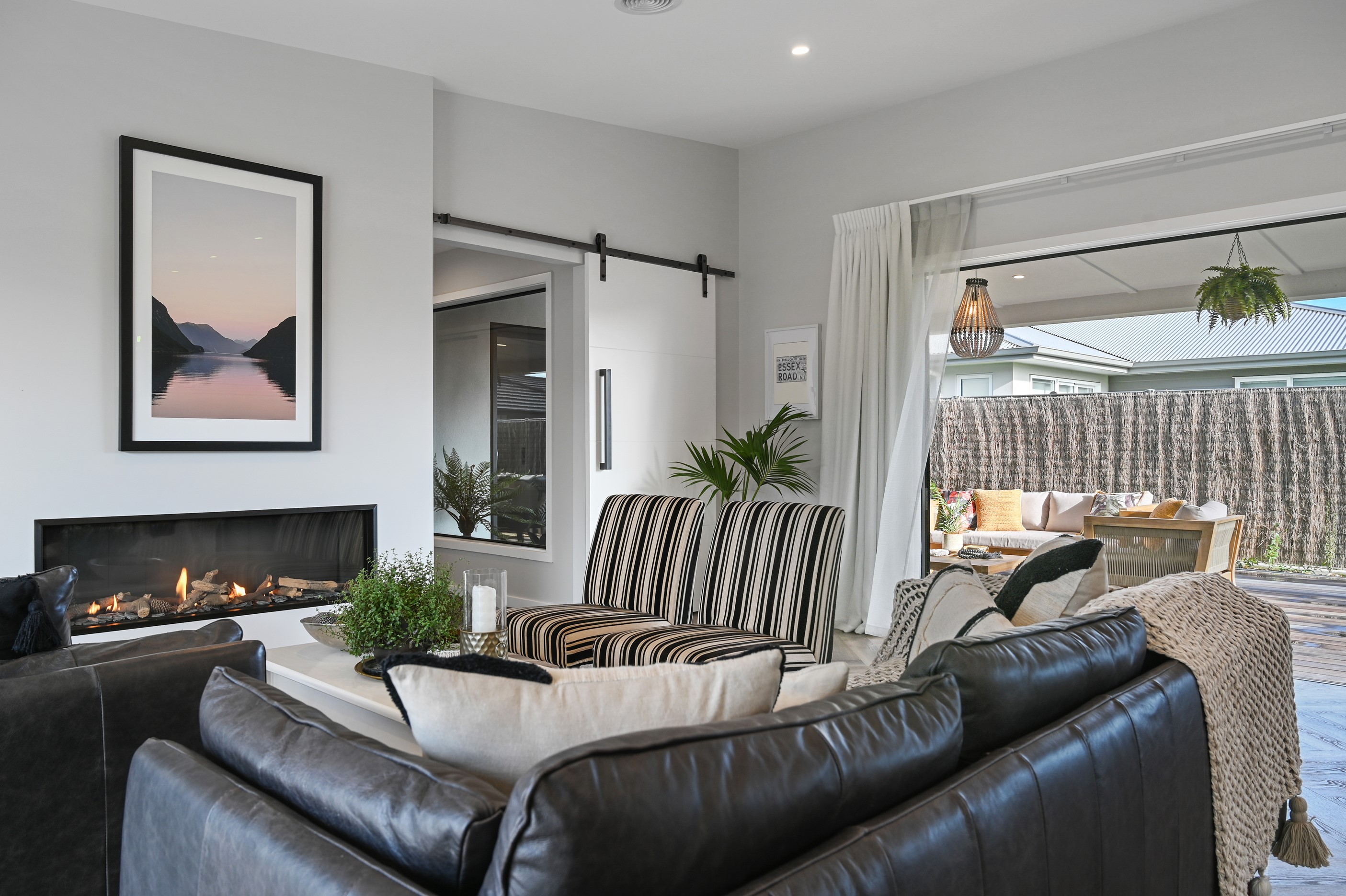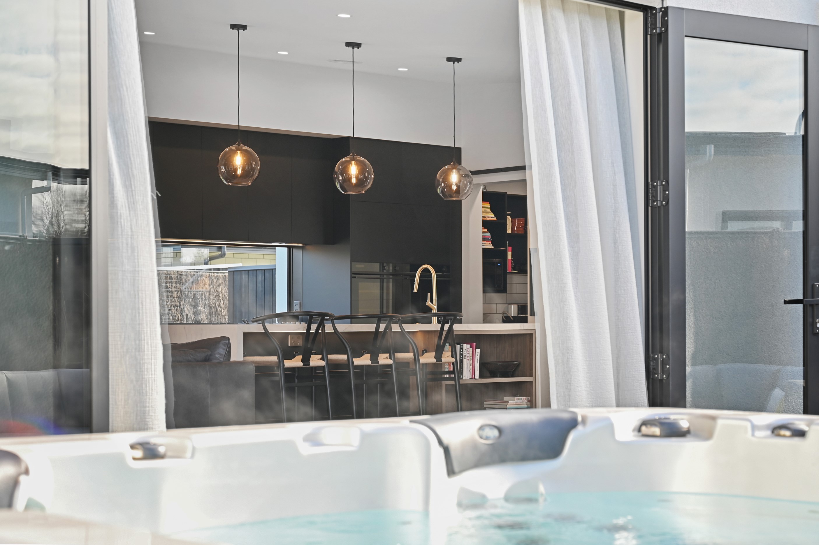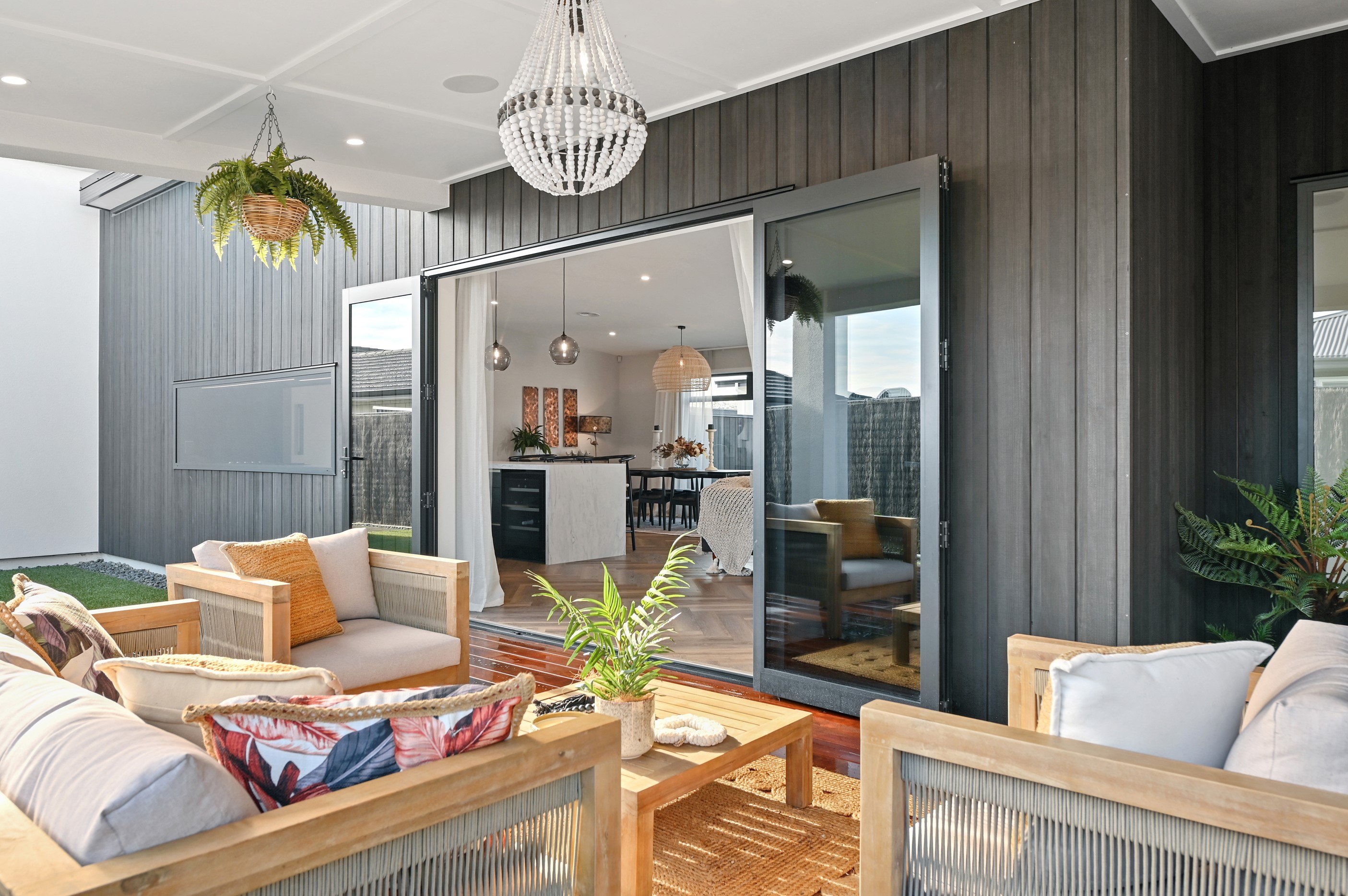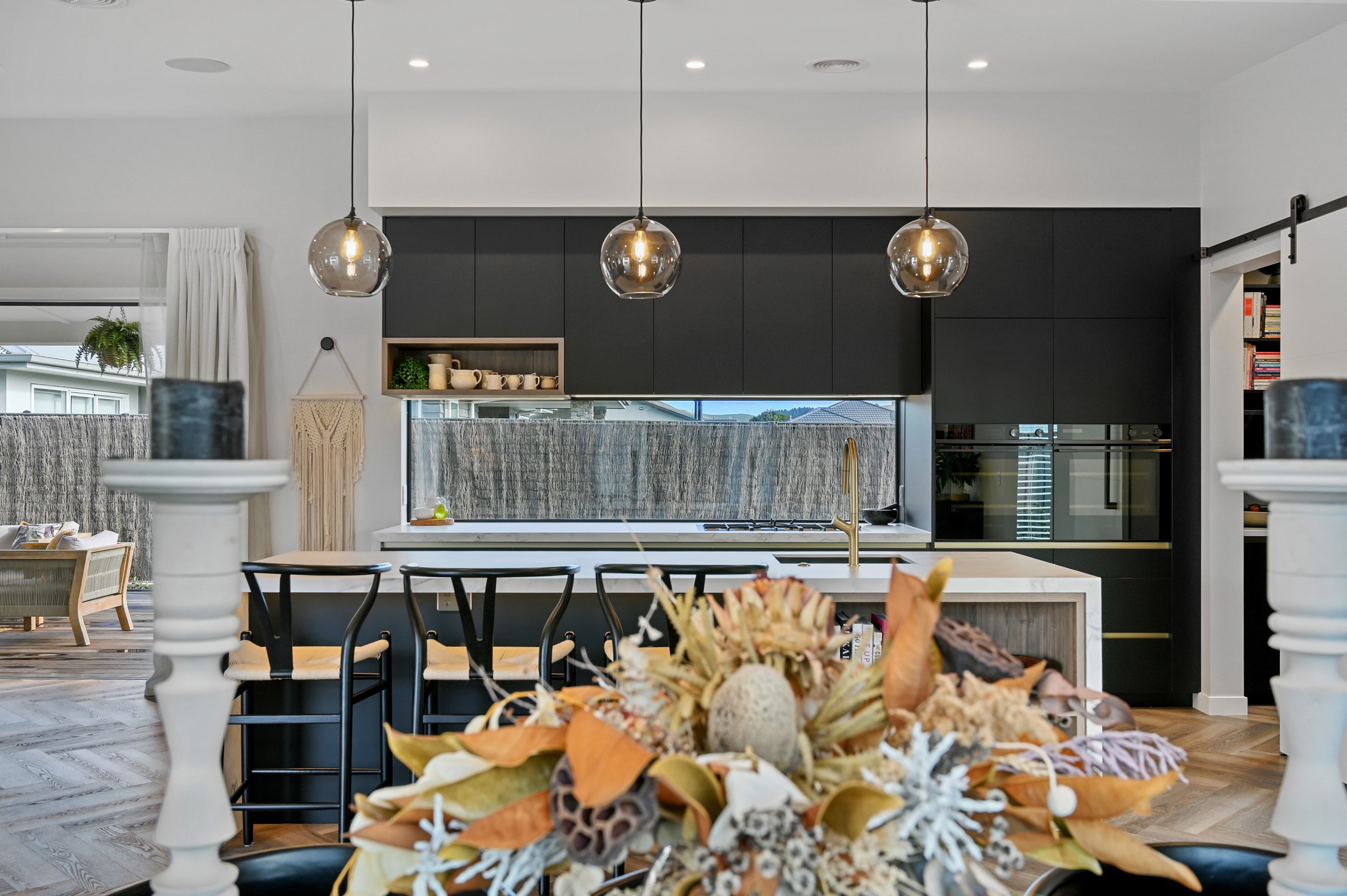 In this house, the lines between indoors and out have been blurred beautifully. The kitchen, dining and living areas open to decks on both sides of the 255sqm home. On one side there’s a patio with a spa pool; on the other, a portico with everything needed for alfresco dining and relaxing. It’s seamless. This is Gearey Homes’ second build for the owners, who are now empty nesters. They wanted open-plan living and indoor-outdoor flow radiating from a large kitchen. These spaces are beautifully presented with herringbone flooring, and are designed for entertaining. Four bedrooms and two bathrooms make this house ideal for visiting friends and family. You’ll also find a media lounge behind barn-style doors. This house is warm, too. With a ducted heat pump, air-conditioning and gas fire, temperatures are constant and comfortable. The clients enjoy travelling and wanted a place they could lock up and leave. What could be more easy-care than hardwood decking, and plaster and stained timber cladding with cavity systems? The building team is rightly proud of the quality and workmanship throughout the Hawke’s Bay residence, which provides the owners everything they need.