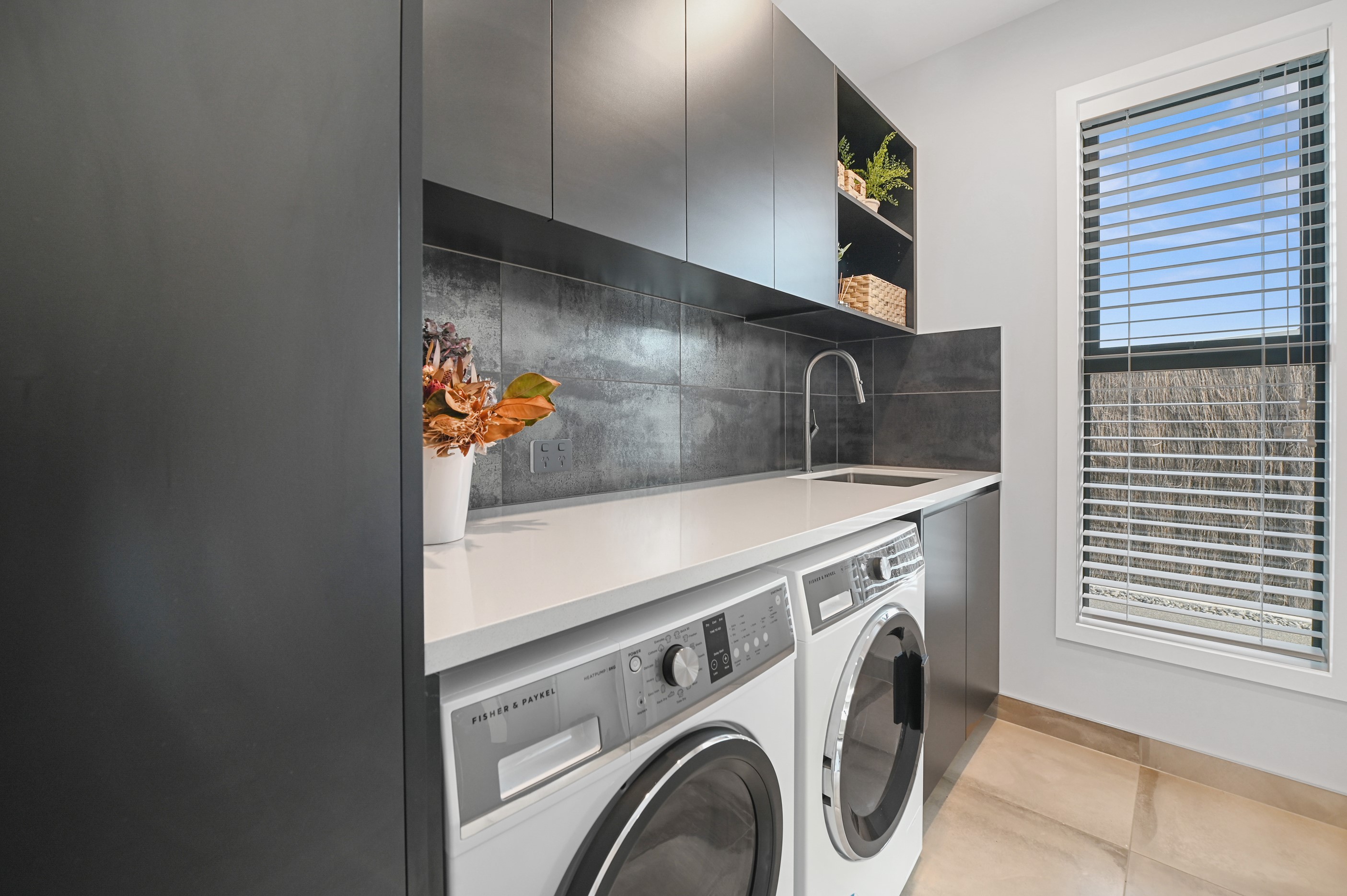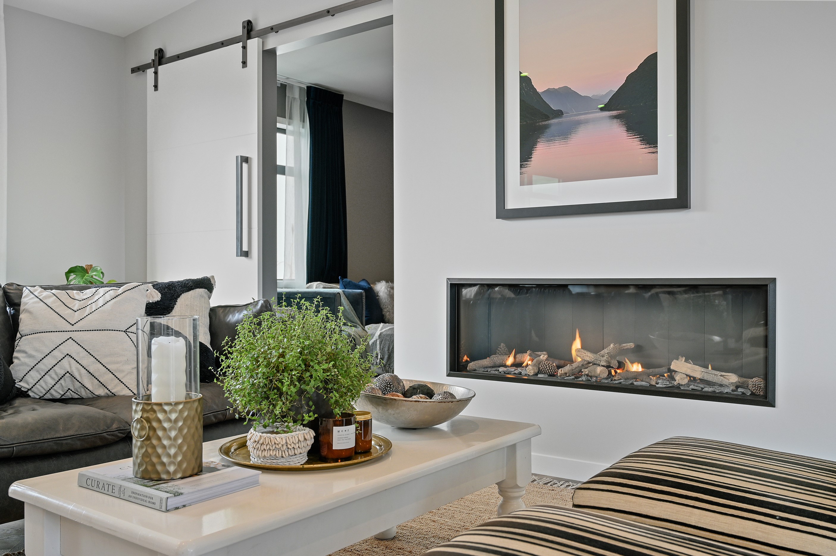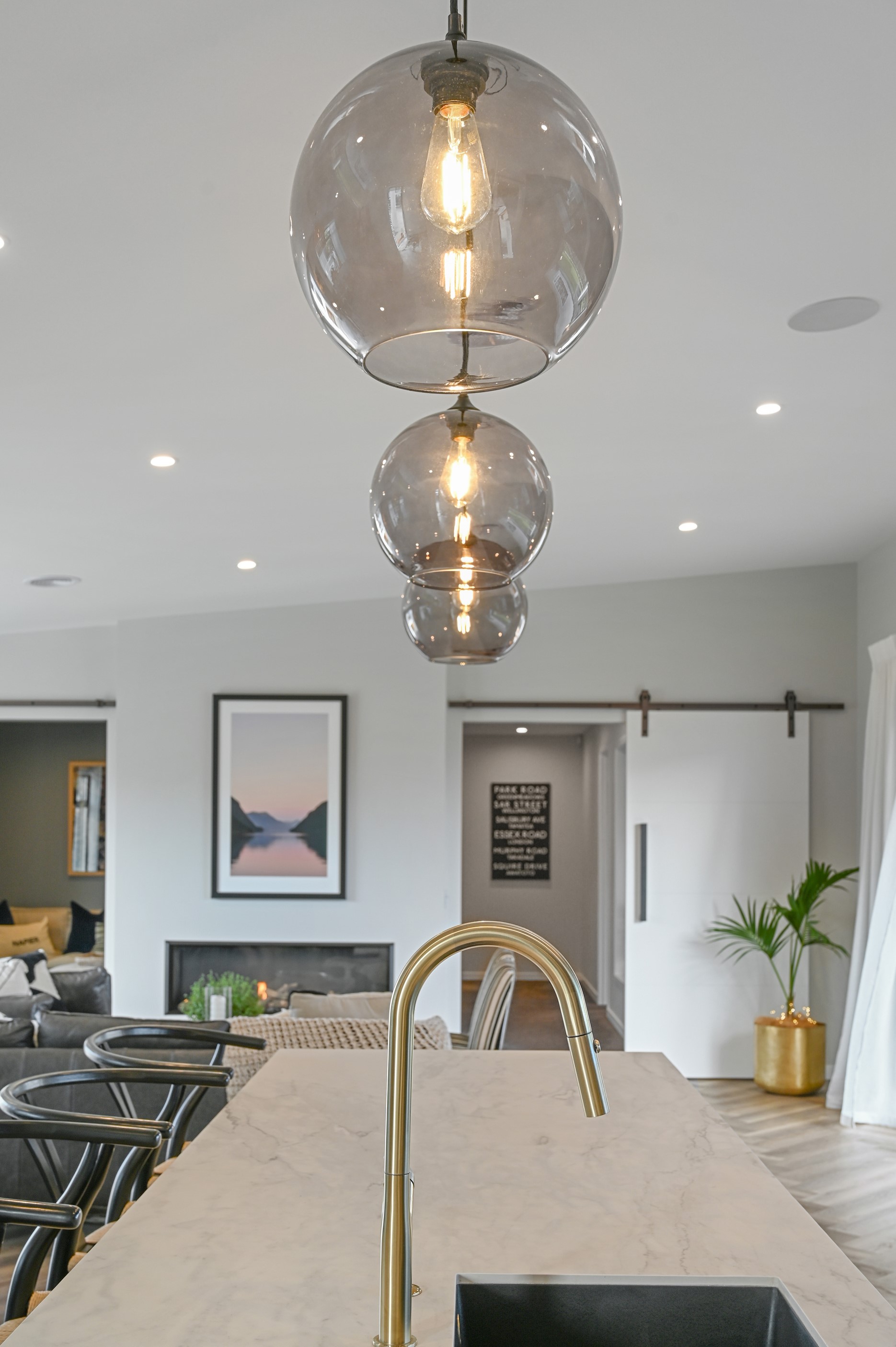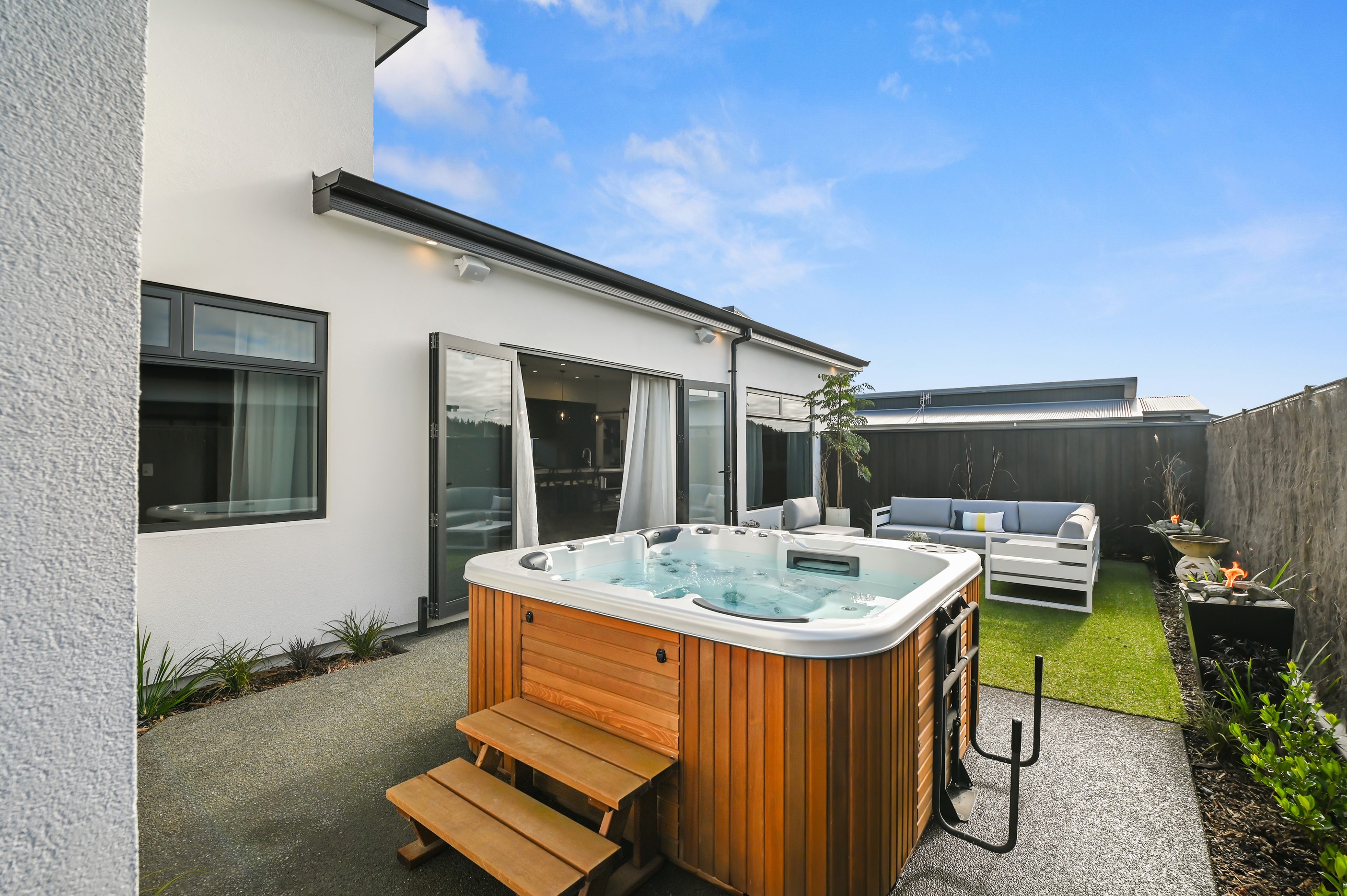 In this house, the lines between indoors and out have been blurred beautifully. The kitchen, dining and living areas open to decks on both sides of the 255sqm home. On one side there’s a patio with a spa pool; on the other, a portico with everything needed for alfresco dining and relaxing. It’s seamless. This is Gearey Homes’ second build for the owners, who are now empty nesters. They wanted open-plan living and indoor-outdoor flow radiating from a large kitchen. These spaces are beautifully presented with herringbone flooring, and are designed for entertaining. Four bedrooms and two bathrooms make this house ideal for visiting friends and family. You’ll also find a media lounge behind barn-style doors. This house is warm, too. With a ducted heat pump, air-conditioning and gas fire, temperatures are constant and comfortable. The clients enjoy travelling and wanted a place they could lock up and leave. What could be more easy-care than hardwood decking, and plaster and stained timber cladding with cavity systems? The building team is rightly proud of the quality and workmanship throughout the Hawke’s Bay residence, which provides the owners everything they need.