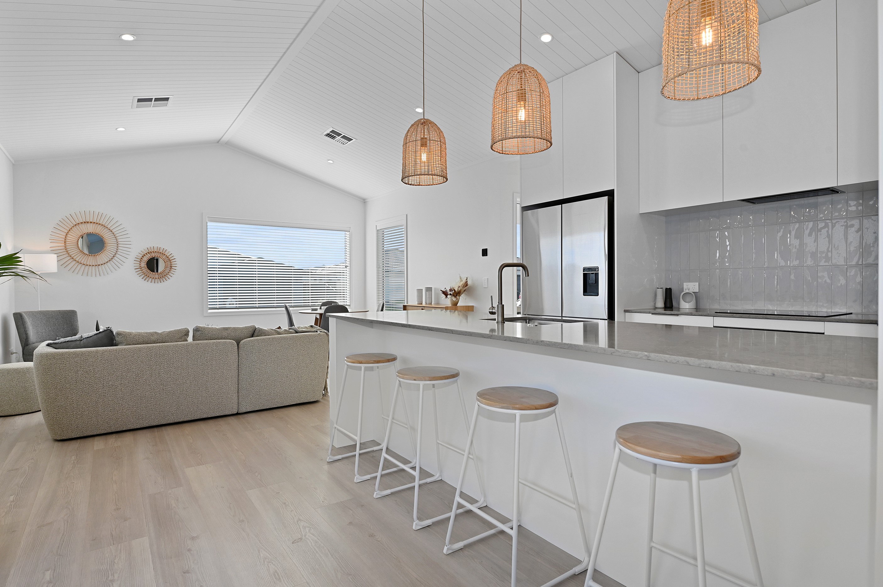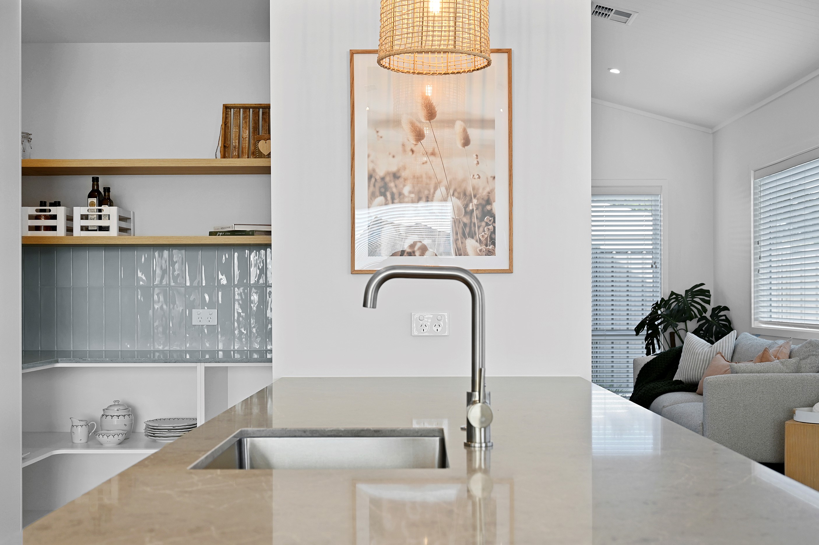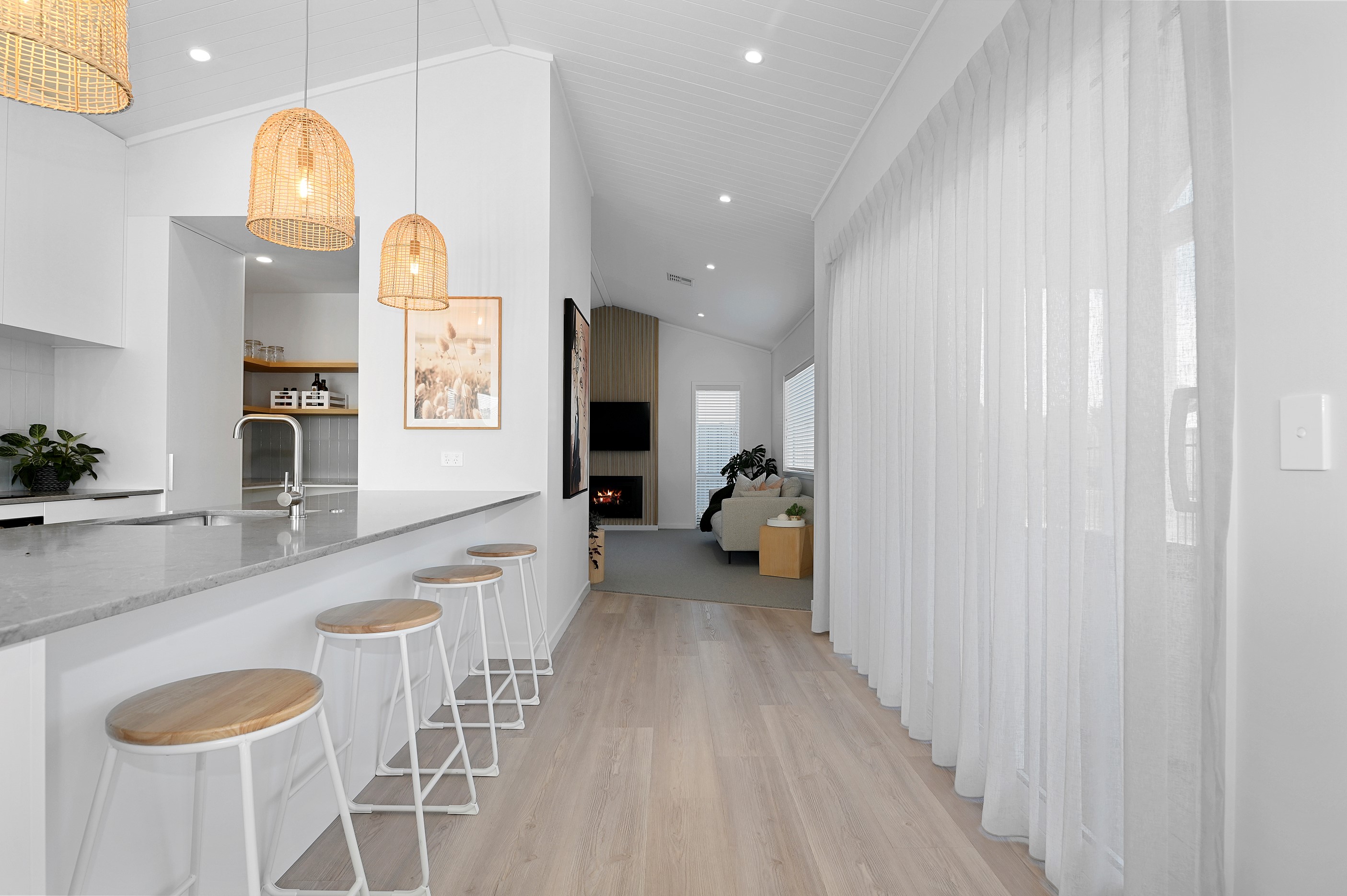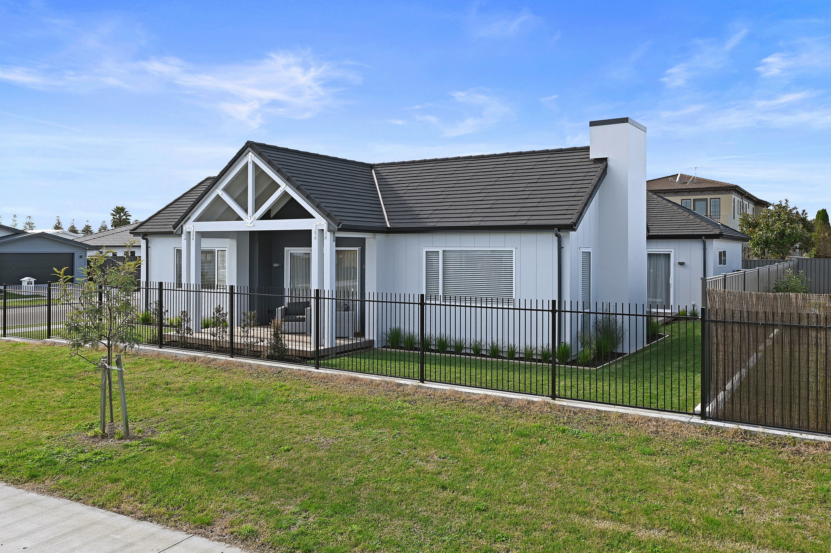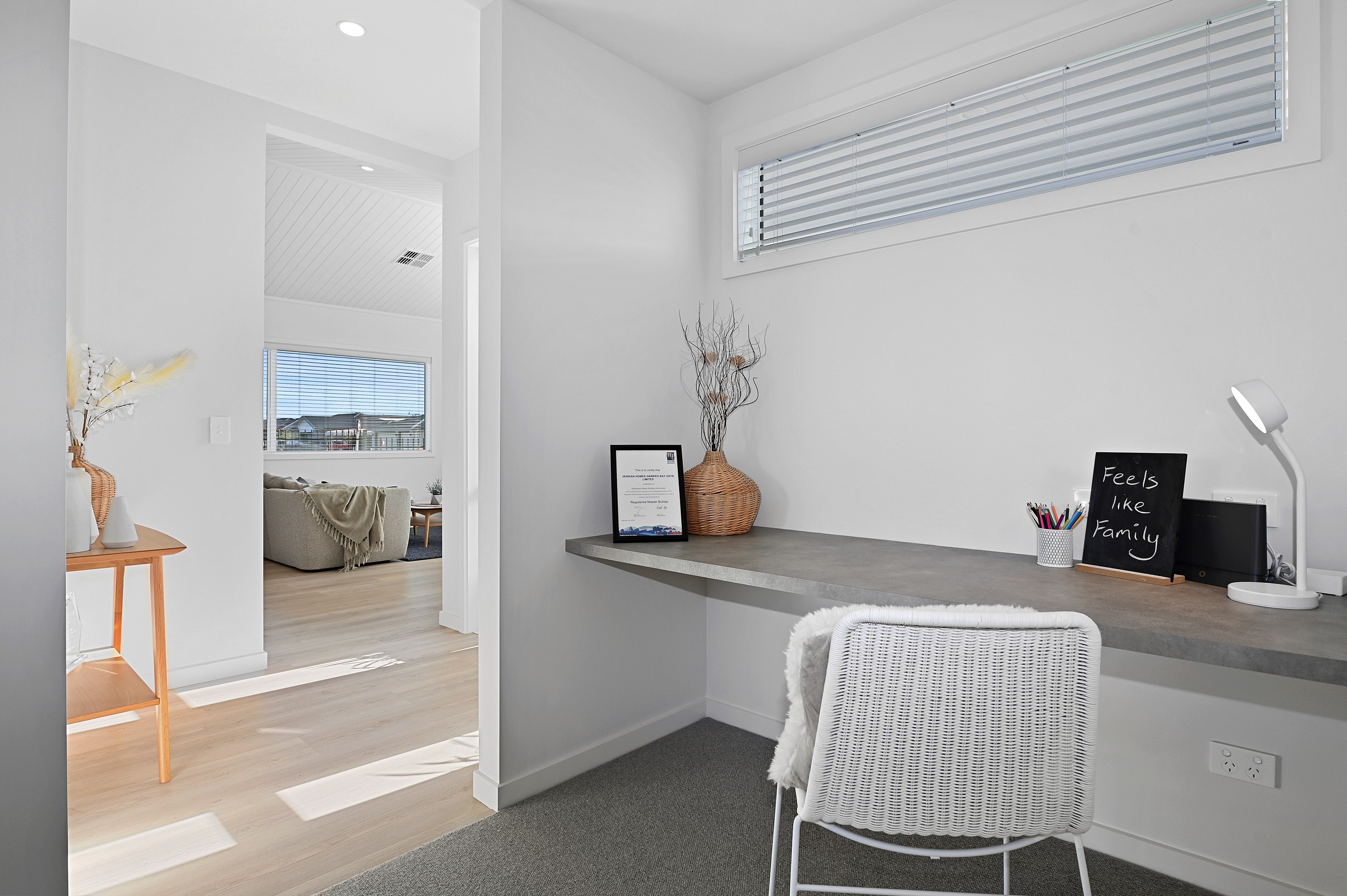 A tight corner section proved no problem for the skilled builders of this pavilion-style show home. Every millimetre has been used to best effect, and the result is a four-bedroom home that feels much larger than its 207sqm. A tasteful pared-back palette, pitched ceilings and lots of glazing also help engender a sense of space and airiness. Within the H-shaped footprint are two bathrooms, two living spaces and, at the heart, a white-on-white kitchen complete with a gleaming tiled splashback. This hub continues to an outdoor dining area under attractive exposed trusses. The outlook here takes in a neighbouring reserve. At the other end of this pavilion is a comfortable family room. Blonde timber furniture and fittings add to the home’s already sunny disposition. But muted tones don’t mean dull – far from it. In the main bedroom, which has a walk-in wardrobe and an ensuite, you’ll find a tongue-and-groove feature wall in a duck-egg hue. One of the bathrooms includes a soft blue-grey tiled feature wall that brings the standalone bath into focus. A study nook, double garage, sun-trap deck and undeniable street appeal complete the package.