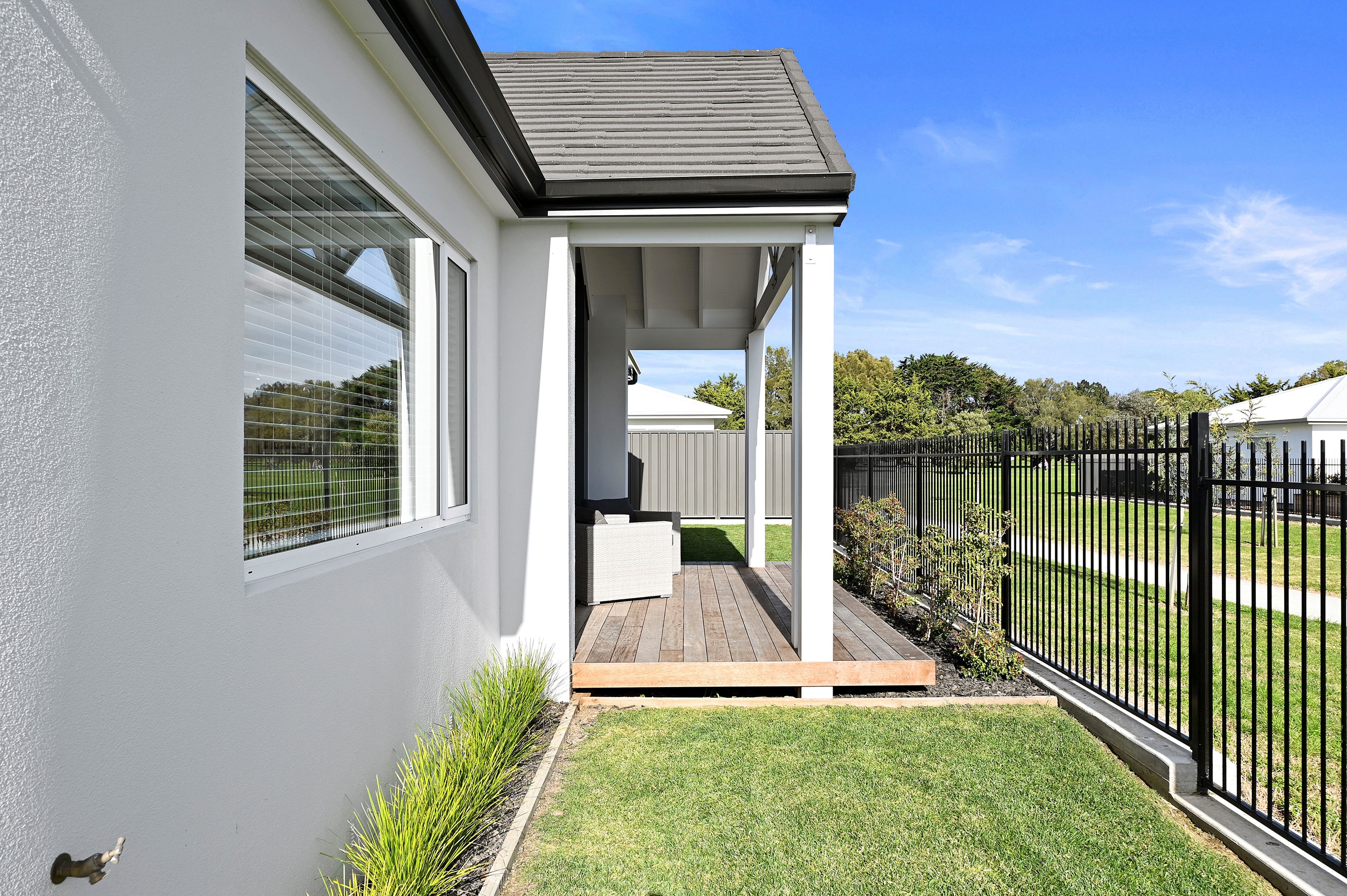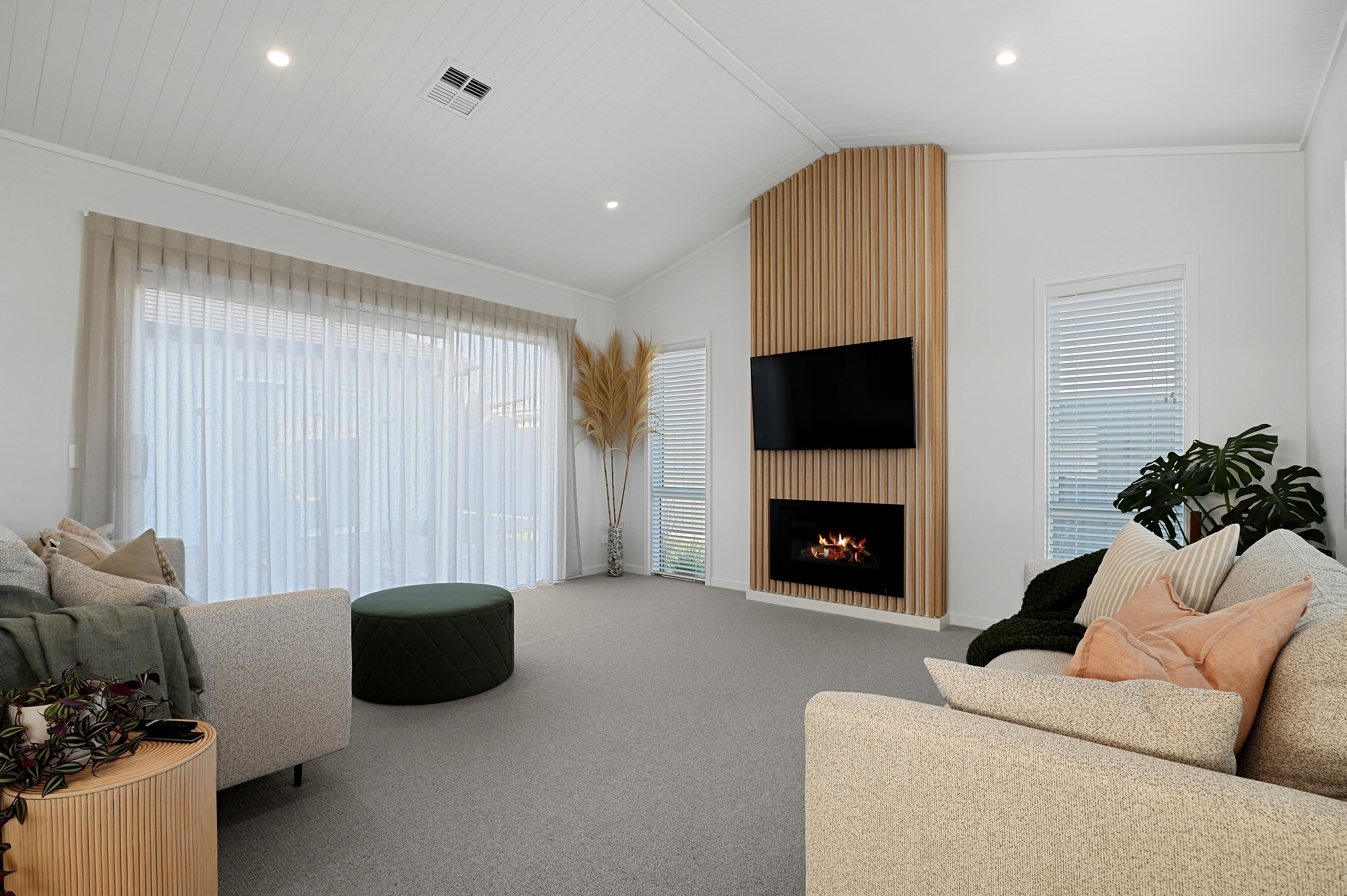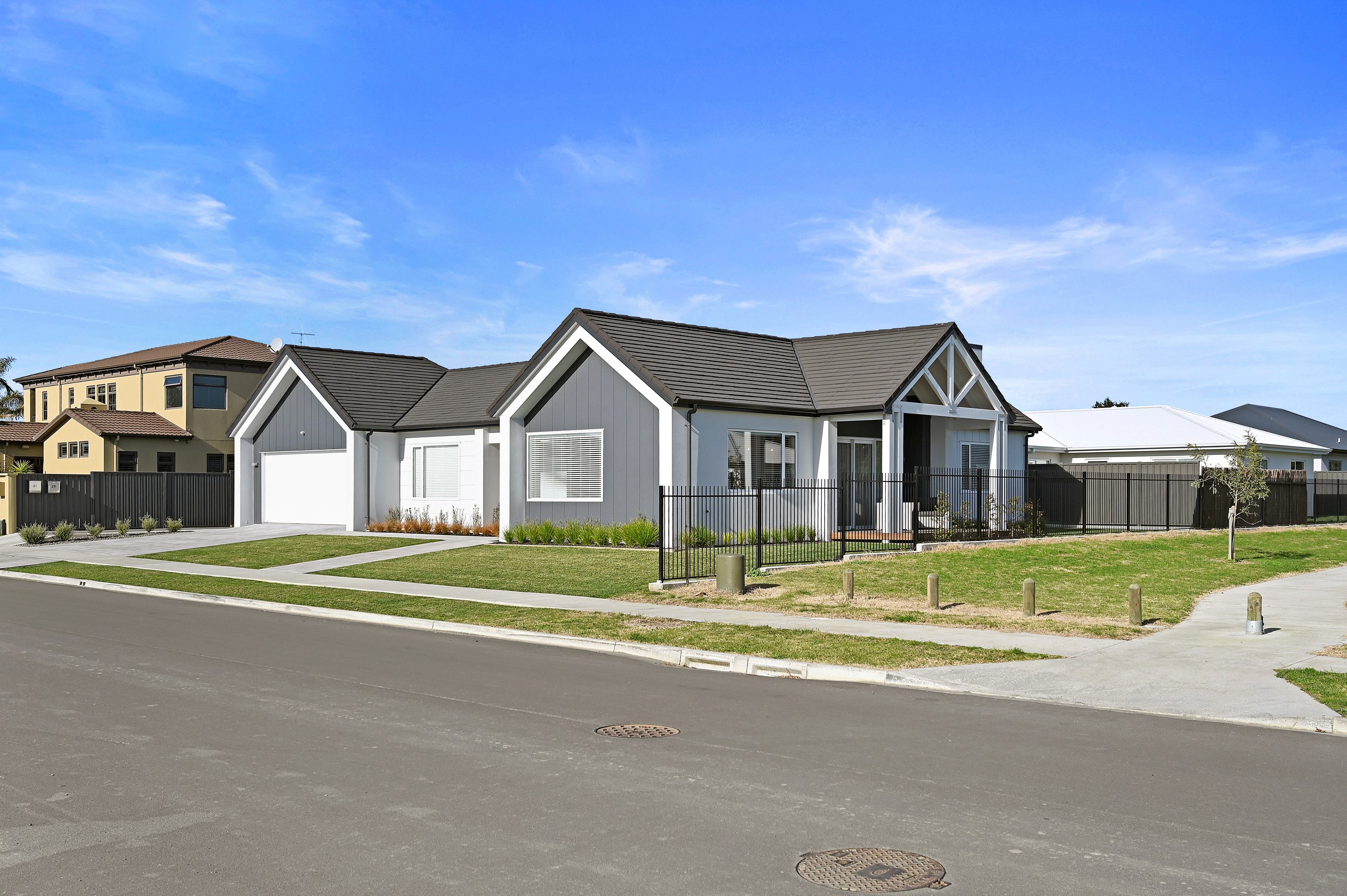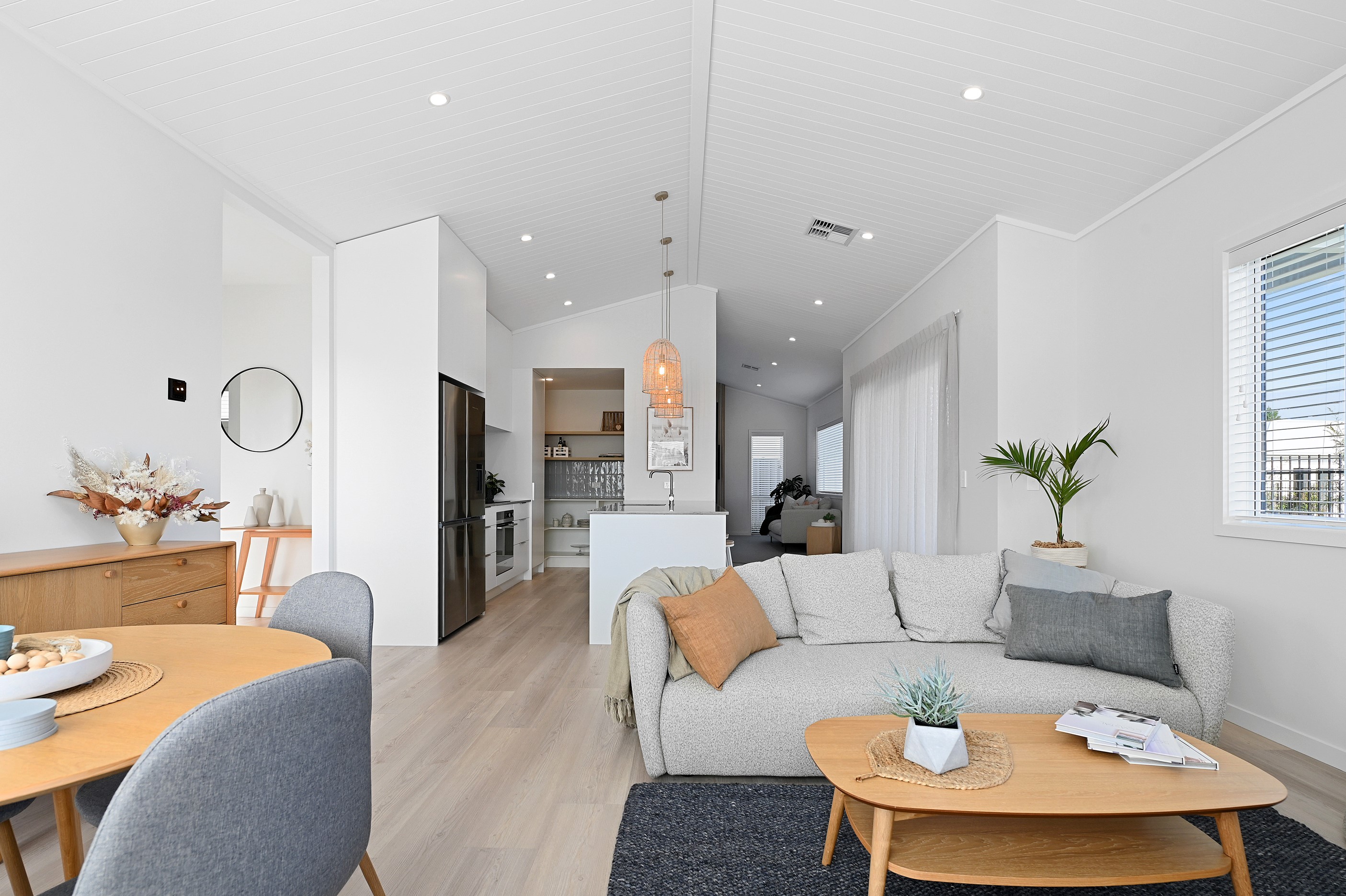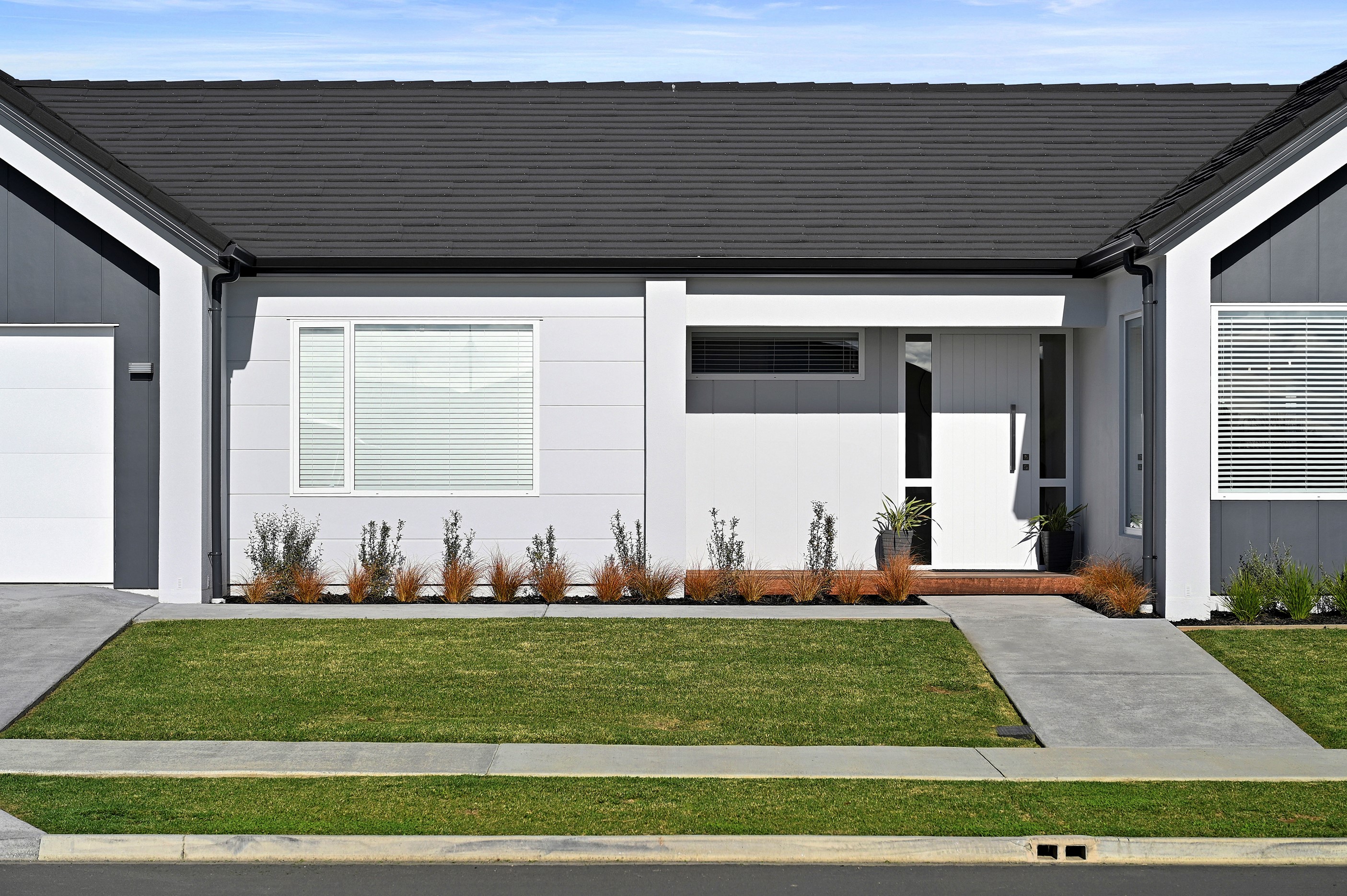 A tight corner section proved no problem for the skilled builders of this pavilion-style show home. Every millimetre has been used to best effect, and the result is a four-bedroom home that feels much larger than its 207sqm. A tasteful pared-back palette, pitched ceilings and lots of glazing also help engender a sense of space and airiness. Within the H-shaped footprint are two bathrooms, two living spaces and, at the heart, a white-on-white kitchen complete with a gleaming tiled splashback. This hub continues to an outdoor dining area under attractive exposed trusses. The outlook here takes in a neighbouring reserve. At the other end of this pavilion is a comfortable family room. Blonde timber furniture and fittings add to the home’s already sunny disposition. But muted tones don’t mean dull – far from it. In the main bedroom, which has a walk-in wardrobe and an ensuite, you’ll find a tongue-and-groove feature wall in a duck-egg hue. One of the bathrooms includes a soft blue-grey tiled feature wall that brings the standalone bath into focus. A study nook, double garage, sun-trap deck and undeniable street appeal complete the package.