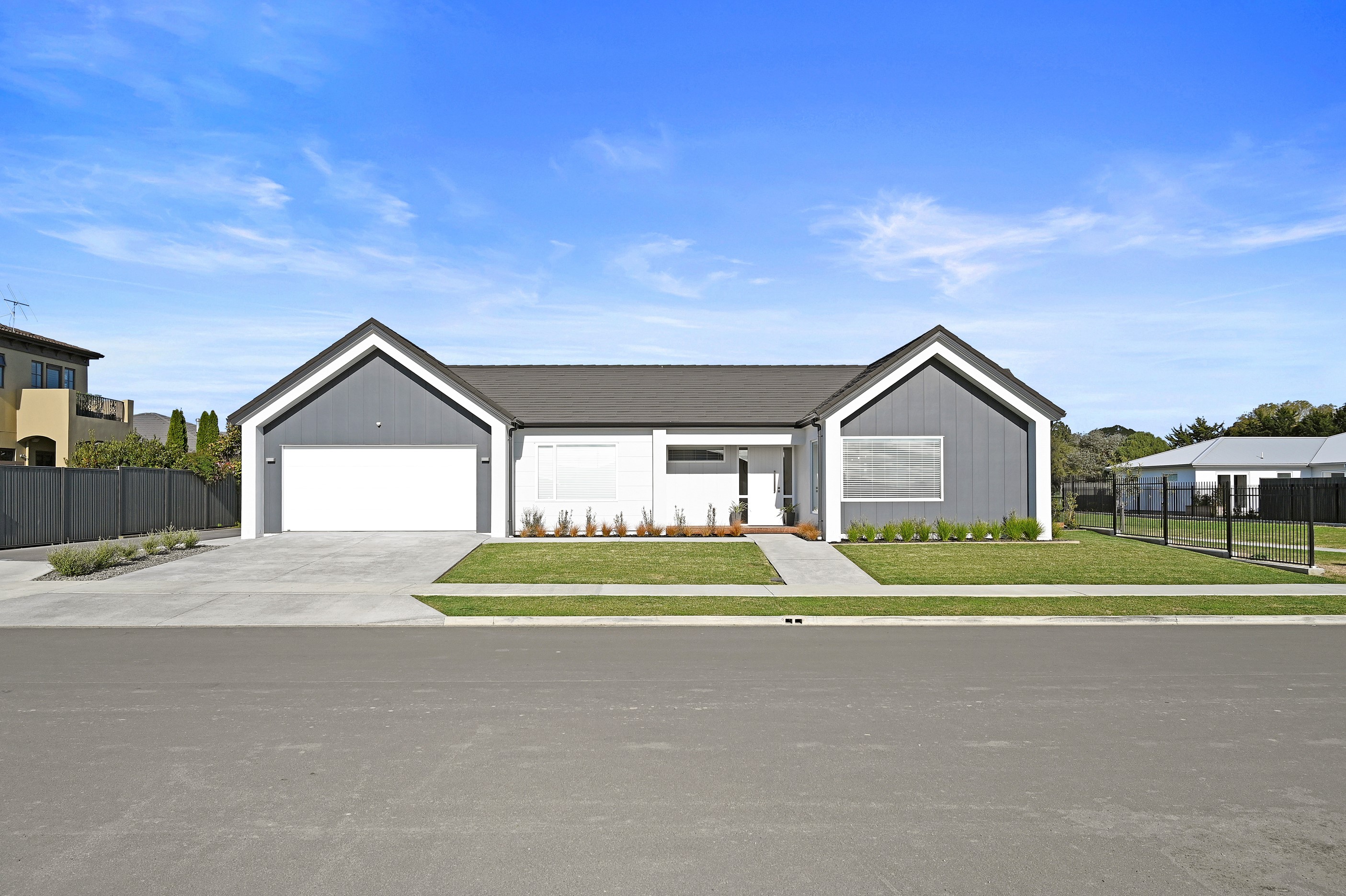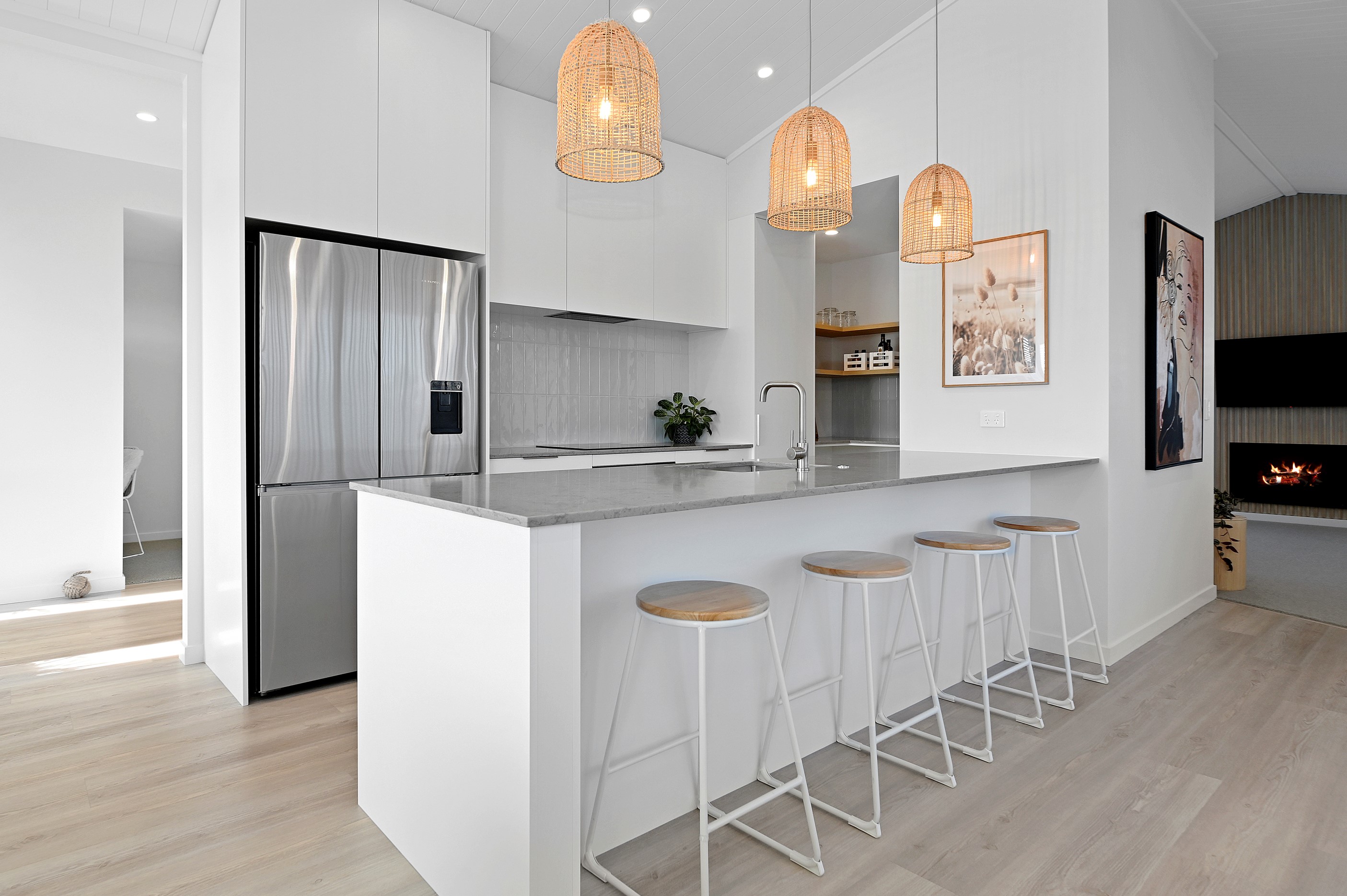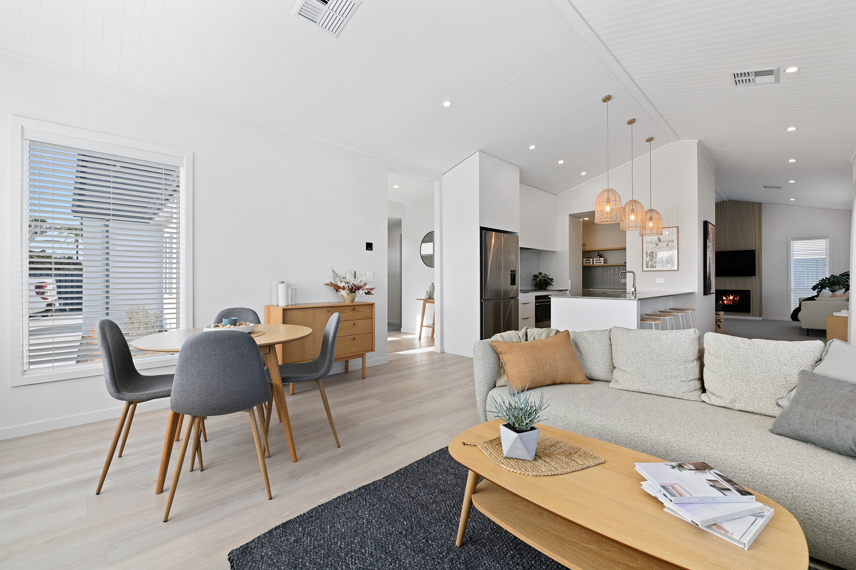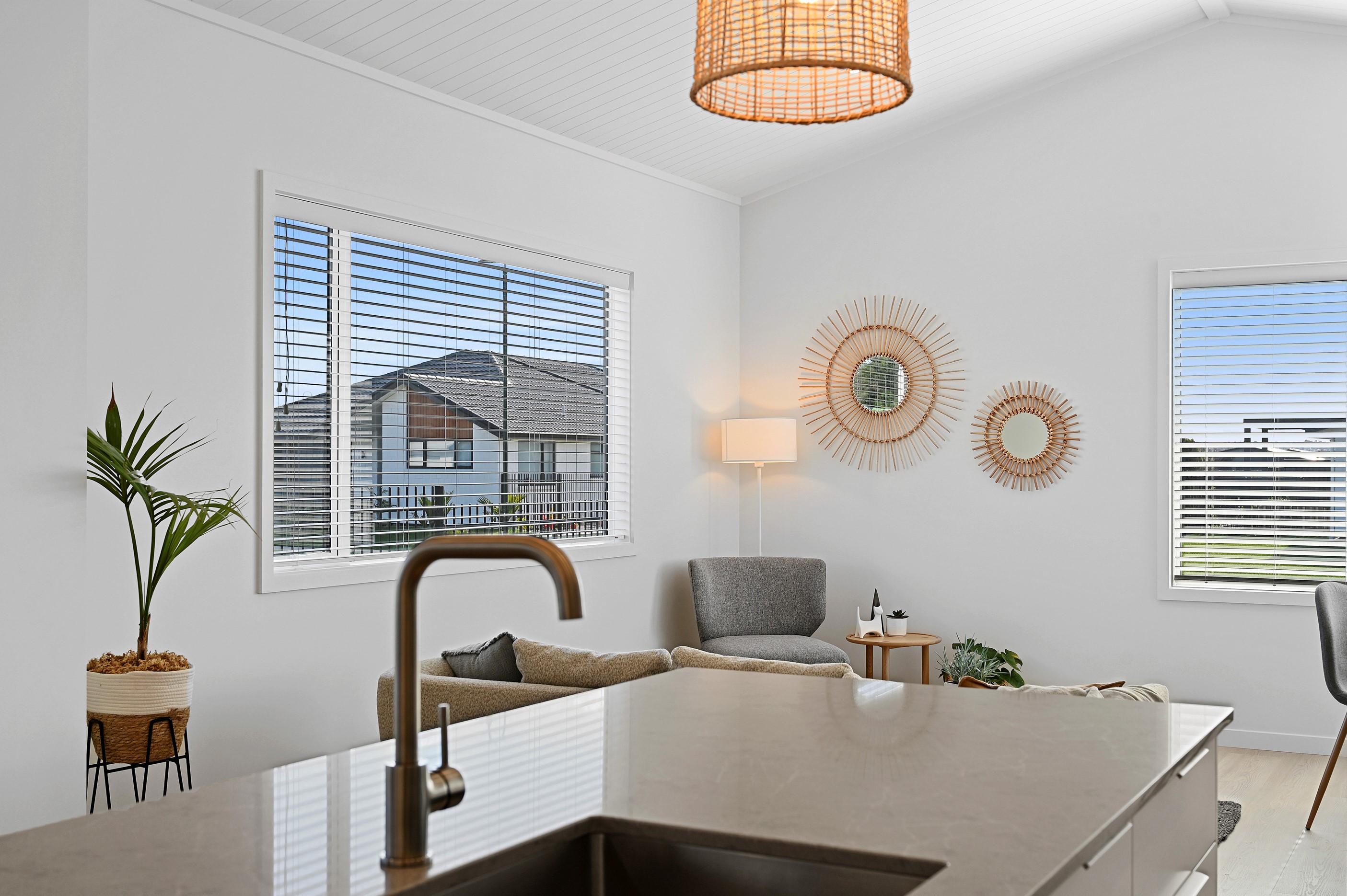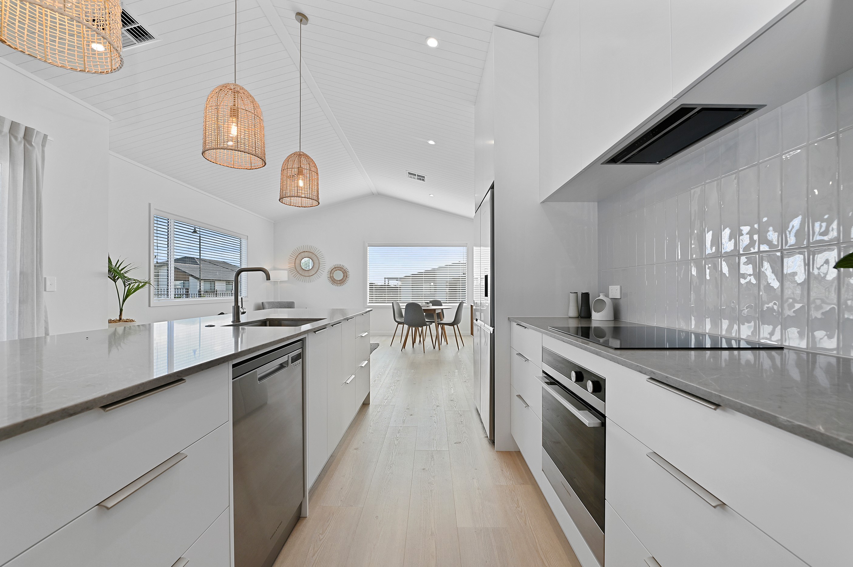 A tight corner section proved no problem for the skilled builders of this pavilion-style show home. Every millimetre has been used to best effect, and the result is a four-bedroom home that feels much larger than its 207sqm. A tasteful pared-back palette, pitched ceilings and lots of glazing also help engender a sense of space and airiness. Within the H-shaped footprint are two bathrooms, two living spaces and, at the heart, a white-on-white kitchen complete with a gleaming tiled splashback. This hub continues to an outdoor dining area under attractive exposed trusses. The outlook here takes in a neighbouring reserve. At the other end of this pavilion is a comfortable family room. Blonde timber furniture and fittings add to the home’s already sunny disposition. But muted tones don’t mean dull – far from it. In the main bedroom, which has a walk-in wardrobe and an ensuite, you’ll find a tongue-and-groove feature wall in a duck-egg hue. One of the bathrooms includes a soft blue-grey tiled feature wall that brings the standalone bath into focus. A study nook, double garage, sun-trap deck and undeniable street appeal complete the package.