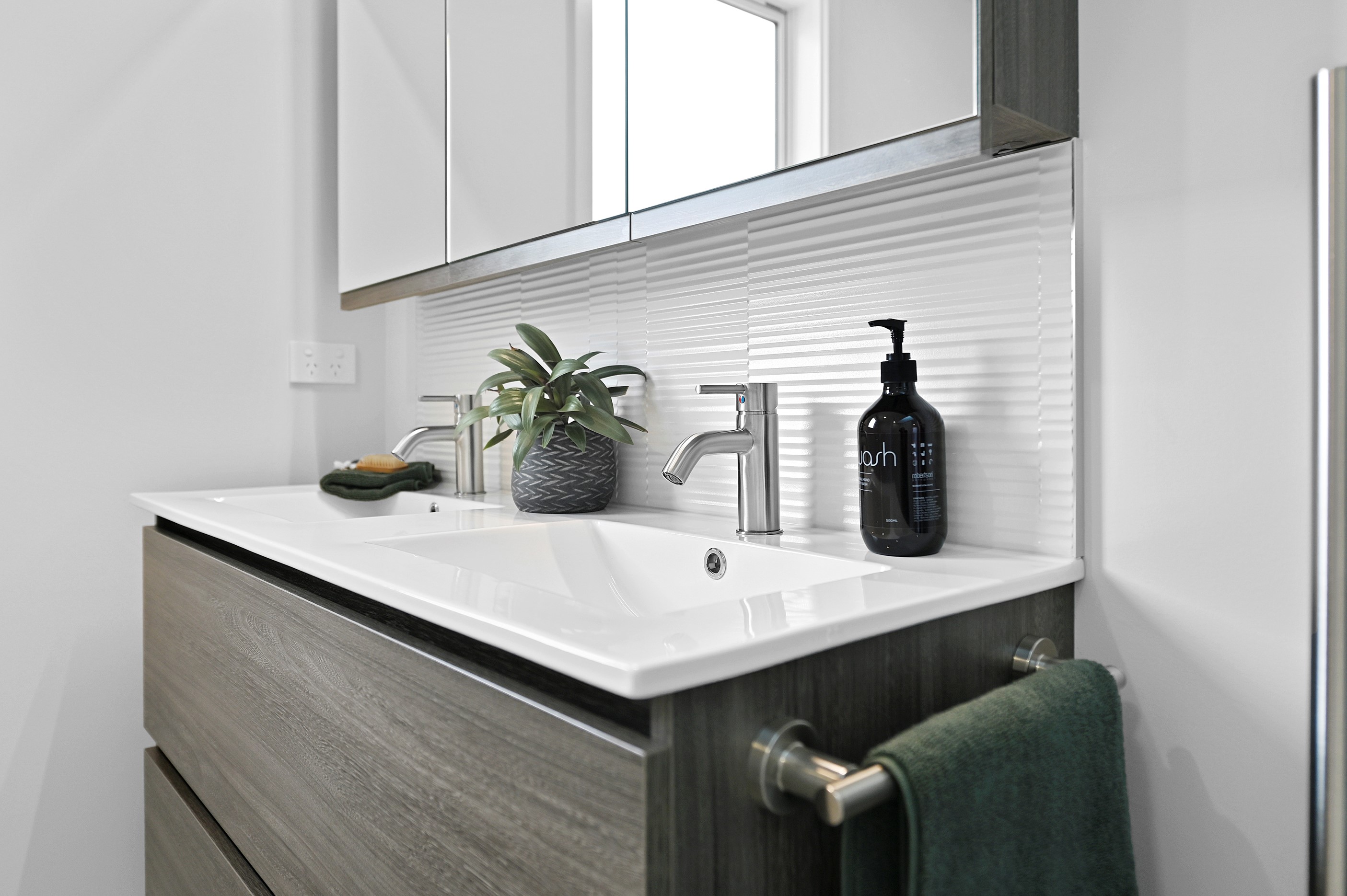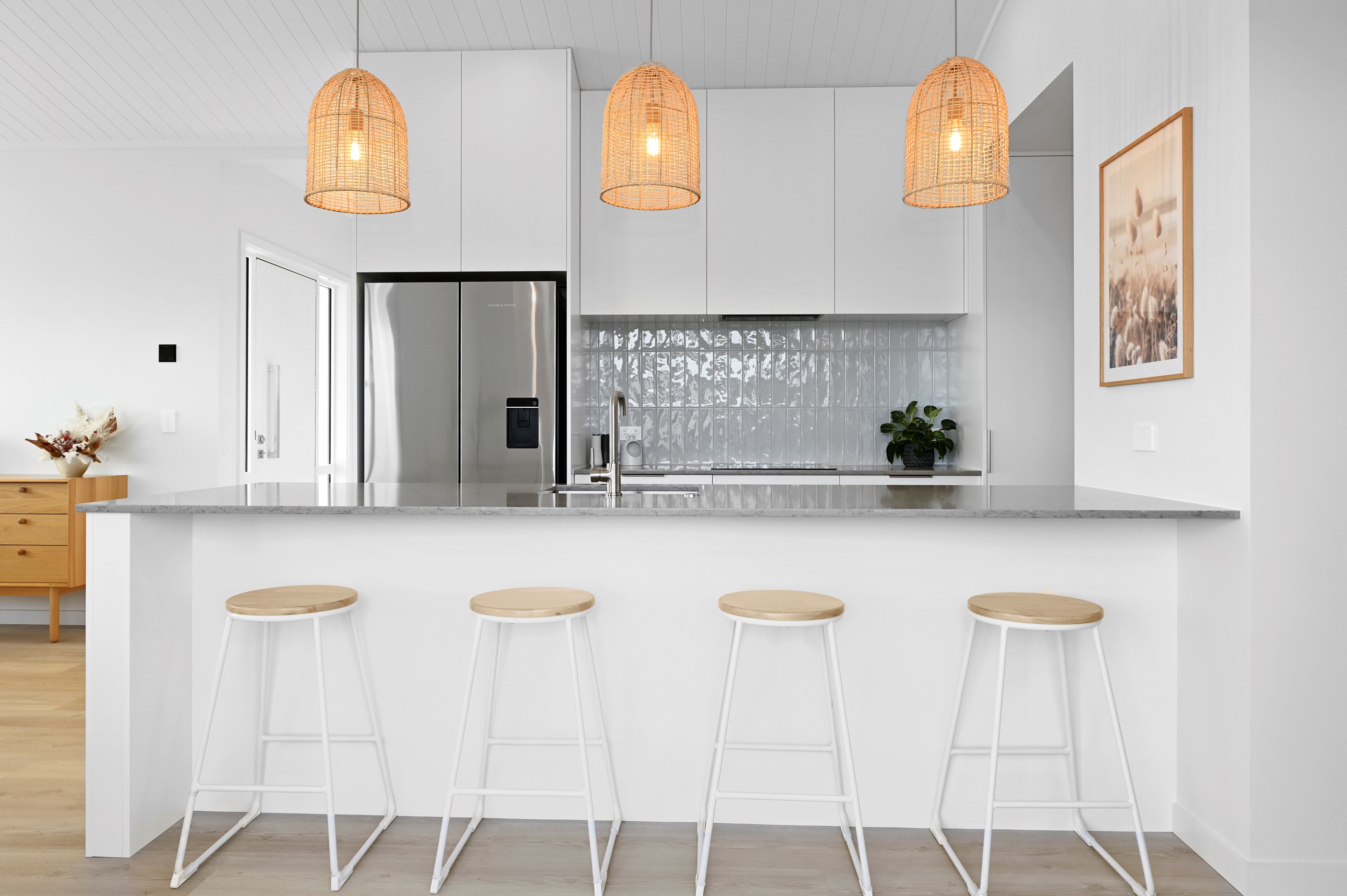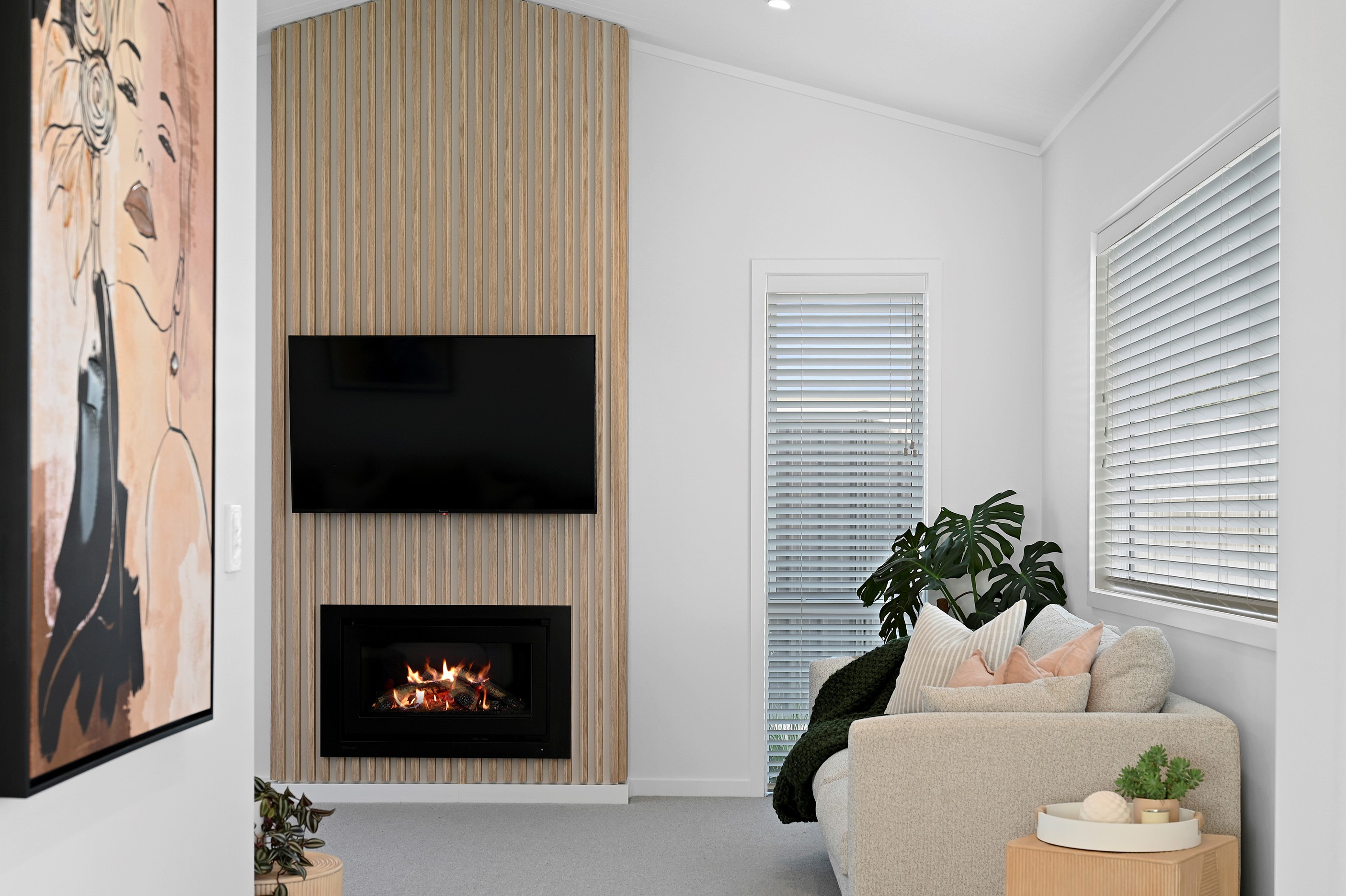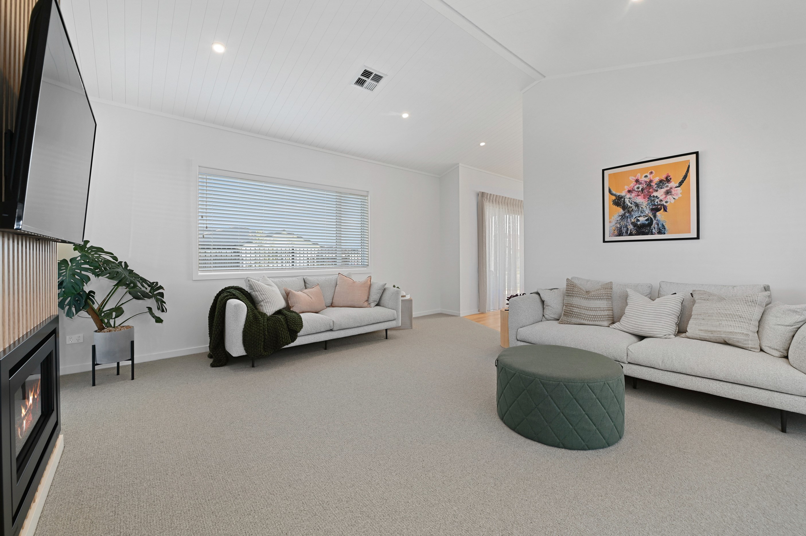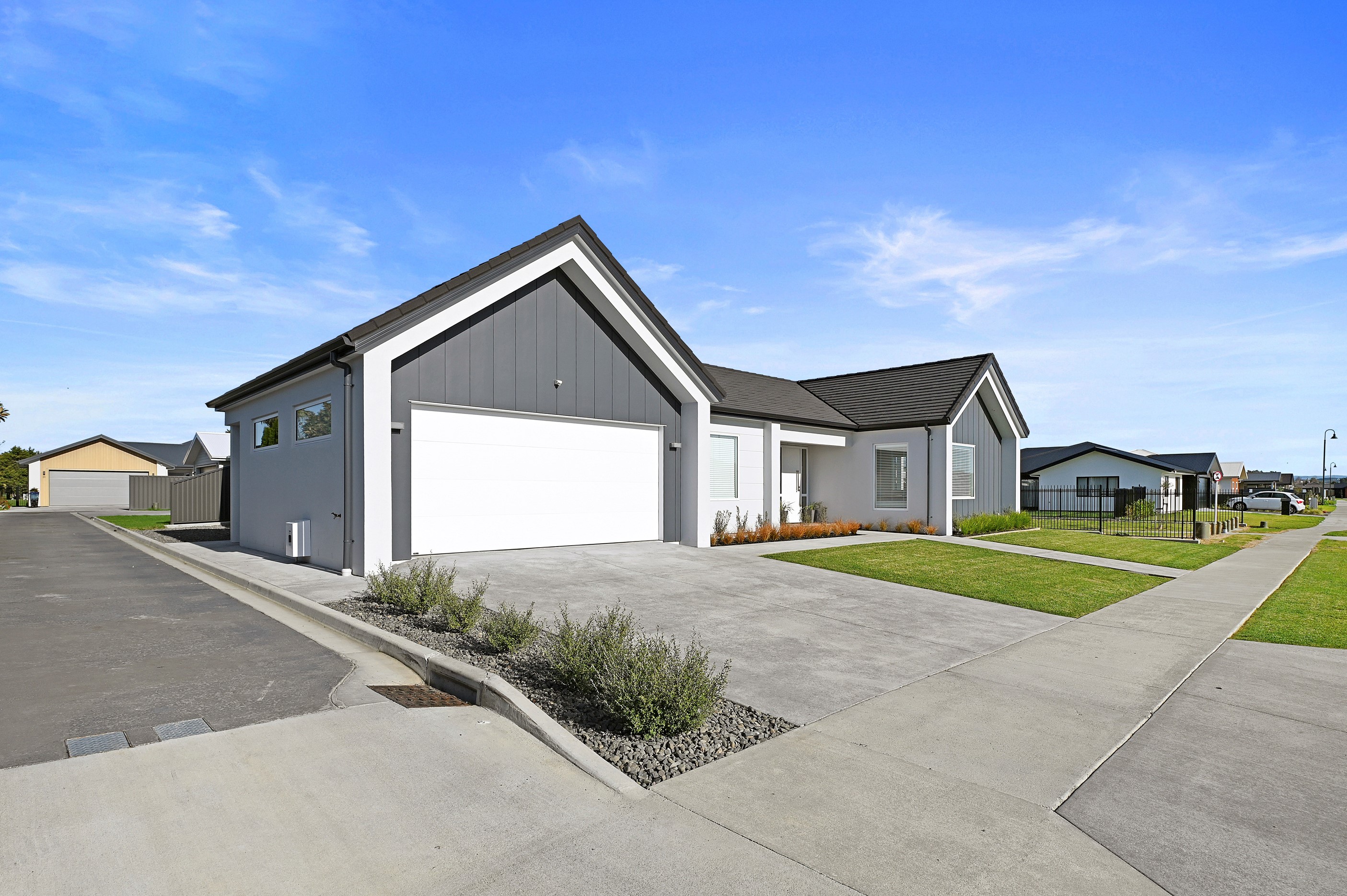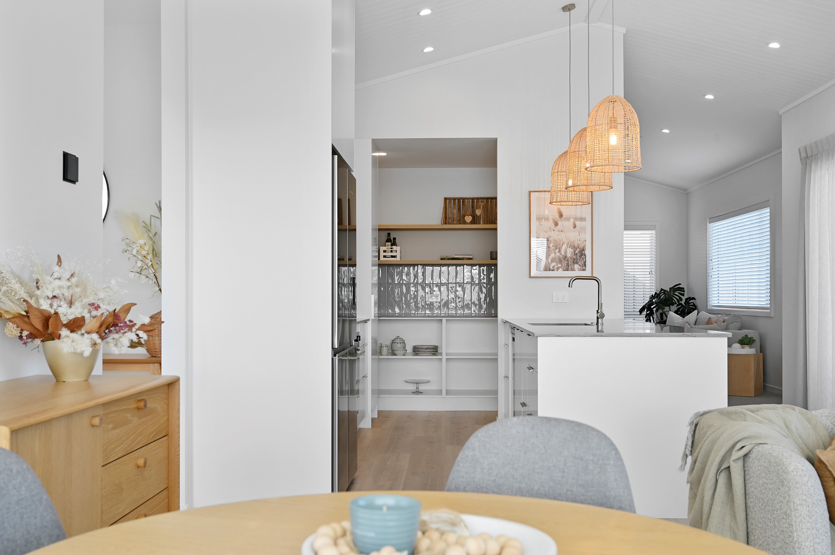 A tight corner section proved no problem for the skilled builders of this pavilion-style show home. Every millimetre has been used to best effect, and the result is a four-bedroom home that feels much larger than its 207sqm. A tasteful pared-back palette, pitched ceilings and lots of glazing also help engender a sense of space and airiness. Within the H-shaped footprint are two bathrooms, two living spaces and, at the heart, a white-on-white kitchen complete with a gleaming tiled splashback. This hub continues to an outdoor dining area under attractive exposed trusses. The outlook here takes in a neighbouring reserve. At the other end of this pavilion is a comfortable family room. Blonde timber furniture and fittings add to the home’s already sunny disposition. But muted tones don’t mean dull – far from it. In the main bedroom, which has a walk-in wardrobe and an ensuite, you’ll find a tongue-and-groove feature wall in a duck-egg hue. One of the bathrooms includes a soft blue-grey tiled feature wall that brings the standalone bath into focus. A study nook, double garage, sun-trap deck and undeniable street appeal complete the package.