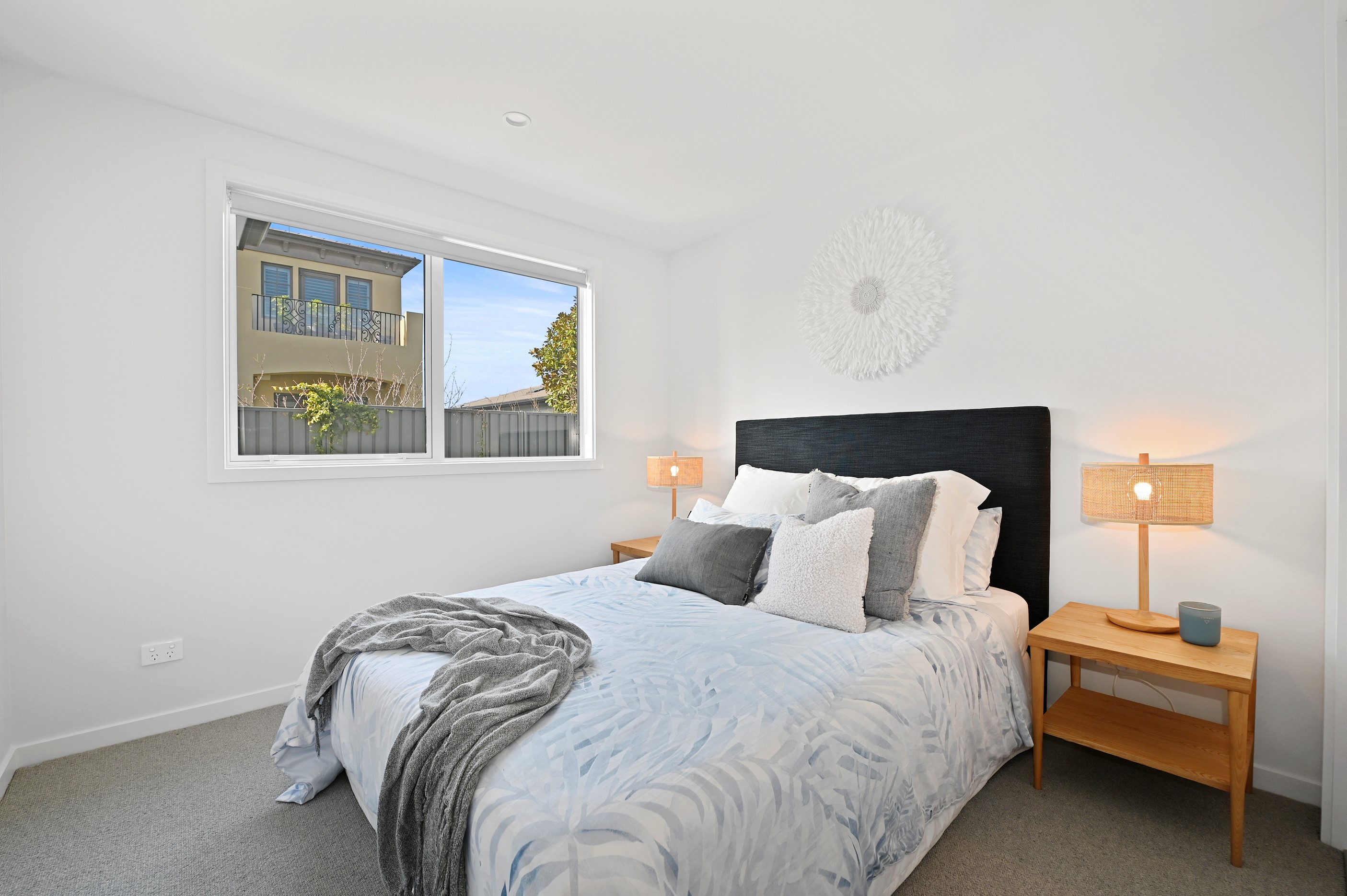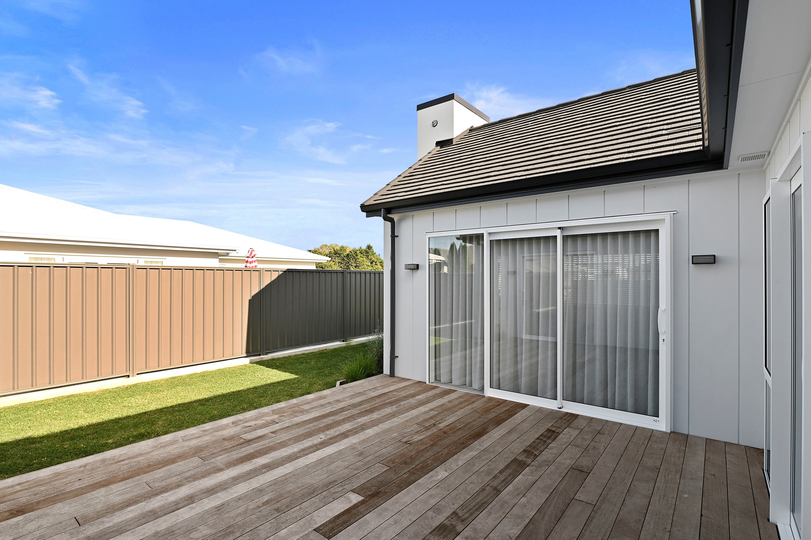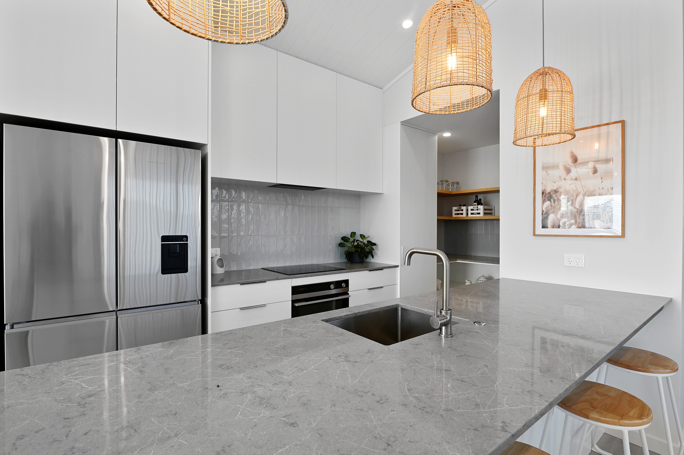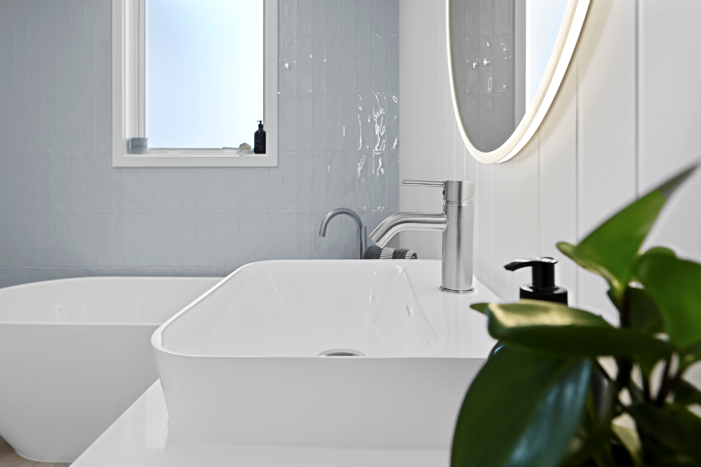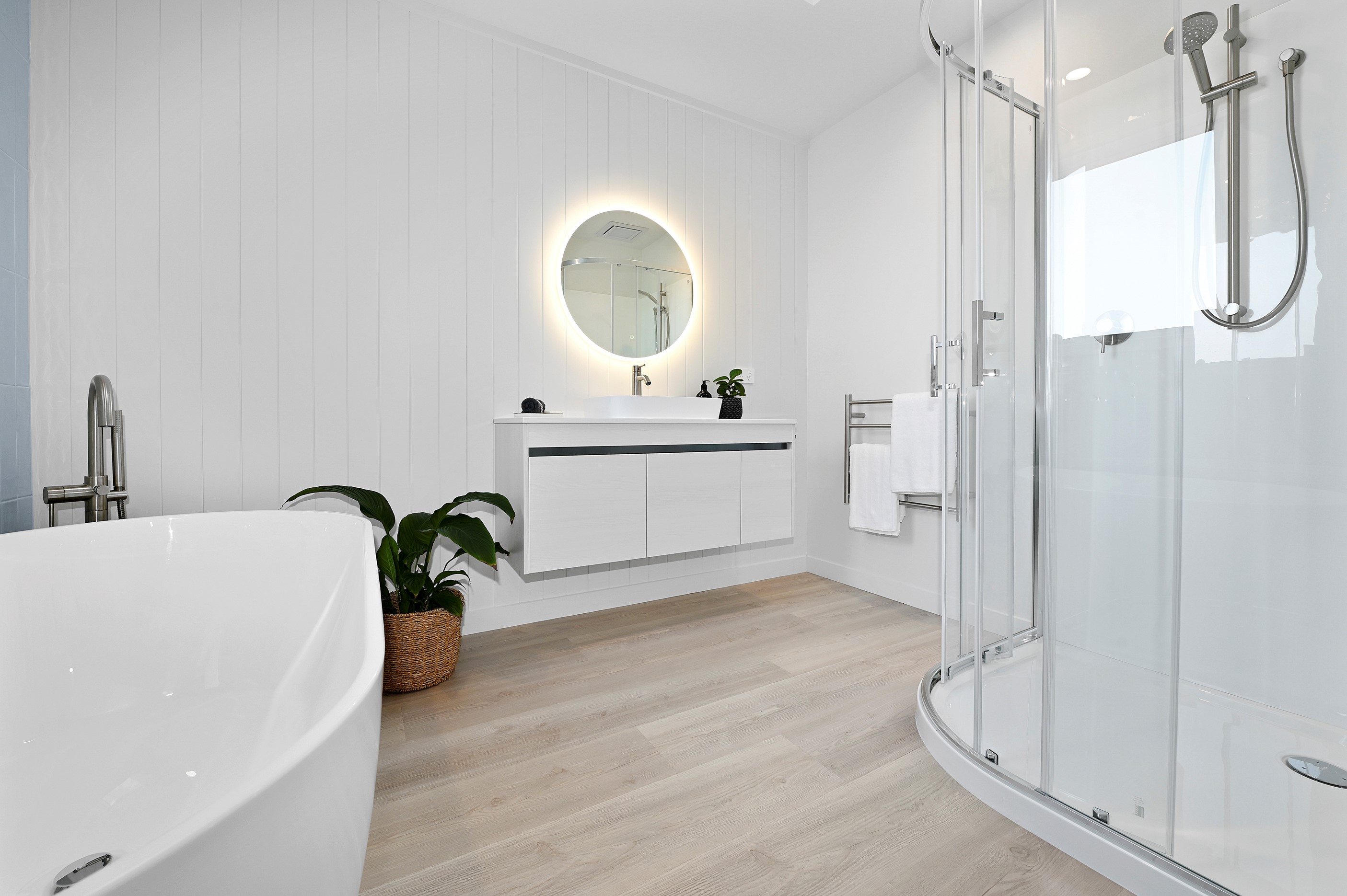 A tight corner section proved no problem for the skilled builders of this pavilion-style show home. Every millimetre has been used to best effect, and the result is a four-bedroom home that feels much larger than its 207sqm. A tasteful pared-back palette, pitched ceilings and lots of glazing also help engender a sense of space and airiness. Within the H-shaped footprint are two bathrooms, two living spaces and, at the heart, a white-on-white kitchen complete with a gleaming tiled splashback. This hub continues to an outdoor dining area under attractive exposed trusses. The outlook here takes in a neighbouring reserve. At the other end of this pavilion is a comfortable family room. Blonde timber furniture and fittings add to the home’s already sunny disposition. But muted tones don’t mean dull – far from it. In the main bedroom, which has a walk-in wardrobe and an ensuite, you’ll find a tongue-and-groove feature wall in a duck-egg hue. One of the bathrooms includes a soft blue-grey tiled feature wall that brings the standalone bath into focus. A study nook, double garage, sun-trap deck and undeniable street appeal complete the package.