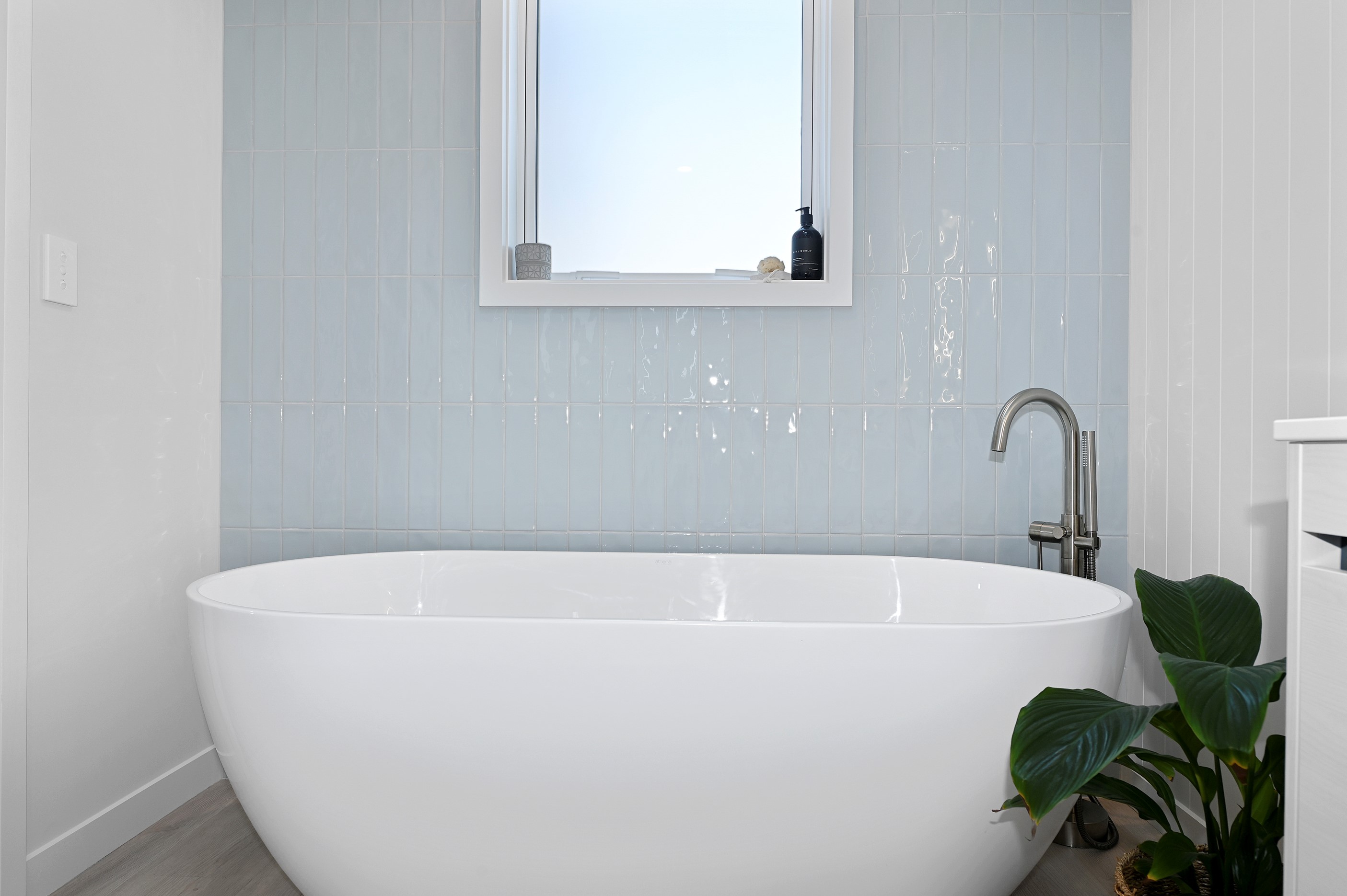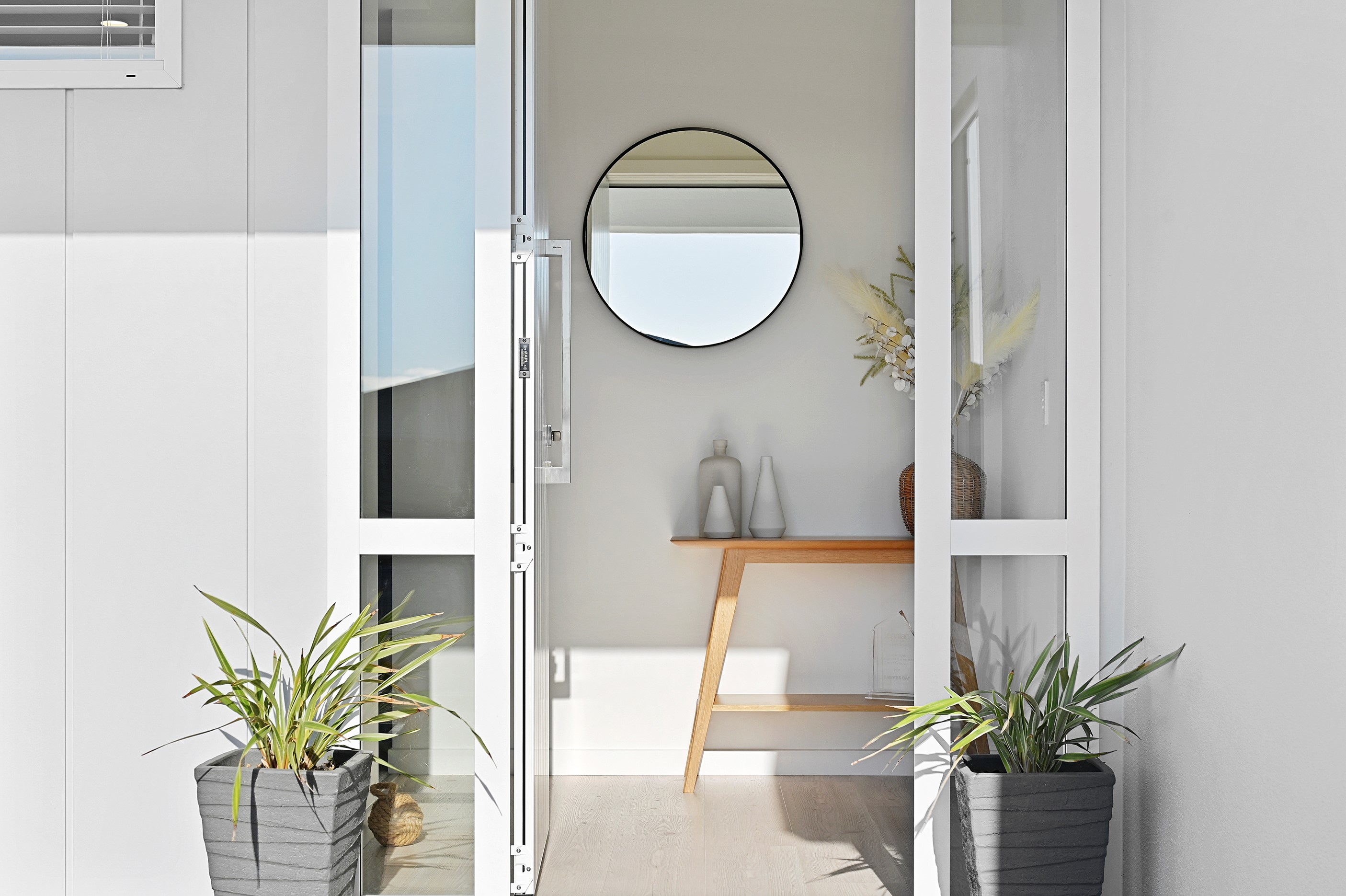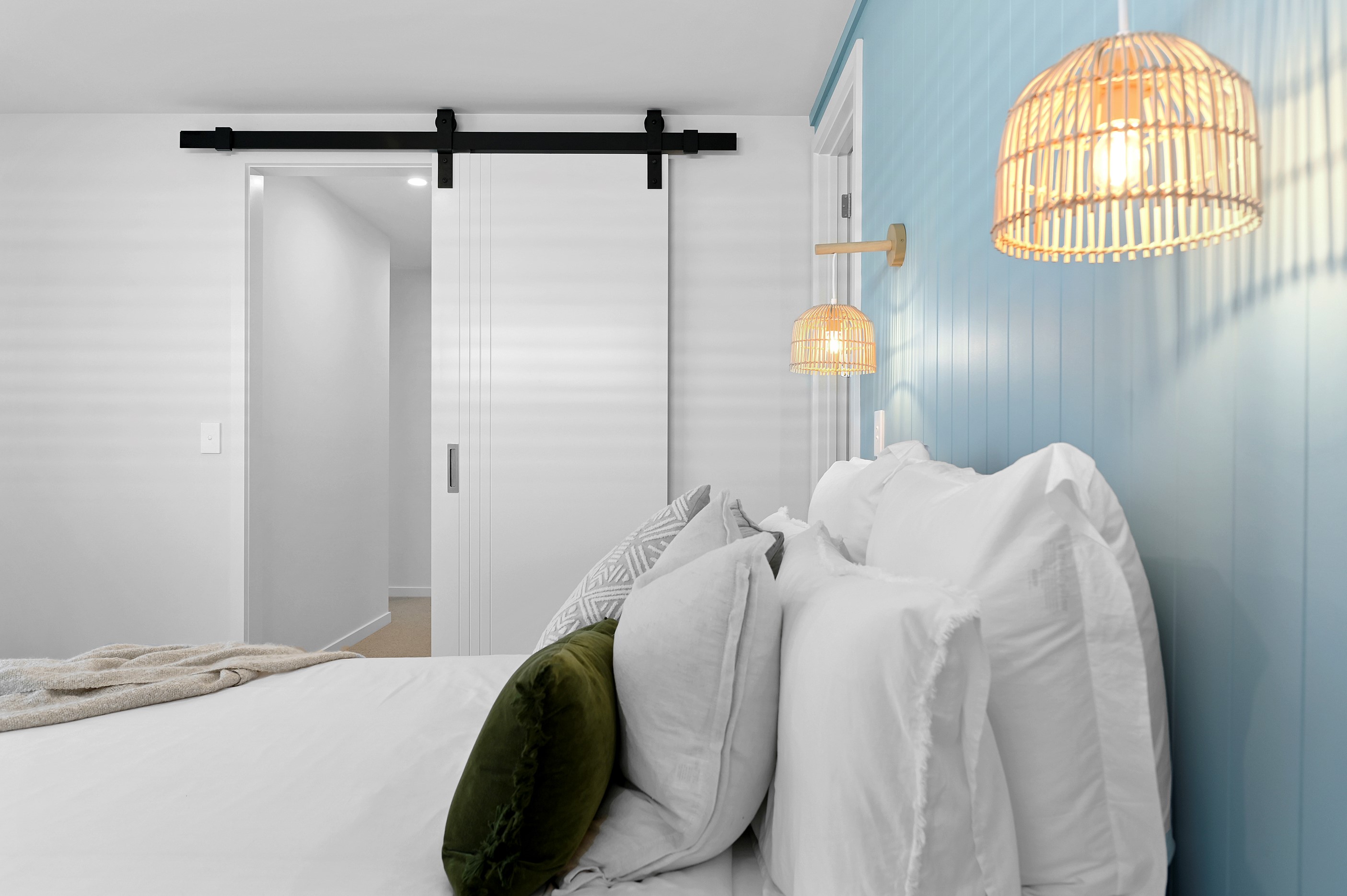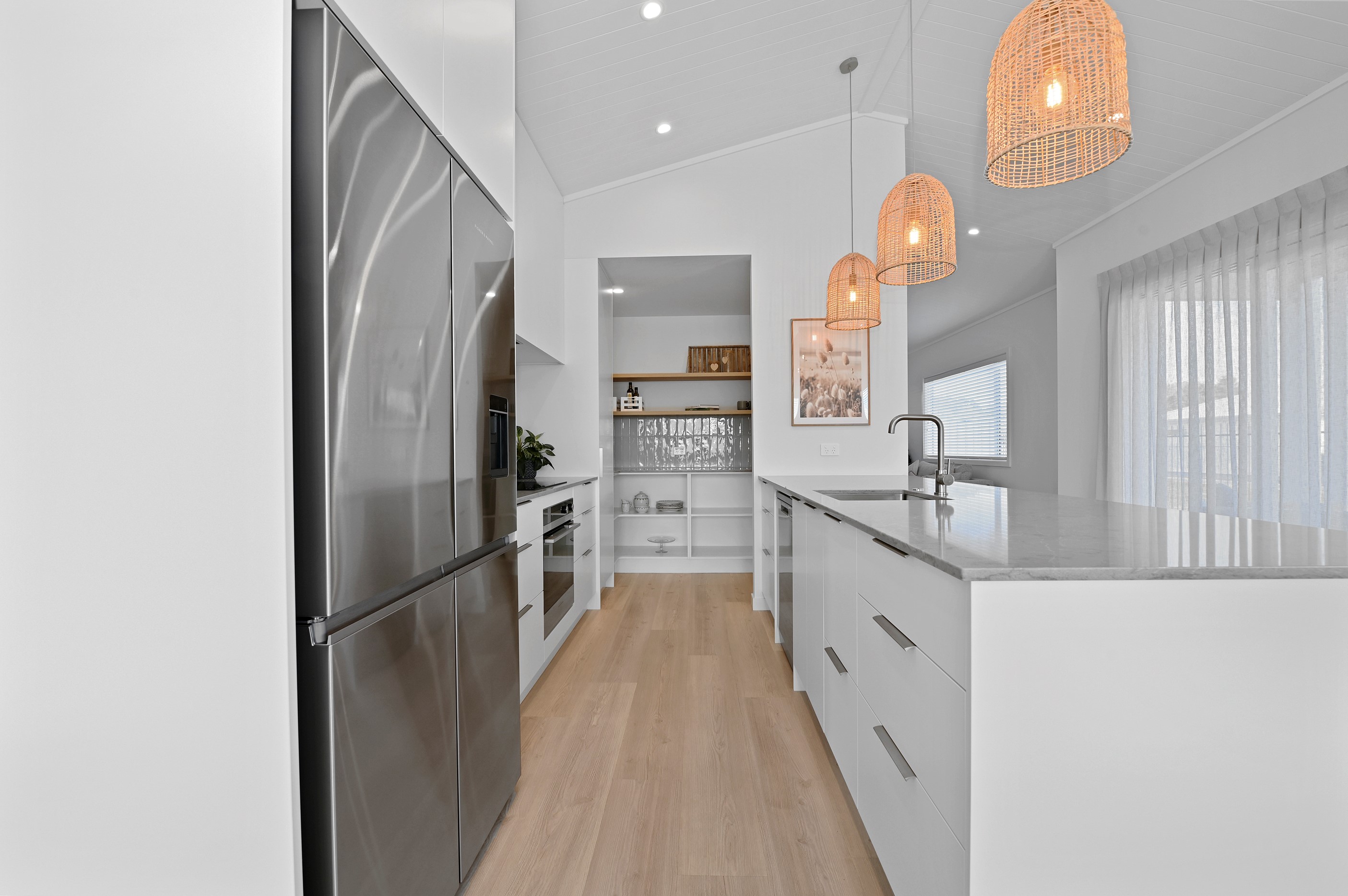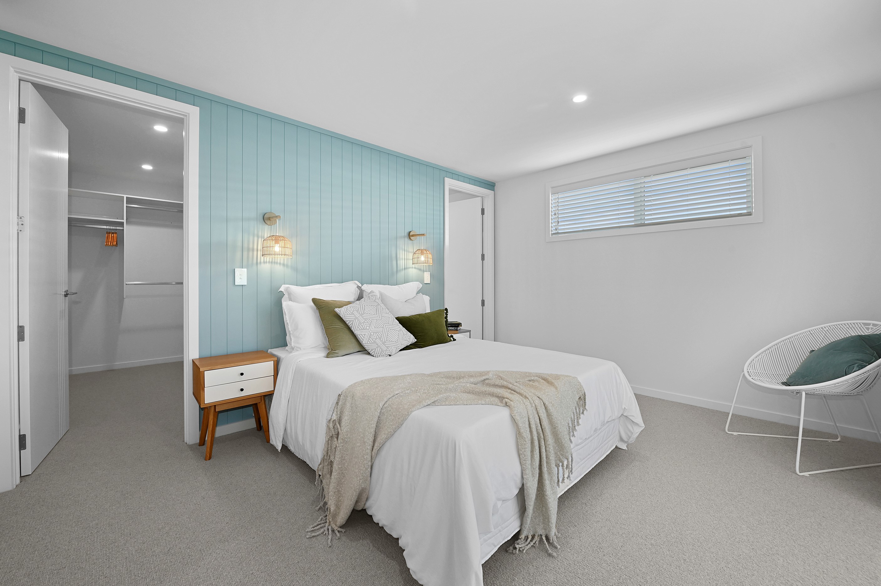 A tight corner section proved no problem for the skilled builders of this pavilion-style show home. Every millimetre has been used to best effect, and the result is a four-bedroom home that feels much larger than its 207sqm. A tasteful pared-back palette, pitched ceilings and lots of glazing also help engender a sense of space and airiness. Within the H-shaped footprint are two bathrooms, two living spaces and, at the heart, a white-on-white kitchen complete with a gleaming tiled splashback. This hub continues to an outdoor dining area under attractive exposed trusses. The outlook here takes in a neighbouring reserve. At the other end of this pavilion is a comfortable family room. Blonde timber furniture and fittings add to the home’s already sunny disposition. But muted tones don’t mean dull – far from it. In the main bedroom, which has a walk-in wardrobe and an ensuite, you’ll find a tongue-and-groove feature wall in a duck-egg hue. One of the bathrooms includes a soft blue-grey tiled feature wall that brings the standalone bath into focus. A study nook, double garage, sun-trap deck and undeniable street appeal complete the package.