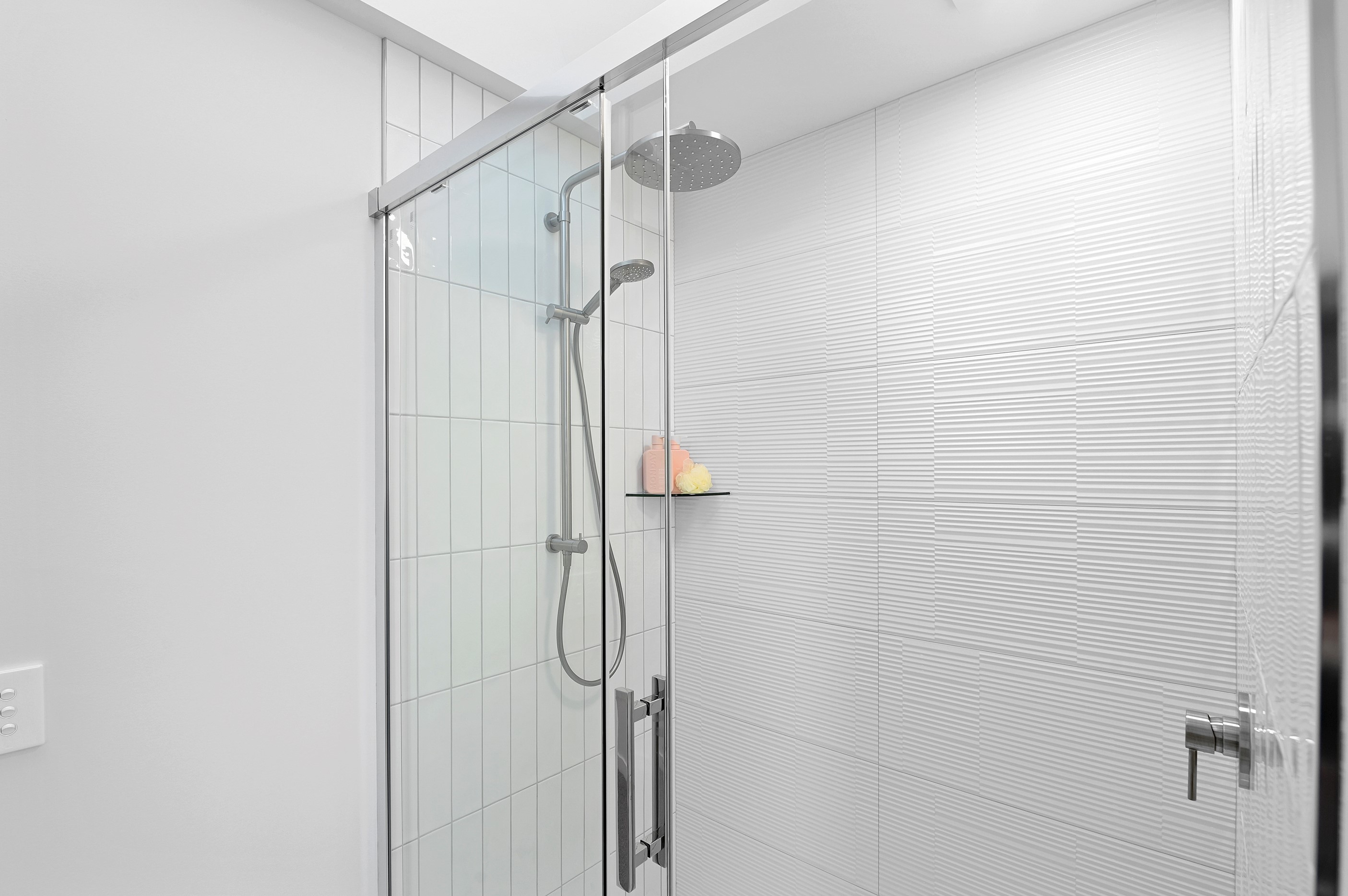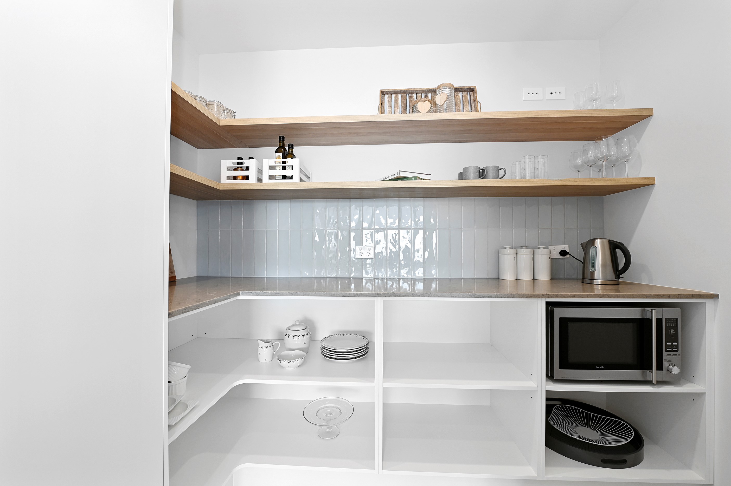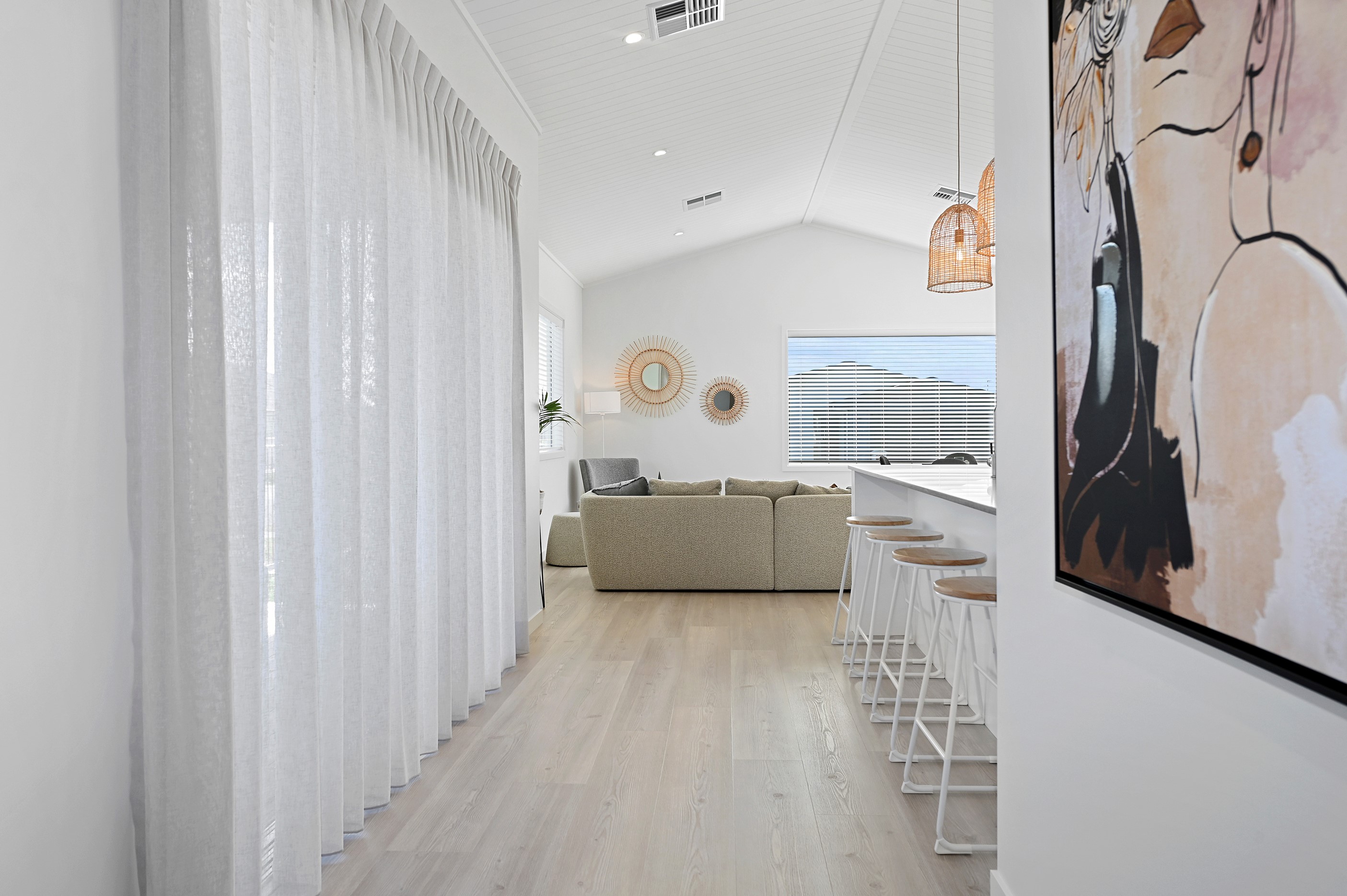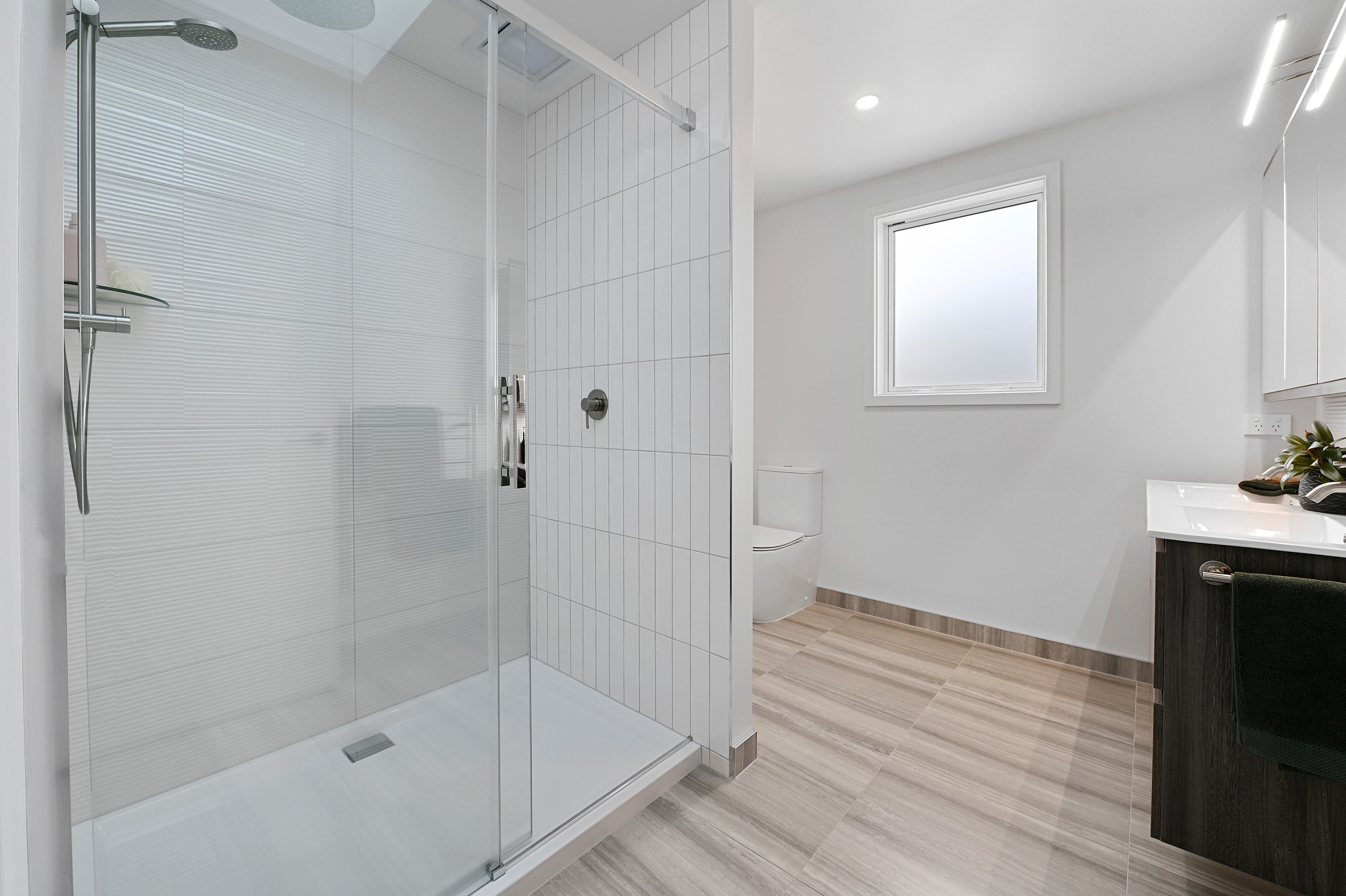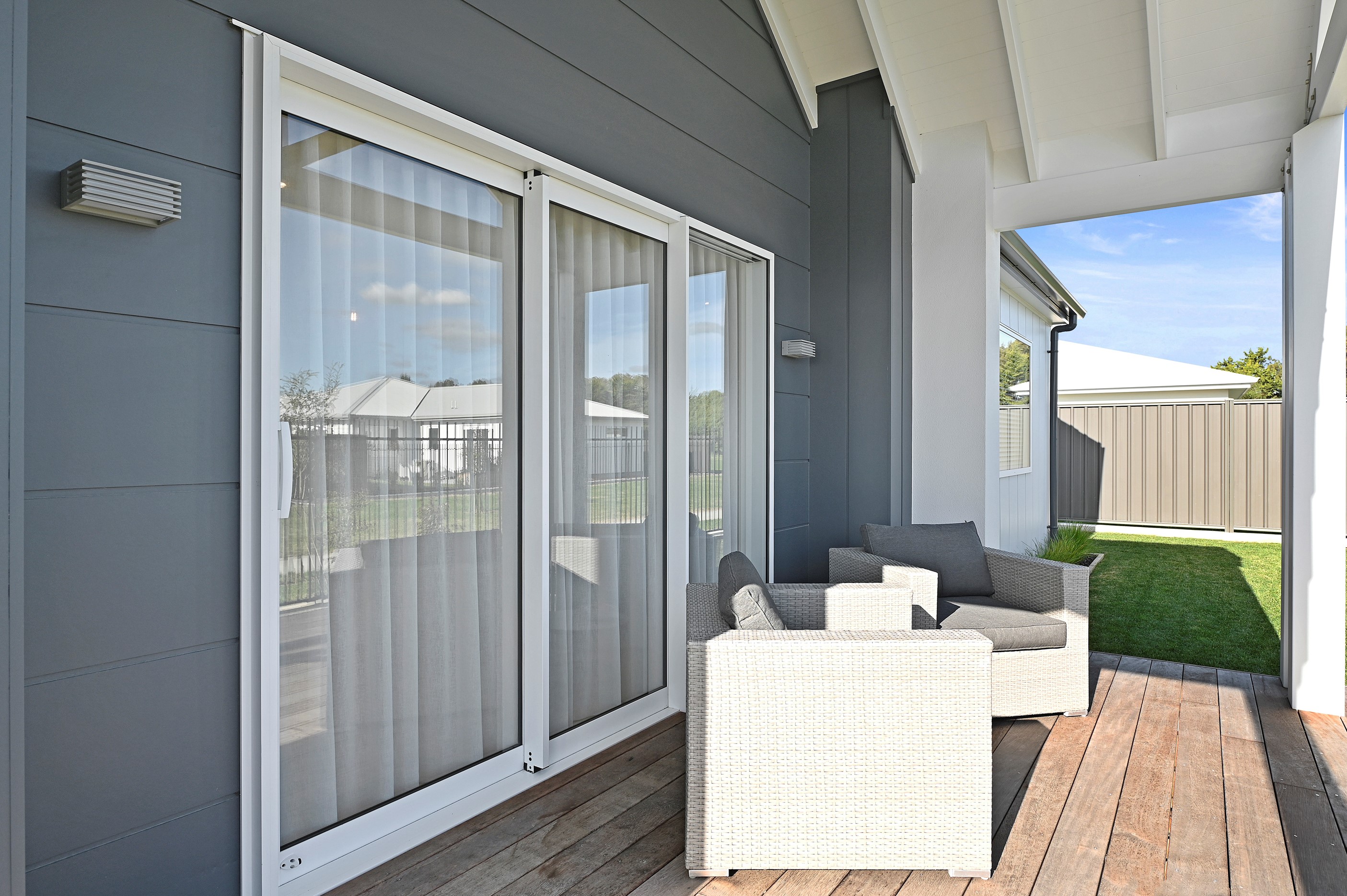 A tight corner section proved no problem for the skilled builders of this pavilion-style show home. Every millimetre has been used to best effect, and the result is a four-bedroom home that feels much larger than its 207sqm. A tasteful pared-back palette, pitched ceilings and lots of glazing also help engender a sense of space and airiness. Within the H-shaped footprint are two bathrooms, two living spaces and, at the heart, a white-on-white kitchen complete with a gleaming tiled splashback. This hub continues to an outdoor dining area under attractive exposed trusses. The outlook here takes in a neighbouring reserve. At the other end of this pavilion is a comfortable family room. Blonde timber furniture and fittings add to the home’s already sunny disposition. But muted tones don’t mean dull – far from it. In the main bedroom, which has a walk-in wardrobe and an ensuite, you’ll find a tongue-and-groove feature wall in a duck-egg hue. One of the bathrooms includes a soft blue-grey tiled feature wall that brings the standalone bath into focus. A study nook, double garage, sun-trap deck and undeniable street appeal complete the package.